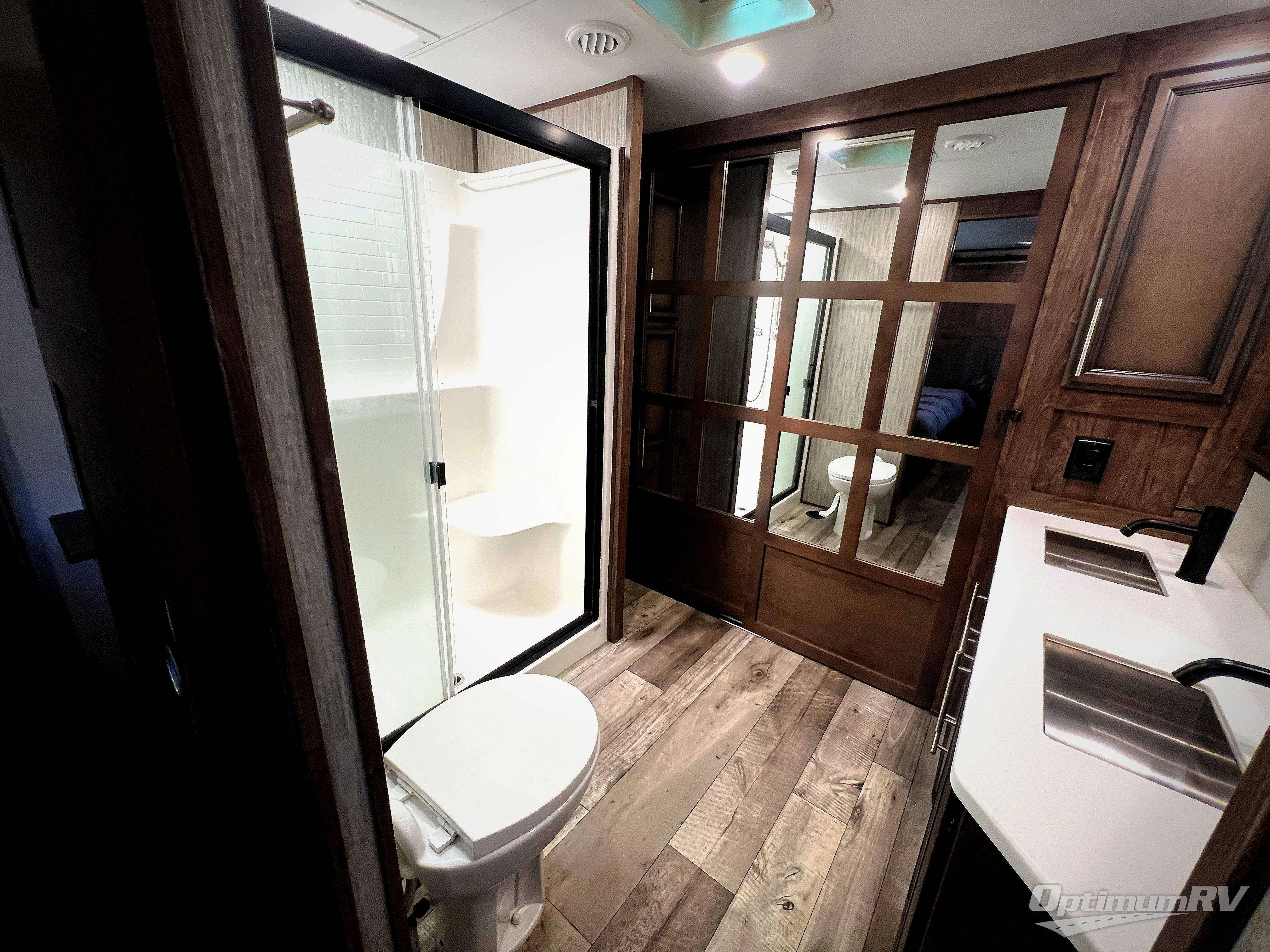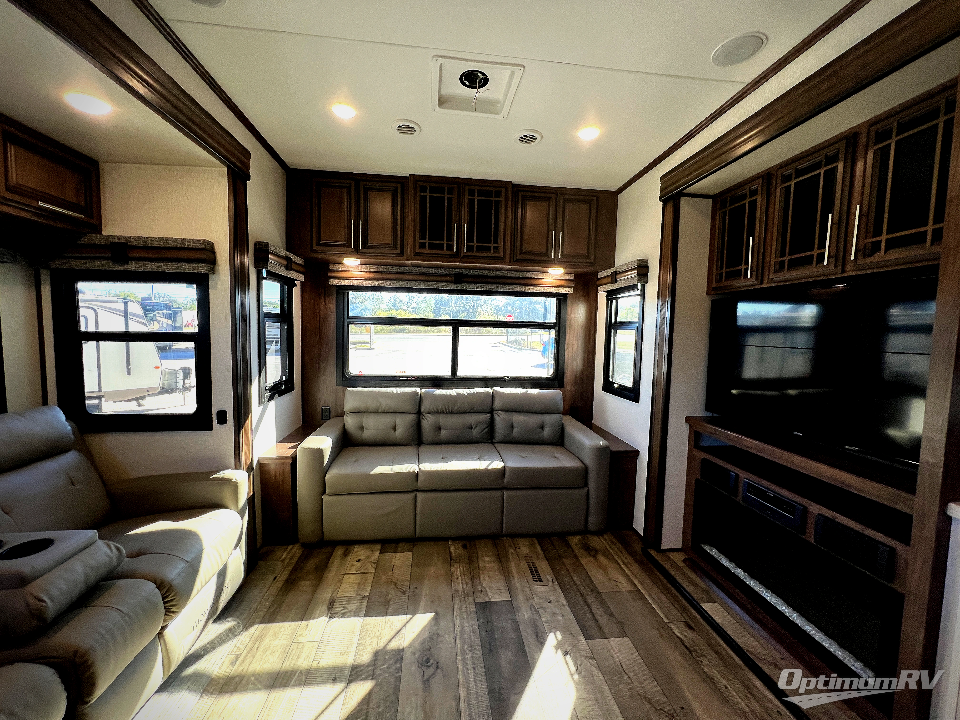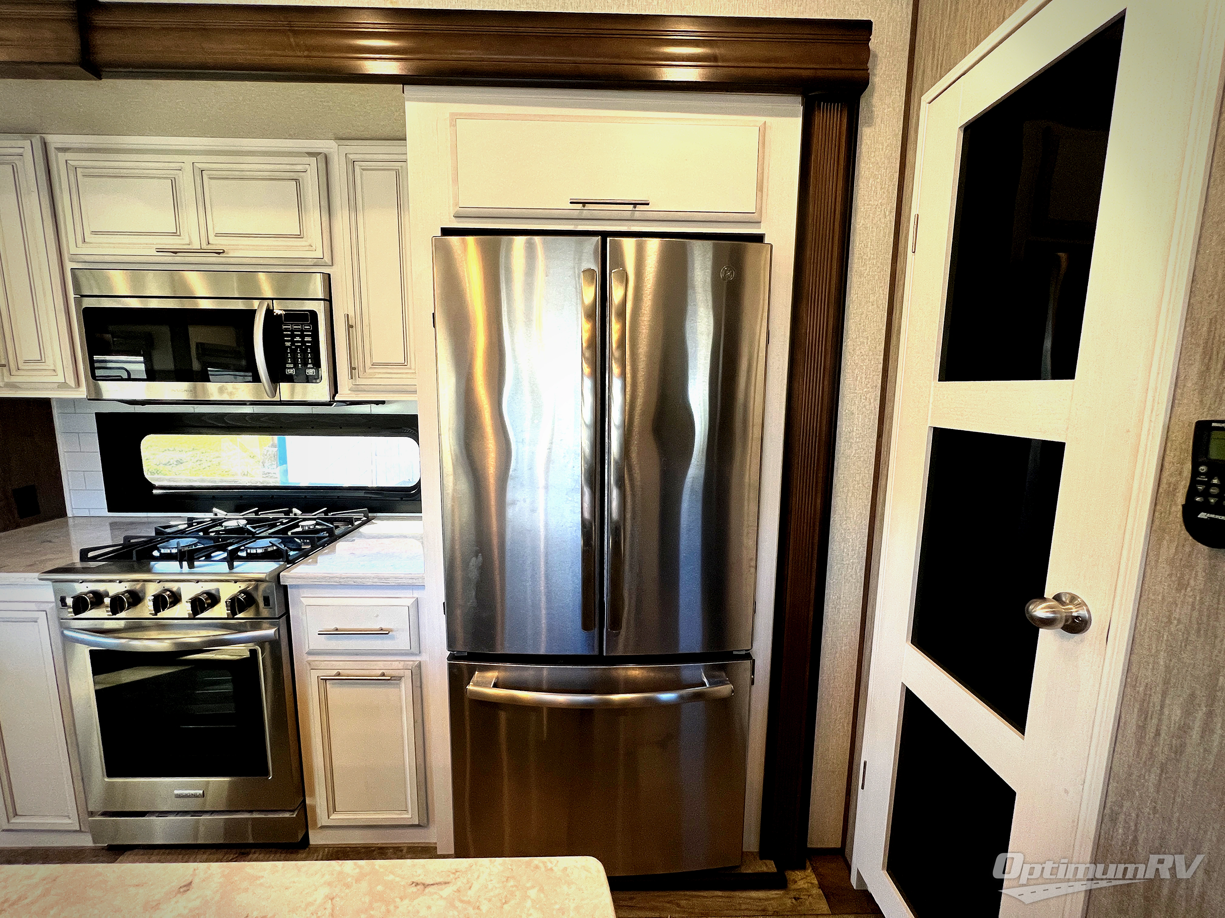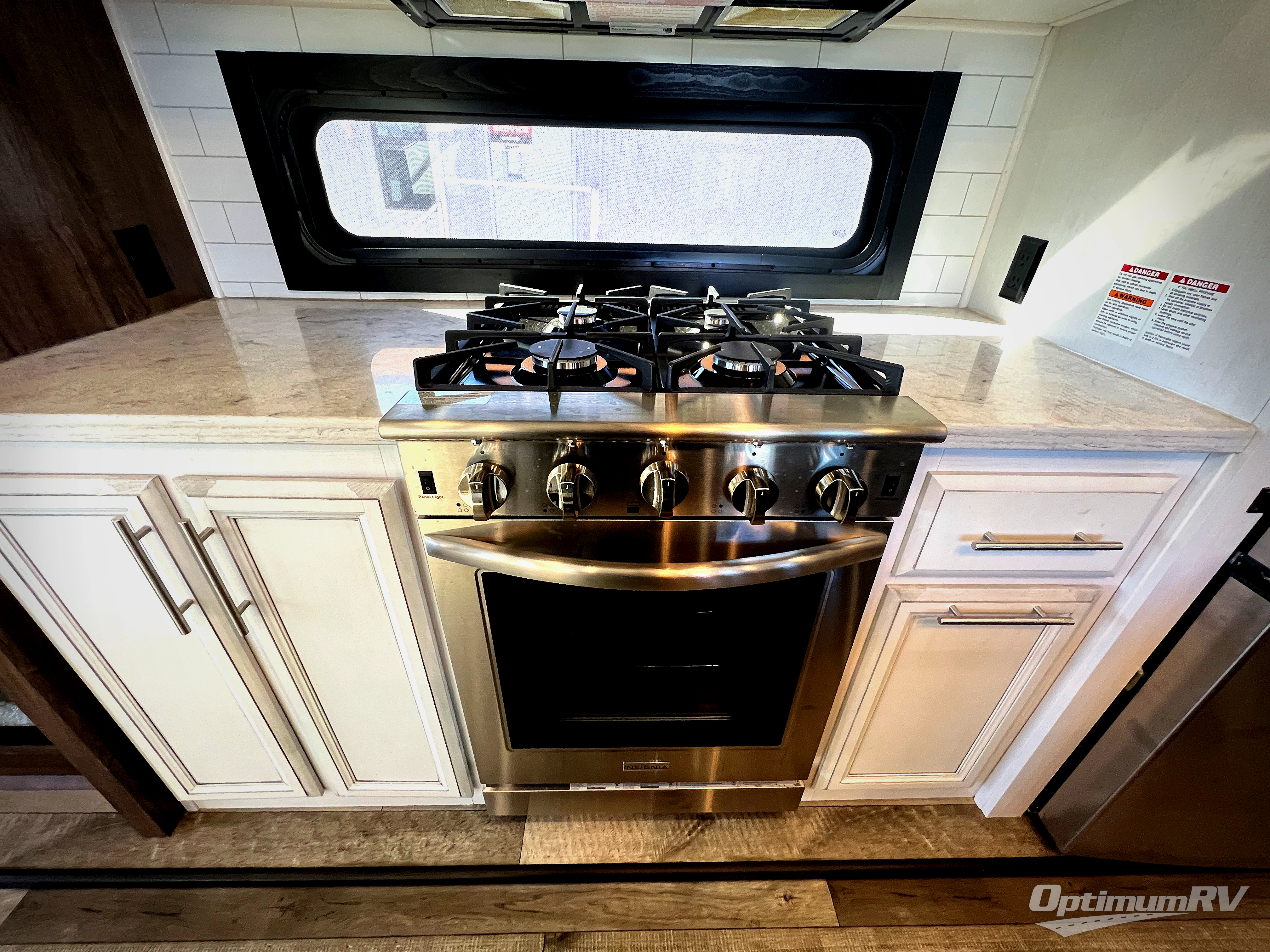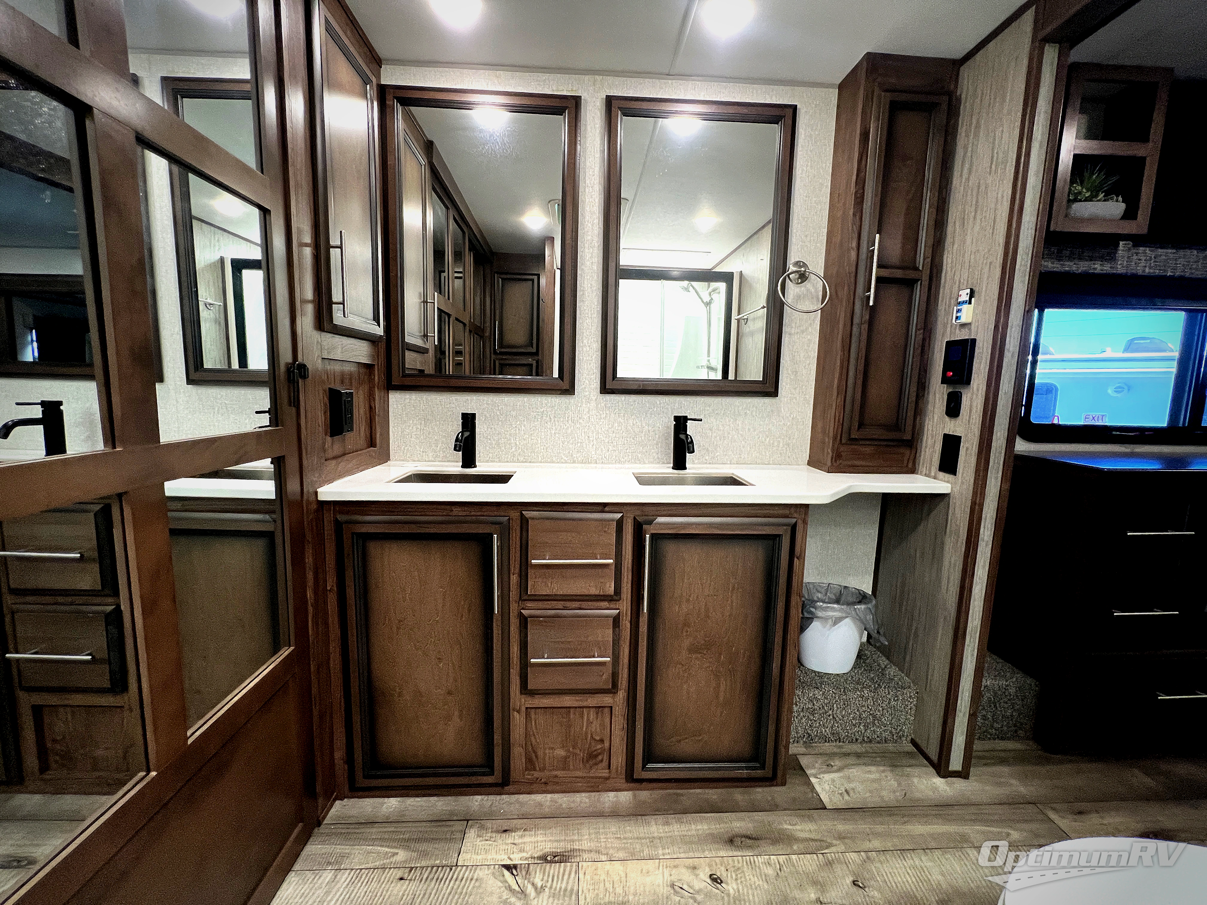 This couples fifth wheel gives you two sinks in the front spacious bathroom that also includes a wardrobe, linen storage, a washer/dryer prepped space, plus a residential shower with a seat. Sleep like a king on the electric-tilt bed that makes watching a show on the 32" LED TV comfortable and provides storage underneath with three drawers. You can relax during the day on the theater seating while watching a show on the 50" LED TV, and the fireplace at night will create a cozy atmosphere. Let the chef prepare dinner on the four-burner range or in the convection microwave and the kitchen island will provide extra counter space. And there is even a stainless steel dishwasher to make clean-up a breeze. This model features a hide-a-bed sofa your guest or the grandkids can sleep on at night and the half bath will be all theirs.