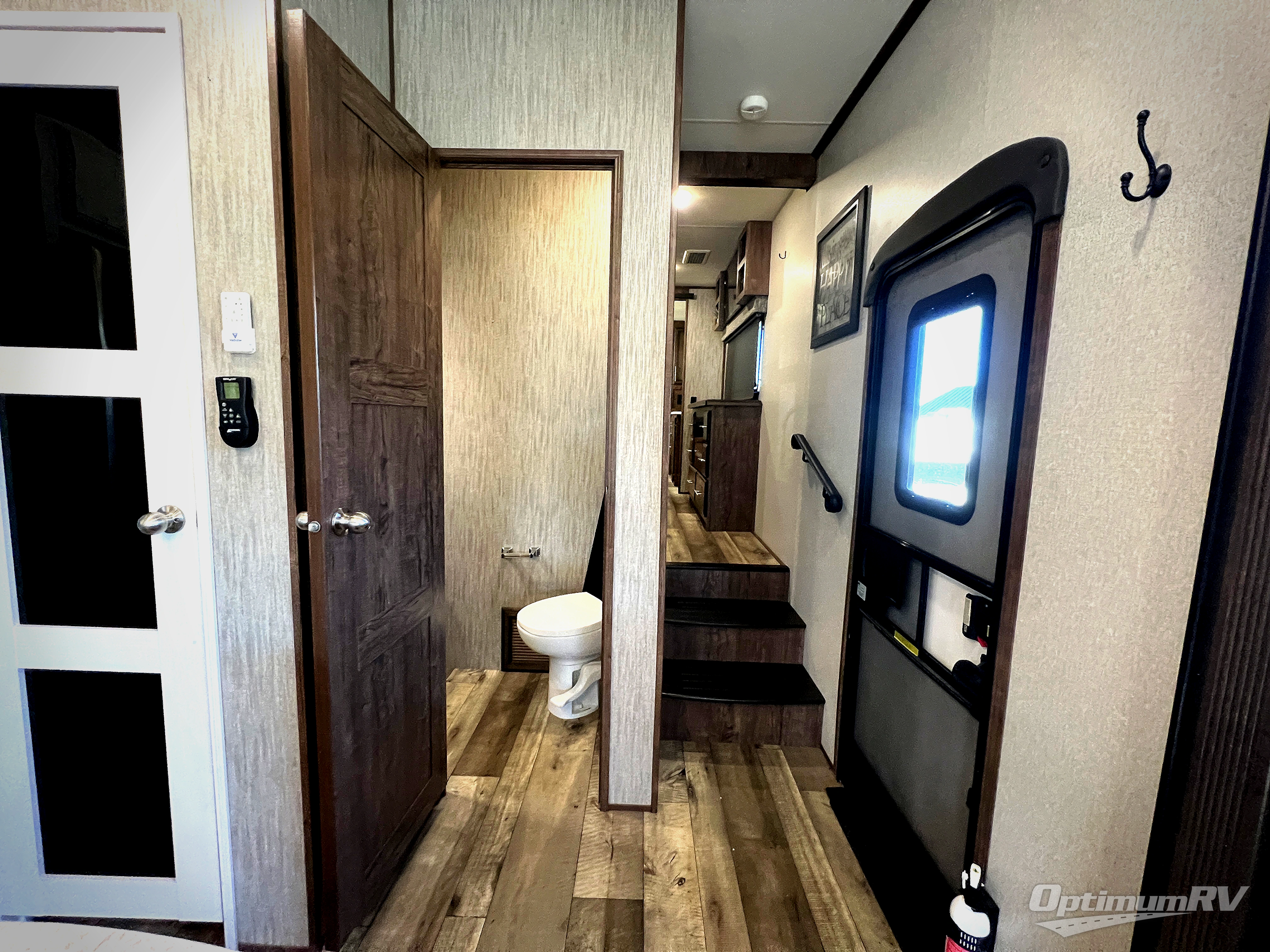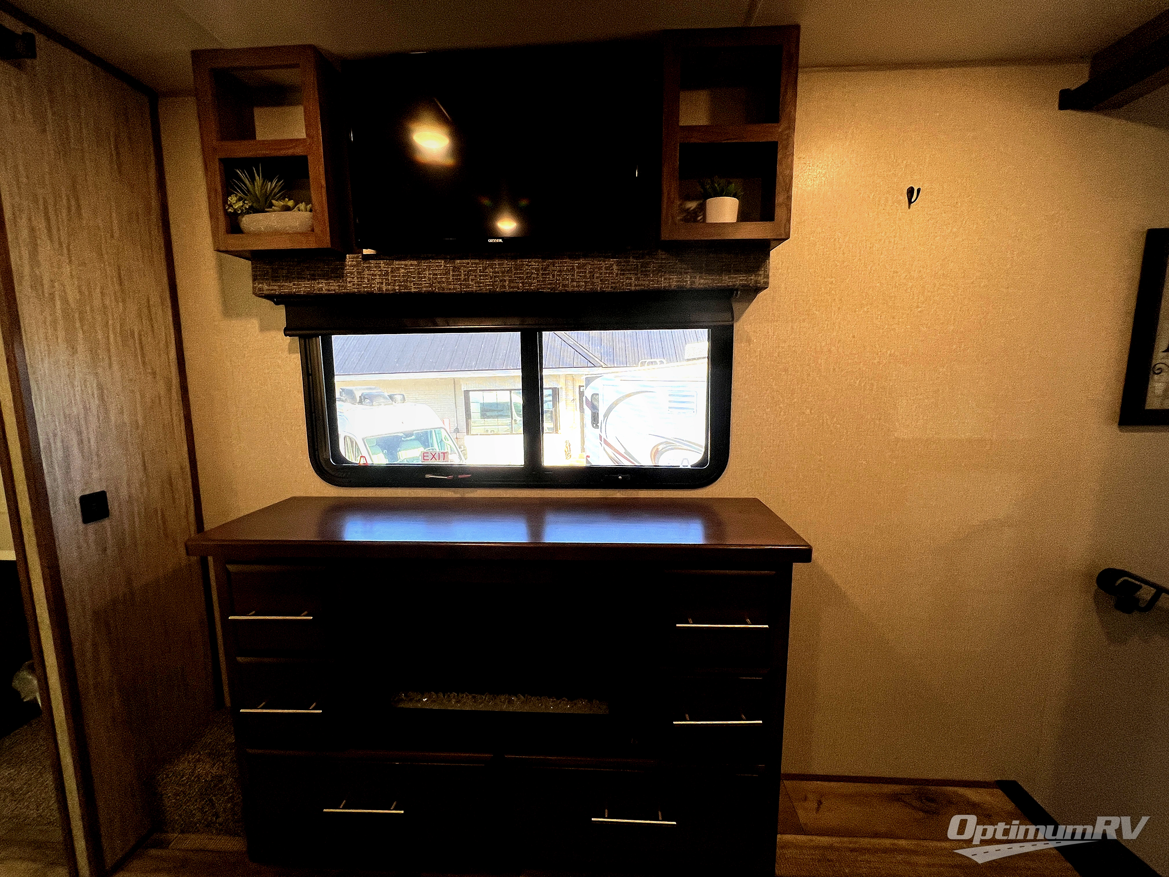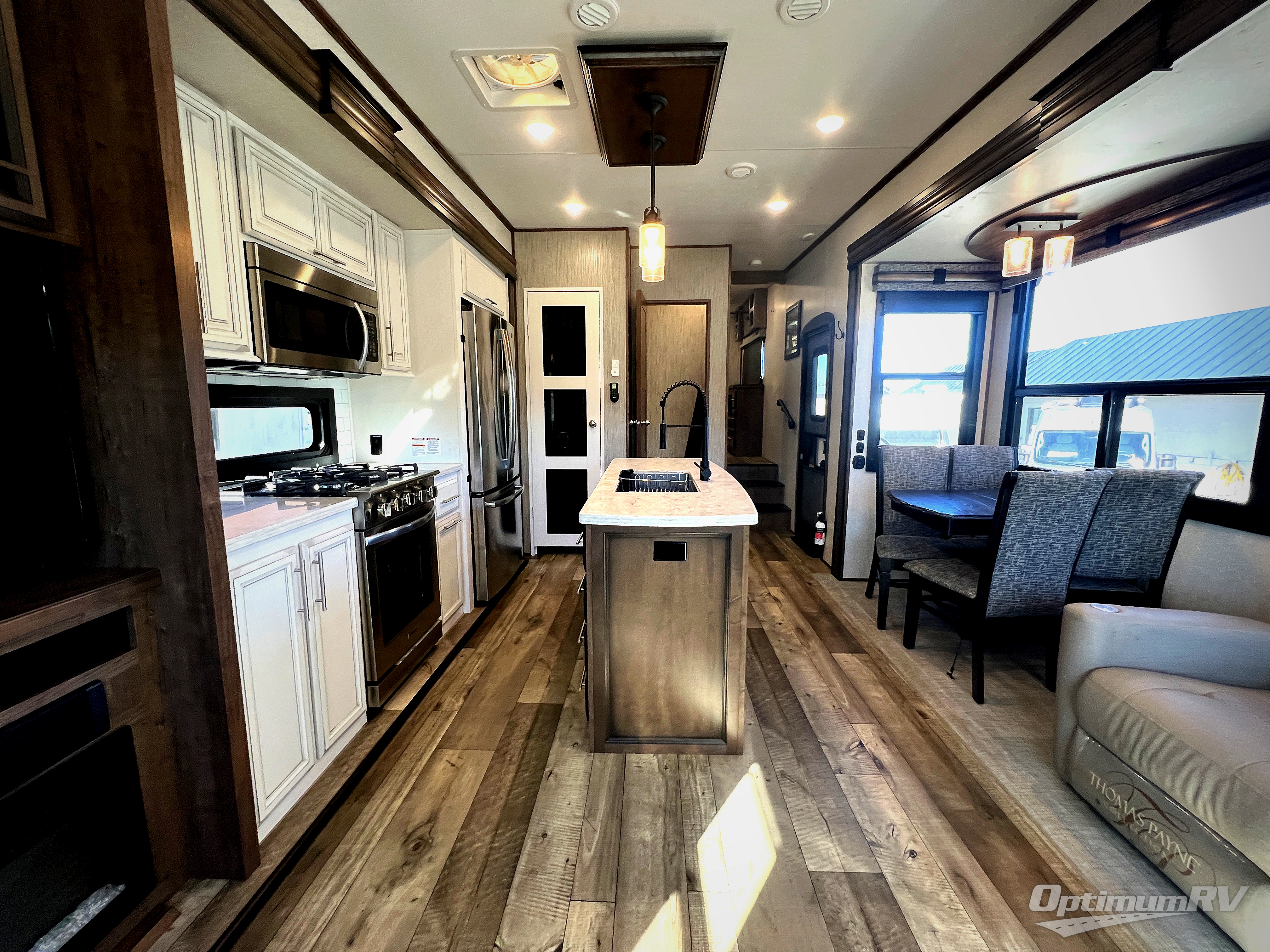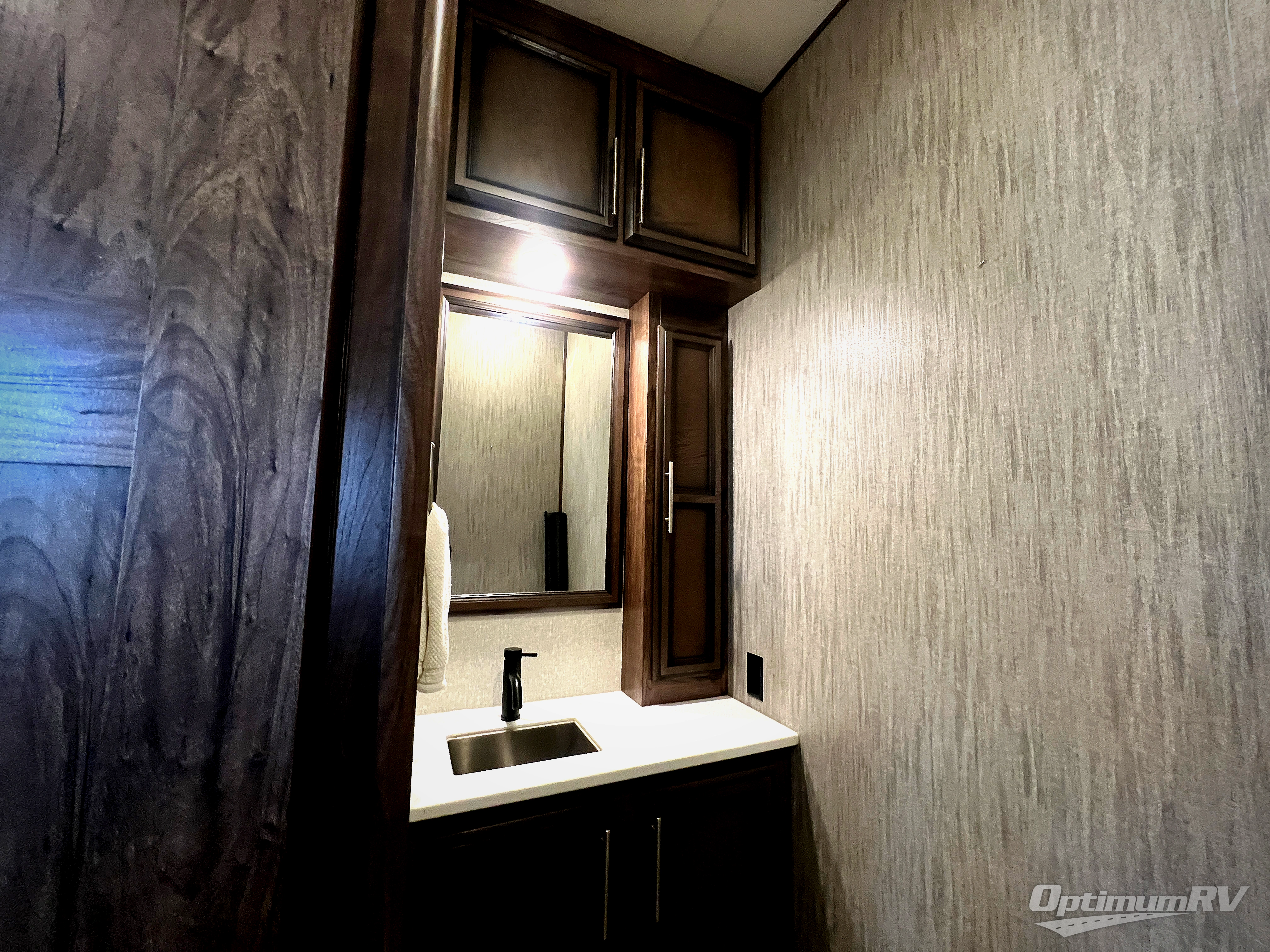 This couples fifth wheel gives you two sinks in the front spacious bathroom that also includes a wardrobe, linen storage, a washer/dryer prepped space, plus a residential shower with a seat. Sleep like a king on the electric-tilt bed that makes watching a show on the 32" LED TV comfortable and provides storage underneath with three drawers. You can relax during the day on the theater seating while watching a show on the 50" LED TV, and the fireplace at night will create a cozy atmosphere. Let the chef prepare dinner on the four-burner range or in the convection microwave and the kitchen island will provide extra counter space. And there is even a stainless steel dishwasher to make clean-up a breeze. This model features a hide-a-bed sofa your guest or the grandkids can sleep on at night and the half bath will be all theirs.
