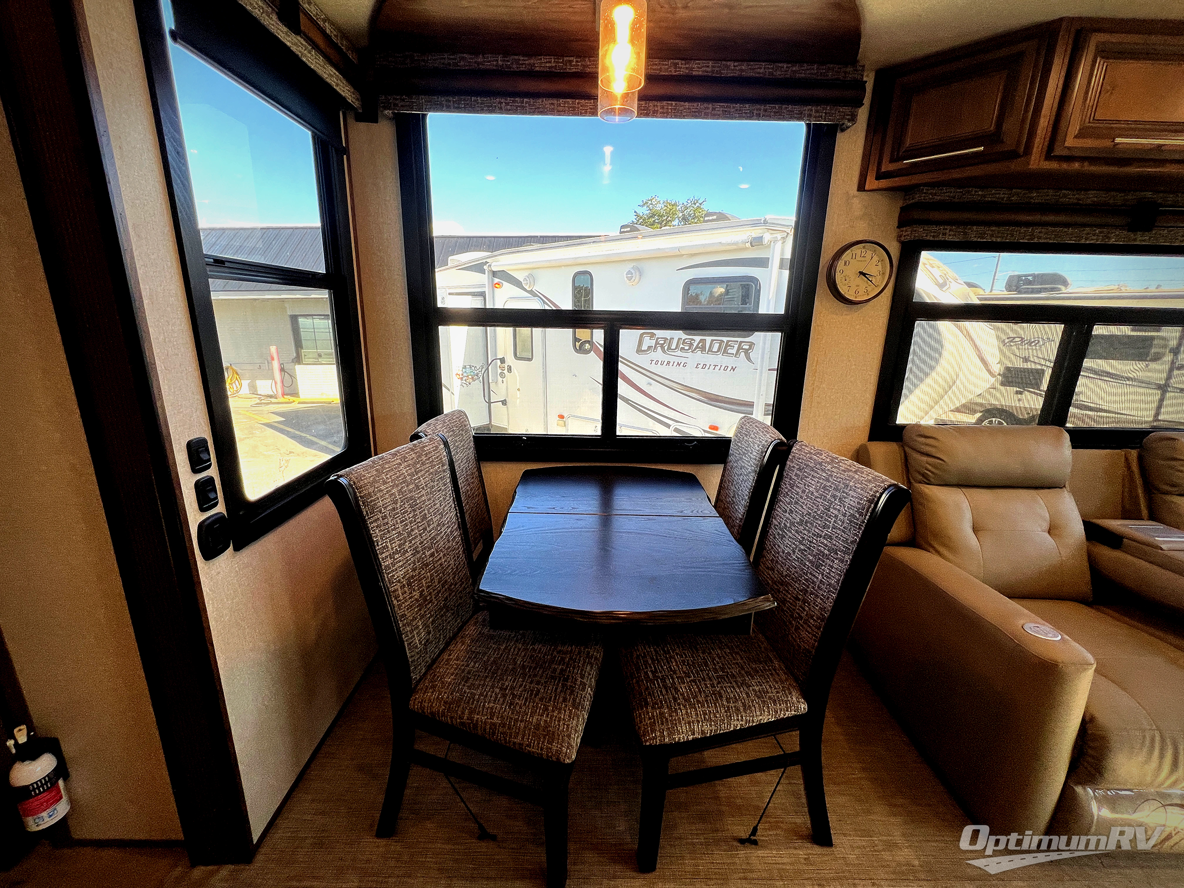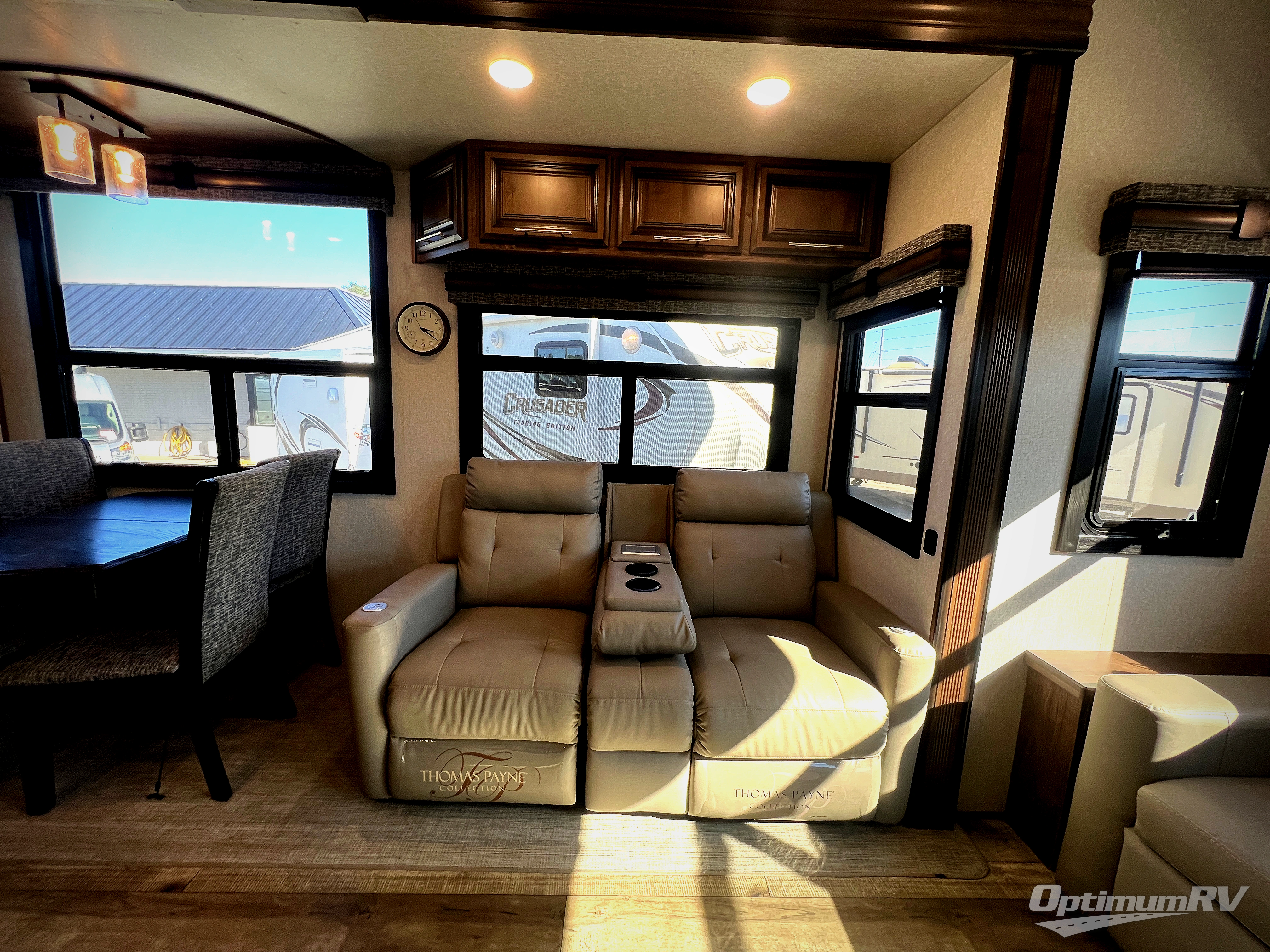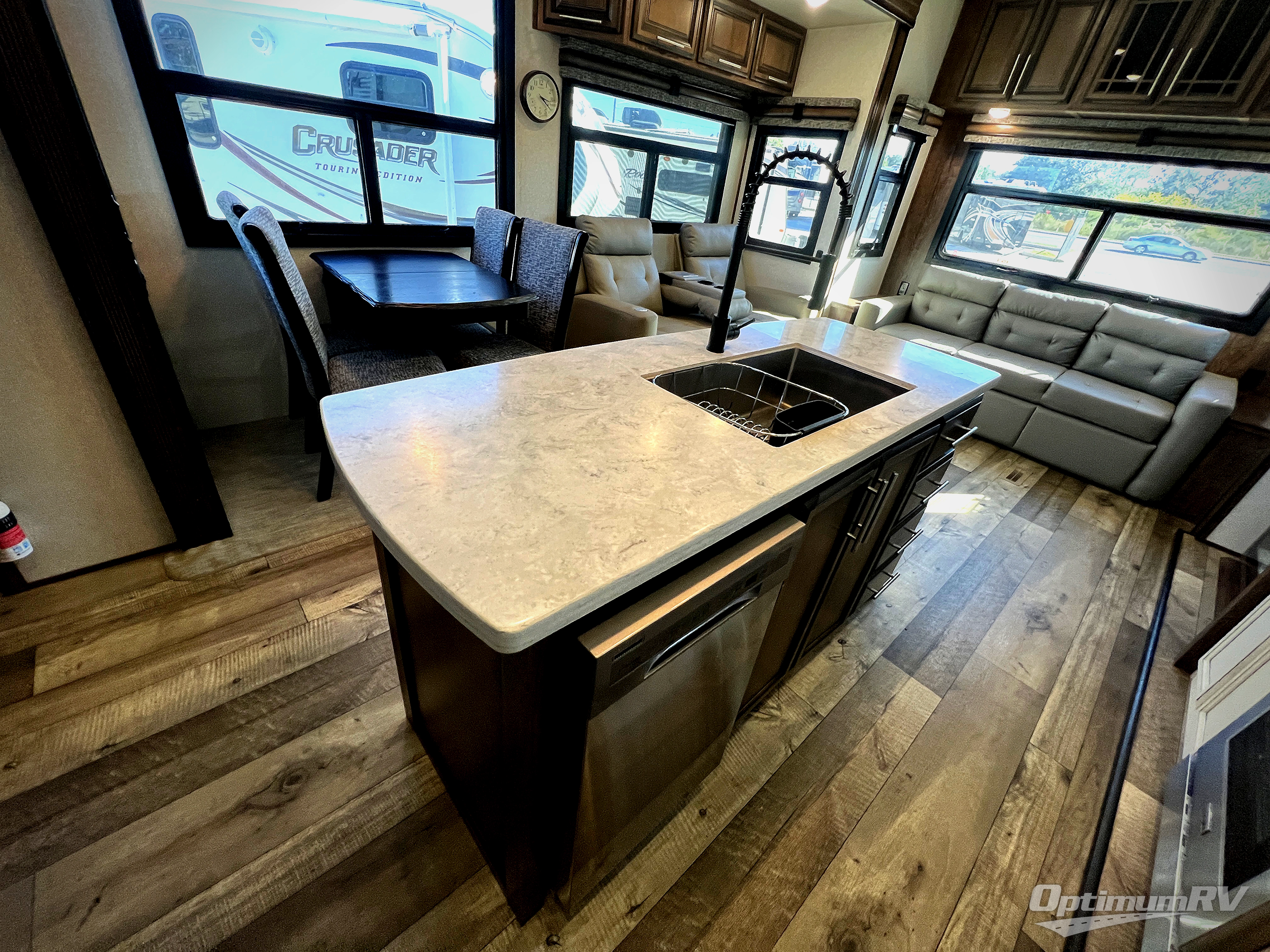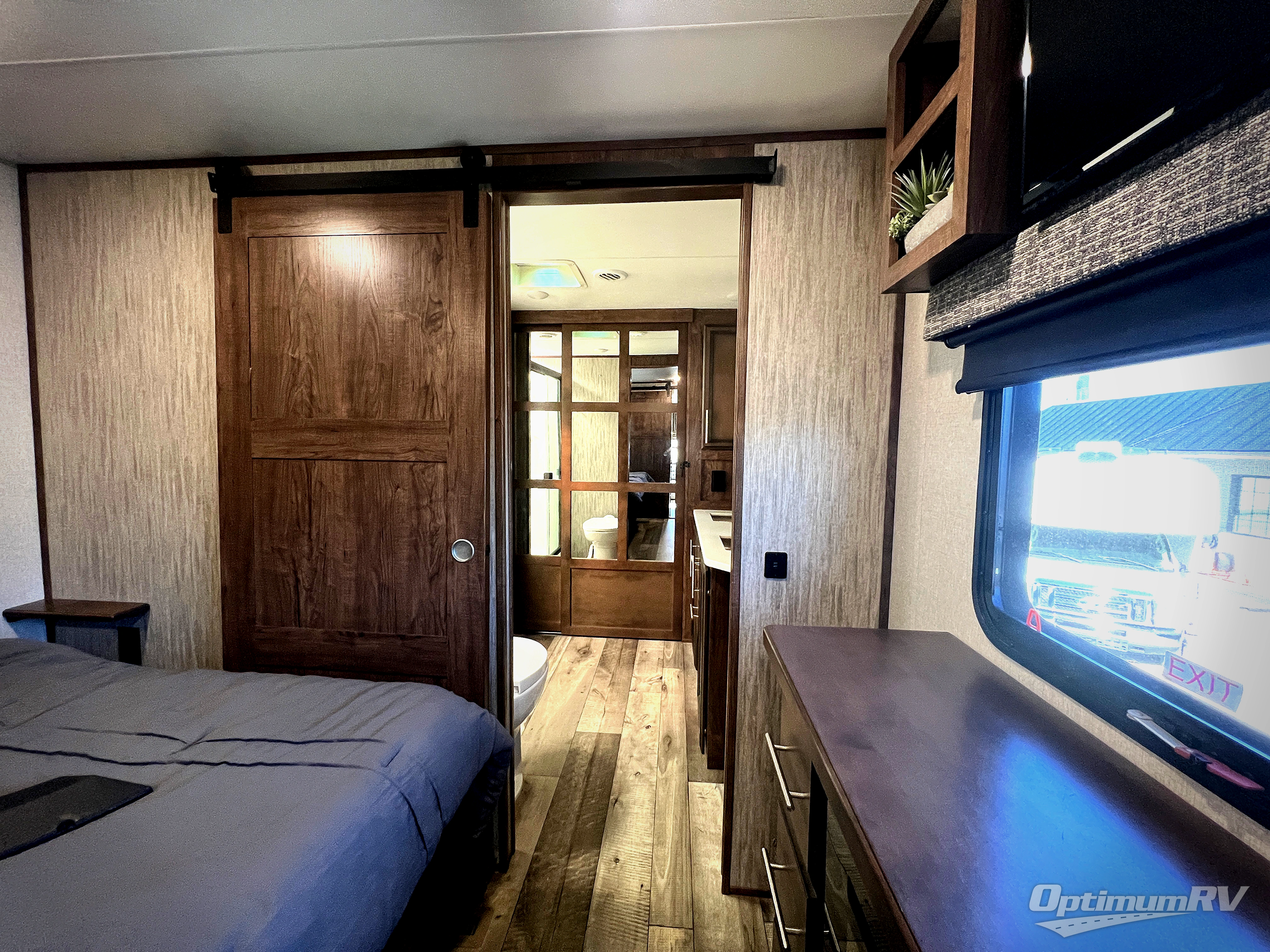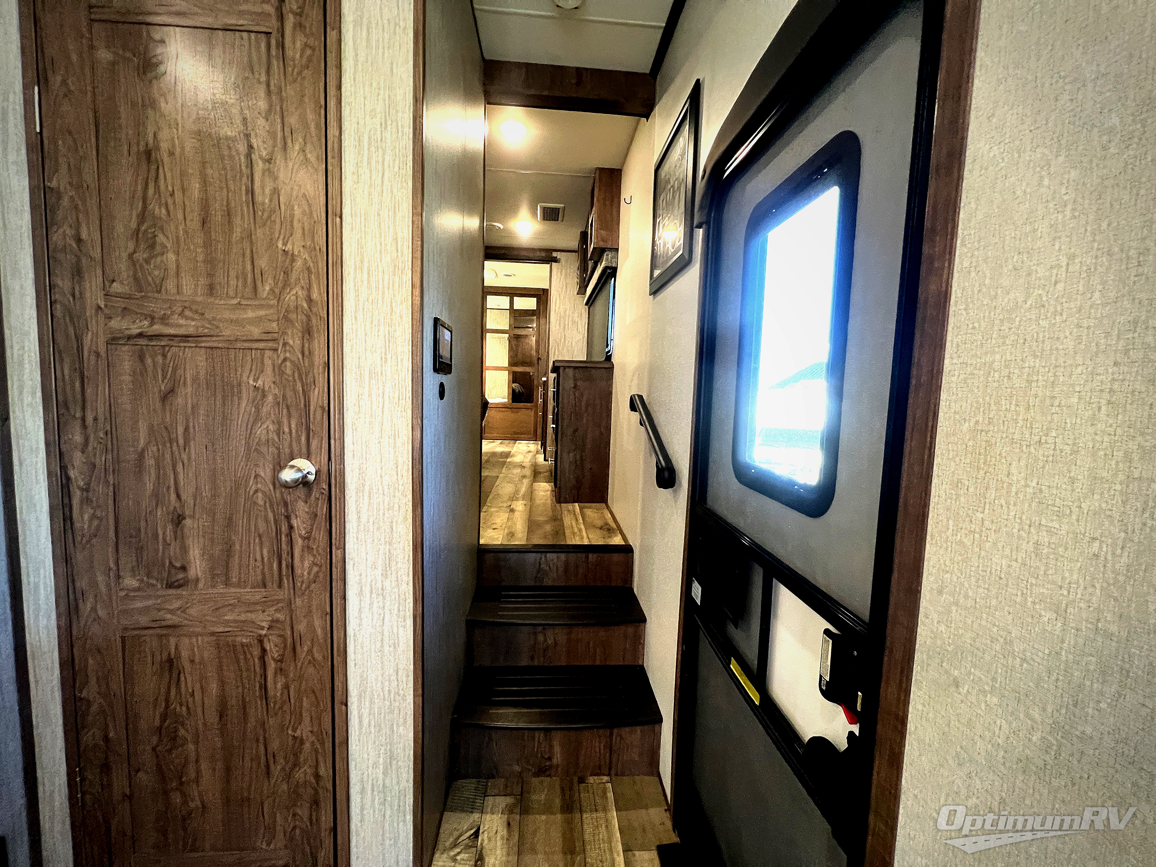 This couples fifth wheel gives you two sinks in the front spacious bathroom that also includes a wardrobe, linen storage, a washer/dryer prepped space, plus a residential shower with a seat. Sleep like a king on the electric-tilt bed that makes watching a show on the 32" LED TV comfortable and provides storage underneath with three drawers. You can relax during the day on the theater seating while watching a show on the 50" LED TV, and the fireplace at night will create a cozy atmosphere. Let the chef prepare dinner on the four-burner range or in the convection microwave and the kitchen island will provide extra counter space. And there is even a stainless steel dishwasher to make clean-up a breeze. This model features a hide-a-bed sofa your guest or the grandkids can sleep on at night and the half bath will be all theirs.