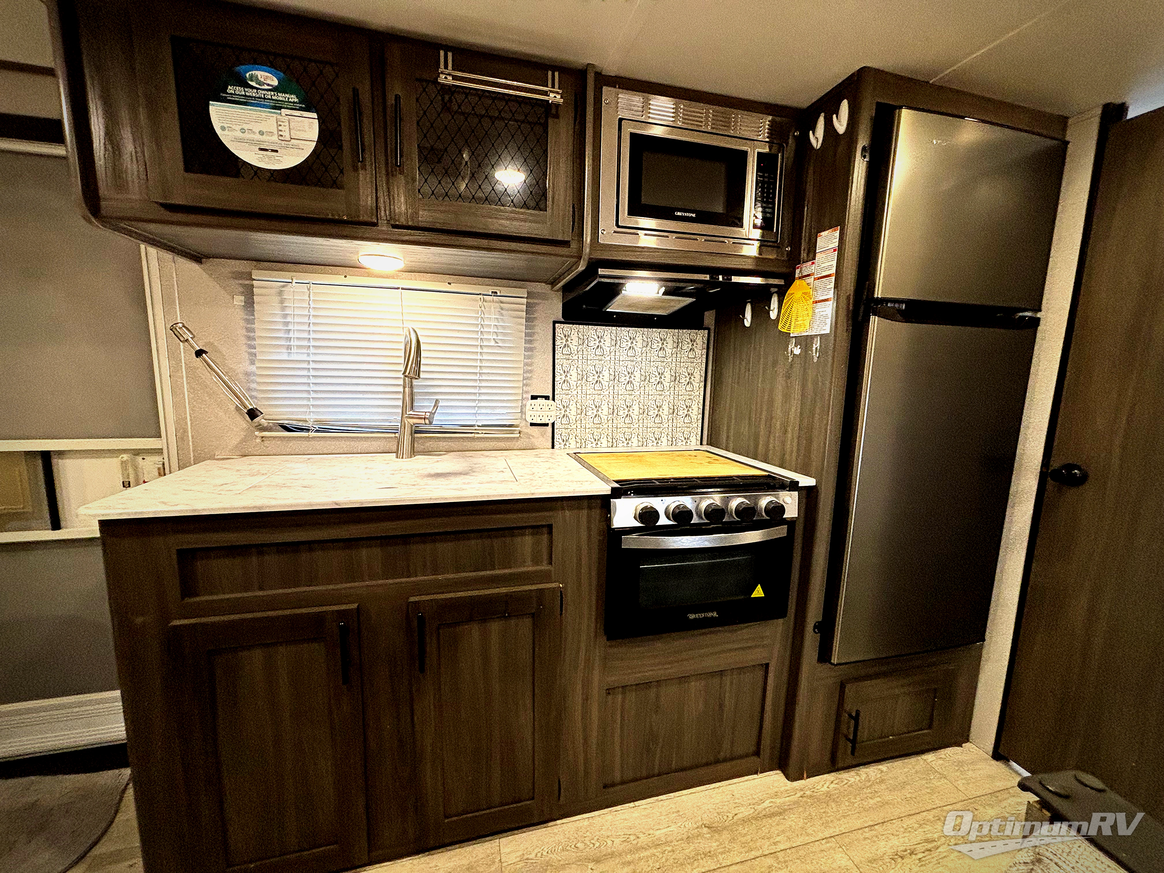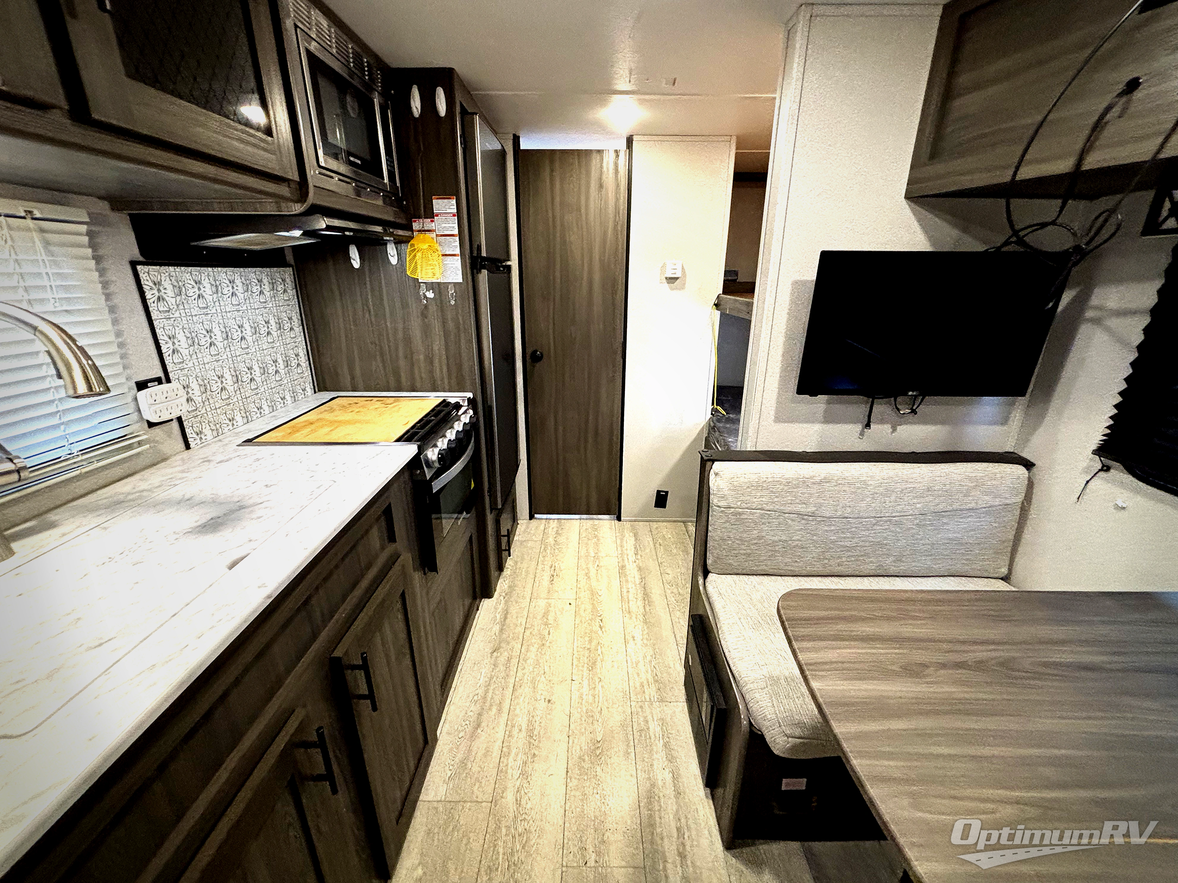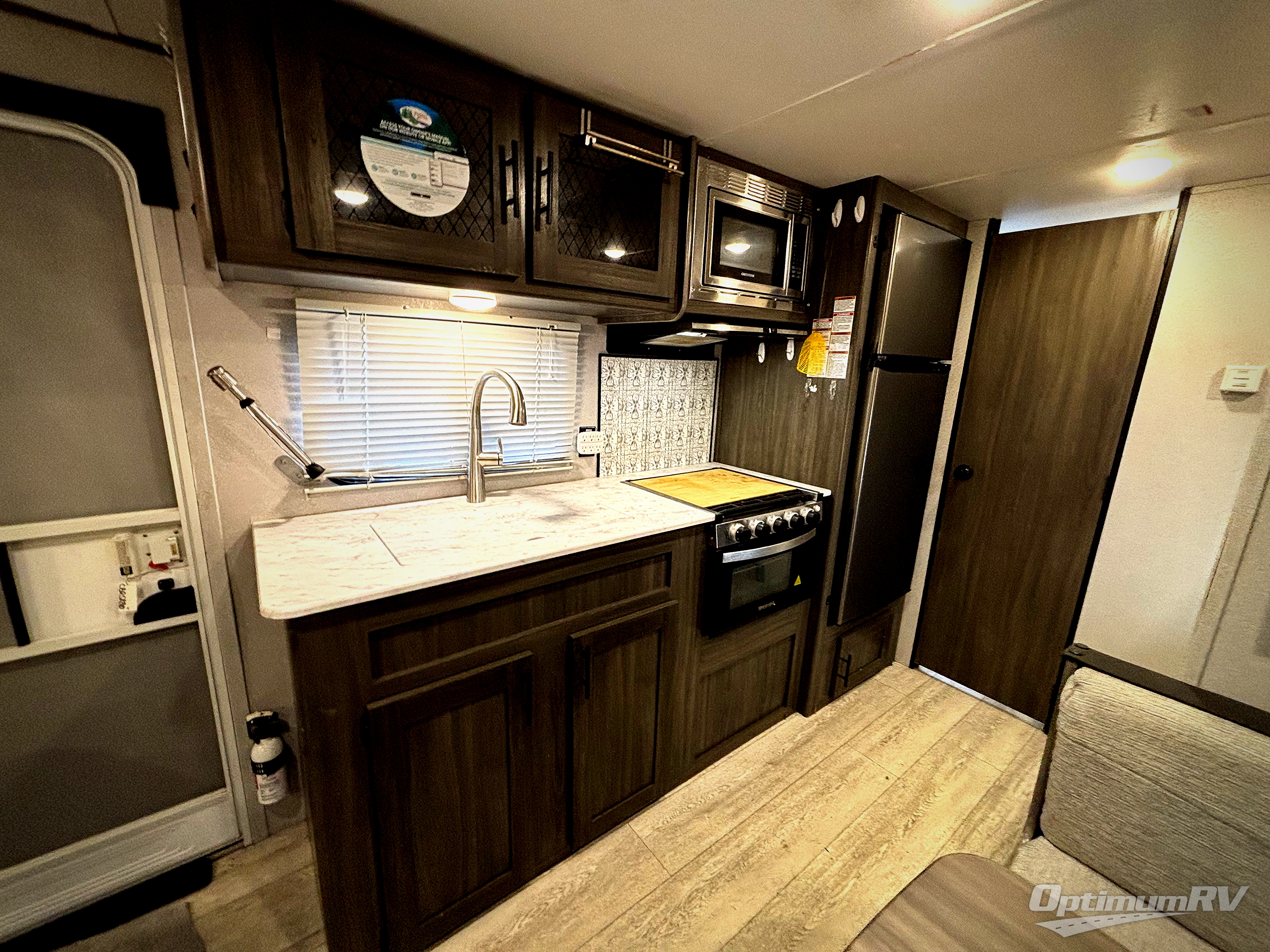 The kids or your friends will love camping in this travel trailer! It features a set of rear corner bunk beds with storage that are next to the full bathroom for easy access at night. There is also a 60" x 74" bed up front with an overhead cabinet, and the booth dinette can also transform into an extra sleeping space, plus it has an overhead entertainment. The kitchen has everything you will need to whip up a home cooked meal, as well as a microwave for those nights when you don't feel like cooking!
