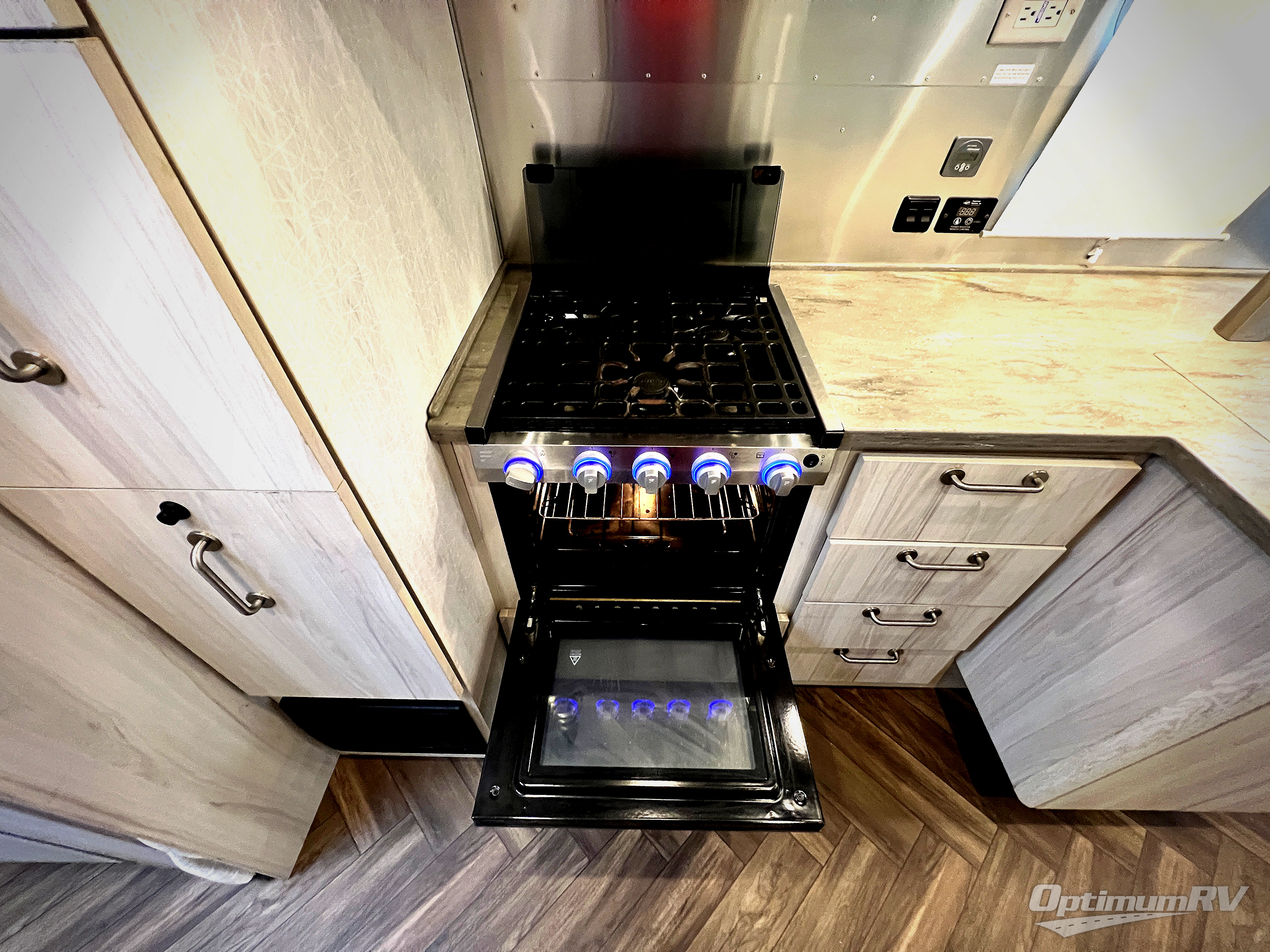 Every time you step foot into the Airstream International travel trailer, you will feel as if you are breathing in a breath of fresh air! The fresh coastal décor was inspired by the waterfront, and the stylish interior delivers a relaxing environment and comfortable luxury. The panoramic windows increase the amount of natural sunlight that streams through to the interior, but they also have blackout shades that you can close whenever you need a darkened room. The beautiful handcrafted Italian Lite-Ply laminated cabinetry is an attractive base for the overhead storage lockers that have sliding doors and LED lighting. The dimmable interior LED lighting will create the perfect amount of illumination for you as you spend time indoors. The exterior has excellent features as well with its enclosed aluminum insulated heated underbelly, unique front door key with heavy-duty deadbolt, optional solar package, solar front window protection, and exterior shower with hot and cold water.