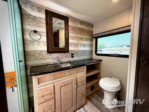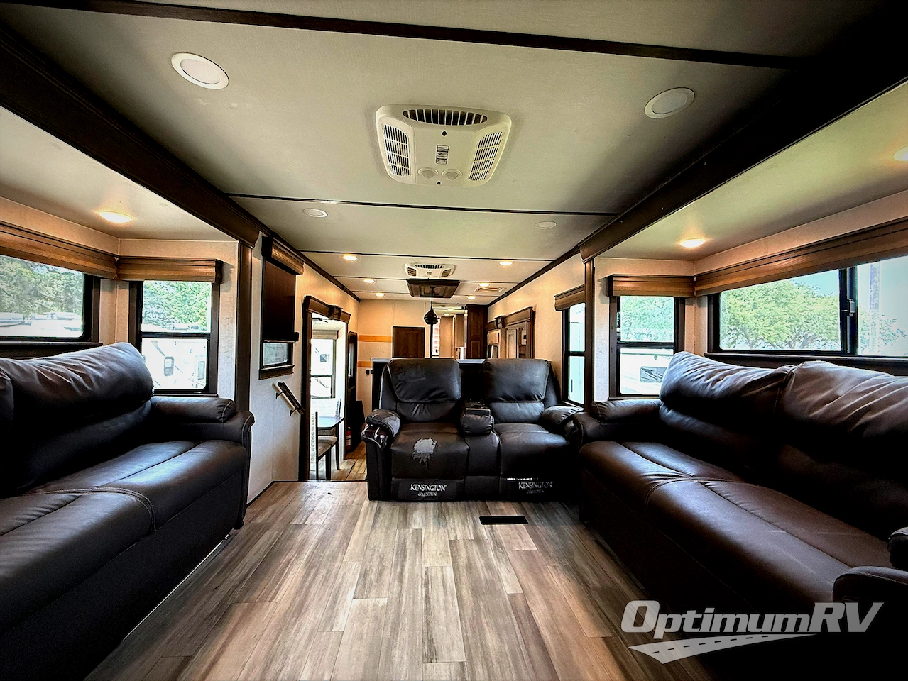 An active family will want this fifth wheel with its exterior basement pull-out tray that measures at 48" x 115" to load up your kayaks and such. Just above this area is the master suite with a rear bathroom that offers a residential shower, a porcelain toilet with soft close seat, plus a wardrobe and shelf storage. The king bed slide gives you more floor space, and you will have a seat, a flip-top dresser, and a Smart TV to watch. The half bath is next to the main entry which is super convenient, and the middle kitchen is separate from the front living area. The cook will love the residential microwave, range and oven, plus the option to add a residential refrigerator, plus the pantry, and the extra counter space on the kitchen island with a stainless steel farm sink. And the views out of the atrium windows in the slide out which includes the floating dinette table are a must see. And when you need to watch the big game, the 55" Smart TV with pull-out fireplace below are up front with the dual recliner love seat and two sleeper sofas.