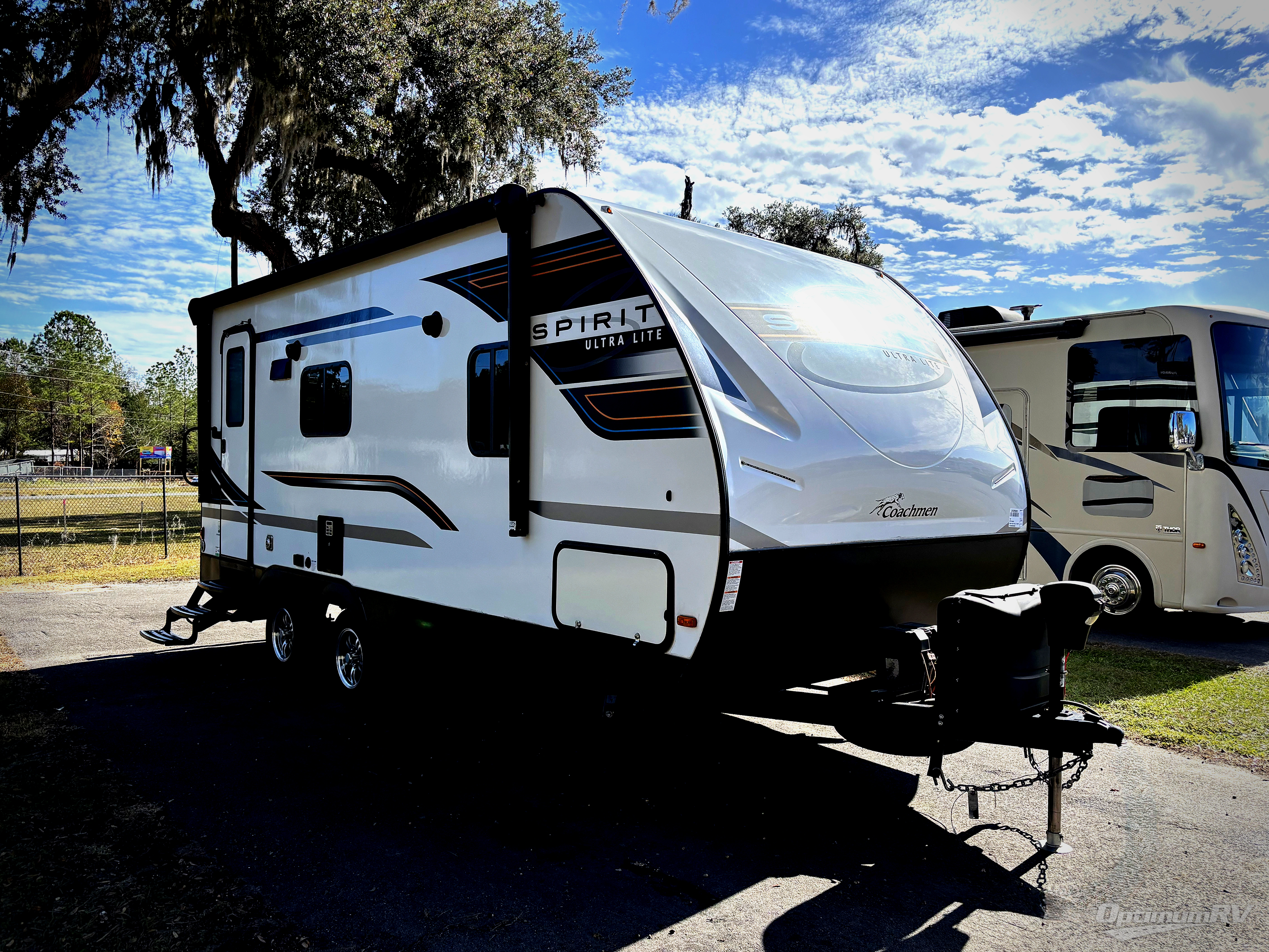 With any Northern Spirit Ultra Lite travel trailer by Coachmen, the "Twice Cool" dual ducted air conditioning system, the motion activated floor lights in the bedroom and bathroom, the lighted USB ports, the digital level, and the motion activated pass-through storage light plus fishing pole storage, will make your camping experience simplified. The heated and enclosed underbelly provides protection on the road and allows you to camp during any season, the 100W solar panel with 10 amp controller provides off-grid camping, and the power tongue jack makes setup easier. Each is built with a painted fiberglass front cap with LED strip lights, a laminated, aluminum framed floor, rear wall, and sidewalls, plus 5" trusses with interior vault. Make your decision today, and camp with everything in its place!