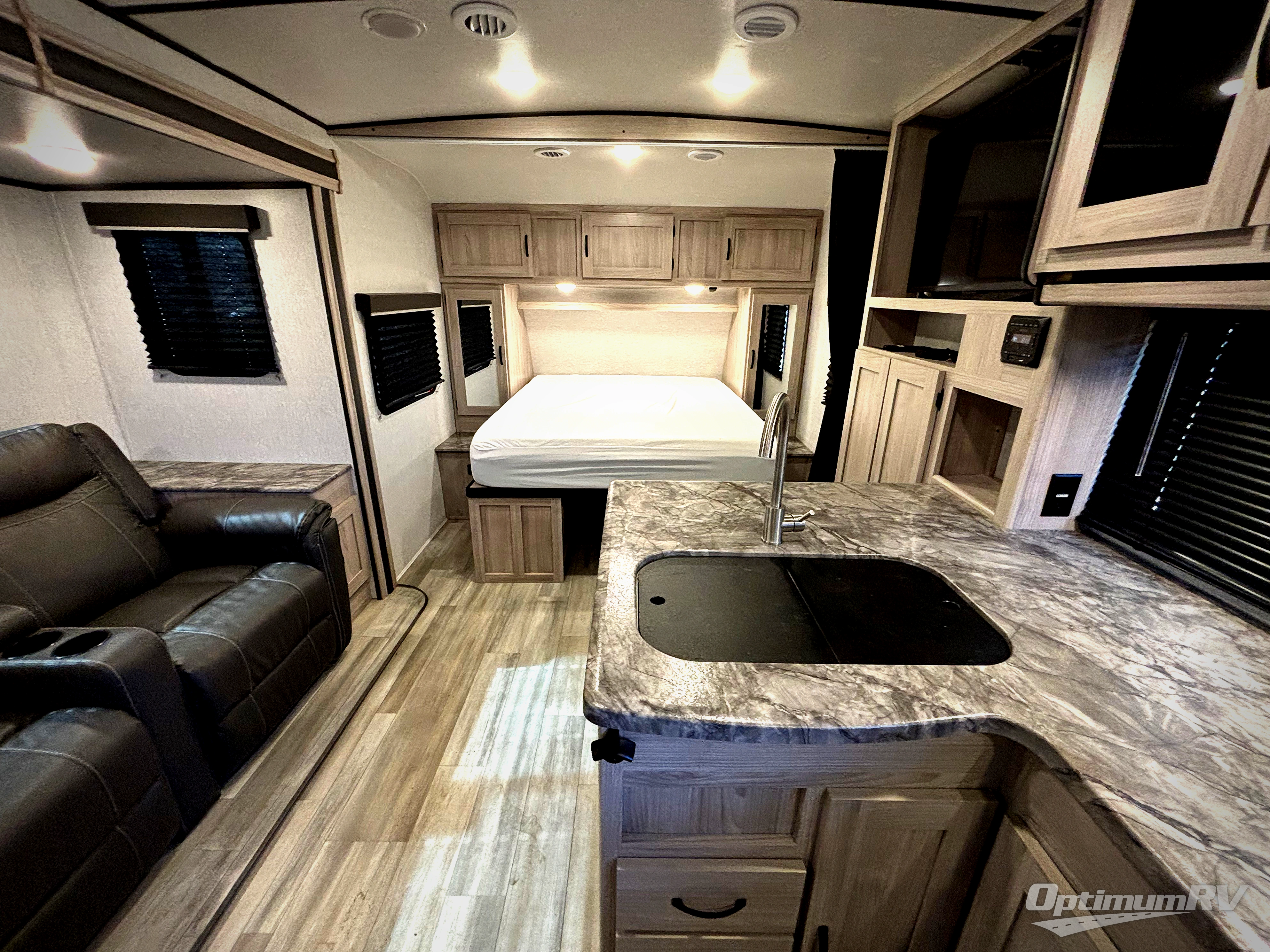 Sleep like a queen at any campsite when you have this trailer setup. You will find the interior is spacious with a slide out sofa including end tables for your drinks and cellphones, and convenient with a rear corner bathroom including a radius shower and linen storage. Your dog can stay clean as well with the exterior dog wash and the dog leash clip will keep them safely at the campsite. While outside you might decide to relax under the power awning, and store a few items in the pass-through compartment up front including fishing poles. And the cook will love the L-shaped counter, the appliances, the sink cover hide-away space, the hutch and the bar stools when wanting to take a break or visit with friends.