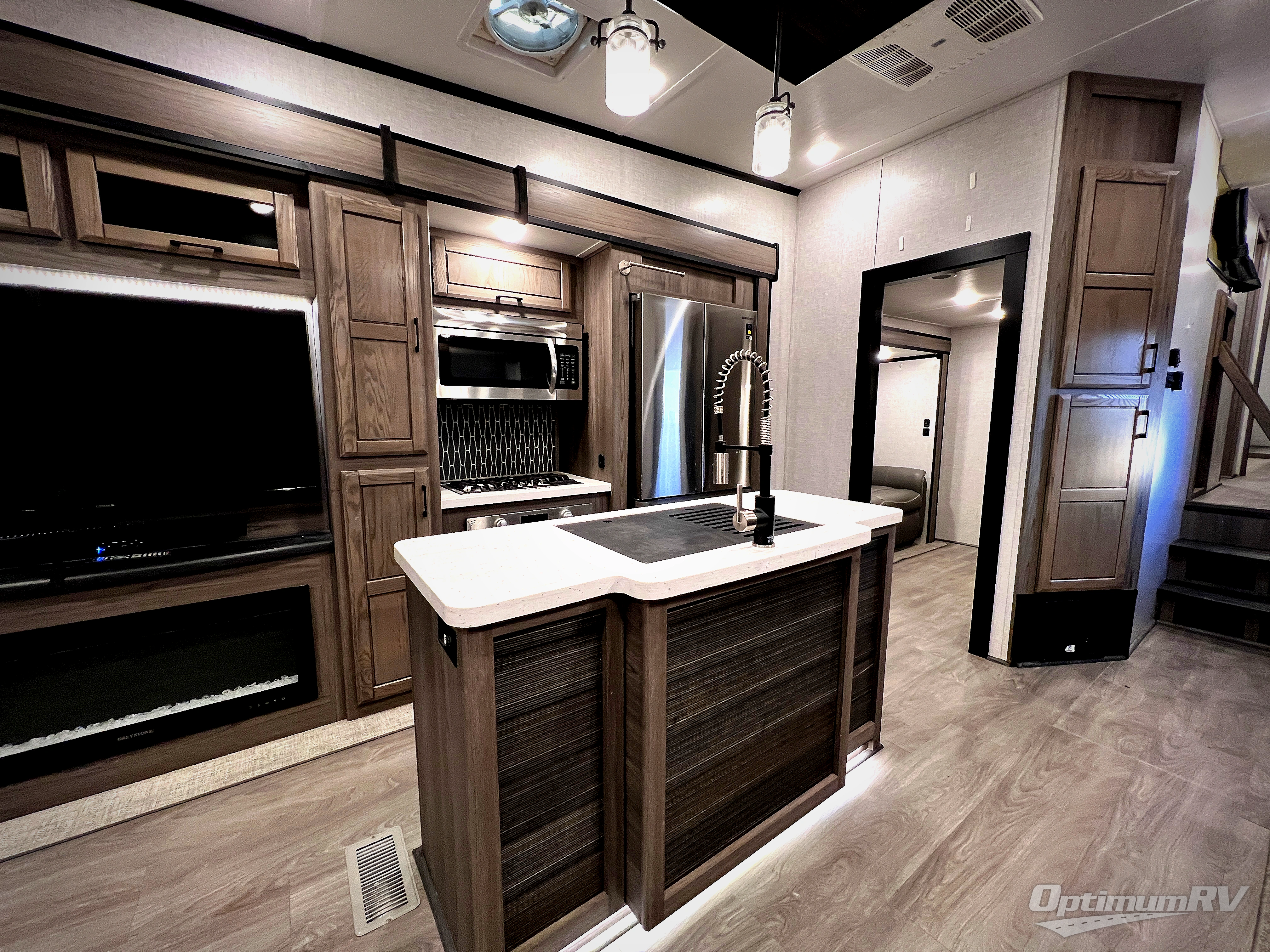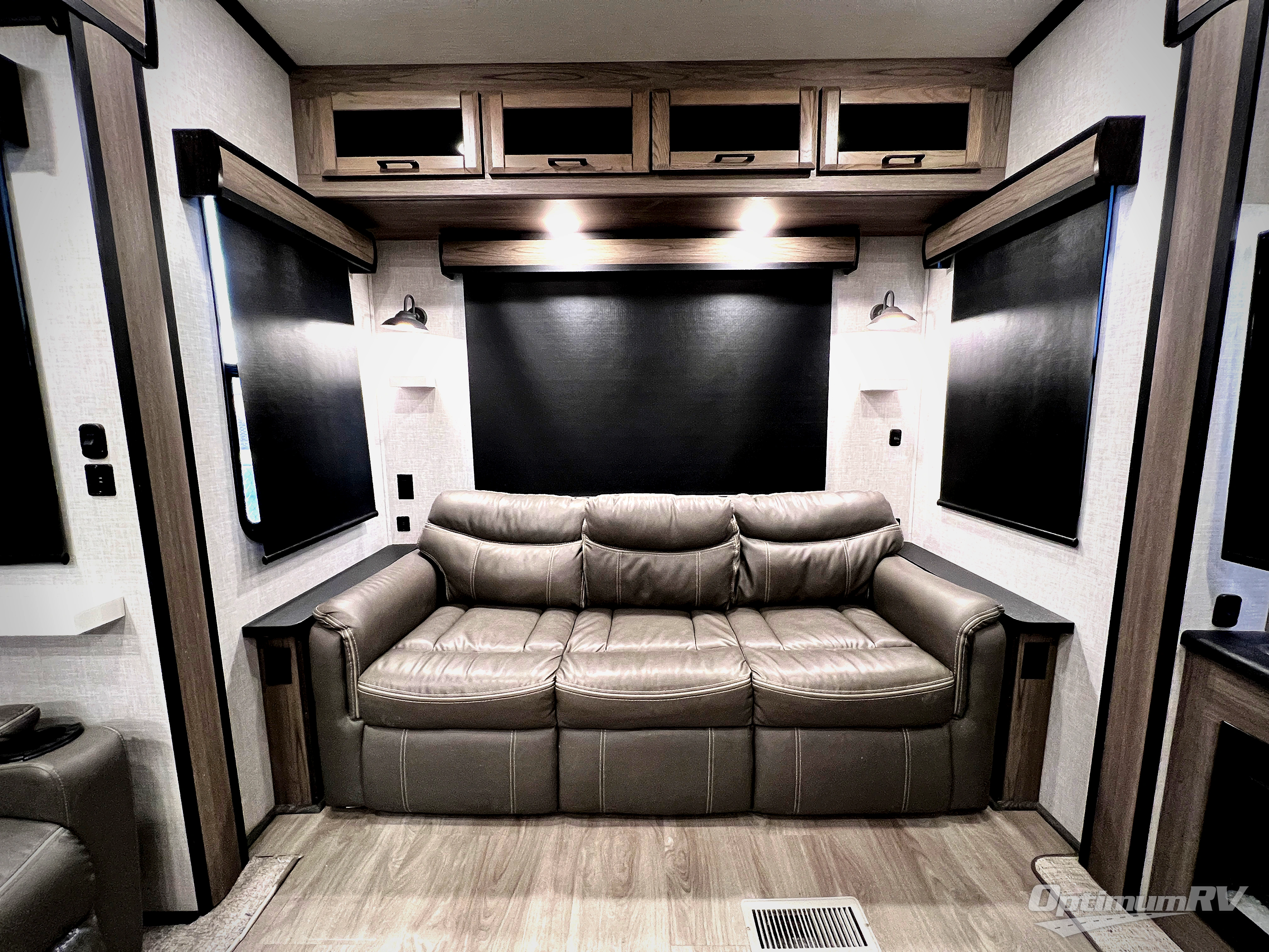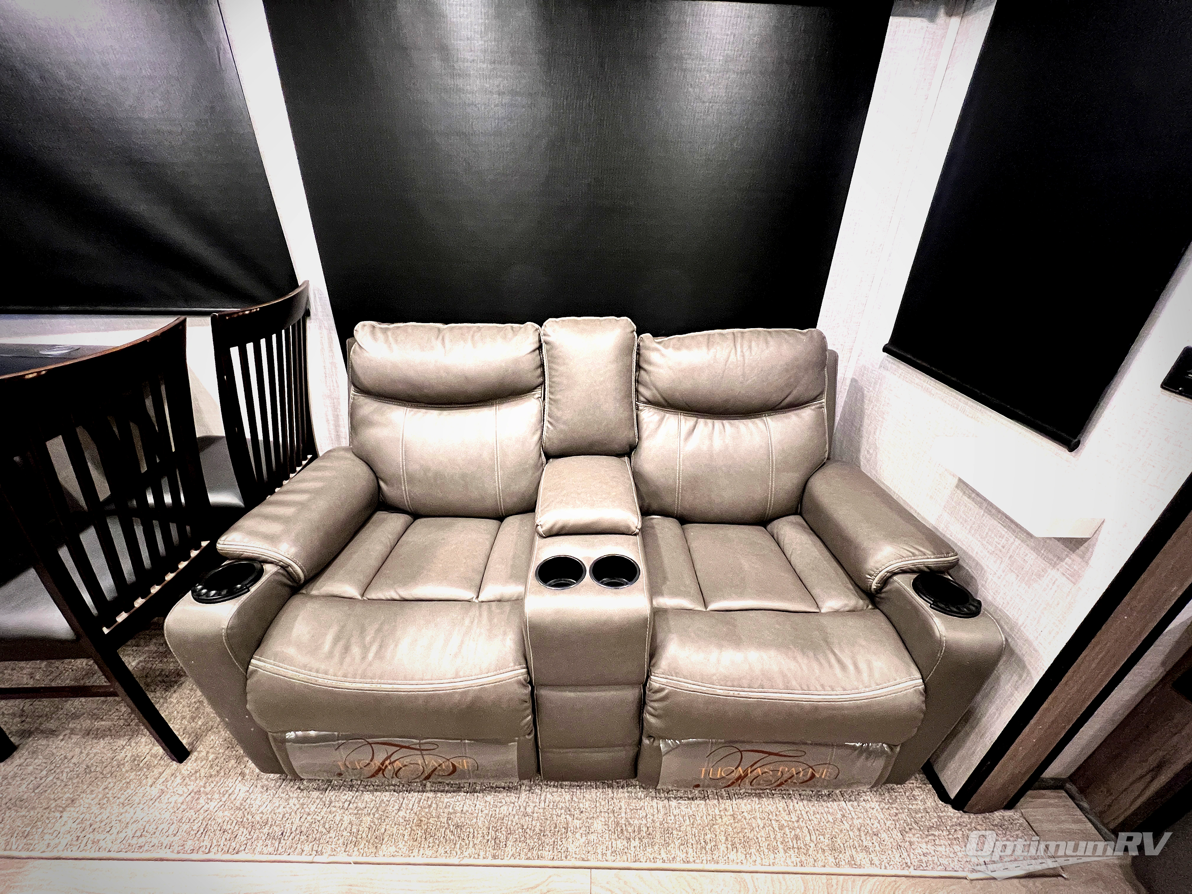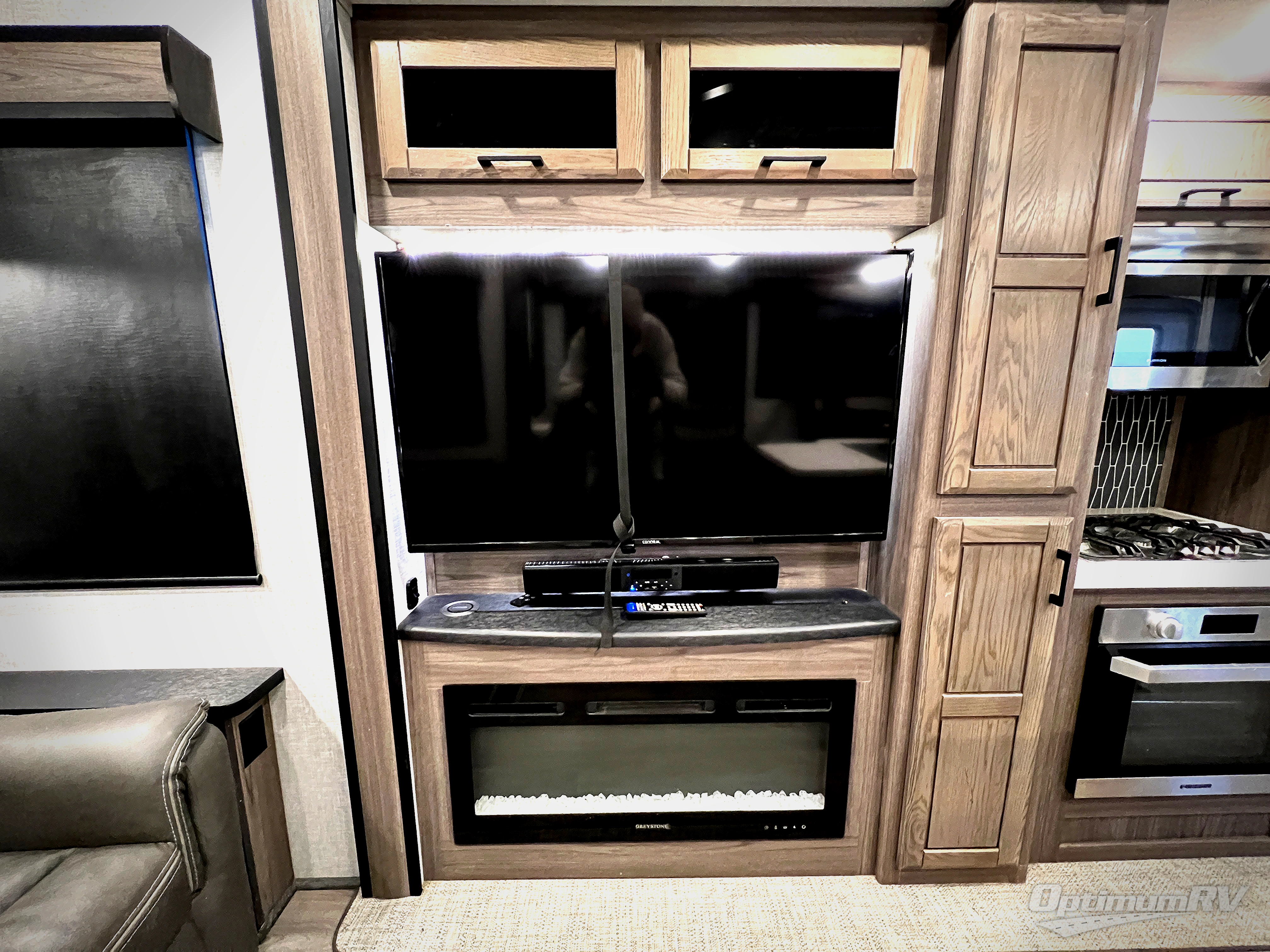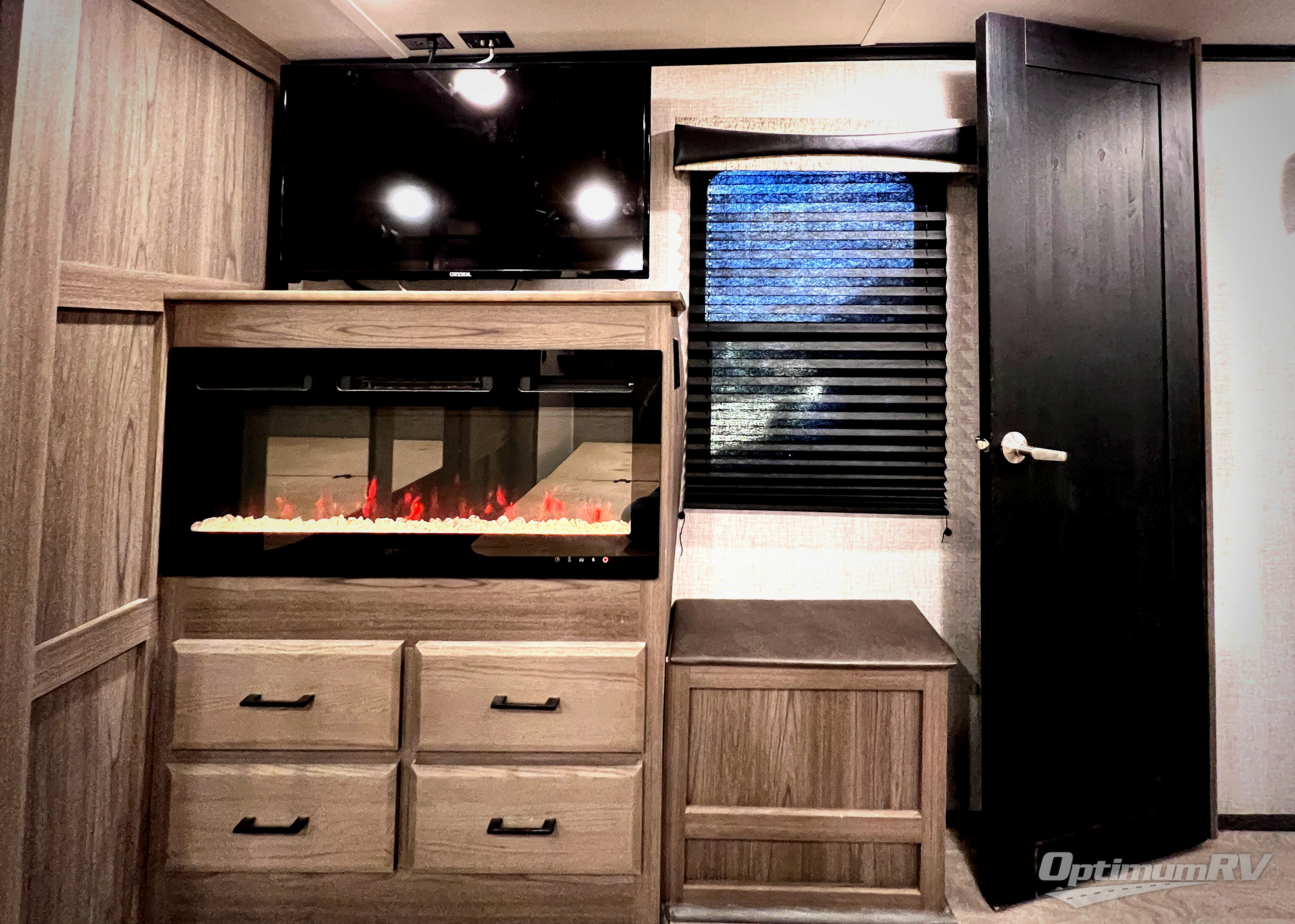With two bedrooms, everyone will have their own comfortable place to sleep in this fifth wheel! The front private bedroom has a king bed slide, a dresser base with a fireplace and 39" TV, a bench seat, and a front closet that is prepped to add an optional washer and dryer. The second bedroom has a tri-fold sofa, a dresser, a wardrobe, and overhead cabinets, plus a loft above it all for storage or sleeping. Prepare your best home cooked meals with the Furrion kitchen collection and the kitchen island then enjoy them at the dinette. There is even an outside kitchen with a refrigerator, a sink, and a two burner cooktop to breathe in some fresh air while you cook and stay protected by the 18' power awning. Relax in true comfort each night on either the rear tri-fold sofa or the power theater seating across from the entertainment center with a fireplace and a 50" TV.