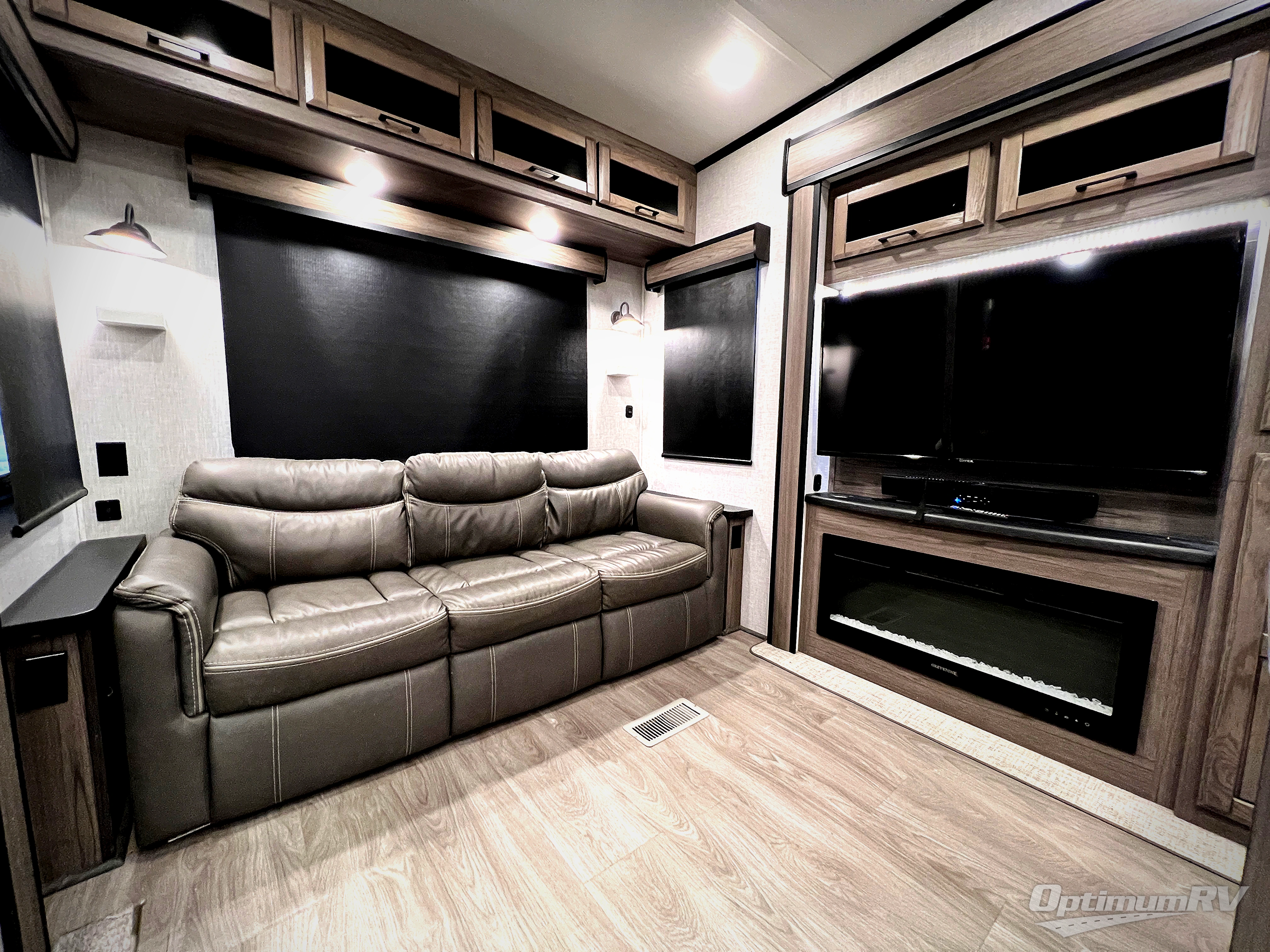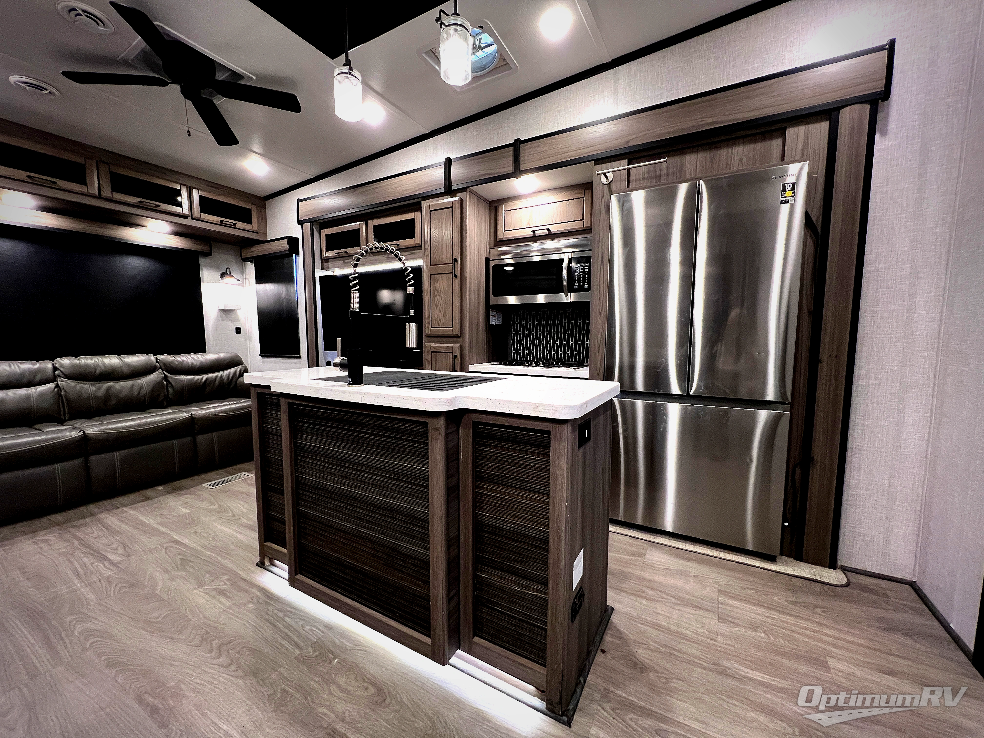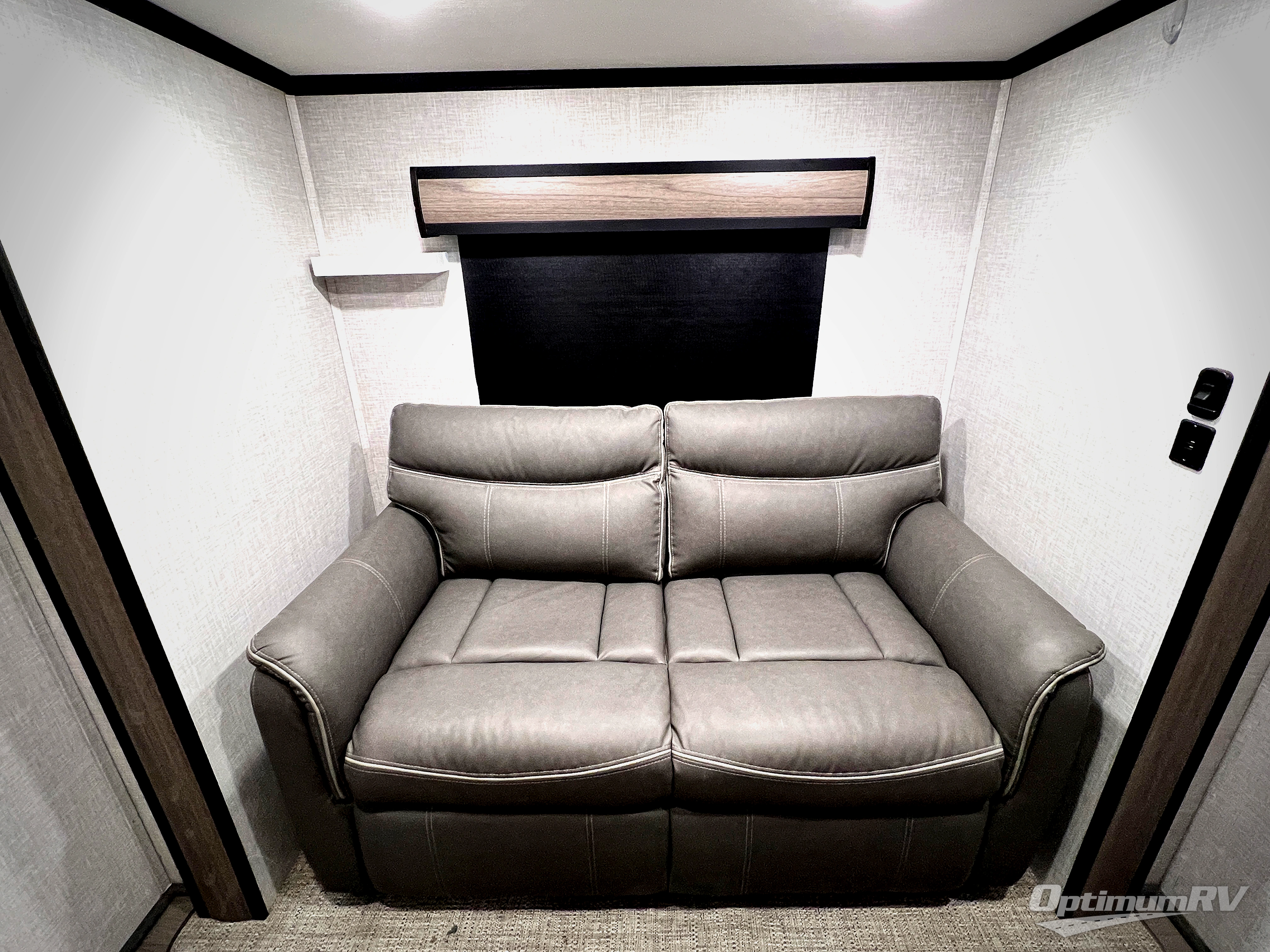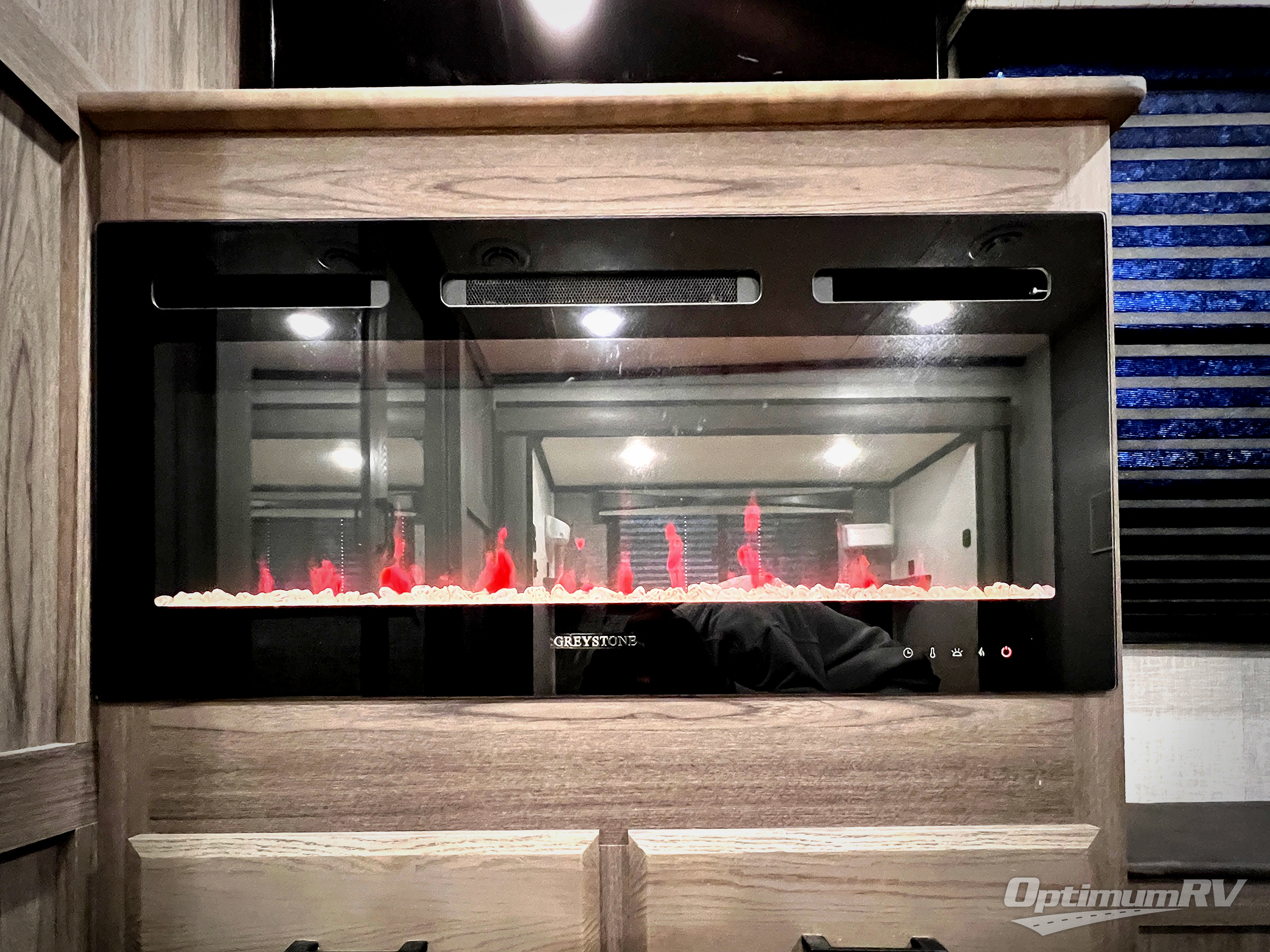 With two bedrooms, everyone will have their own comfortable place to sleep in this fifth wheel! The front private bedroom has a king bed slide, a dresser base with a fireplace and 39" TV, a bench seat, and a front closet that is prepped to add an optional washer and dryer. The second bedroom has a tri-fold sofa, a dresser, a wardrobe, and overhead cabinets, plus a loft above it all for storage or sleeping. Prepare your best home cooked meals with the Furrion kitchen collection and the kitchen island then enjoy them at the dinette. There is even an outside kitchen with a refrigerator, a sink, and a two burner cooktop to breathe in some fresh air while you cook and stay protected by the 18' power awning. Relax in true comfort each night on either the rear tri-fold sofa or the power theater seating across from the entertainment center with a fireplace and a 50" TV.