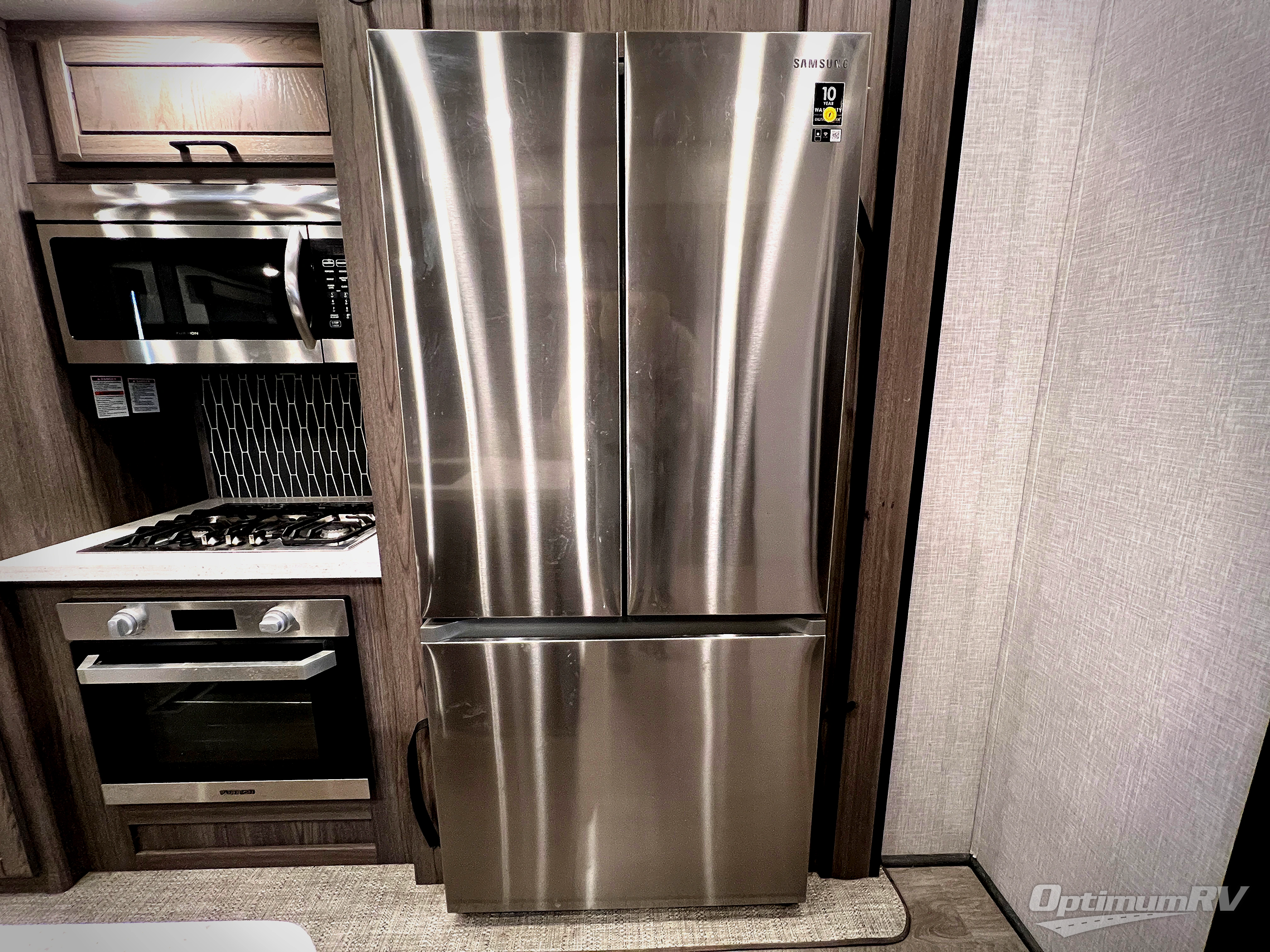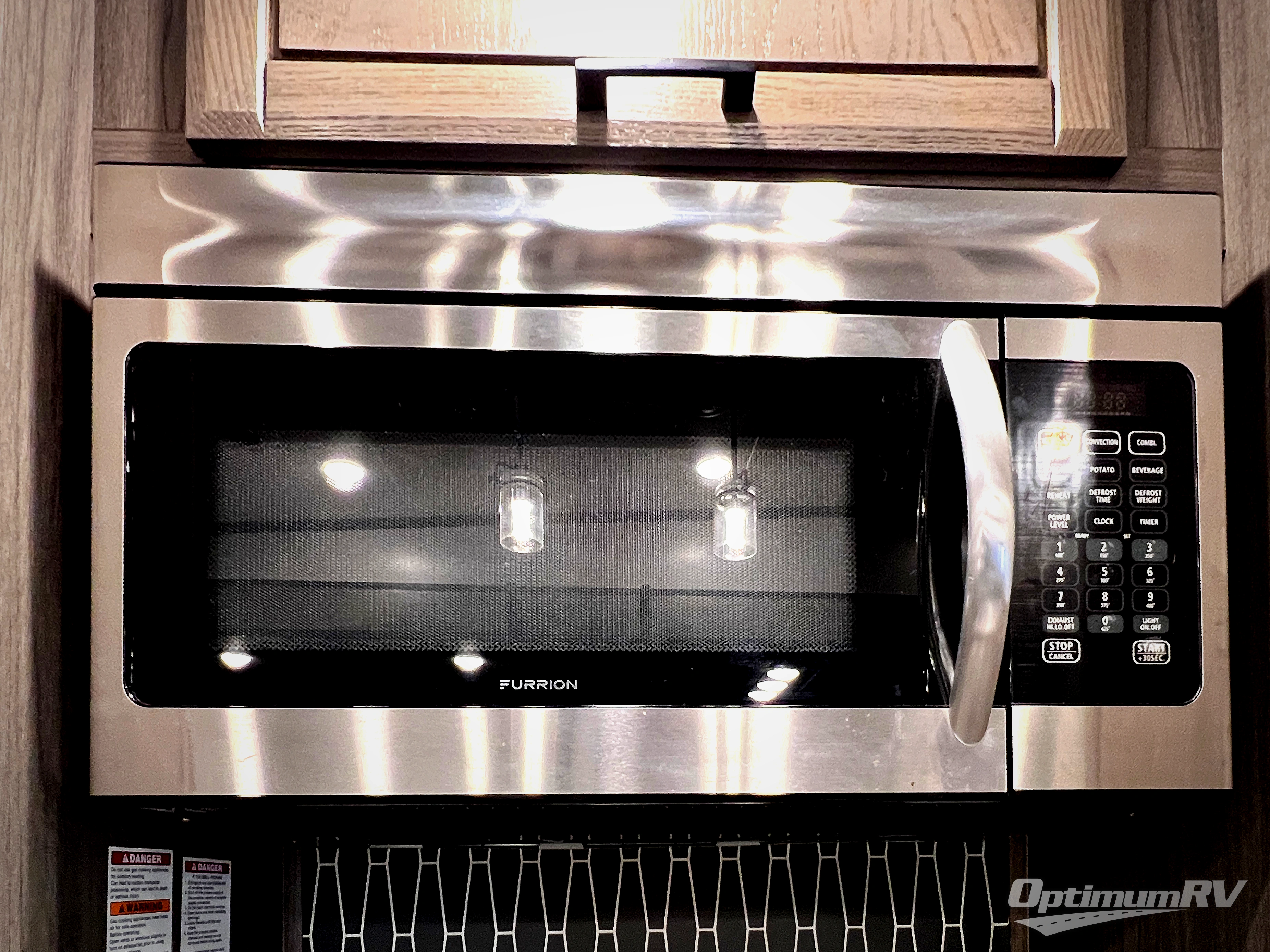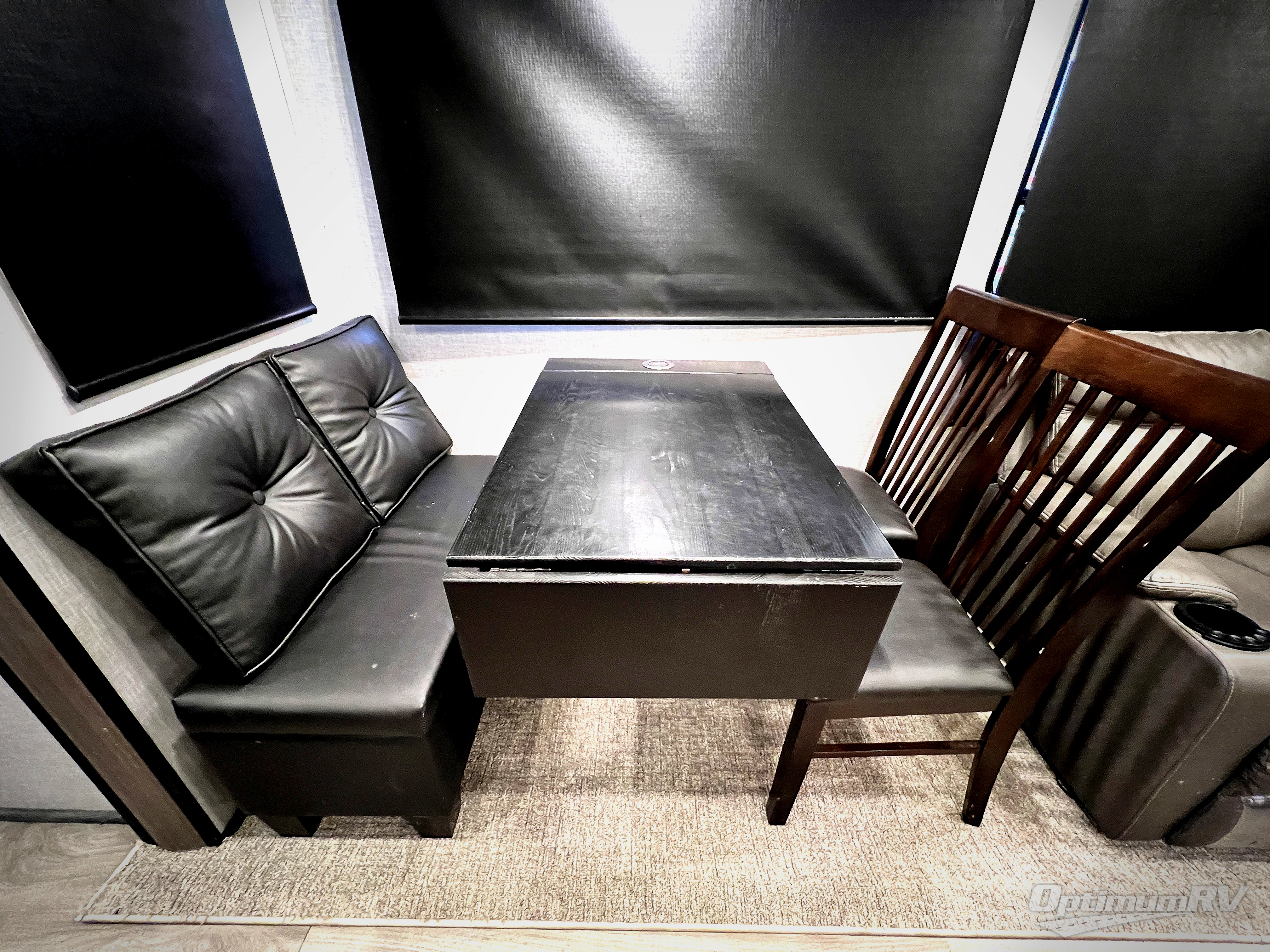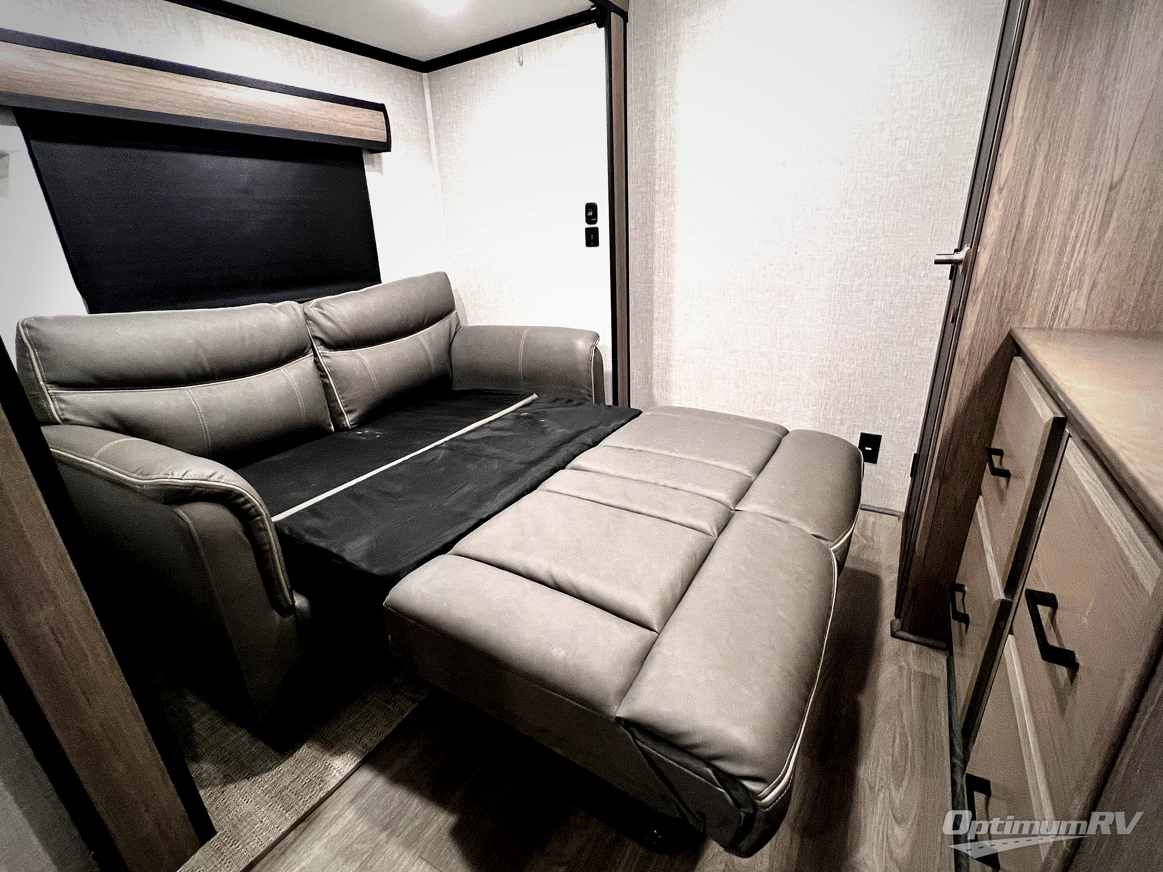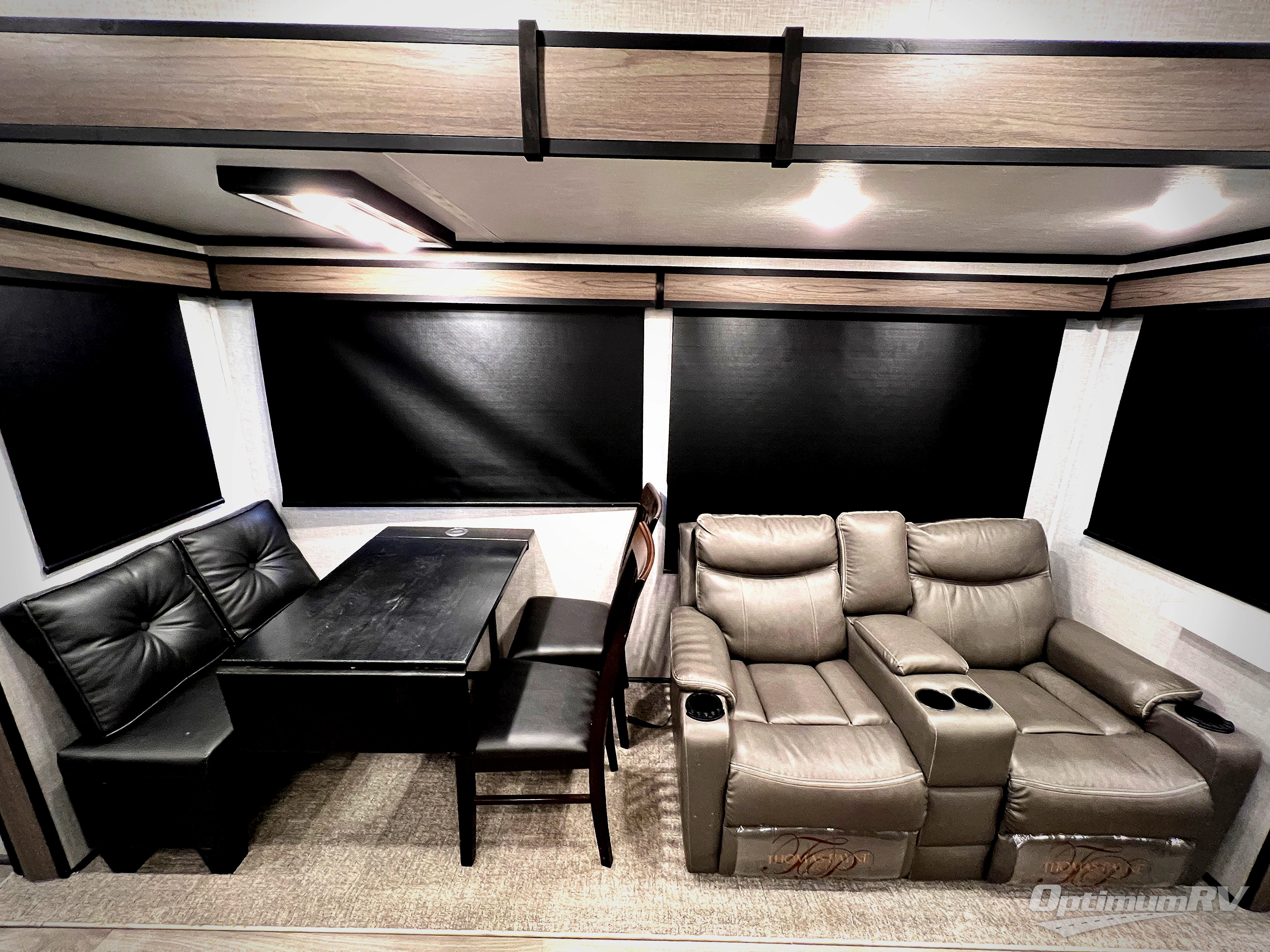 With two bedrooms, everyone will have their own comfortable place to sleep in this fifth wheel! The front private bedroom has a king bed slide, a dresser base with a fireplace and 39" TV, a bench seat, and a front closet that is prepped to add an optional washer and dryer. The second bedroom has a tri-fold sofa, a dresser, a wardrobe, and overhead cabinets, plus a loft above it all for storage or sleeping. Prepare your best home cooked meals with the Furrion kitchen collection and the kitchen island then enjoy them at the dinette. There is even an outside kitchen with a refrigerator, a sink, and a two burner cooktop to breathe in some fresh air while you cook and stay protected by the 18' power awning. Relax in true comfort each night on either the rear tri-fold sofa or the power theater seating across from the entertainment center with a fireplace and a 50" TV.