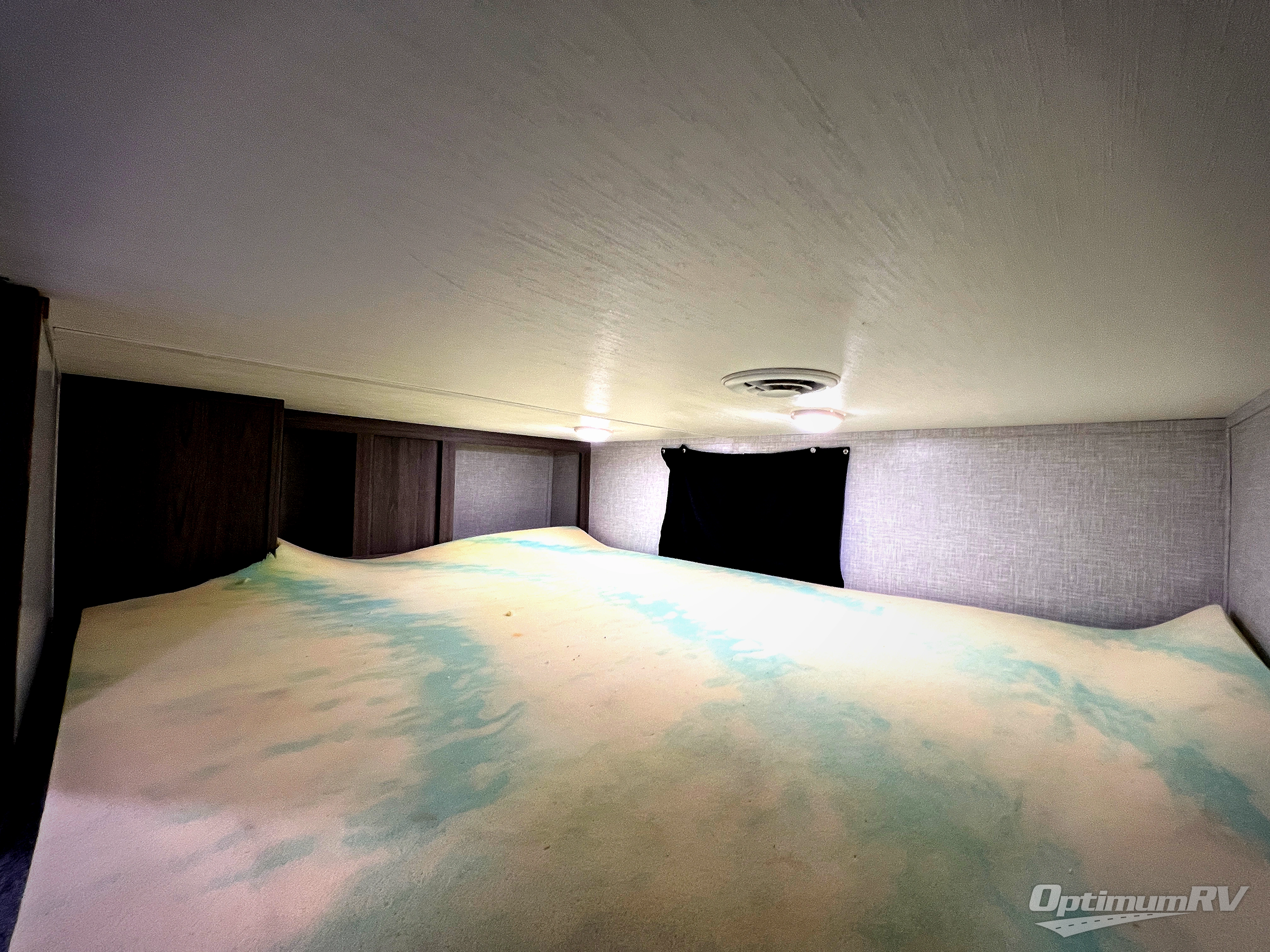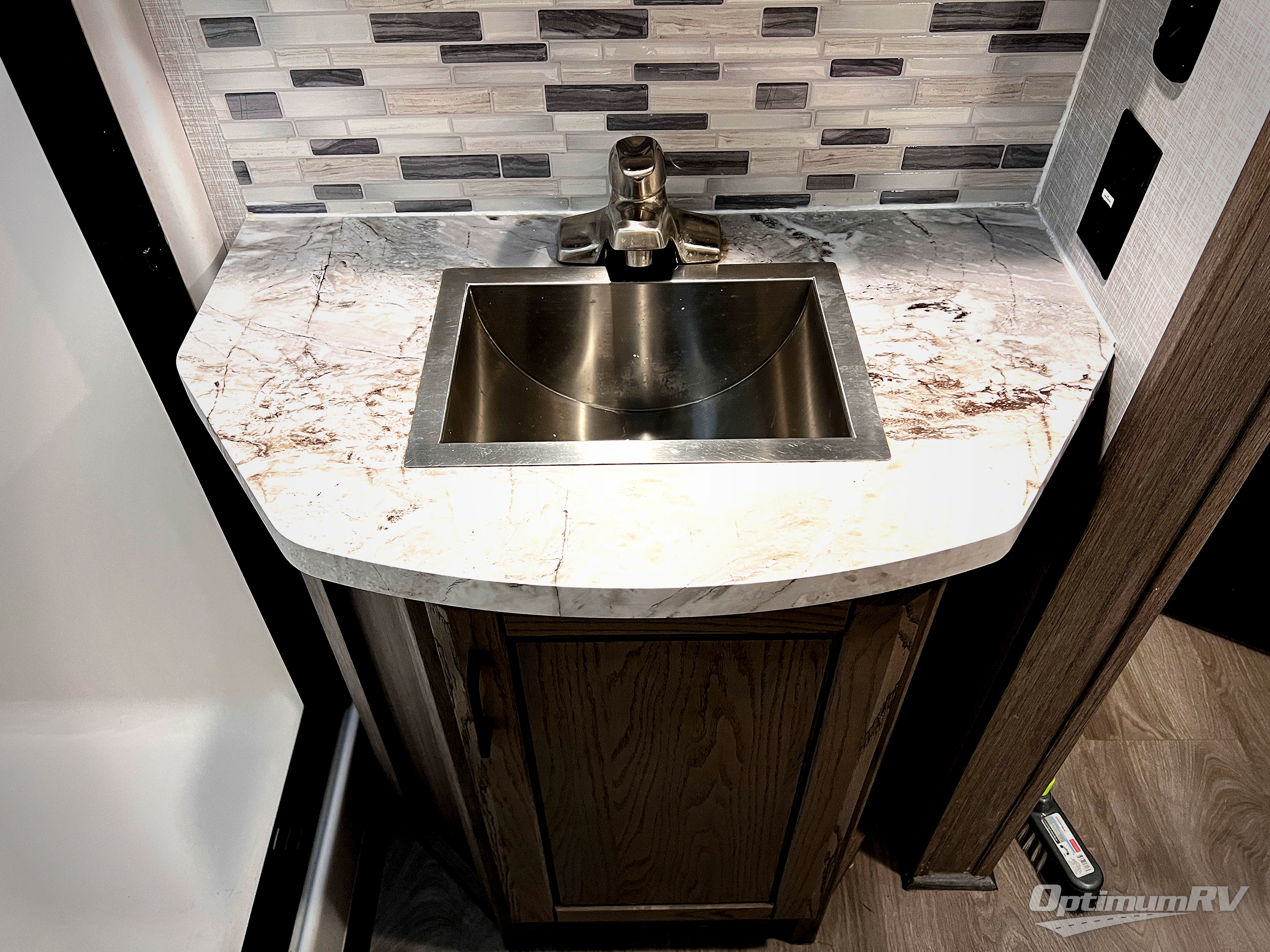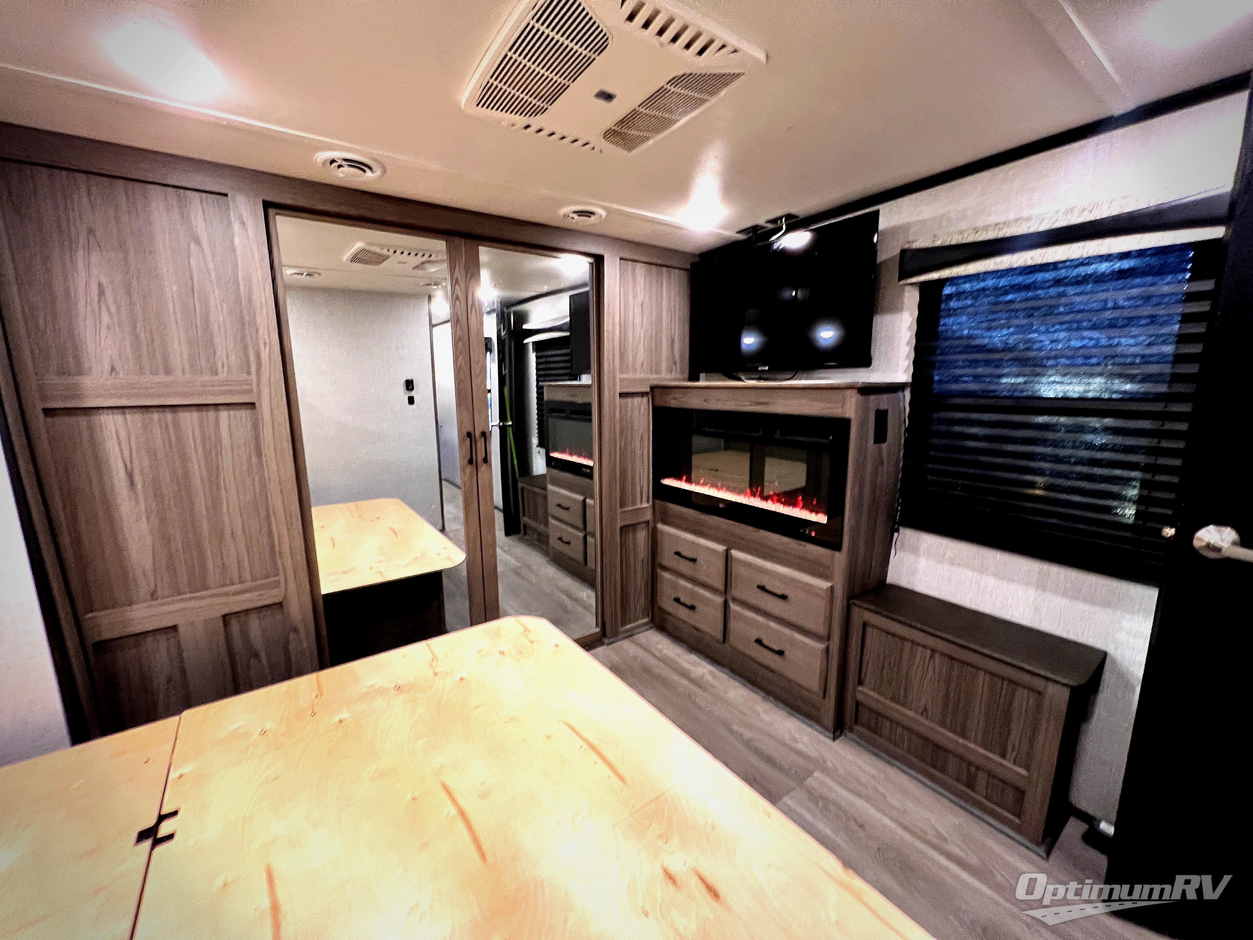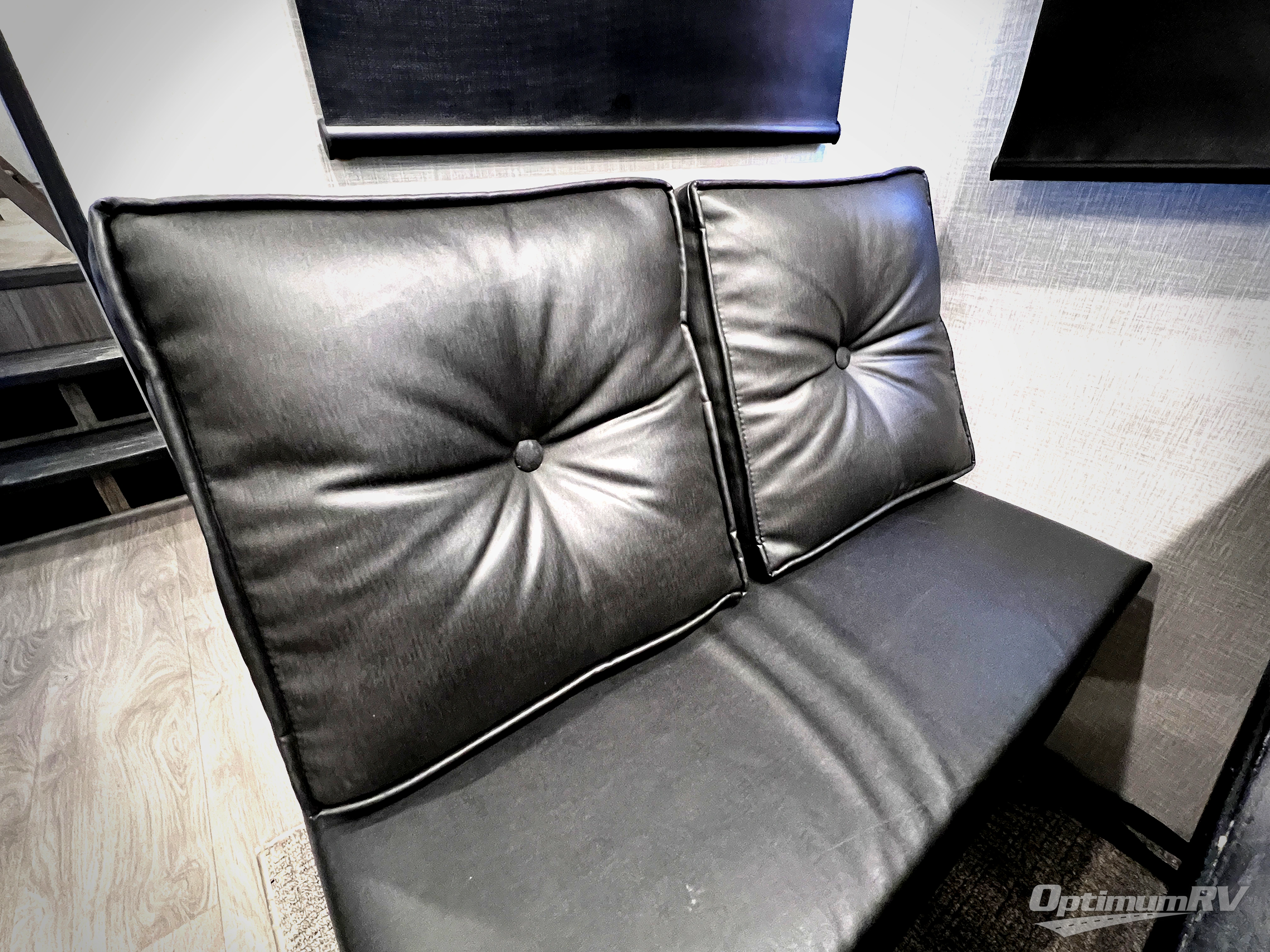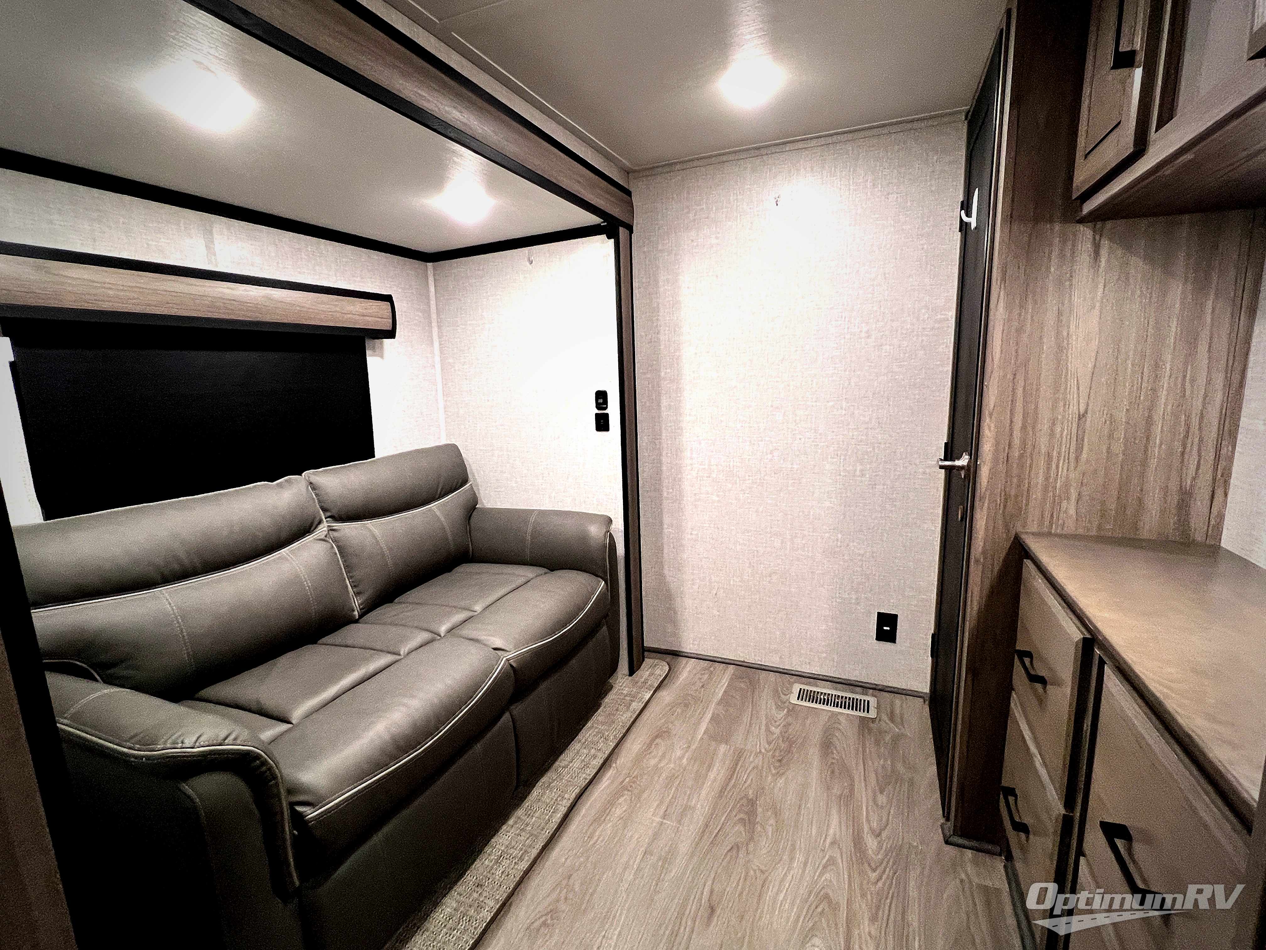 With two bedrooms, everyone will have their own comfortable place to sleep in this fifth wheel! The front private bedroom has a king bed slide, a dresser base with a fireplace and 39" TV, a bench seat, and a front closet that is prepped to add an optional washer and dryer. The second bedroom has a tri-fold sofa, a dresser, a wardrobe, and overhead cabinets, plus a loft above it all for storage or sleeping. Prepare your best home cooked meals with the Furrion kitchen collection and the kitchen island then enjoy them at the dinette. There is even an outside kitchen with a refrigerator, a sink, and a two burner cooktop to breathe in some fresh air while you cook and stay protected by the 18' power awning. Relax in true comfort each night on either the rear tri-fold sofa or the power theater seating across from the entertainment center with a fireplace and a 50" TV.