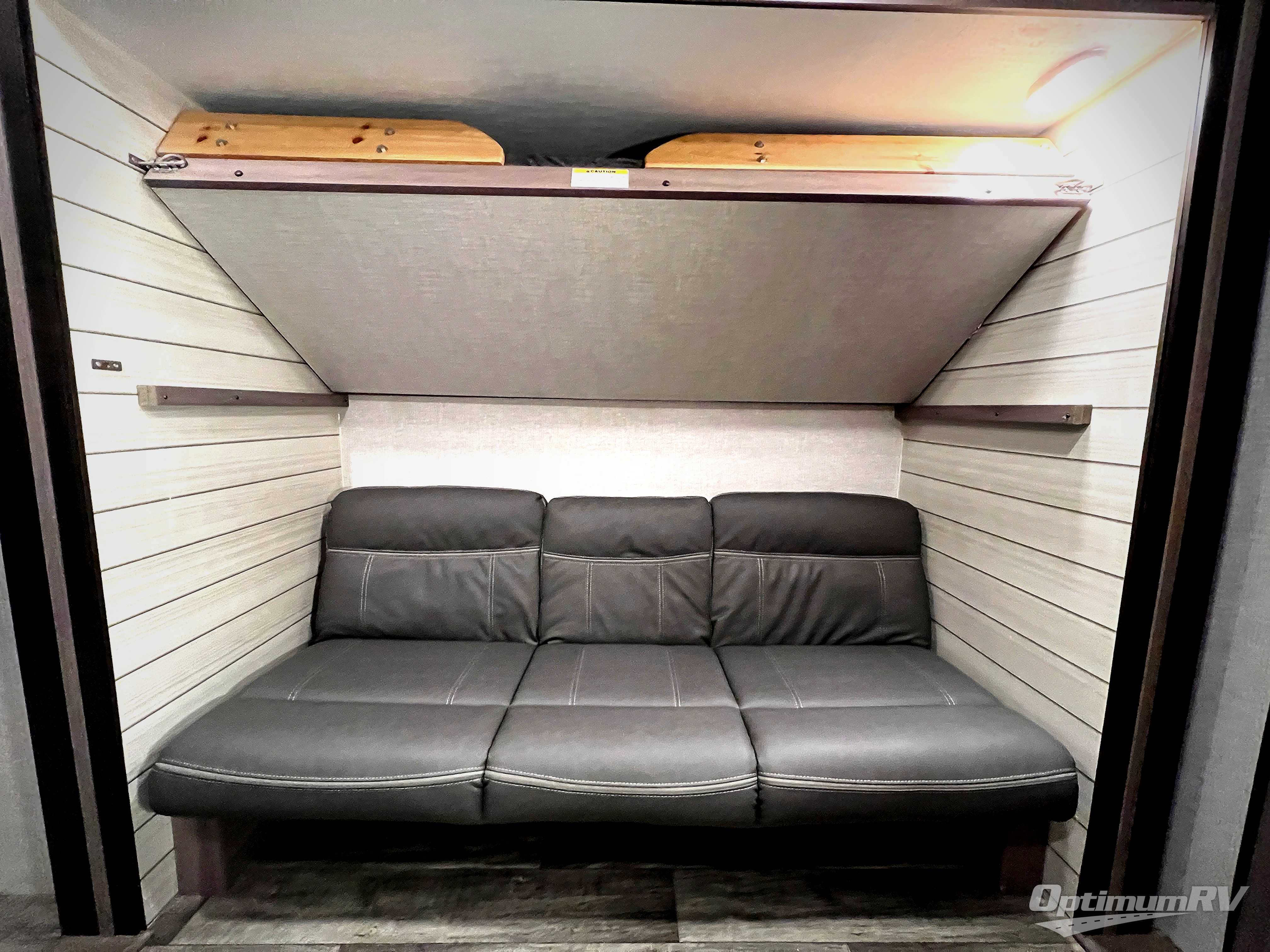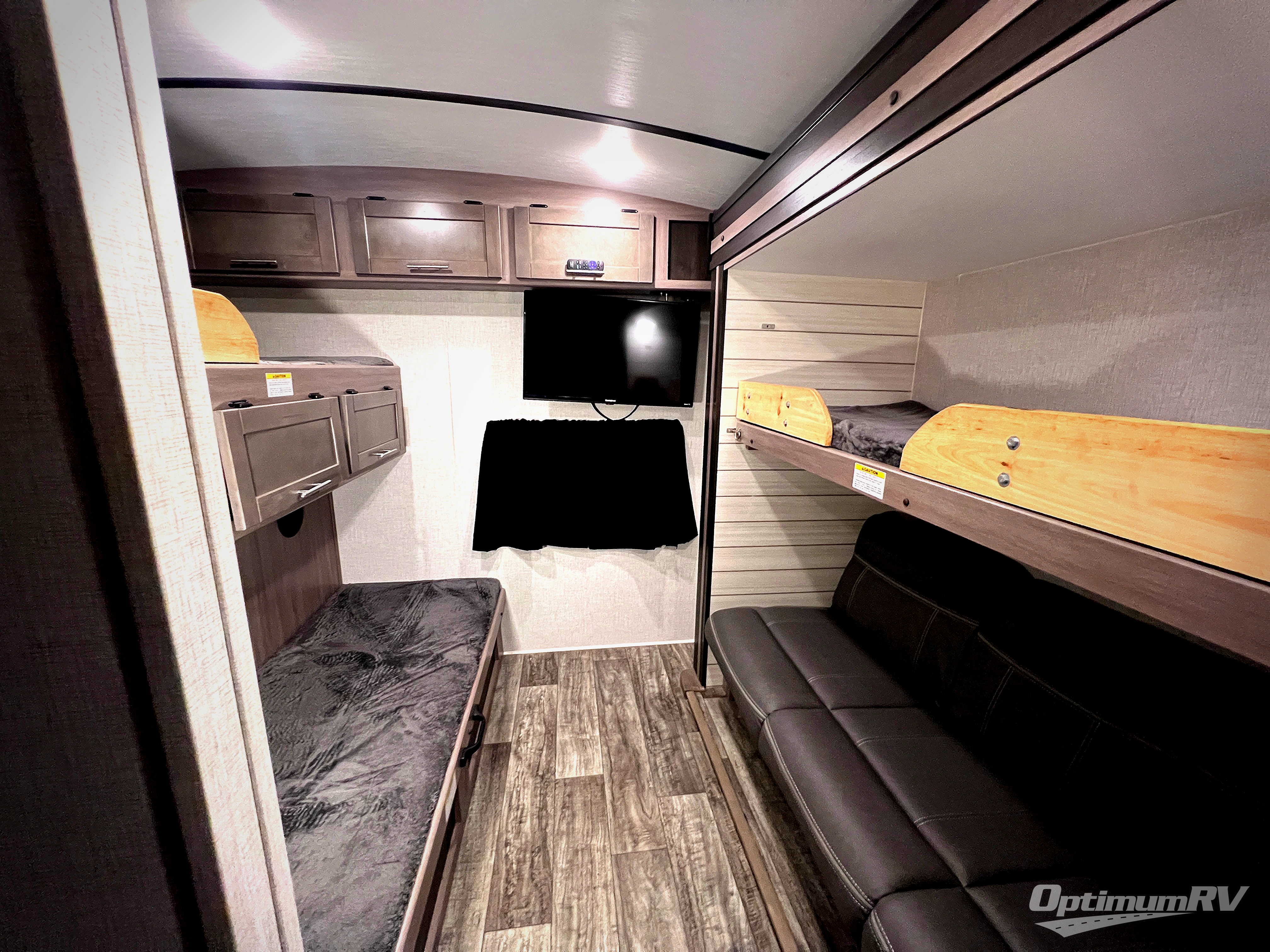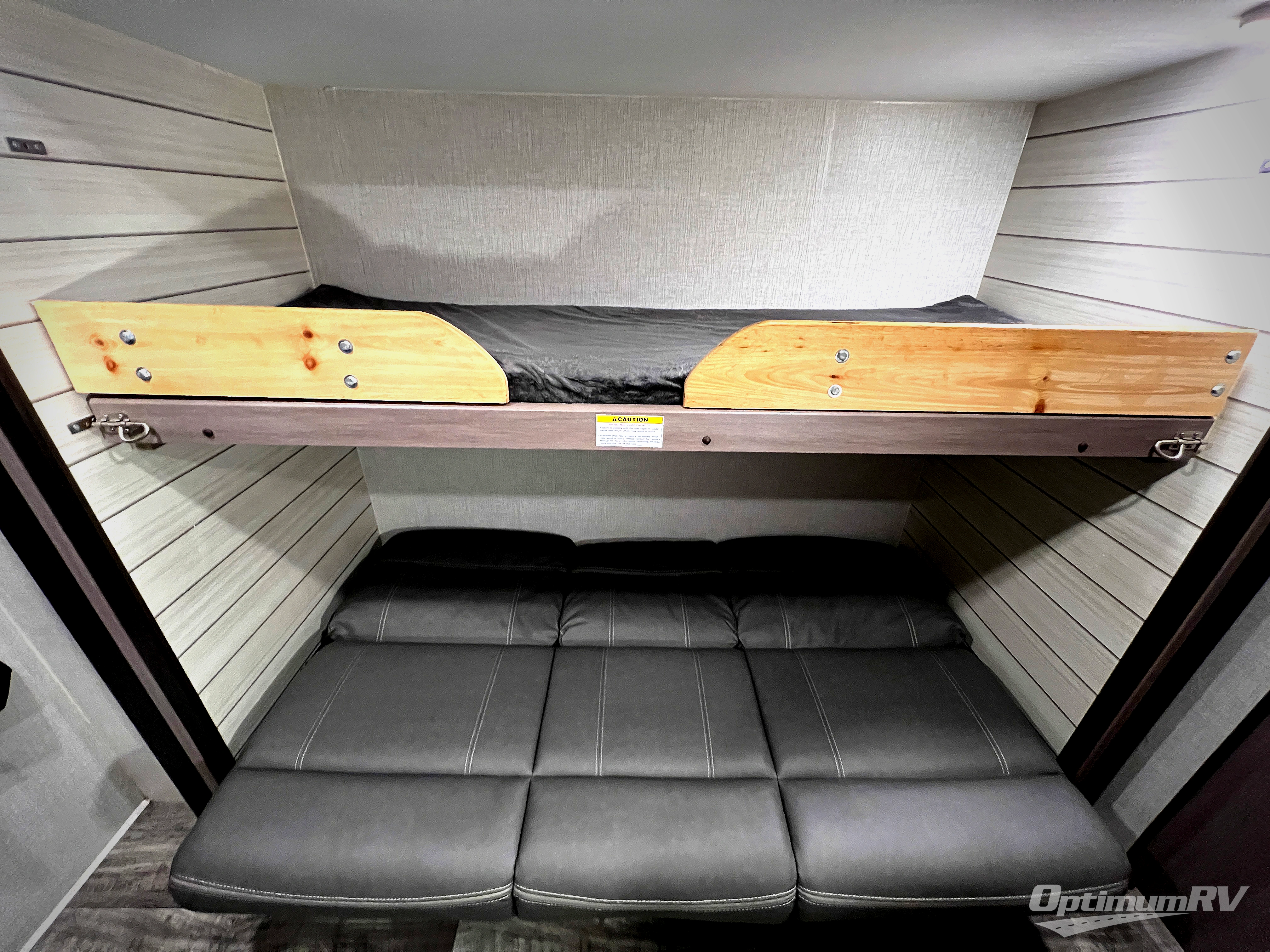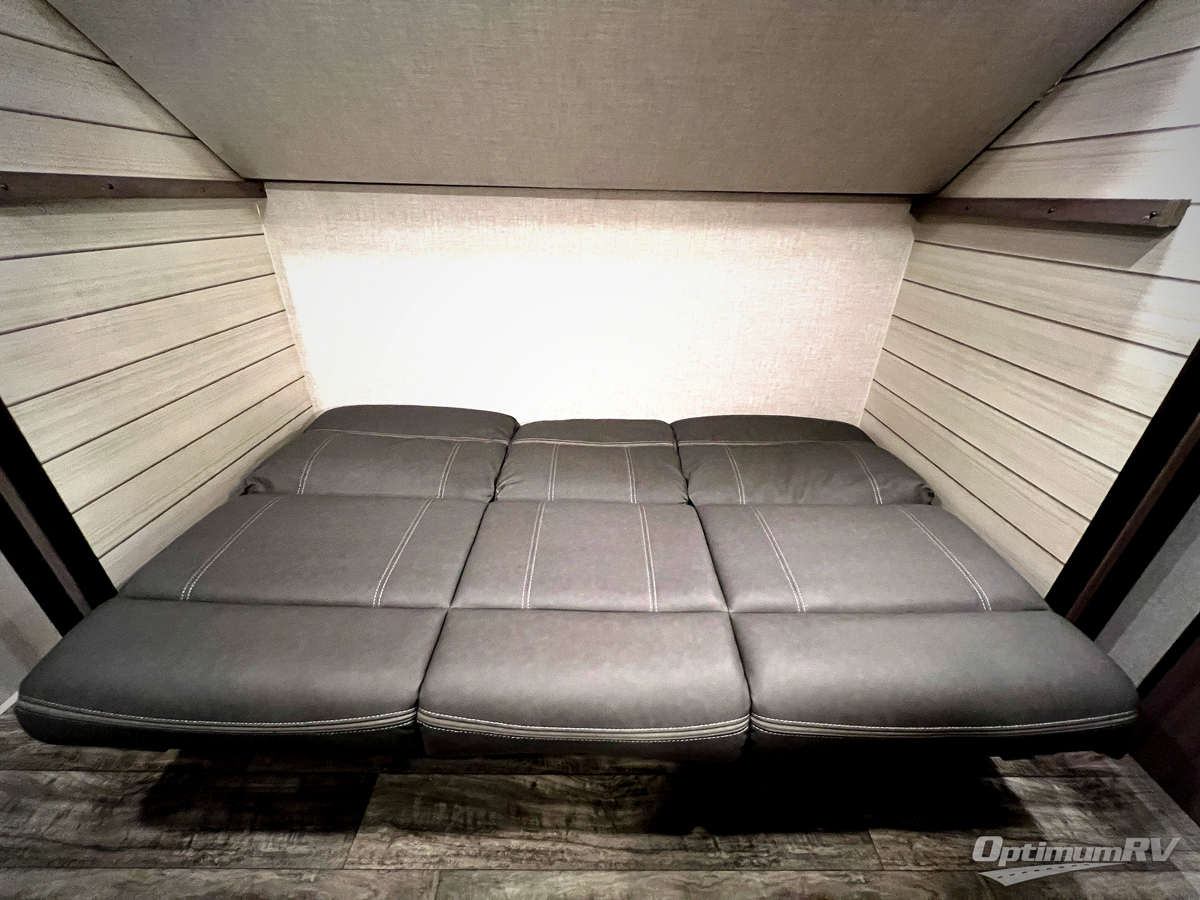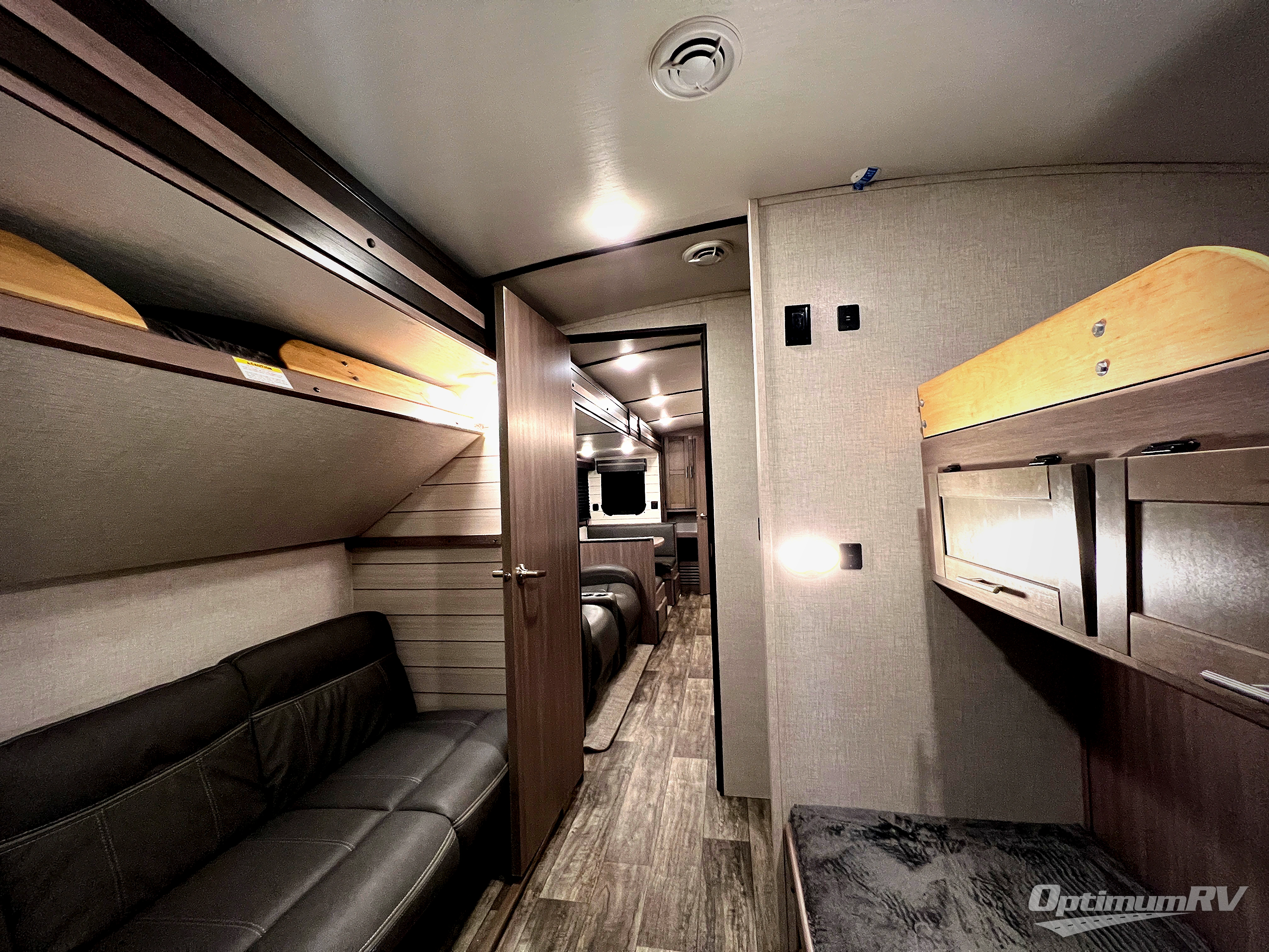 This travel trailer is packed with convenient features and luxury comforts for a camping trip you won't soon forget. Once you arrive at the campground, put out the electric awning and make a quick lunch on the exterior camp kitchen. The kitchen island inside will be the perfect place to cut up all the fixings for the burgers and you can grab the chips from the pantry. The kids will love the private bunkhouse that includes two bunks, a jackknife sofa with a kick, plus a dual entry half bath for convenience. The full walk-through bath will create a front master bedroom you are sure to love. Here, the king bed will provide a great night's rest and there are dual wardrobes for all your clothes. Plus there is a convenient shoe storage and pet station for your trusted loyal friends!