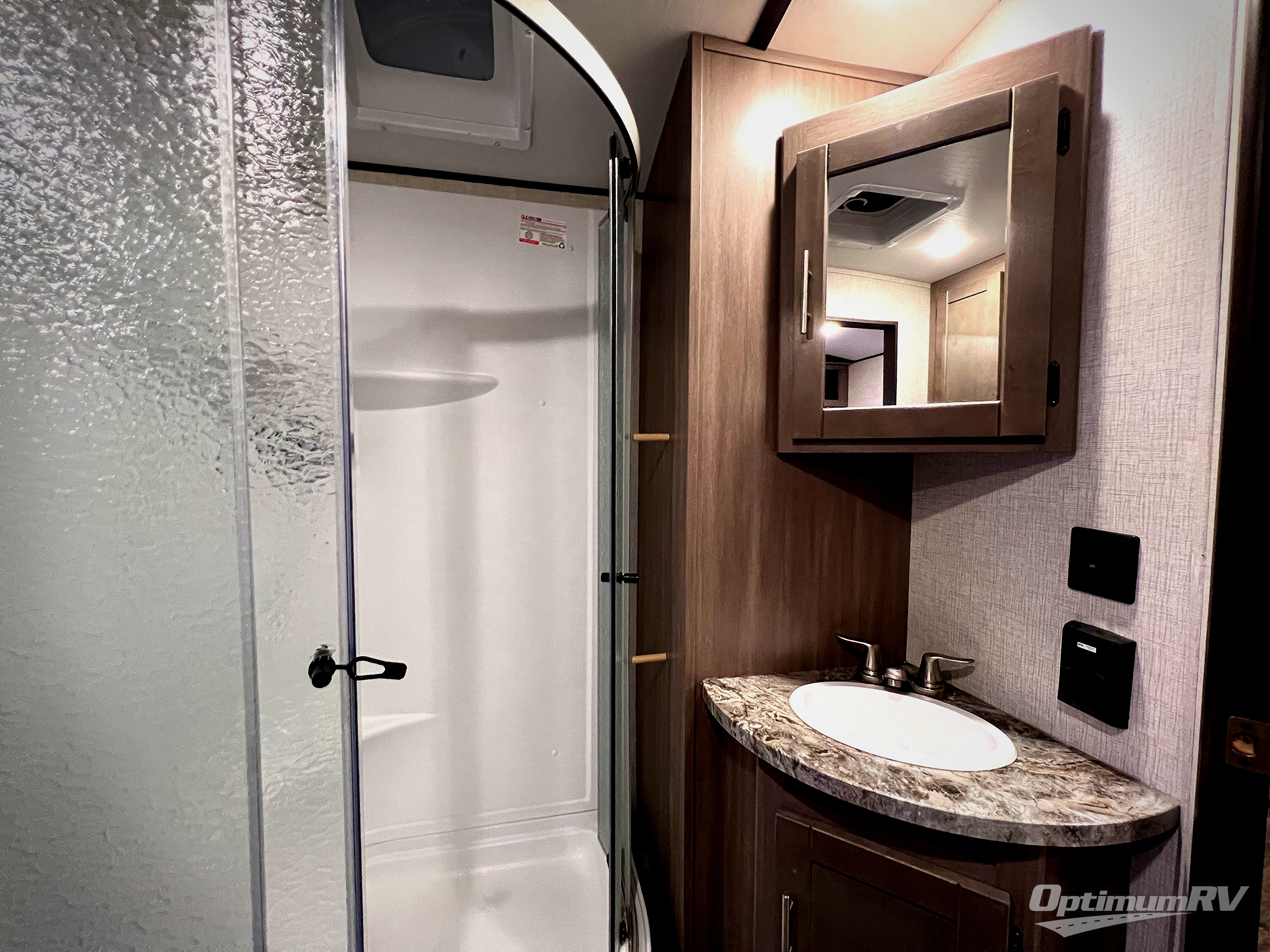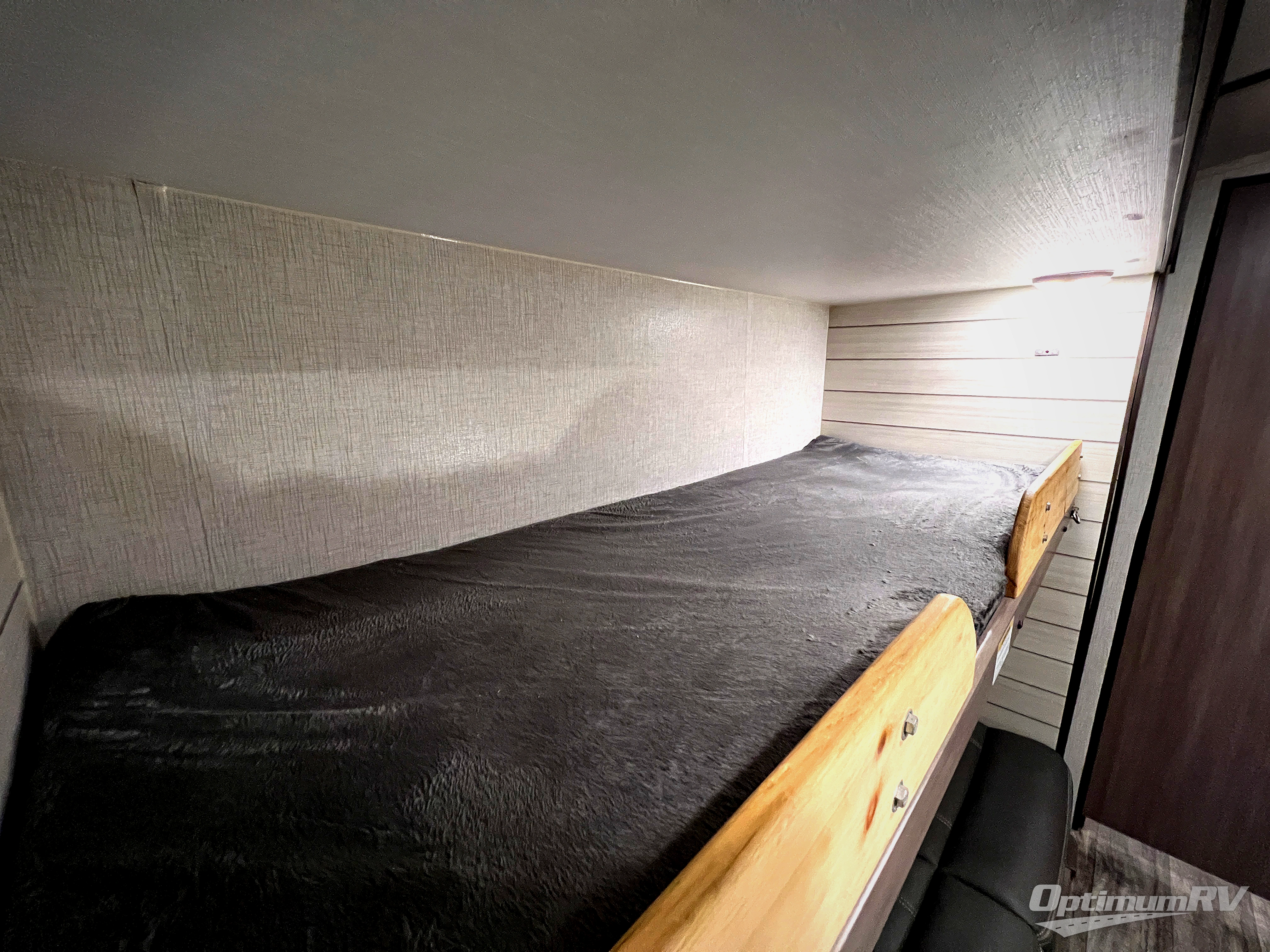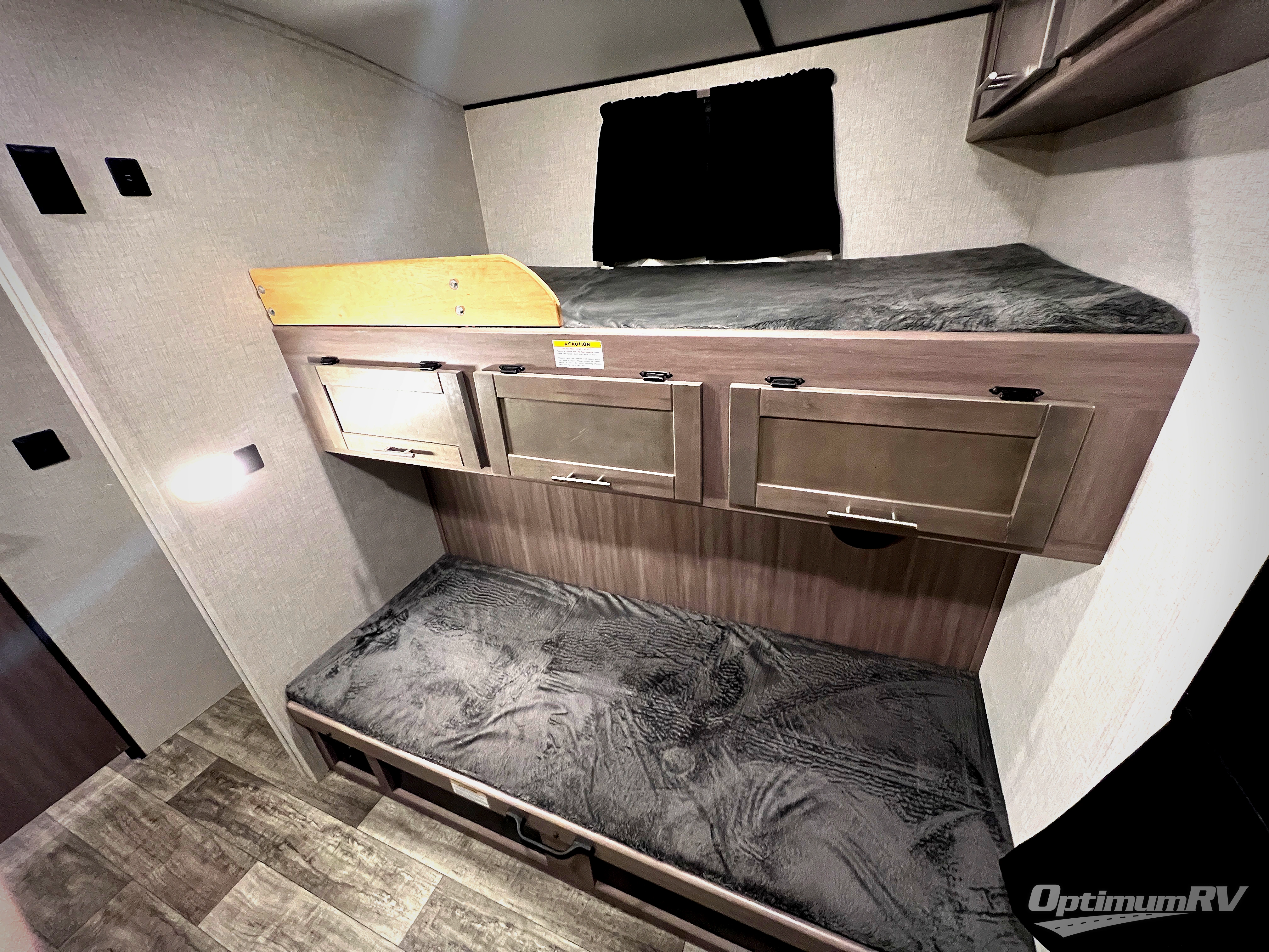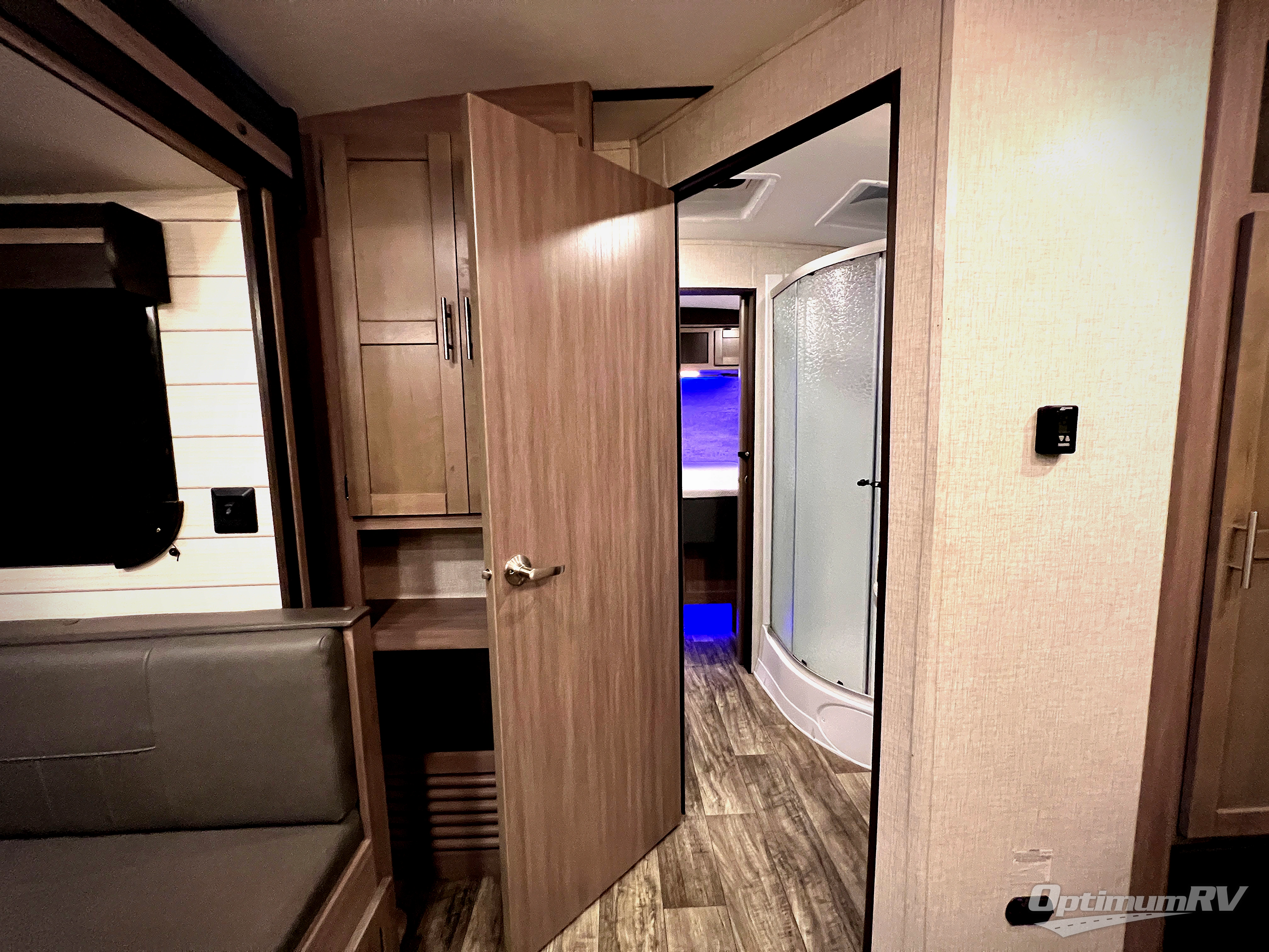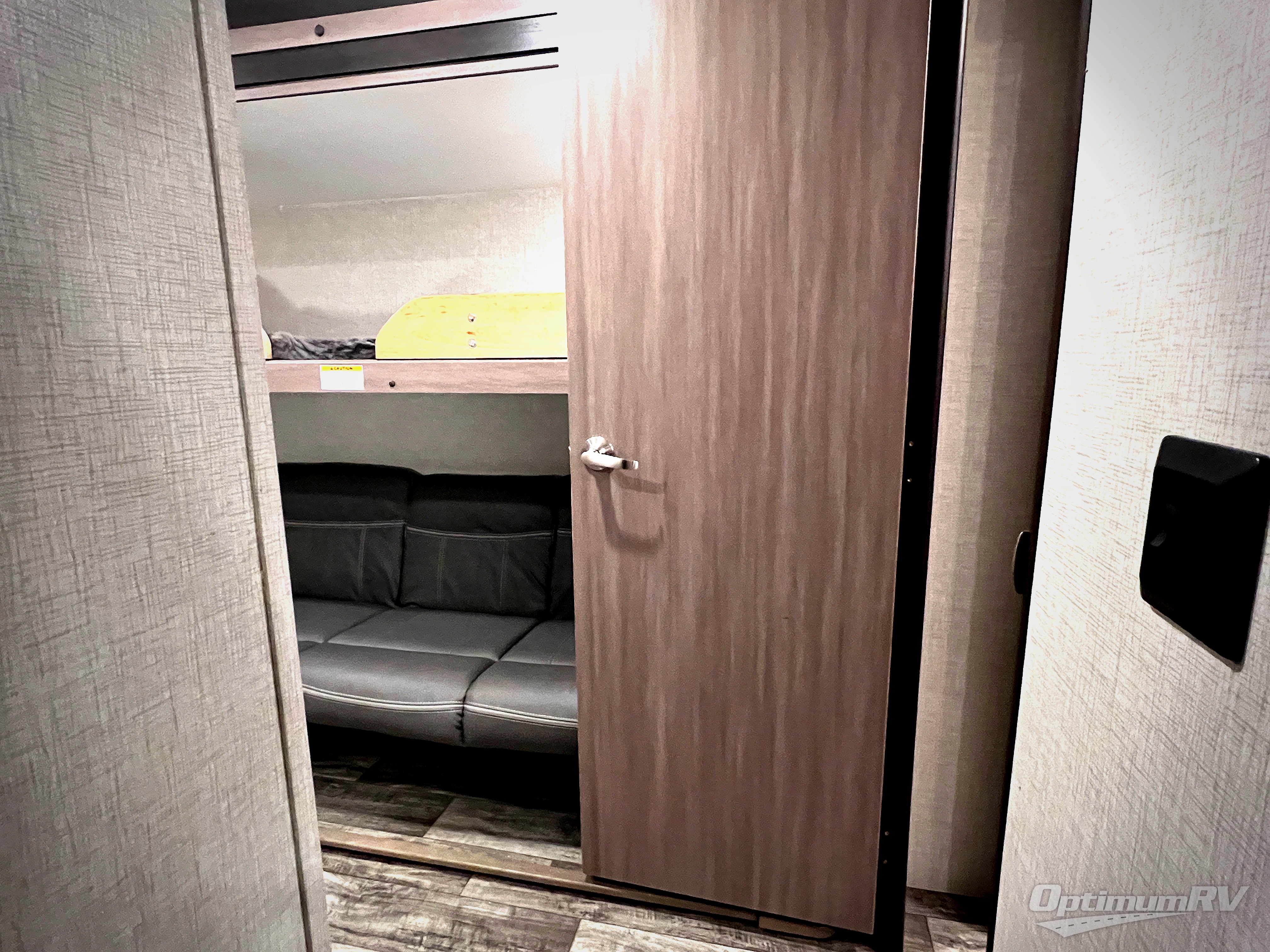 This travel trailer is packed with convenient features and luxury comforts for a camping trip you won't soon forget. Once you arrive at the campground, put out the electric awning and make a quick lunch on the exterior camp kitchen. The kitchen island inside will be the perfect place to cut up all the fixings for the burgers and you can grab the chips from the pantry. The kids will love the private bunkhouse that includes two bunks, a jackknife sofa with a kick, plus a dual entry half bath for convenience. The full walk-through bath will create a front master bedroom you are sure to love. Here, the king bed will provide a great night's rest and there are dual wardrobes for all your clothes. Plus there is a convenient shoe storage and pet station for your trusted loyal friends!