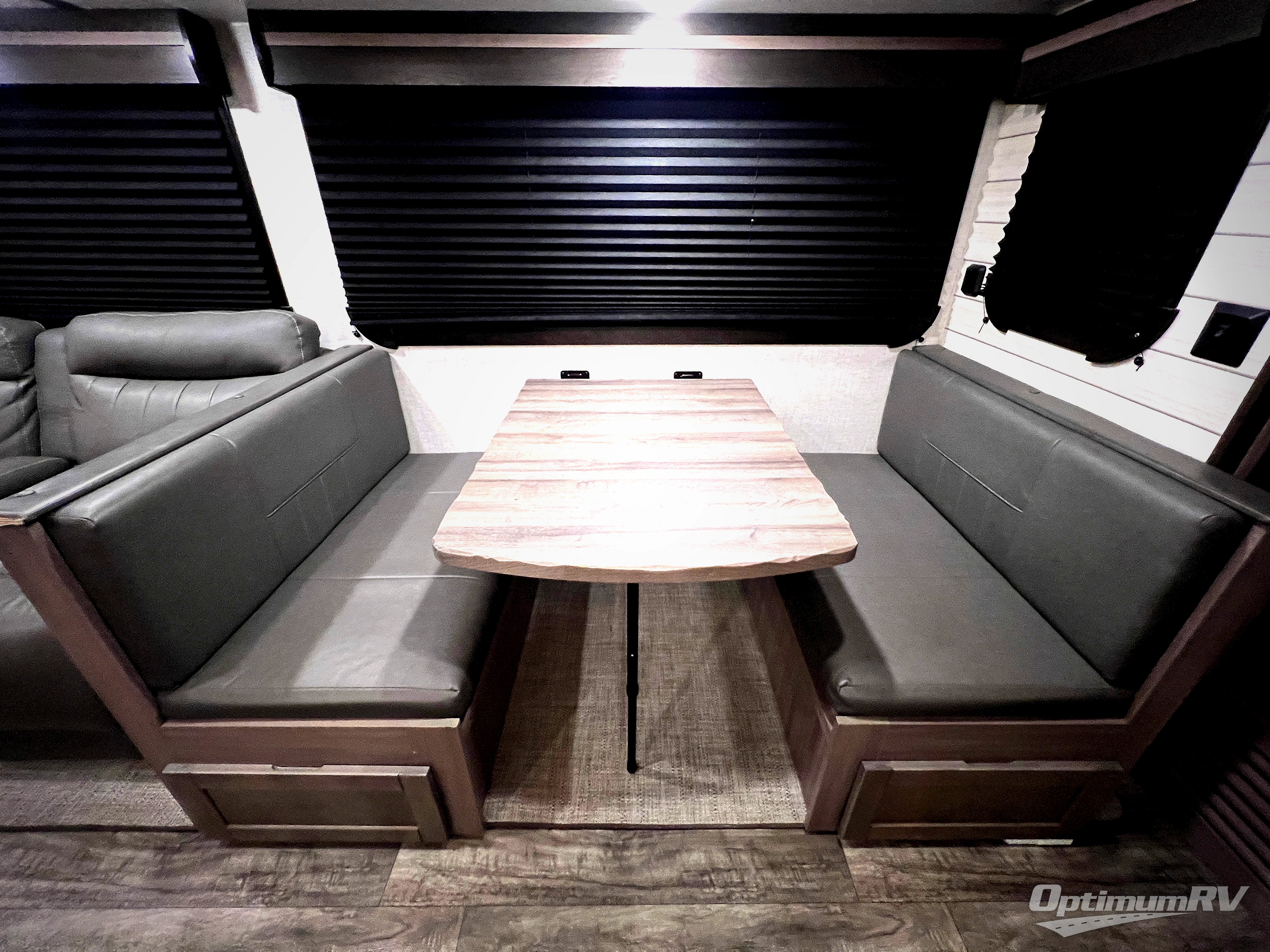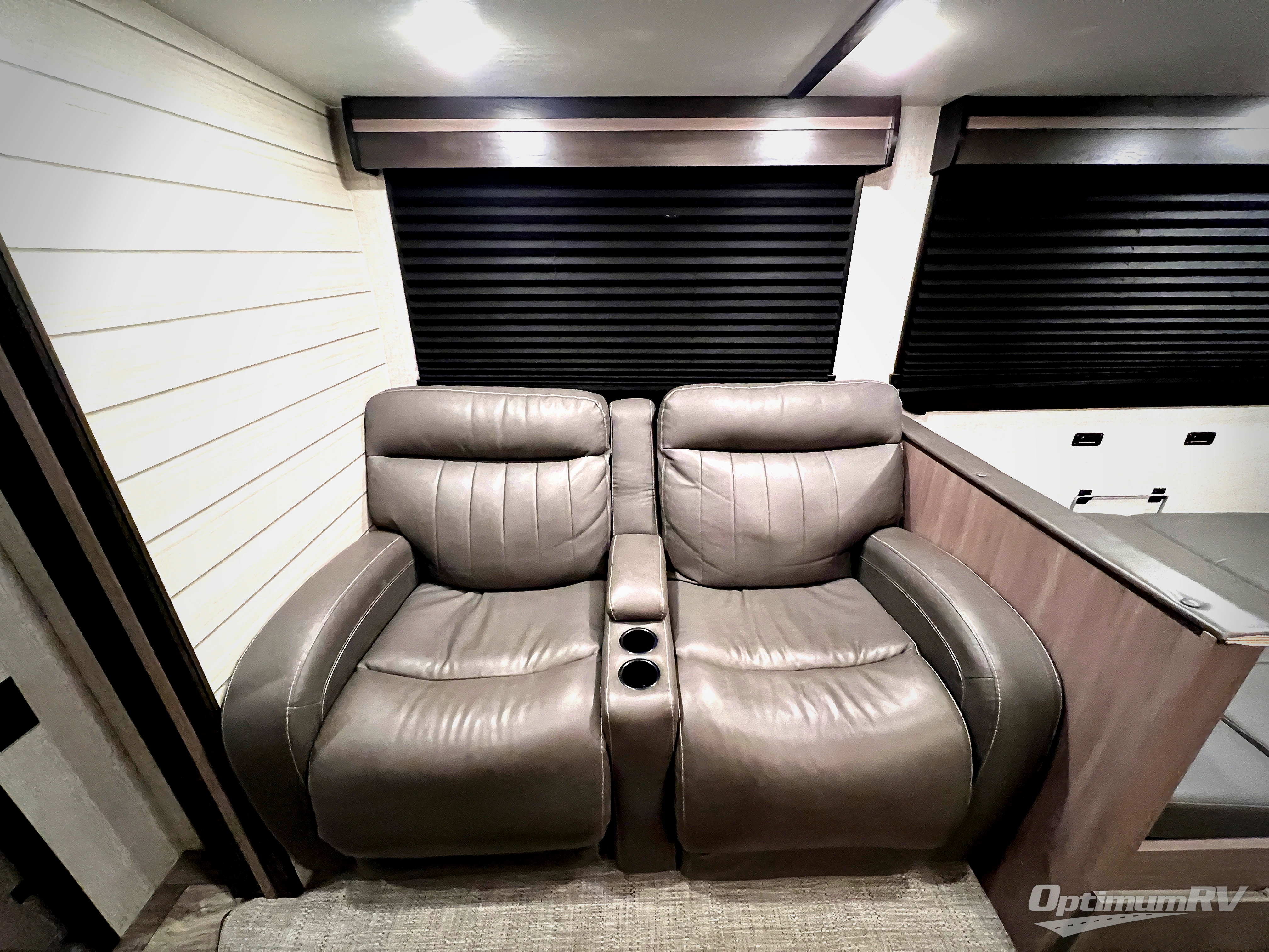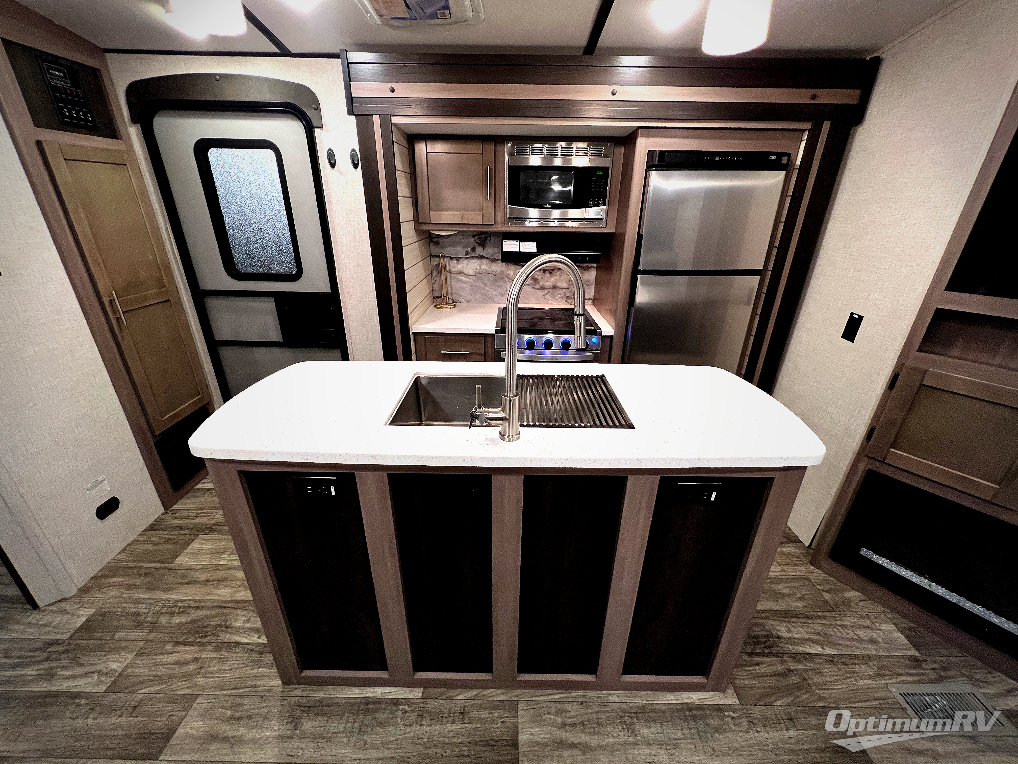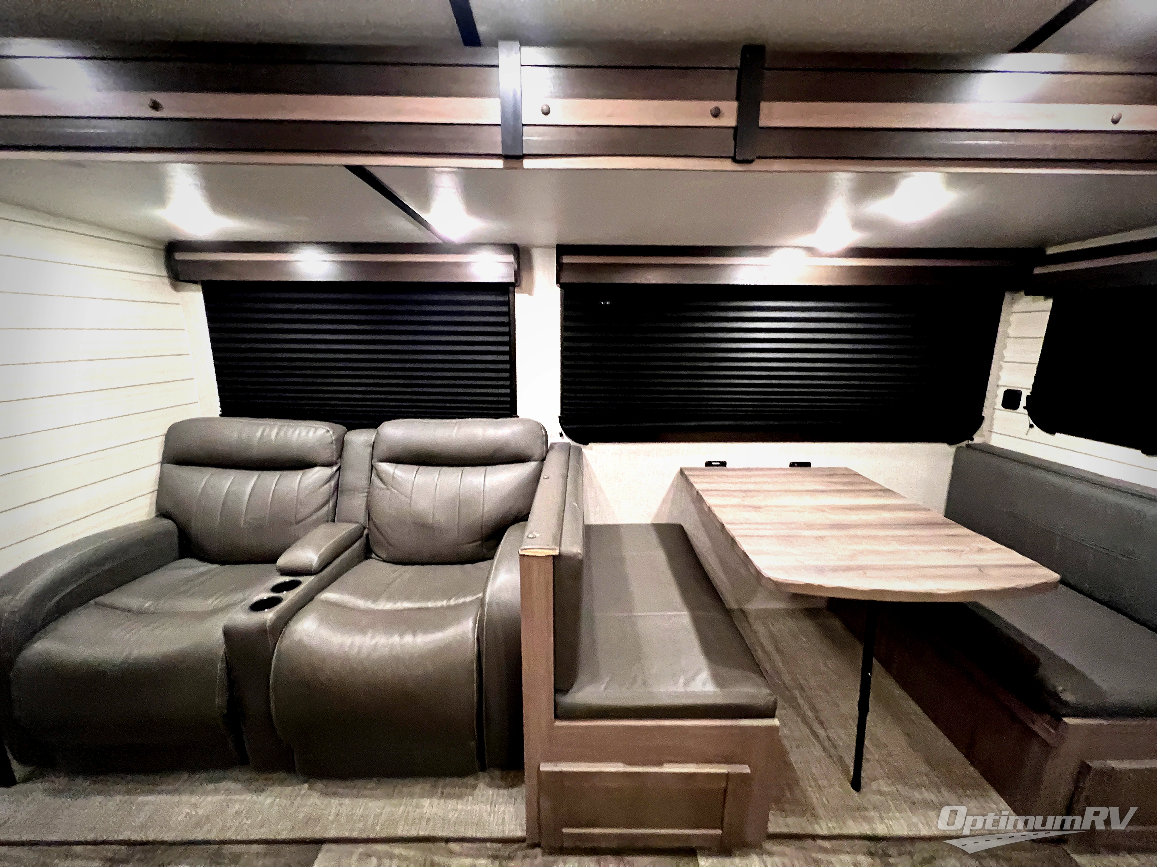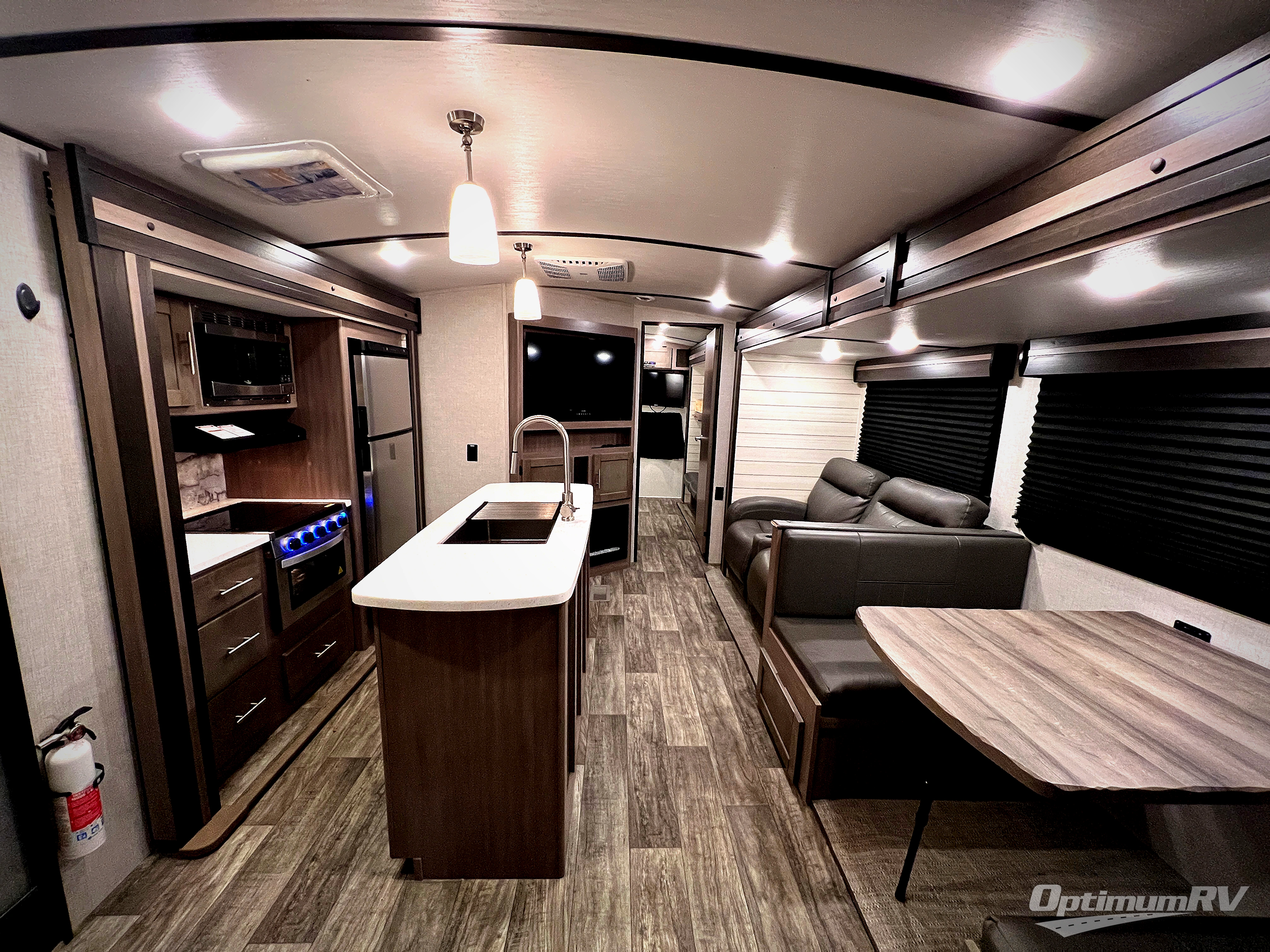 This travel trailer is packed with convenient features and luxury comforts for a camping trip you won't soon forget. Once you arrive at the campground, put out the electric awning and make a quick lunch on the exterior camp kitchen. The kitchen island inside will be the perfect place to cut up all the fixings for the burgers and you can grab the chips from the pantry. The kids will love the private bunkhouse that includes two bunks, a jackknife sofa with a kick, plus a dual entry half bath for convenience. The full walk-through bath will create a front master bedroom you are sure to love. Here, the king bed will provide a great night's rest and there are dual wardrobes for all your clothes. Plus there is a convenient shoe storage and pet station for your trusted loyal friends!