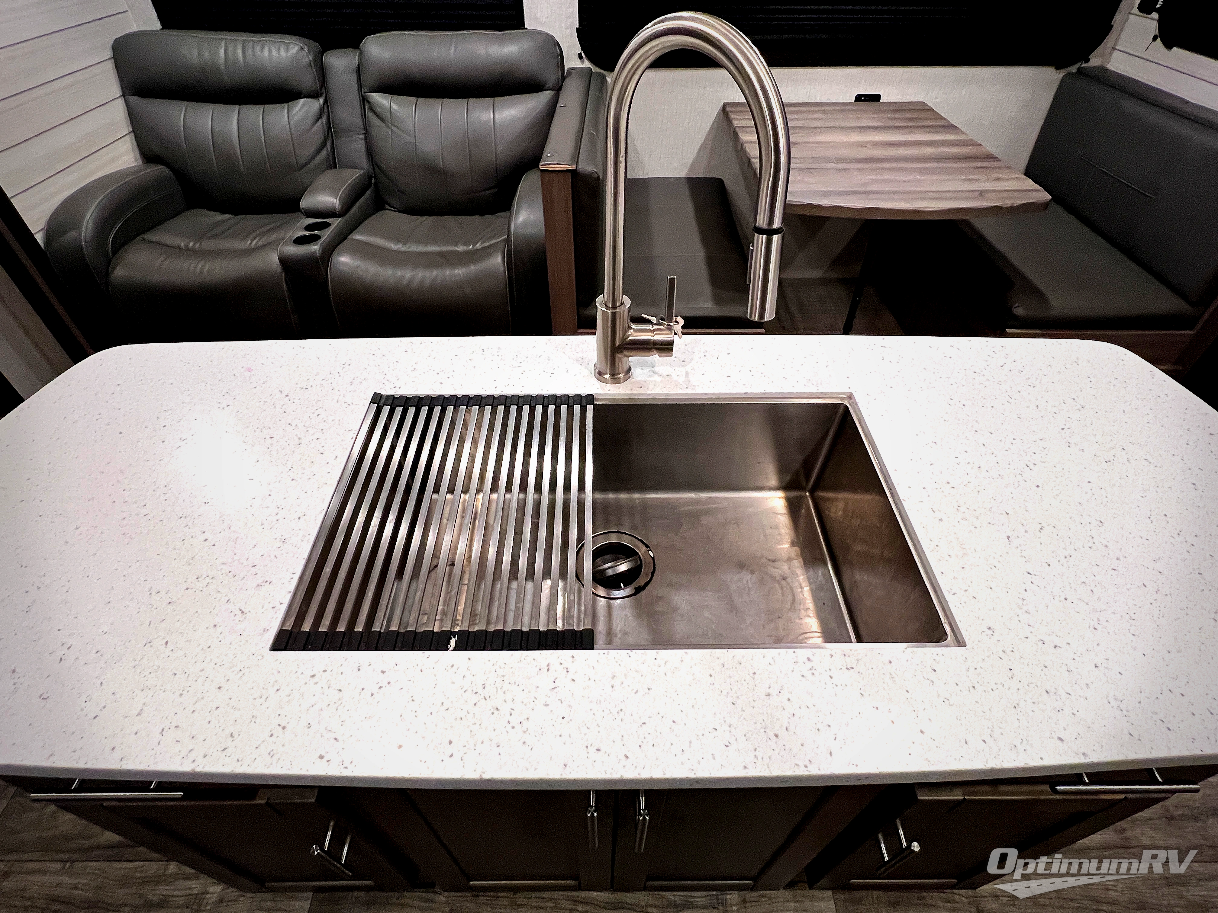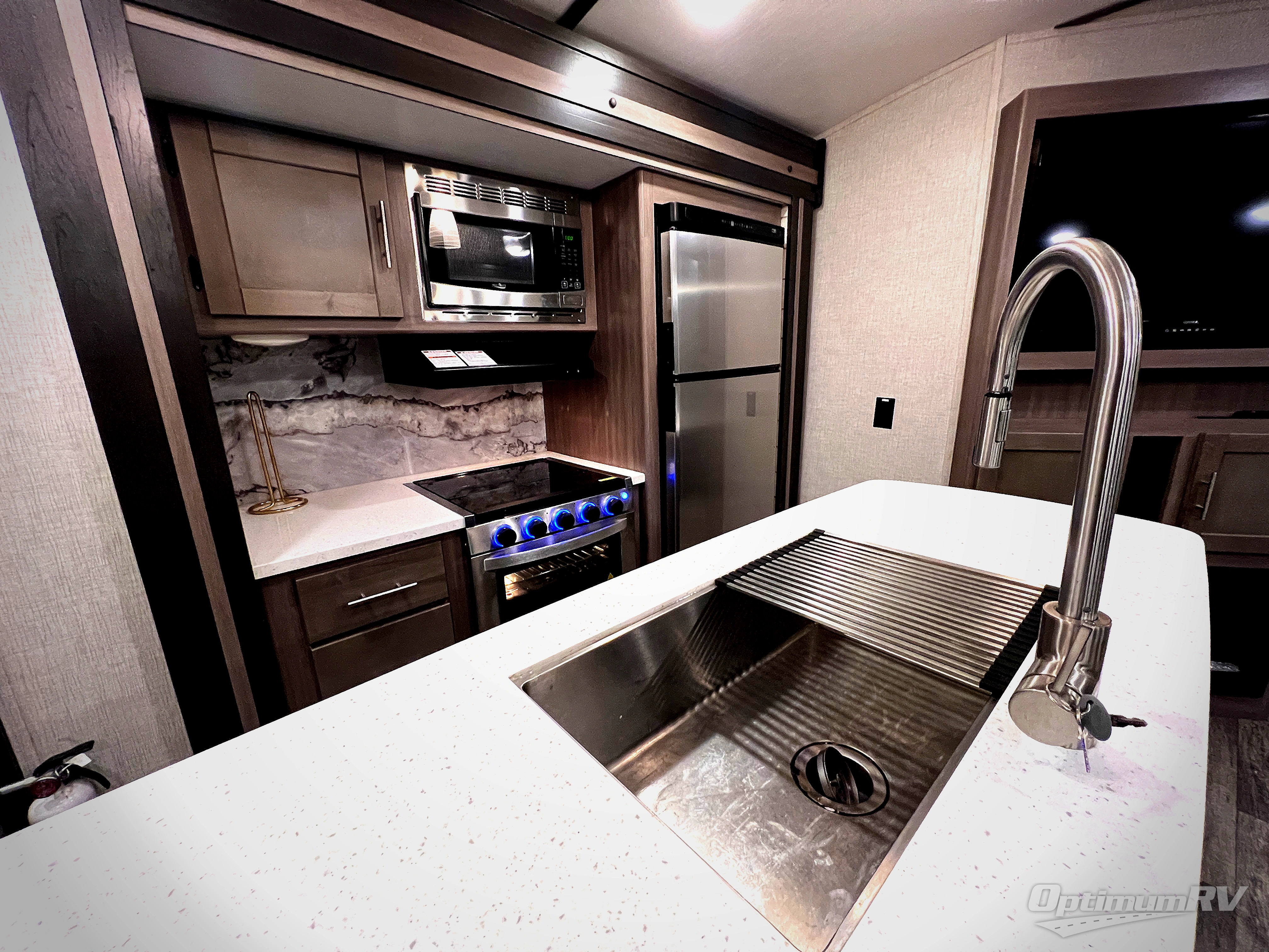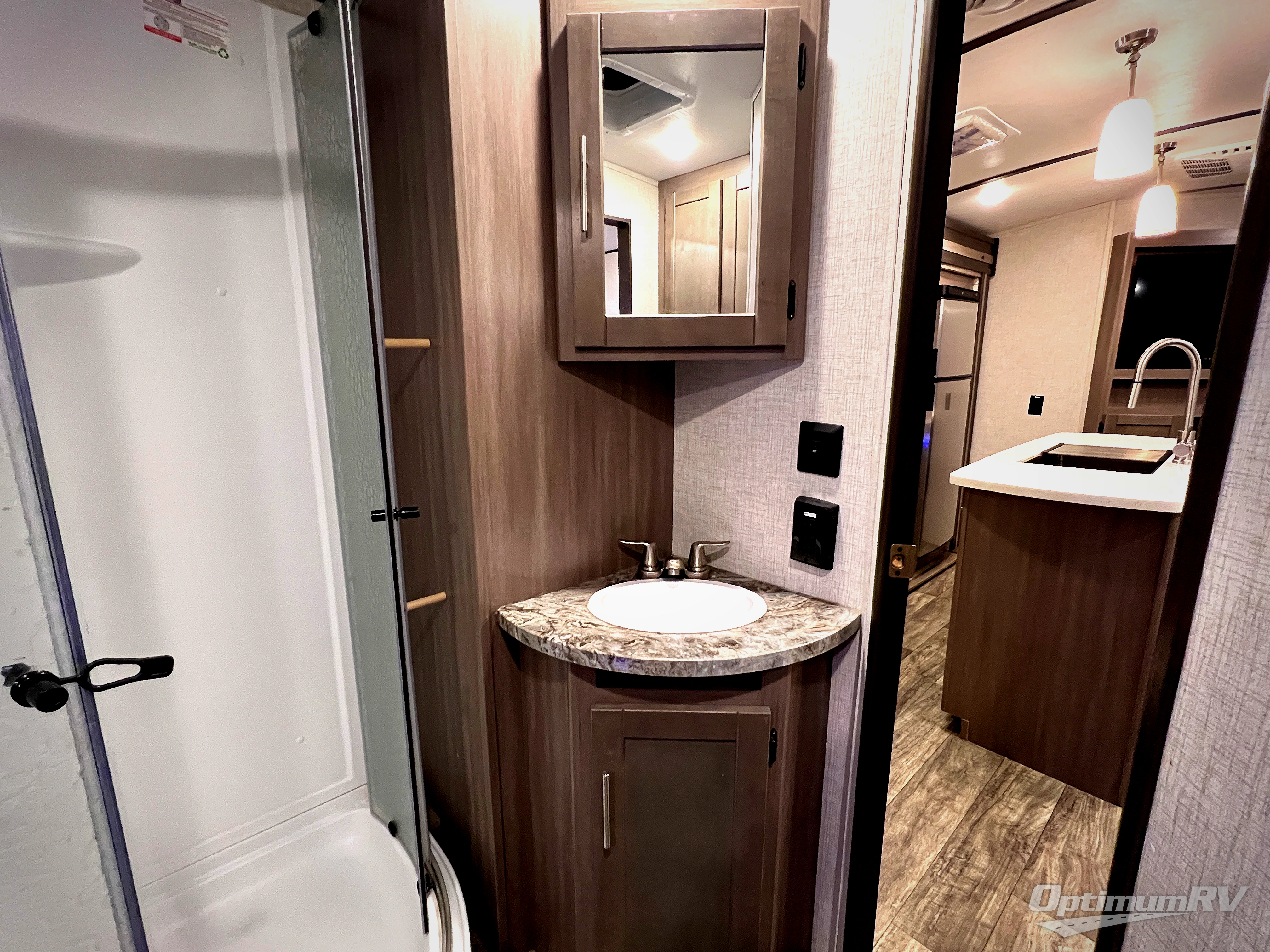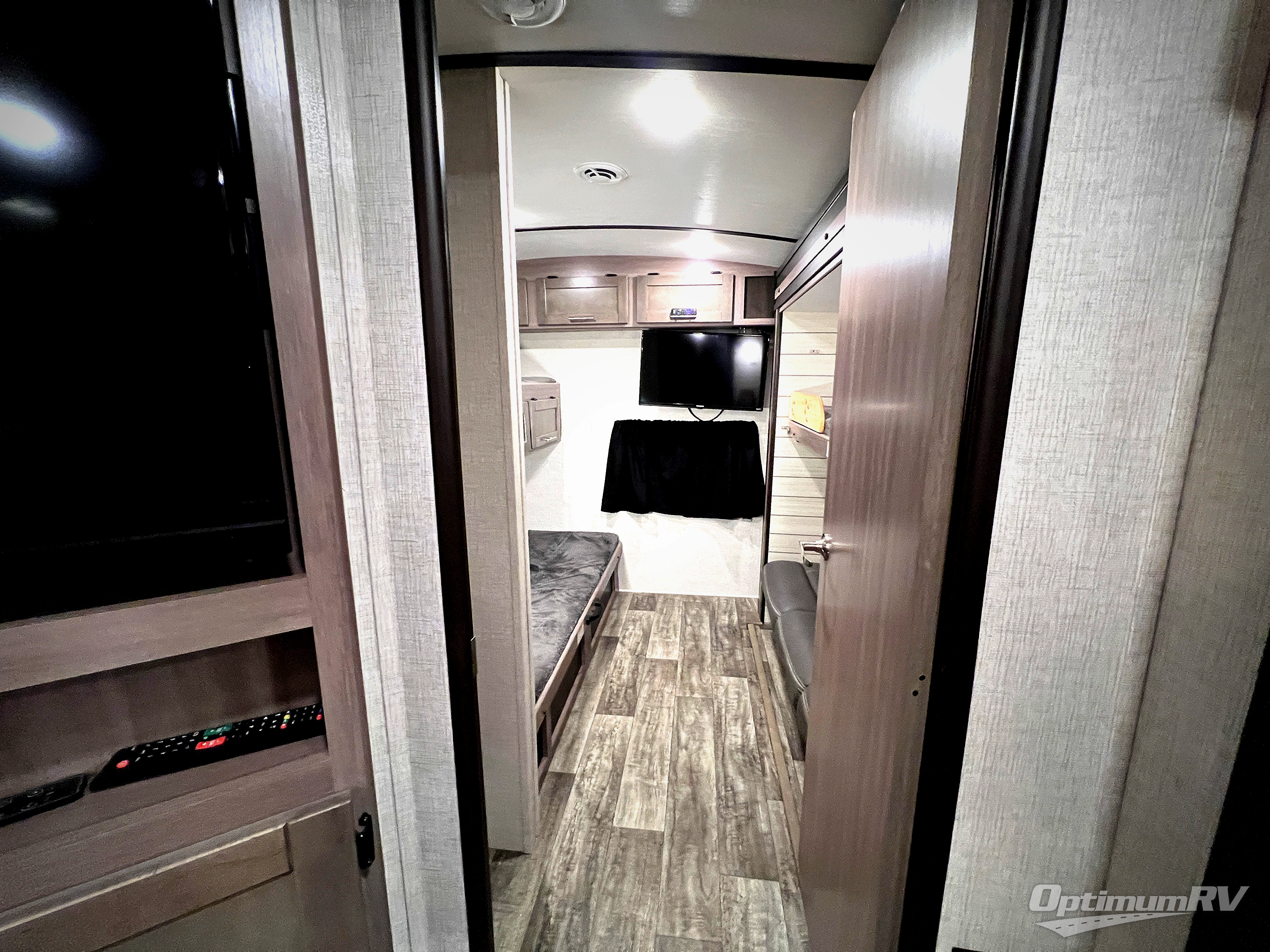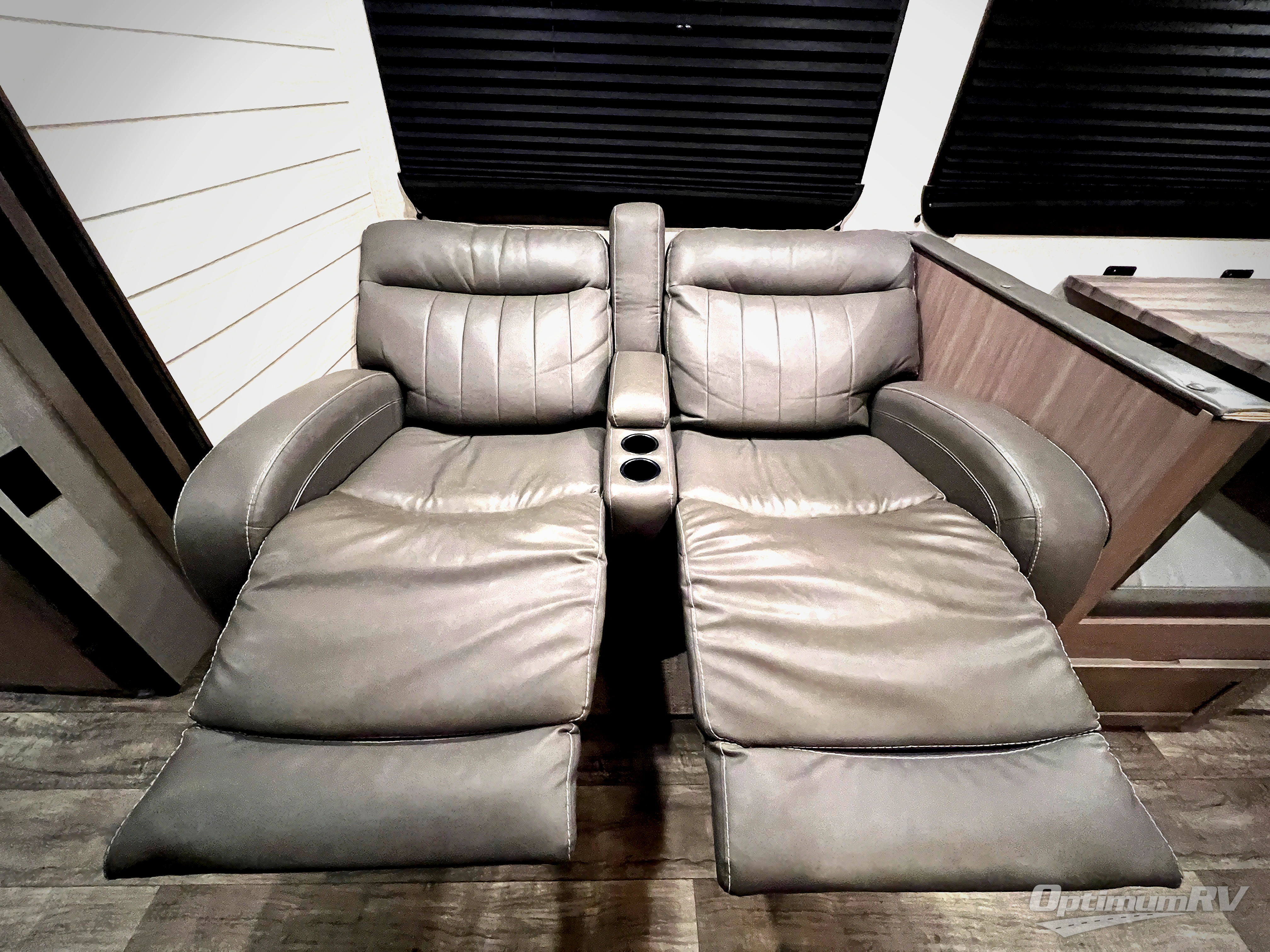 This travel trailer is packed with convenient features and luxury comforts for a camping trip you won't soon forget. Once you arrive at the campground, put out the electric awning and make a quick lunch on the exterior camp kitchen. The kitchen island inside will be the perfect place to cut up all the fixings for the burgers and you can grab the chips from the pantry. The kids will love the private bunkhouse that includes two bunks, a jackknife sofa with a kick, plus a dual entry half bath for convenience. The full walk-through bath will create a front master bedroom you are sure to love. Here, the king bed will provide a great night's rest and there are dual wardrobes for all your clothes. Plus there is a convenient shoe storage and pet station for your trusted loyal friends!