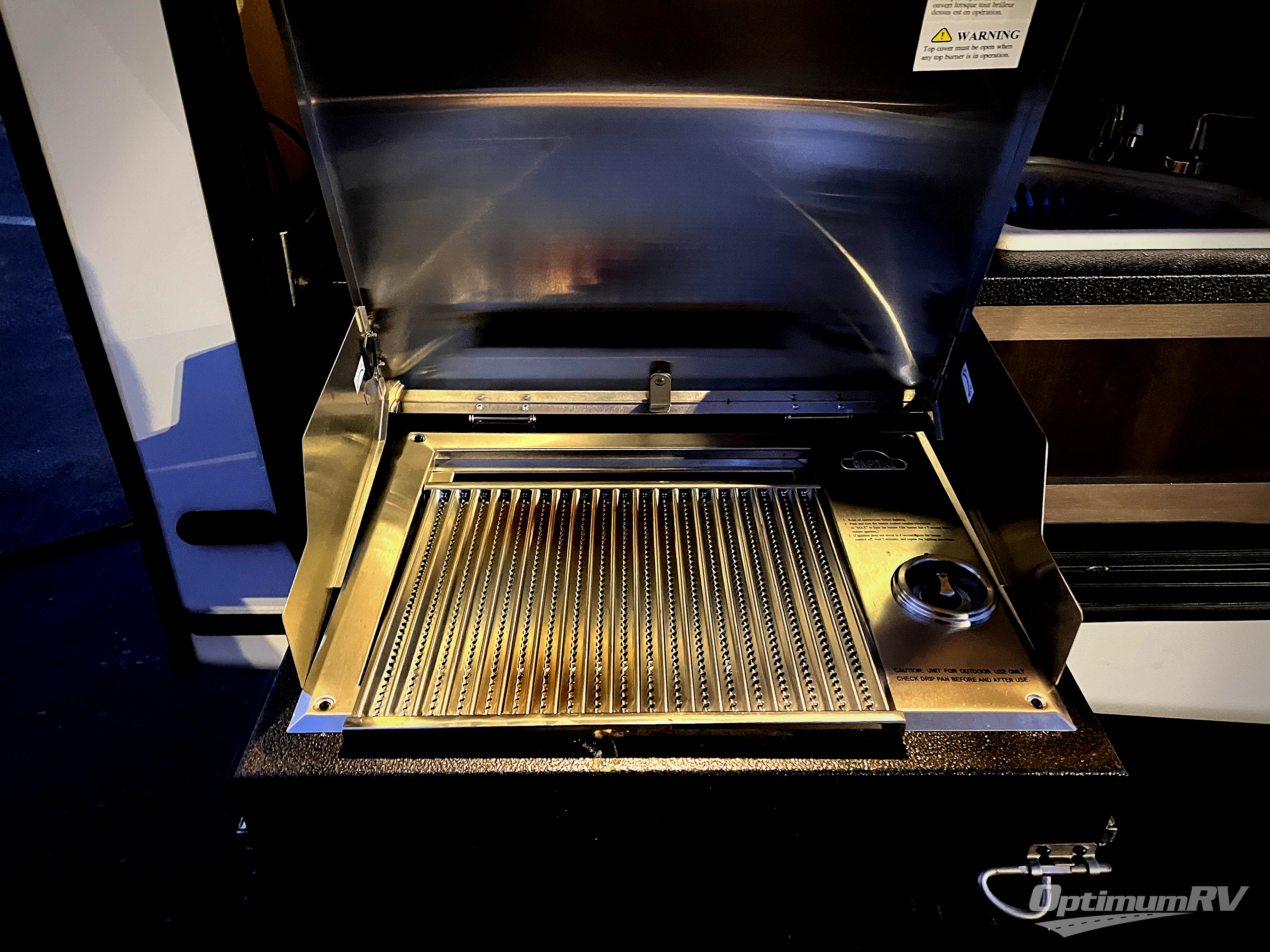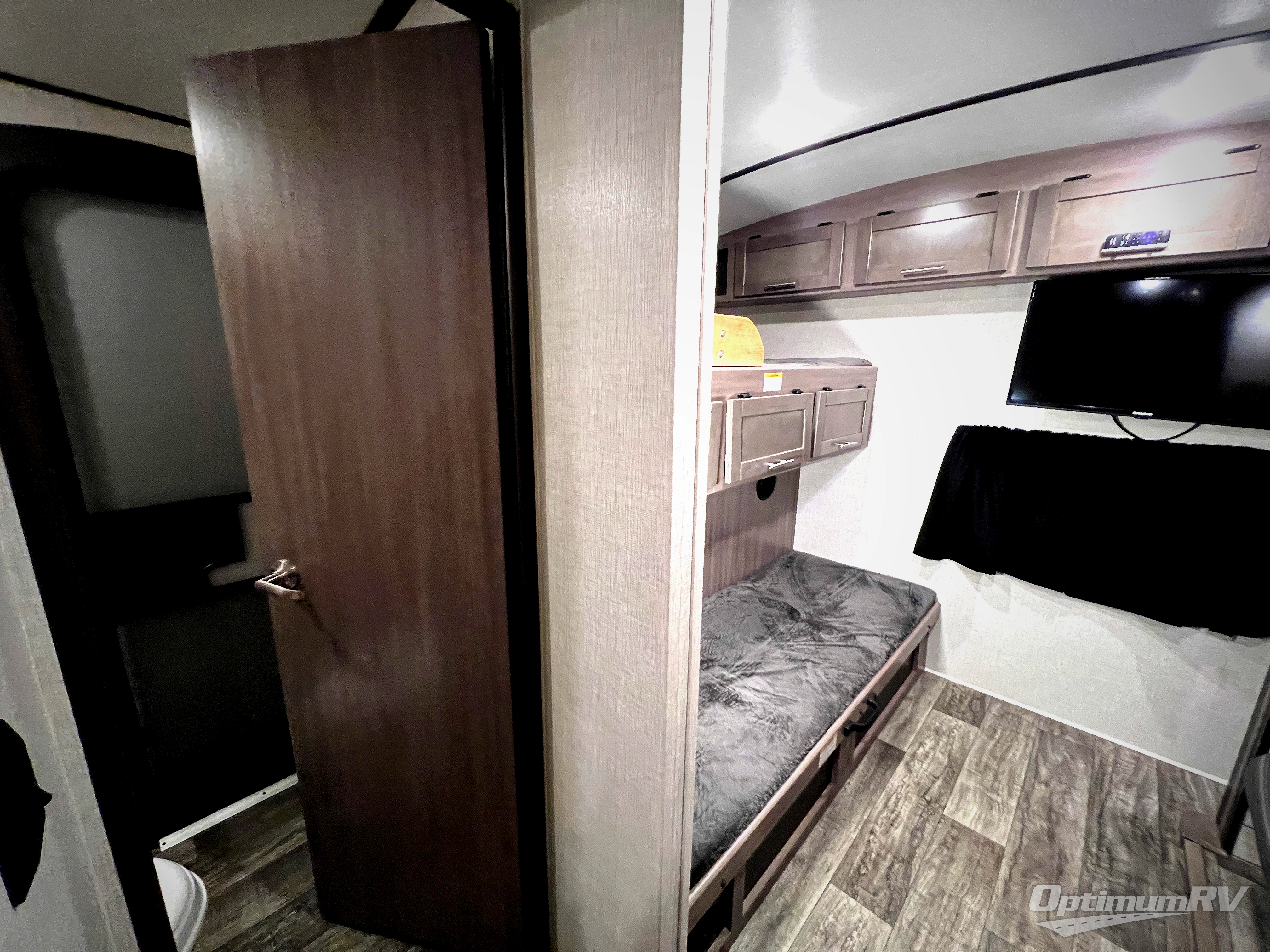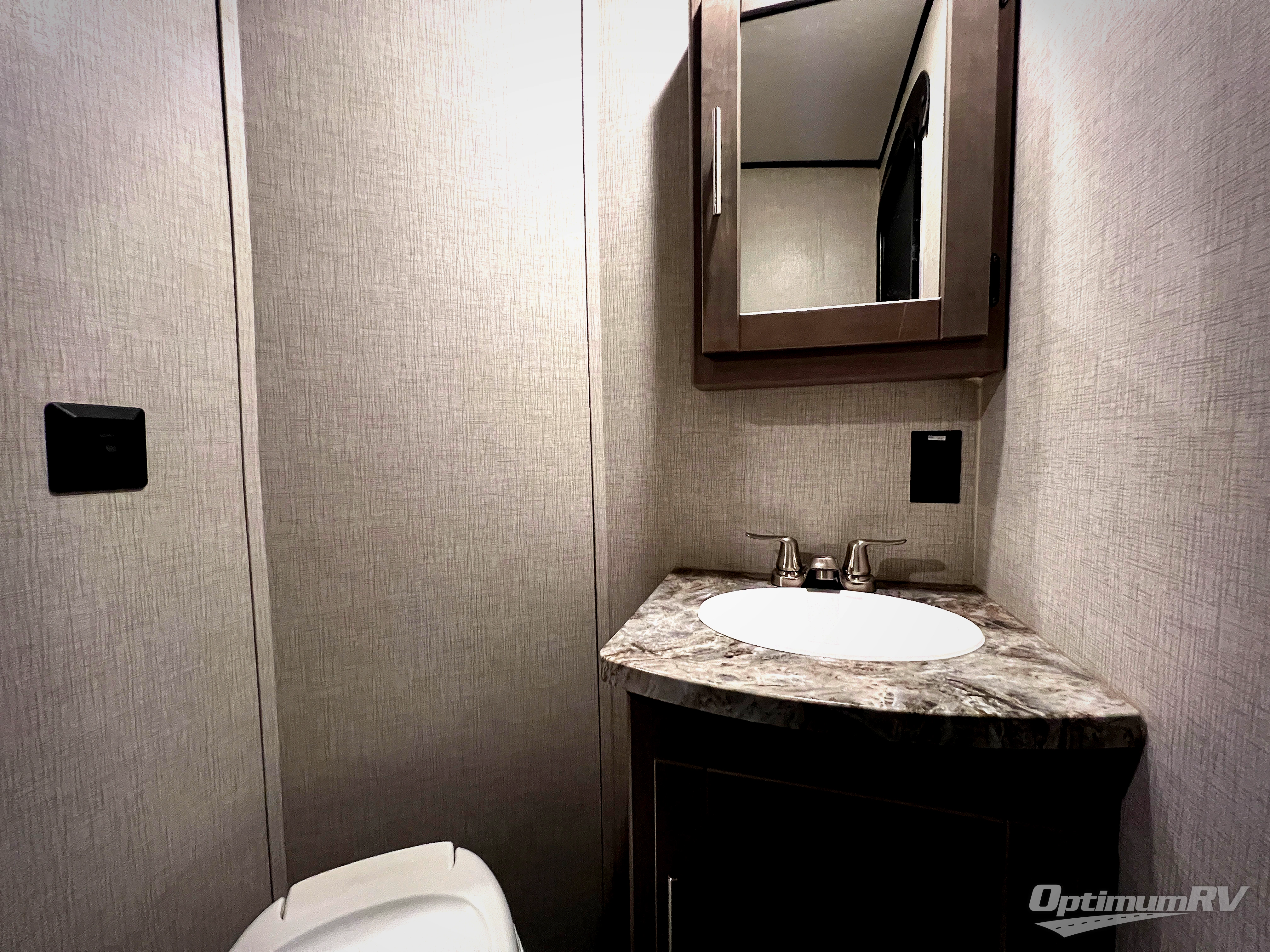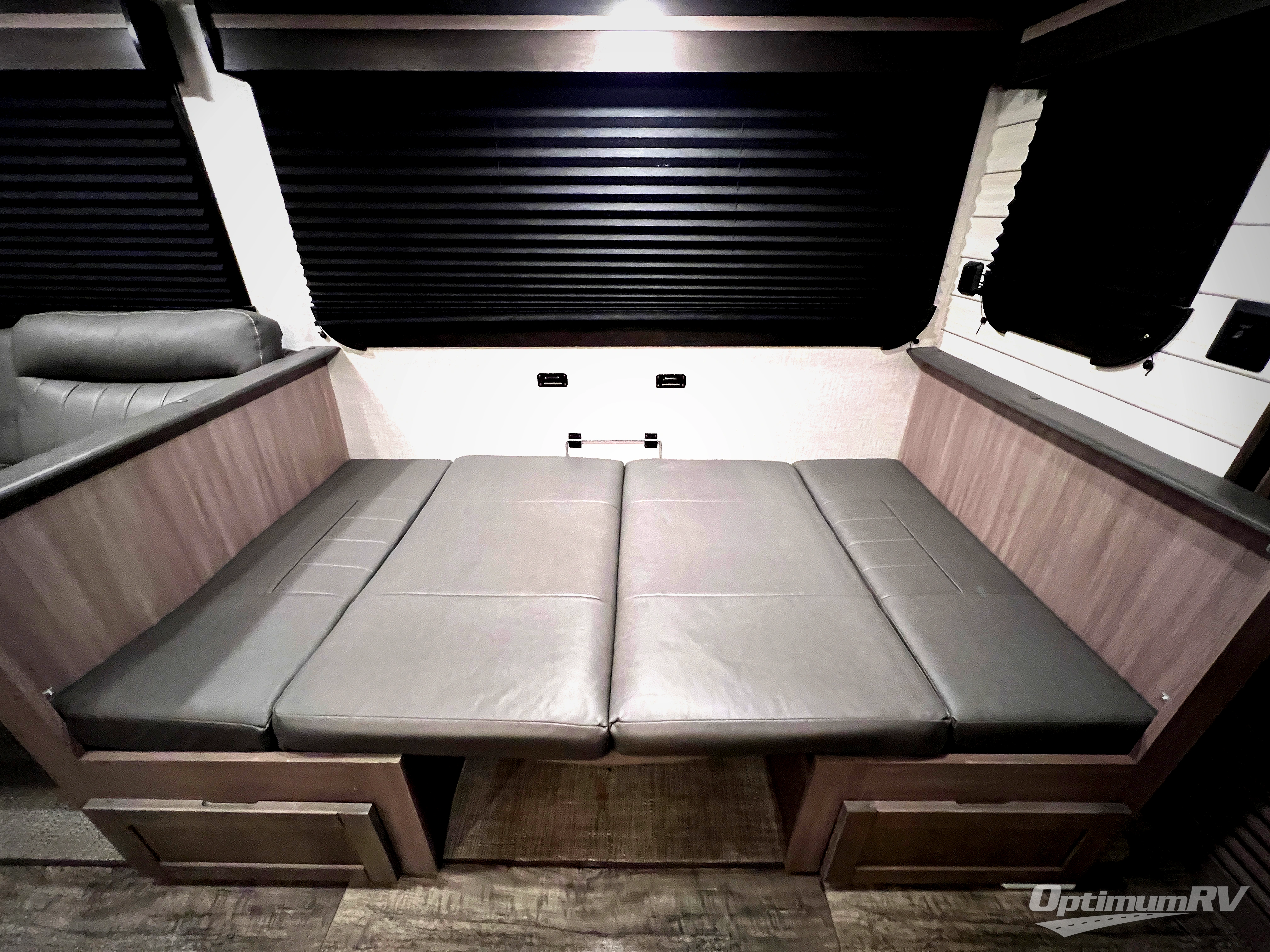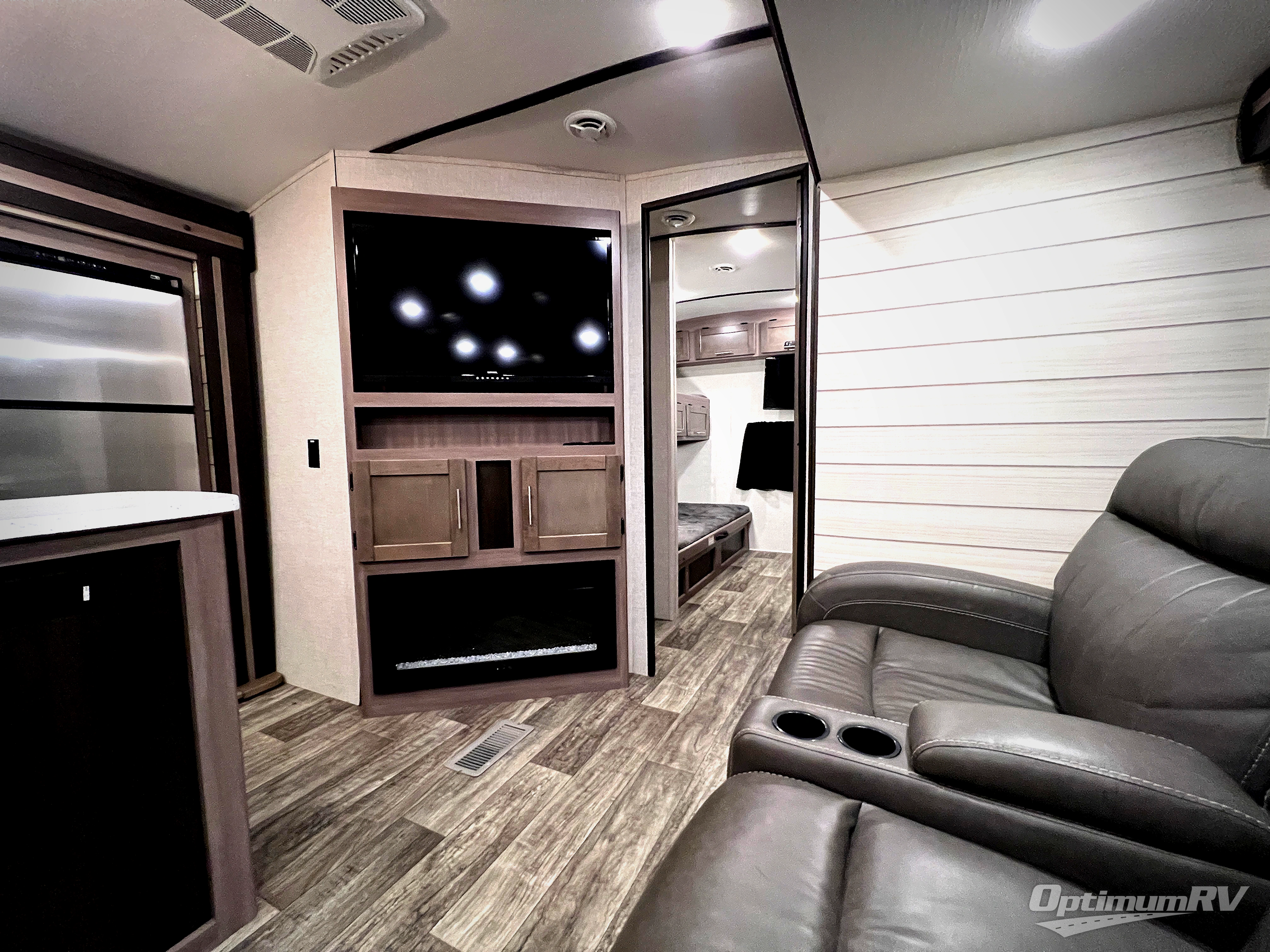 This travel trailer is packed with convenient features and luxury comforts for a camping trip you won't soon forget. Once you arrive at the campground, put out the electric awning and make a quick lunch on the exterior camp kitchen. The kitchen island inside will be the perfect place to cut up all the fixings for the burgers and you can grab the chips from the pantry. The kids will love the private bunkhouse that includes two bunks, a jackknife sofa with a kick, plus a dual entry half bath for convenience. The full walk-through bath will create a front master bedroom you are sure to love. Here, the king bed will provide a great night's rest and there are dual wardrobes for all your clothes. Plus there is a convenient shoe storage and pet station for your trusted loyal friends!