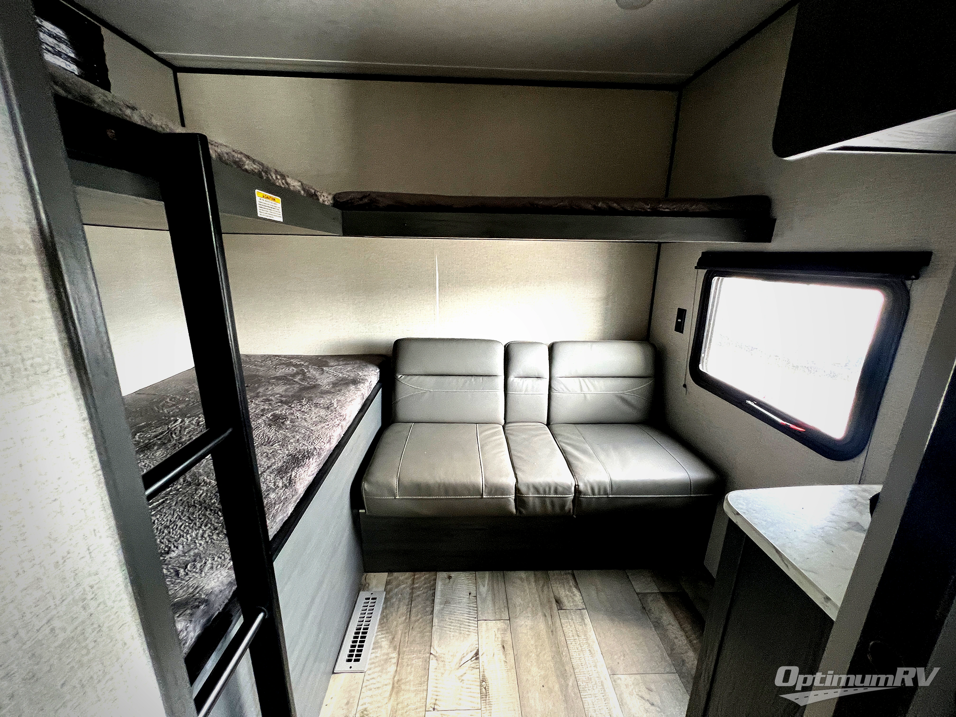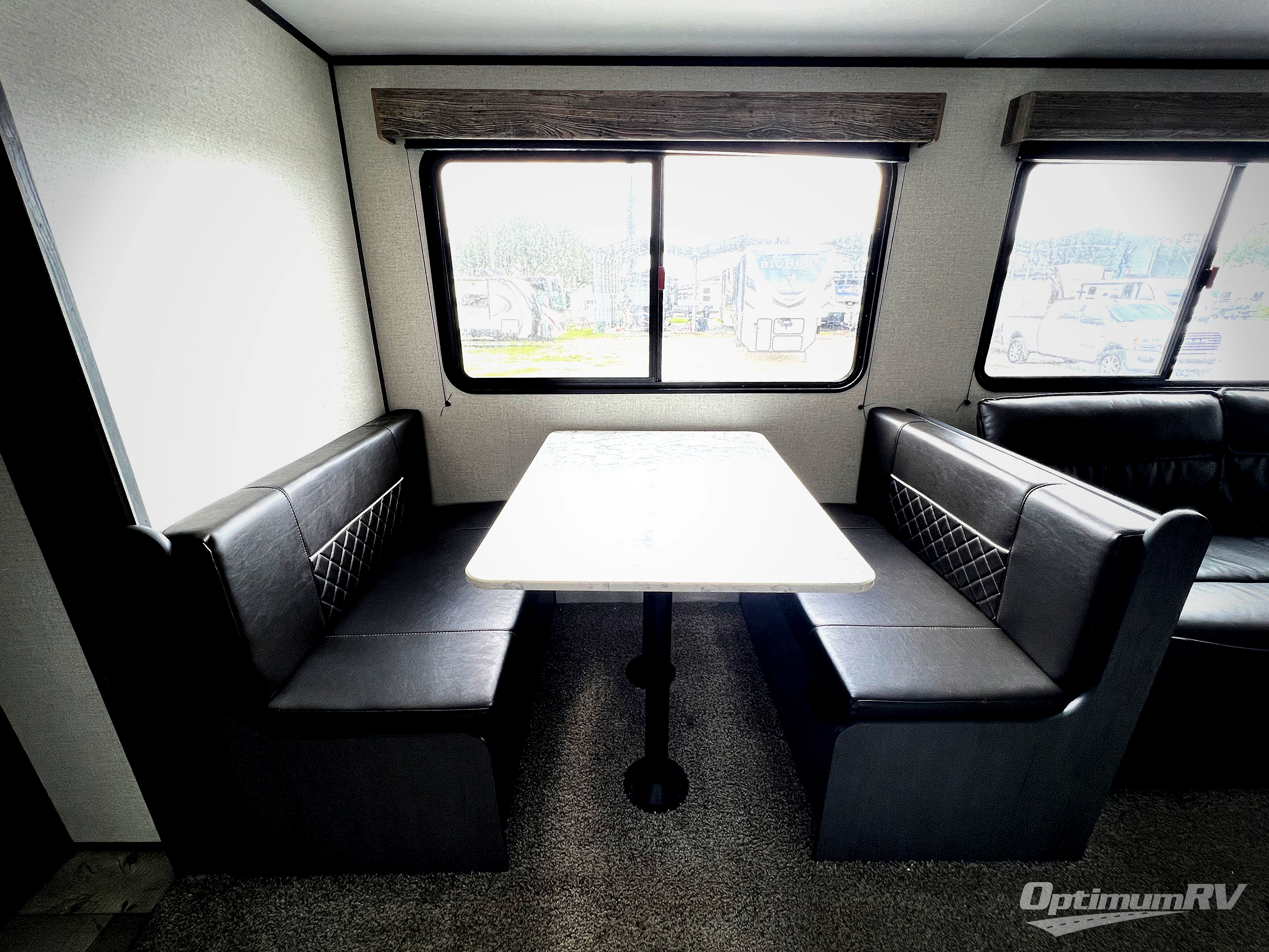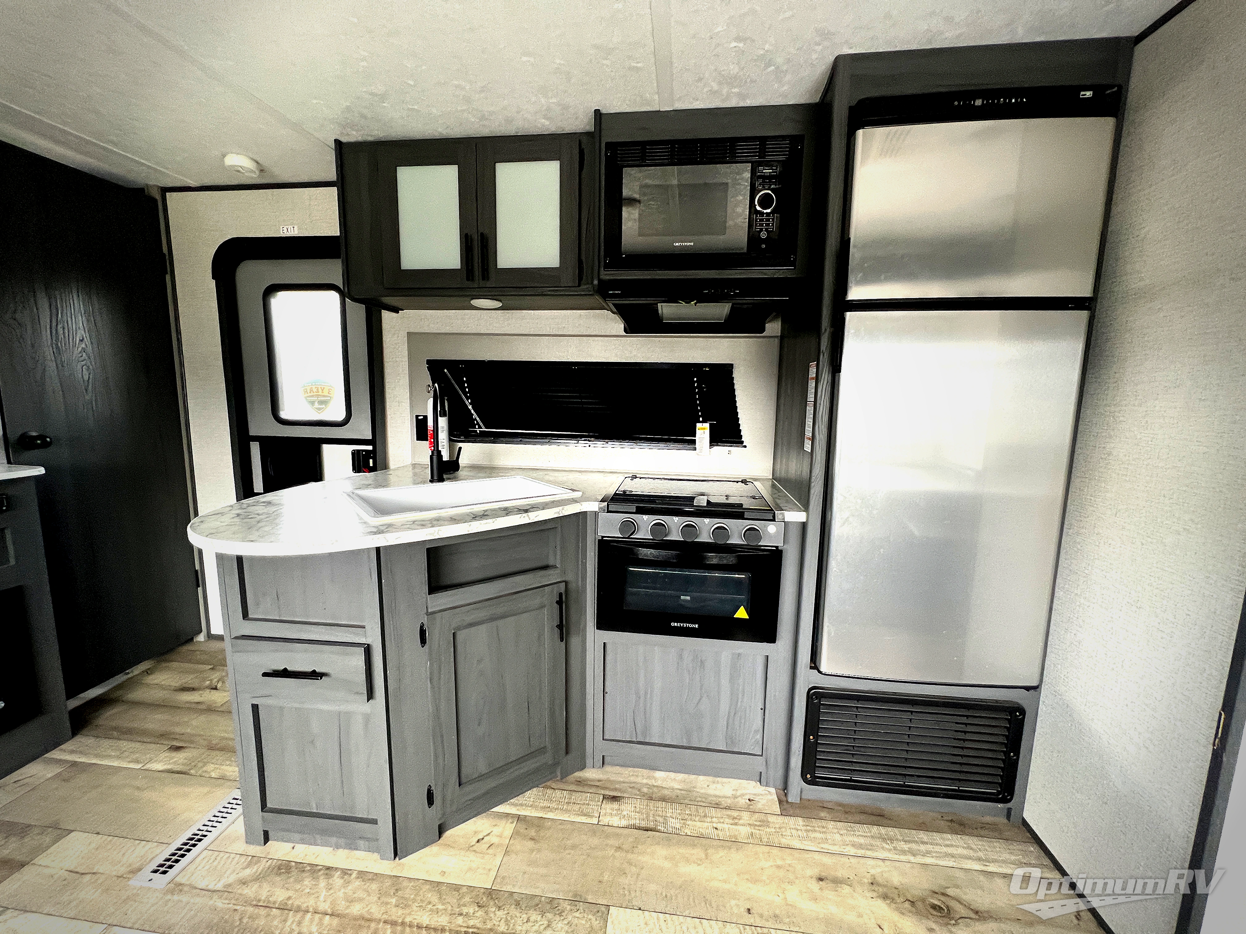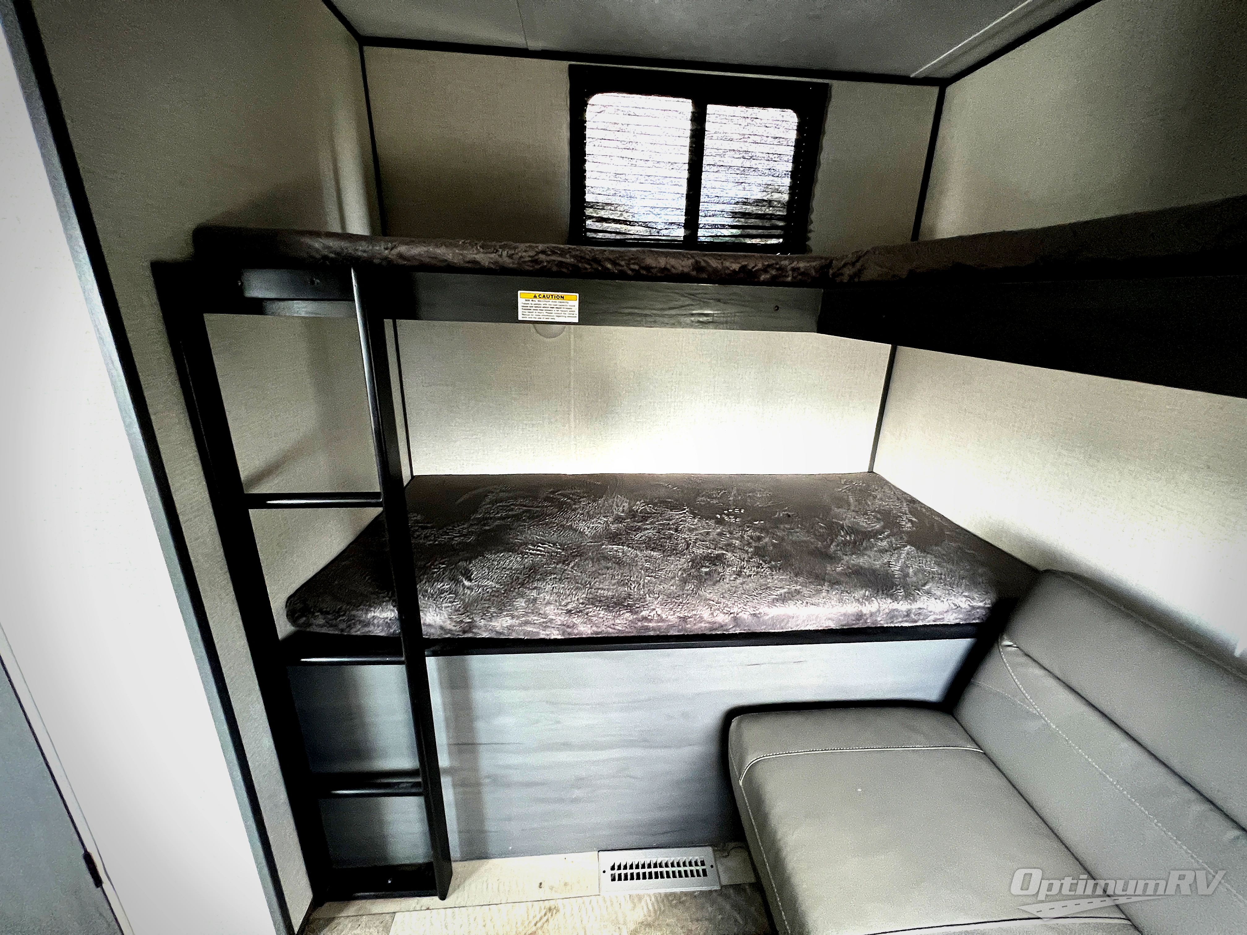 The private bunkhouse might be the main reason you chose this trailer or maybe it was the outside kitchen, either way you will enjoy camping with your family and friends every chance you get. The bunkhouse offers triple bunk beds and a sofa, allowing four people to sleep in privacy. You will have your own bedroom up front to sleep on a residential queen bed with dual access, wardrobes and windows to enjoy the campsite view. The full bathroom offers convenience, and the slide out offers more floor space to move about. There is a booth dinette and sofa to relax on as well as provide more sleeping space for friends and family. The cook will have full amenities including a three burner range top, a galley sink with high rise faucet, plus a 7 cu. ft. refrigerator to store the cold items.