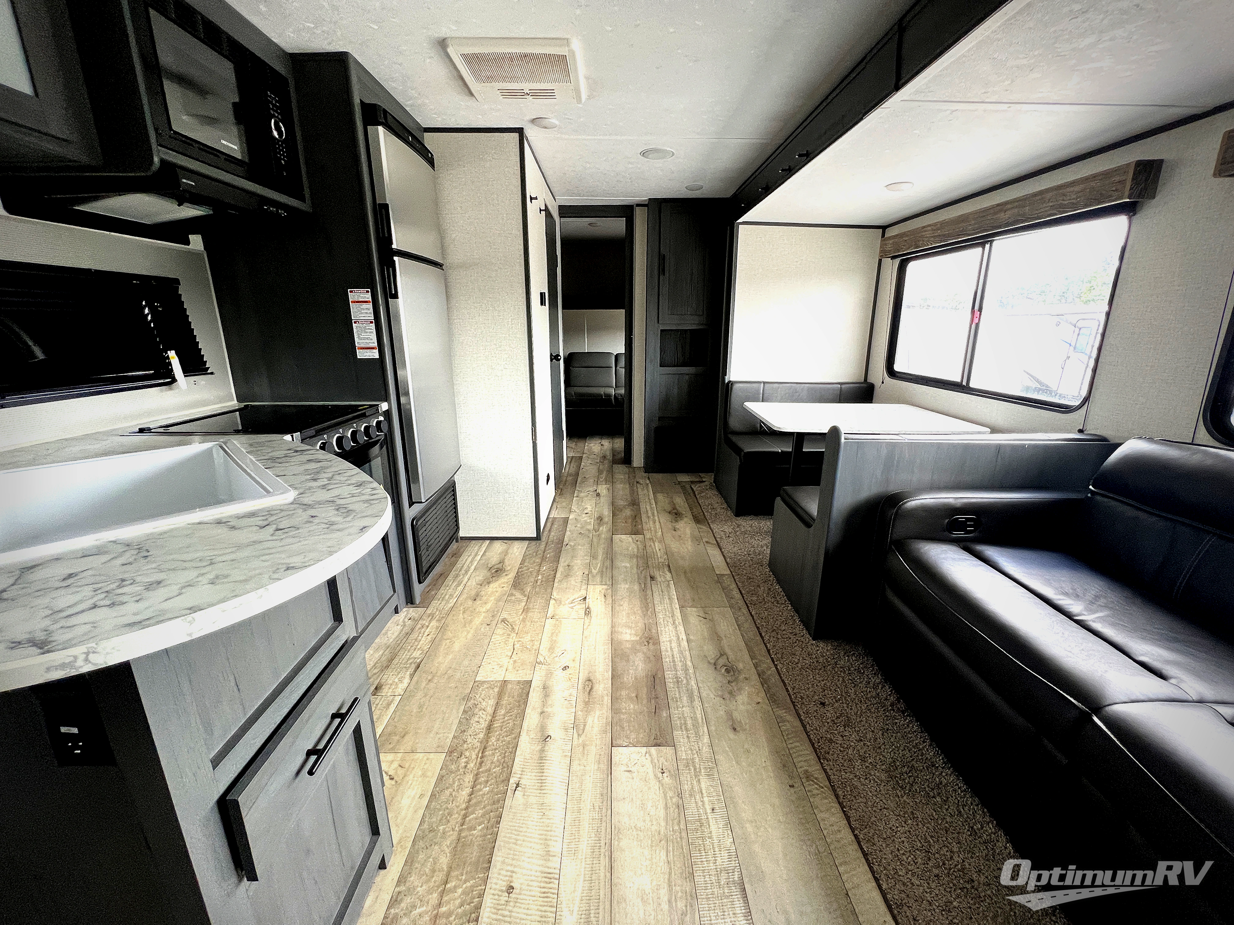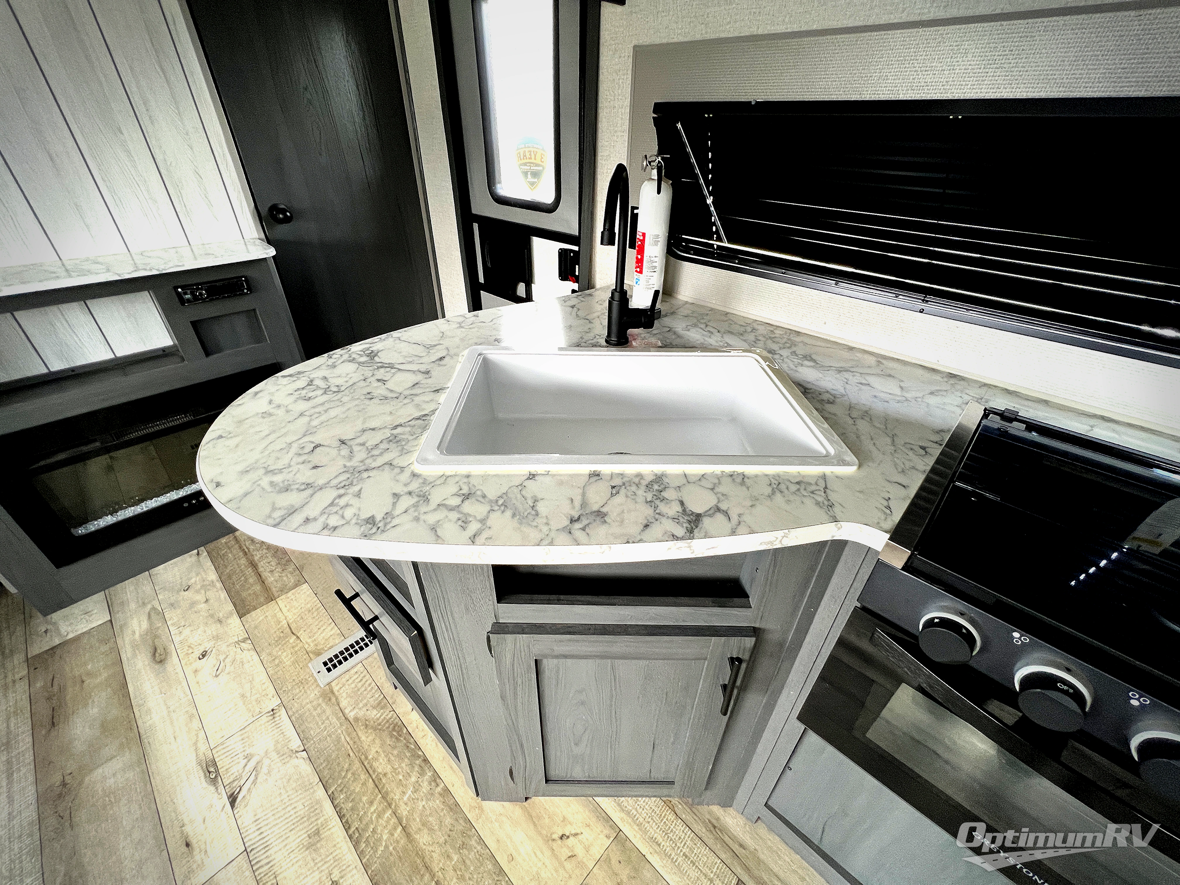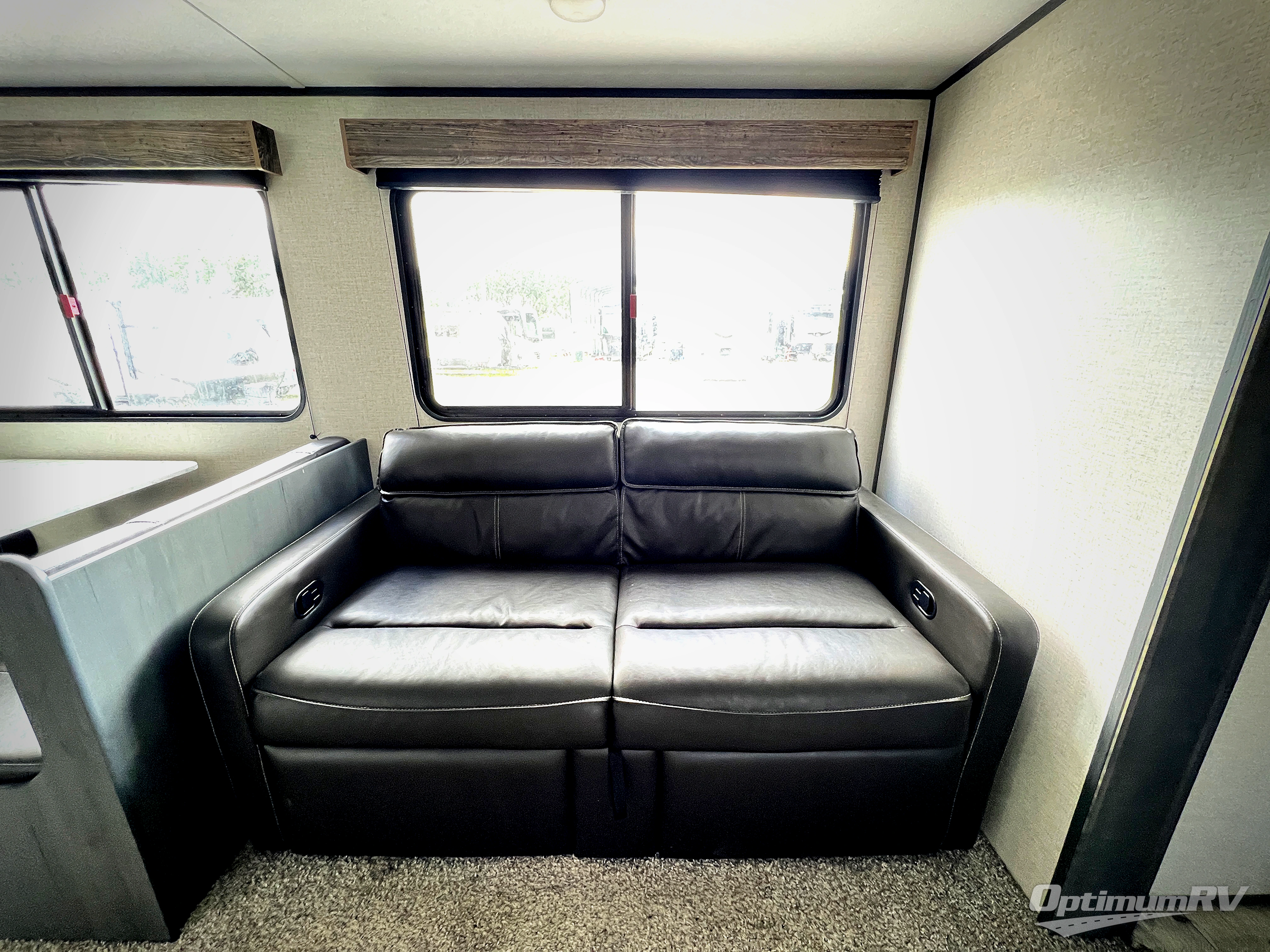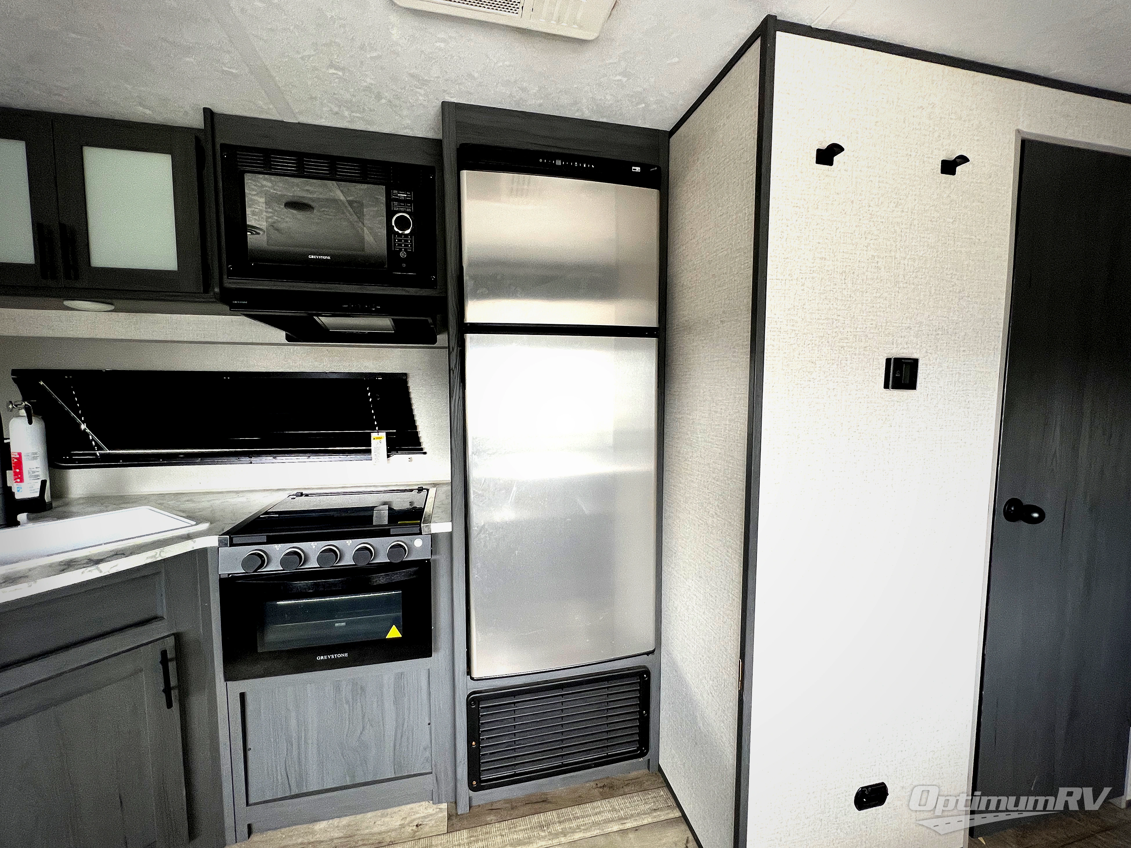 The private bunkhouse might be the main reason you chose this trailer or maybe it was the outside kitchen, either way you will enjoy camping with your family and friends every chance you get. The bunkhouse offers triple bunk beds and a sofa, allowing four people to sleep in privacy. You will have your own bedroom up front to sleep on a residential queen bed with dual access, wardrobes and windows to enjoy the campsite view. The full bathroom offers convenience, and the slide out offers more floor space to move about. There is a booth dinette and sofa to relax on as well as provide more sleeping space for friends and family. The cook will have full amenities including a three burner range top, a galley sink with high rise faucet, plus a 7 cu. ft. refrigerator to store the cold items.