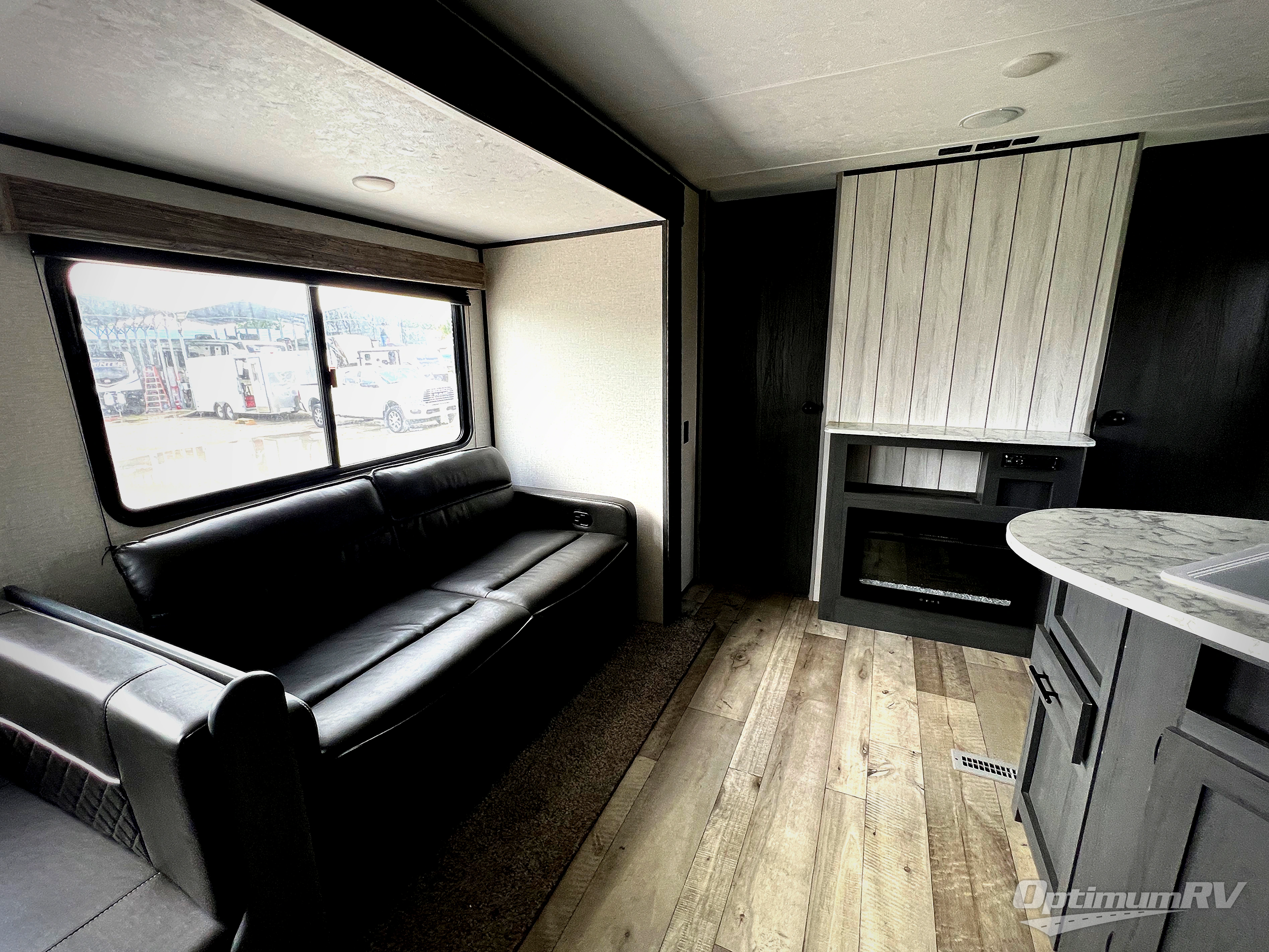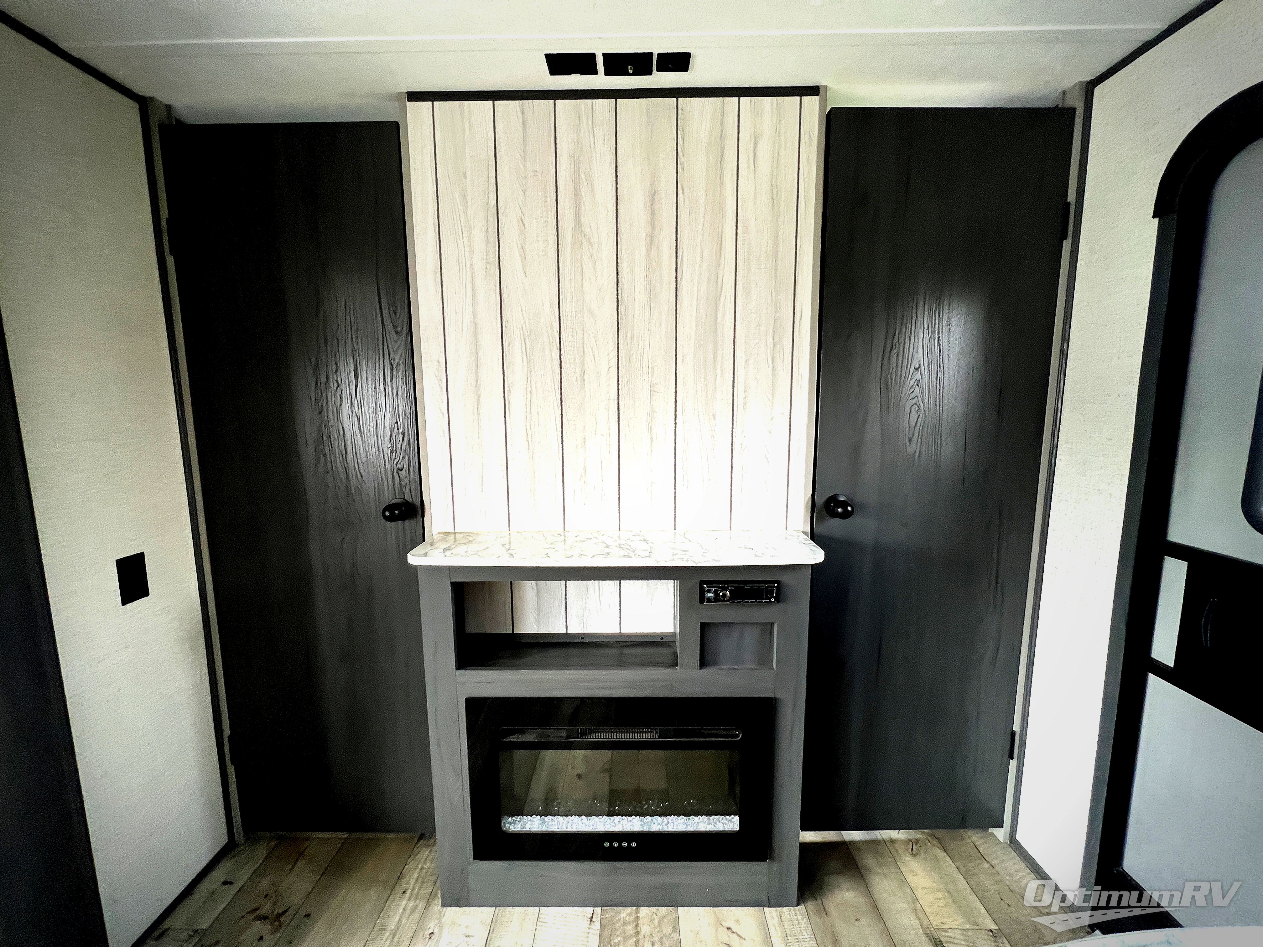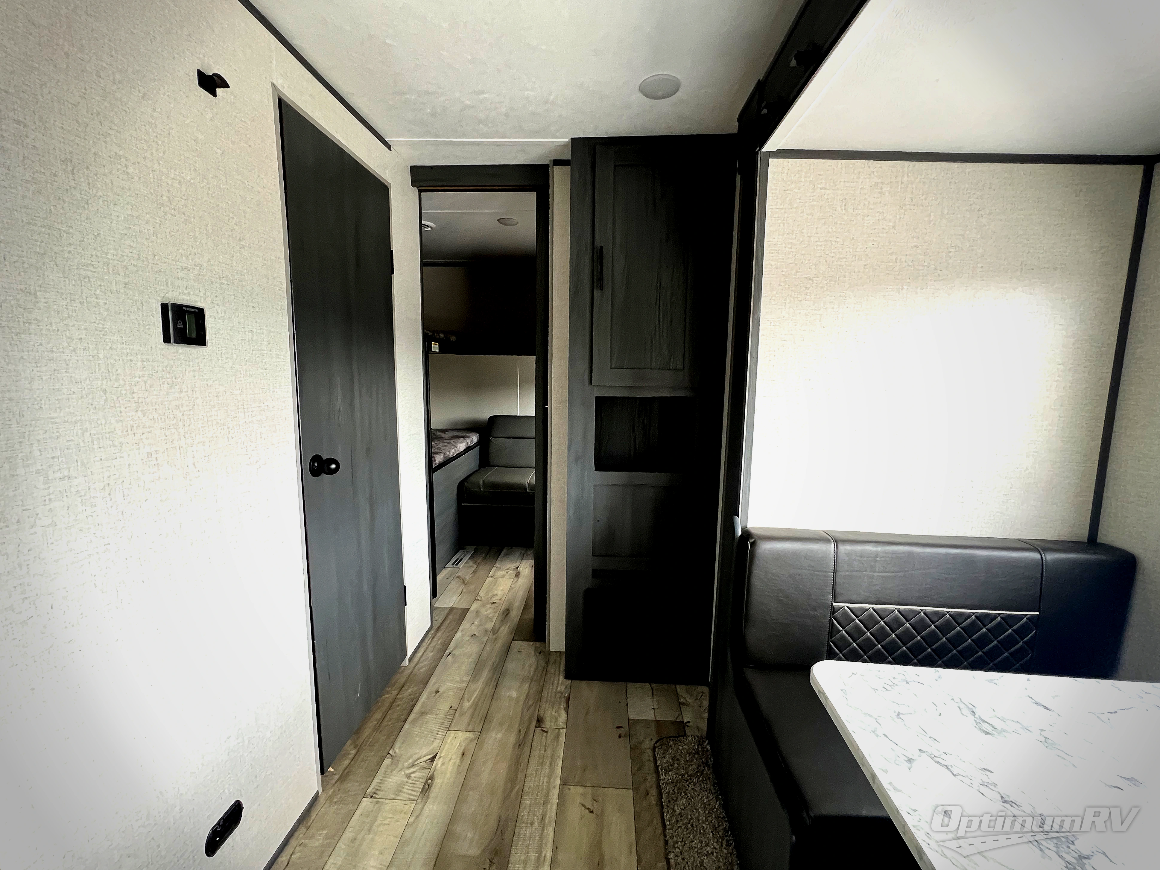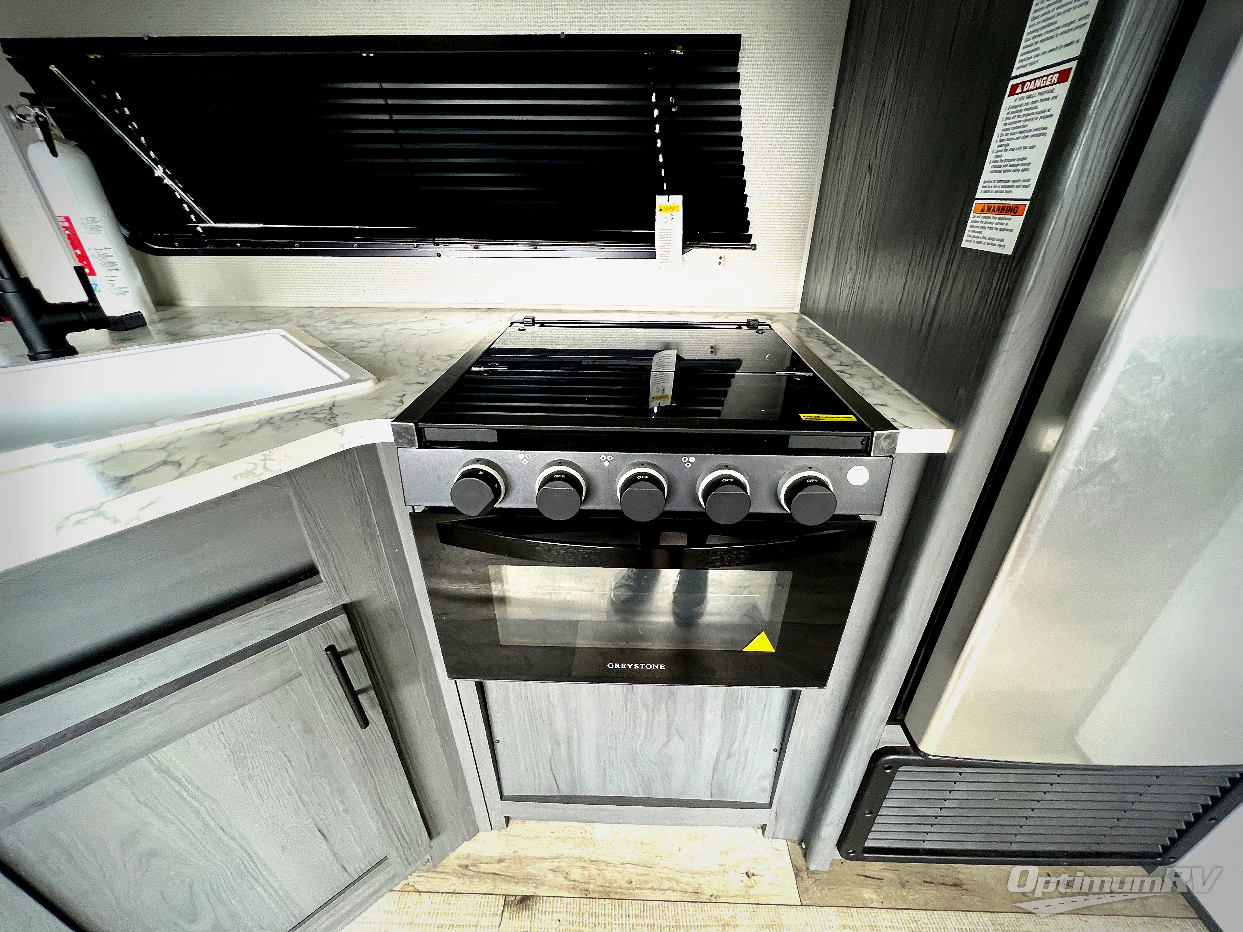 The private bunkhouse might be the main reason you chose this trailer or maybe it was the outside kitchen, either way you will enjoy camping with your family and friends every chance you get. The bunkhouse offers triple bunk beds and a sofa, allowing four people to sleep in privacy. You will have your own bedroom up front to sleep on a residential queen bed with dual access, wardrobes and windows to enjoy the campsite view. The full bathroom offers convenience, and the slide out offers more floor space to move about. There is a booth dinette and sofa to relax on as well as provide more sleeping space for friends and family. The cook will have full amenities including a three burner range top, a galley sink with high rise faucet, plus a 7 cu. ft. refrigerator to store the cold items.