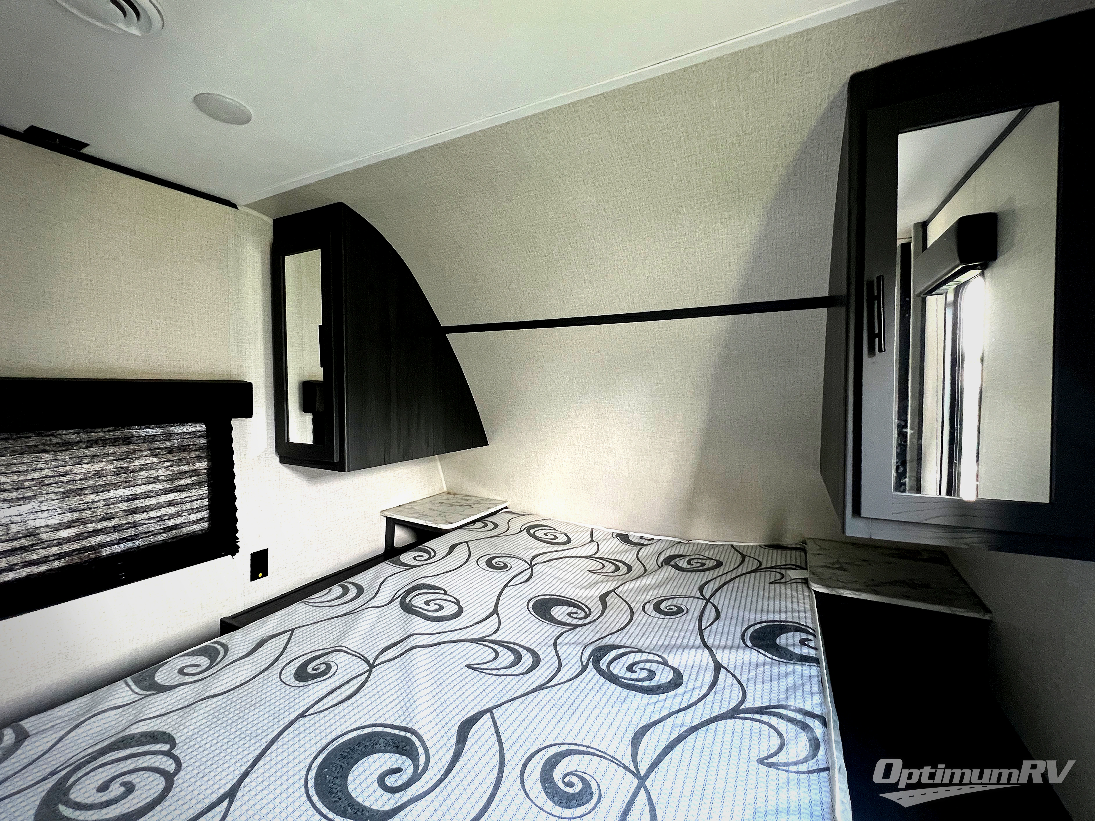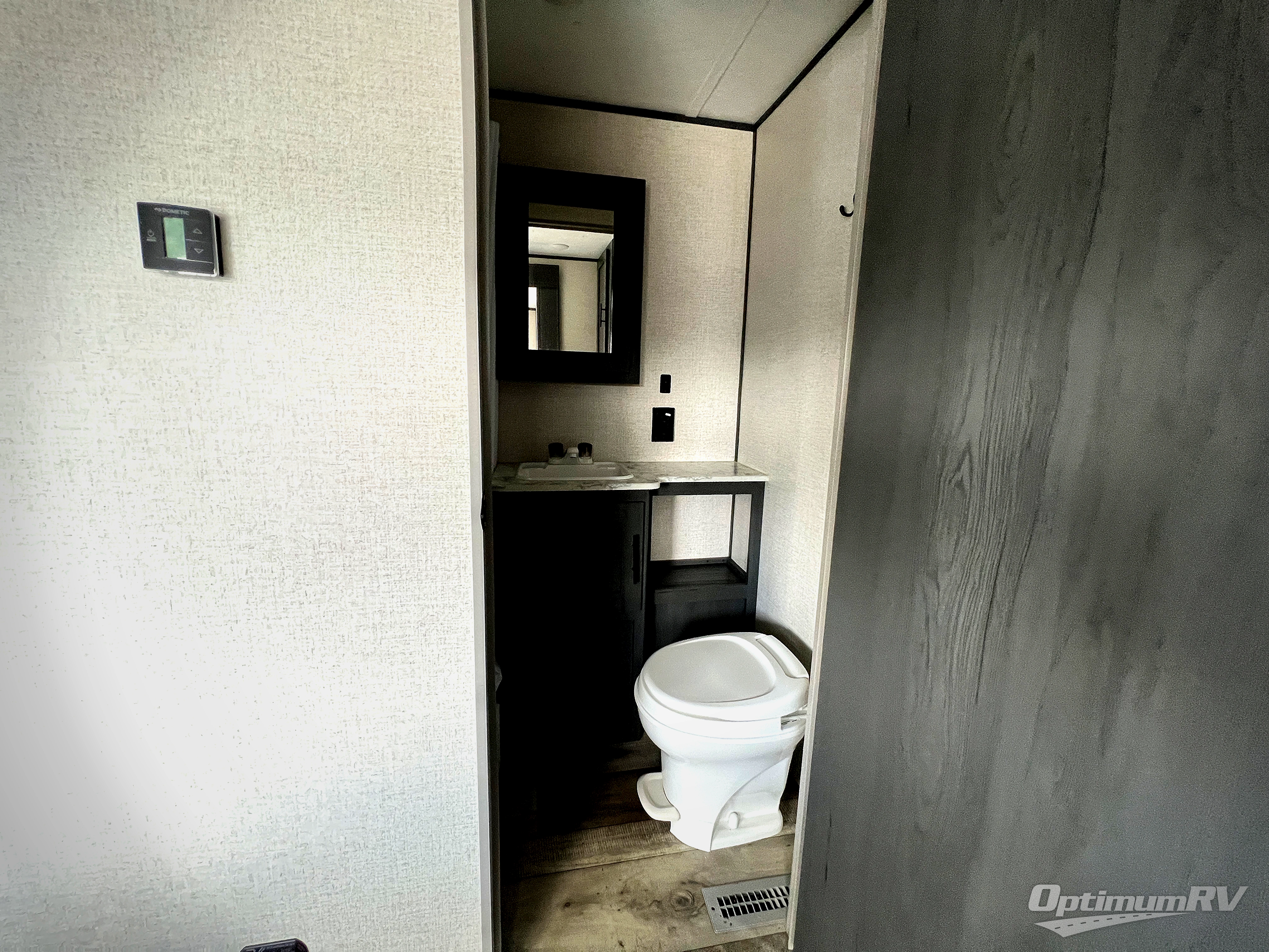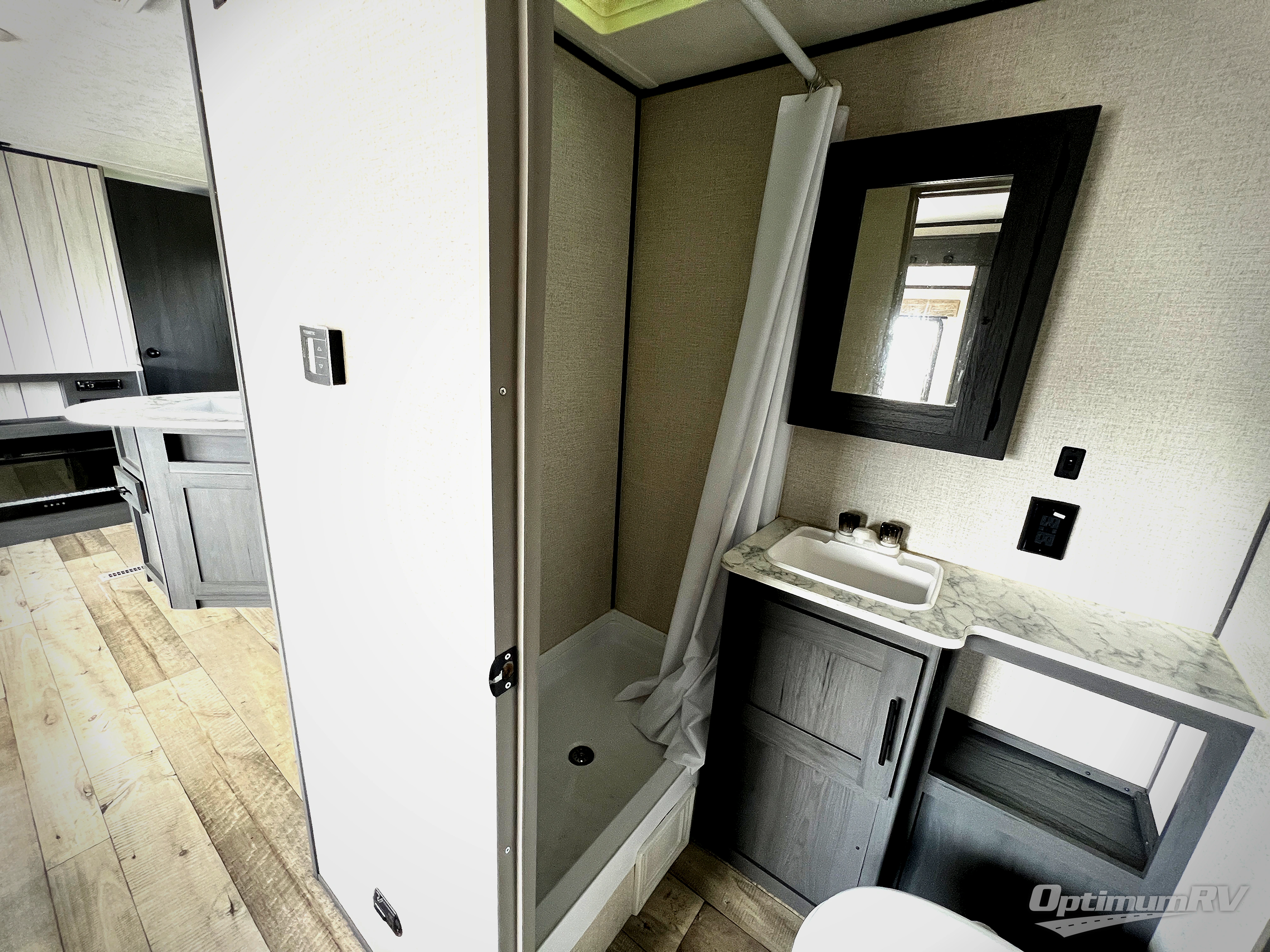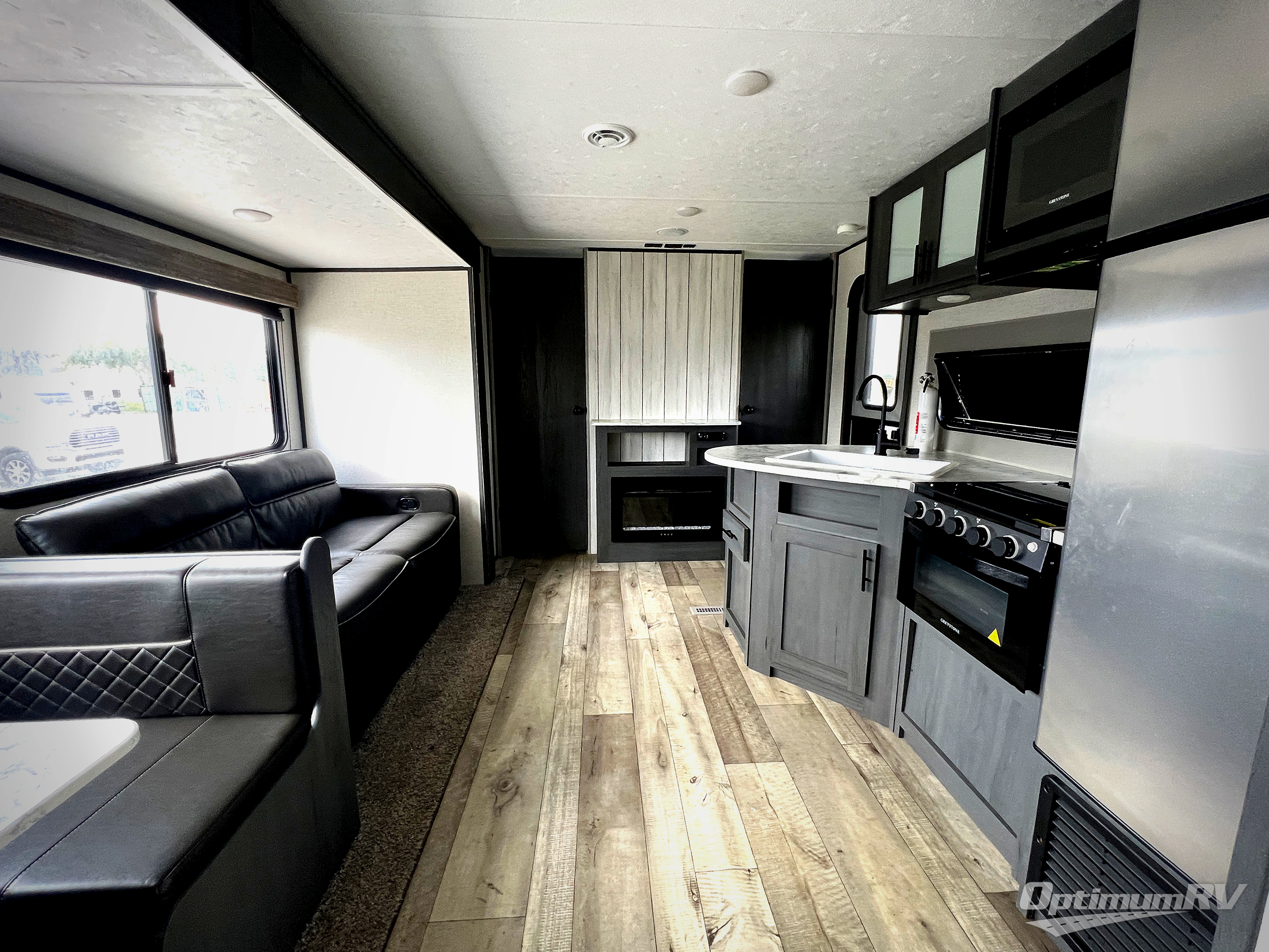 The private bunkhouse might be the main reason you chose this trailer or maybe it was the outside kitchen, either way you will enjoy camping with your family and friends every chance you get. The bunkhouse offers triple bunk beds and a sofa, allowing four people to sleep in privacy. You will have your own bedroom up front to sleep on a residential queen bed with dual access, wardrobes and windows to enjoy the campsite view. The full bathroom offers convenience, and the slide out offers more floor space to move about. There is a booth dinette and sofa to relax on as well as provide more sleeping space for friends and family. The cook will have full amenities including a three burner range top, a galley sink with high rise faucet, plus a 7 cu. ft. refrigerator to store the cold items.