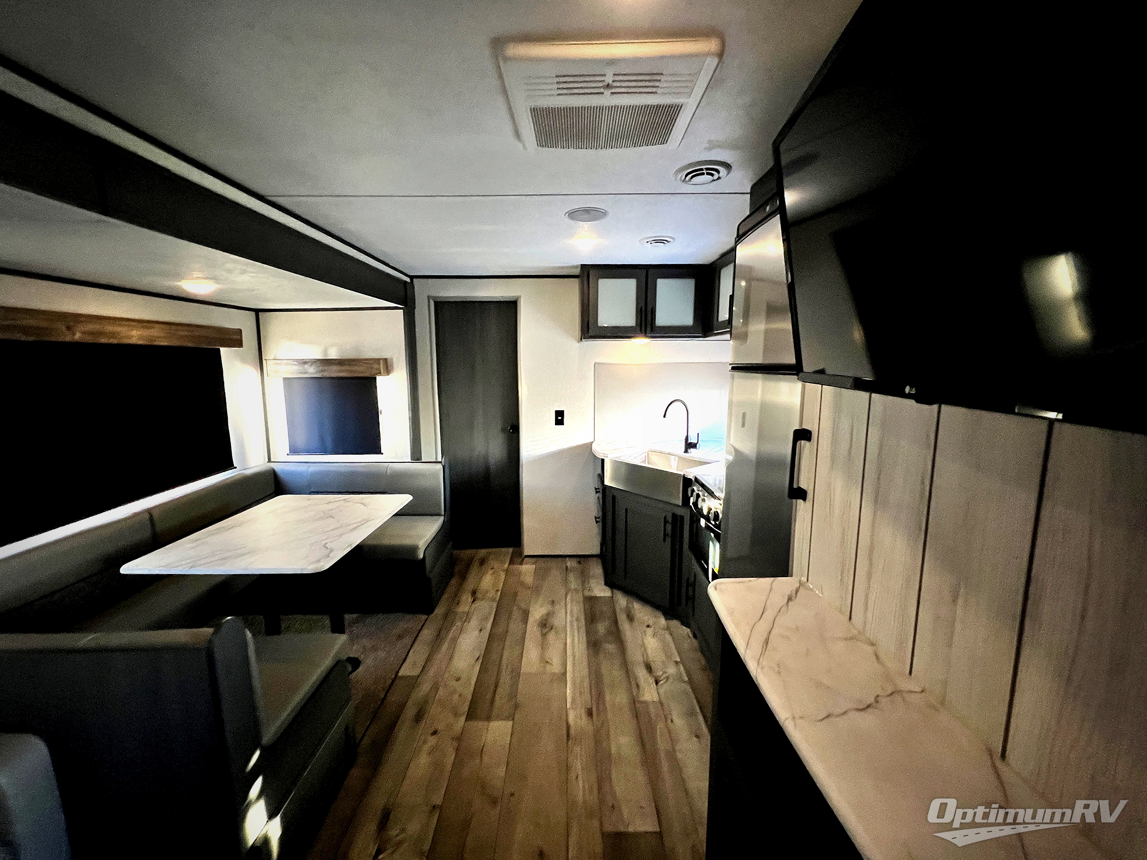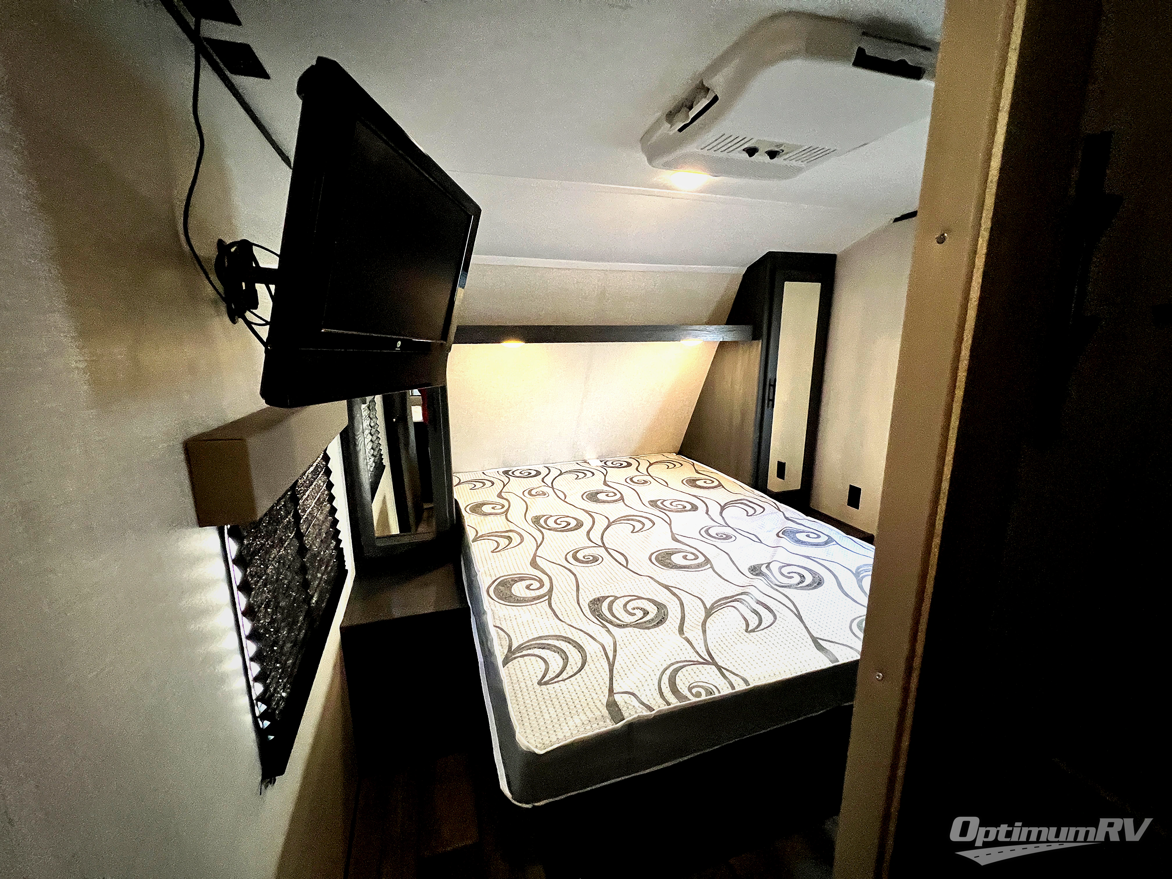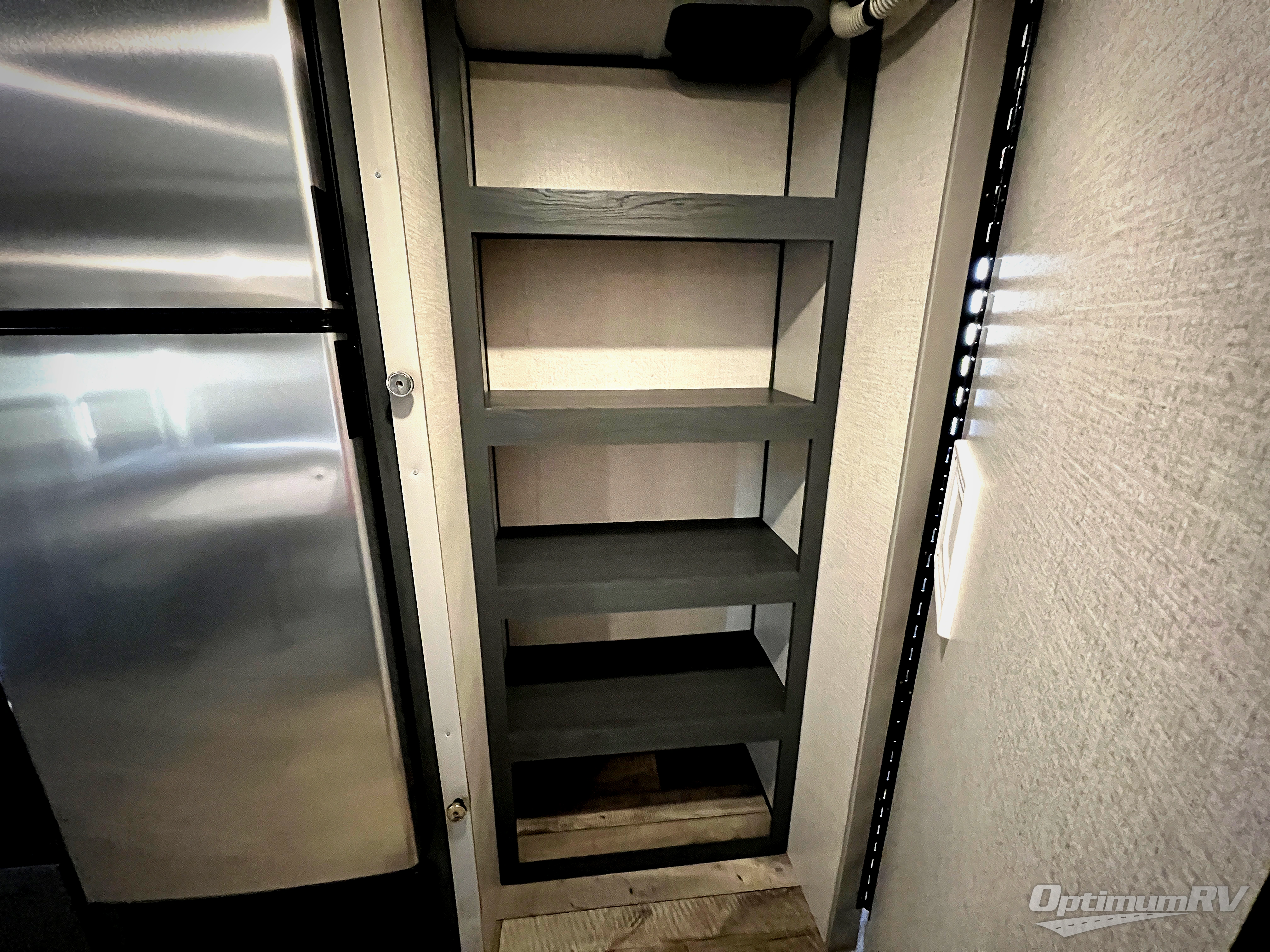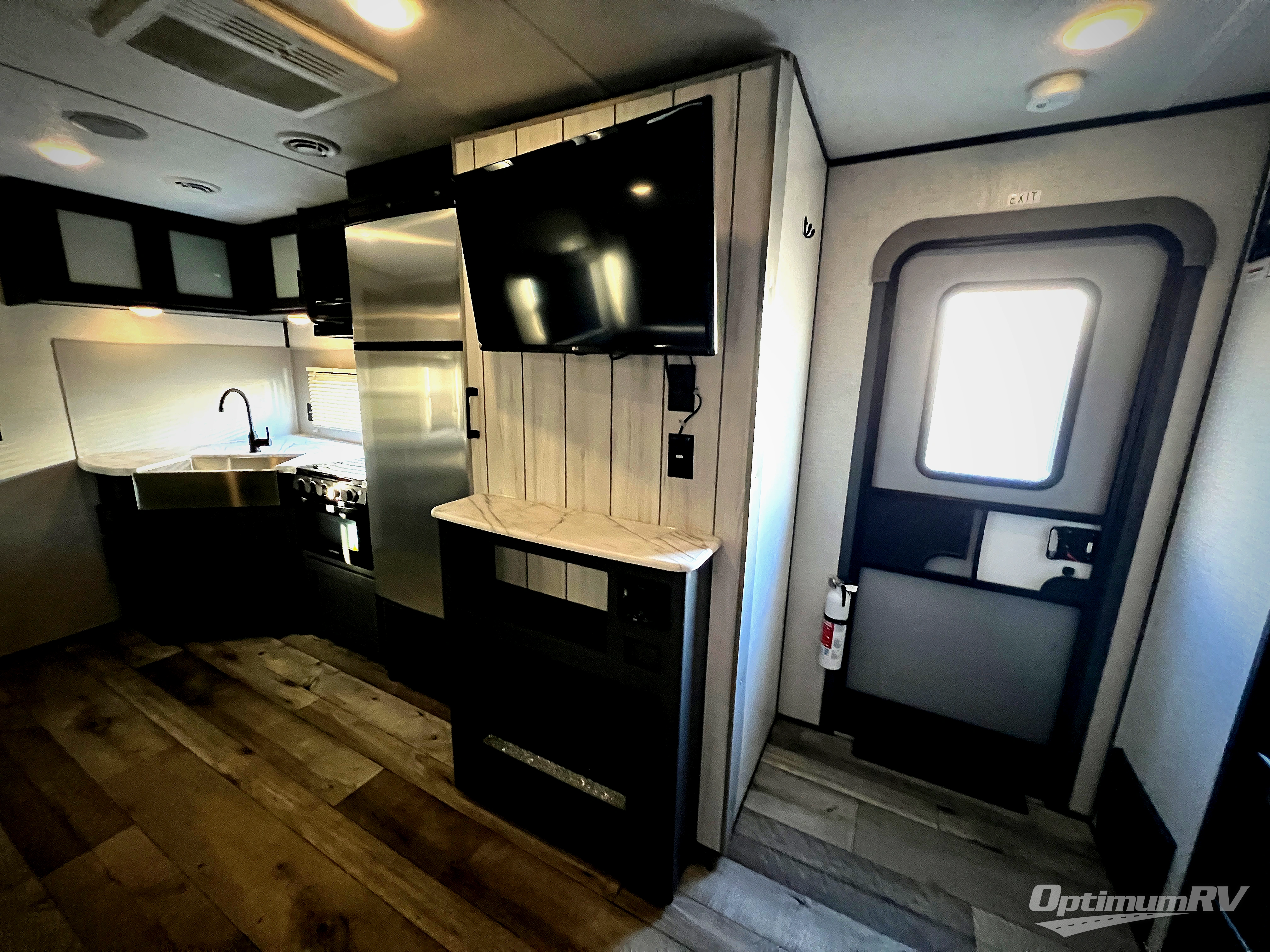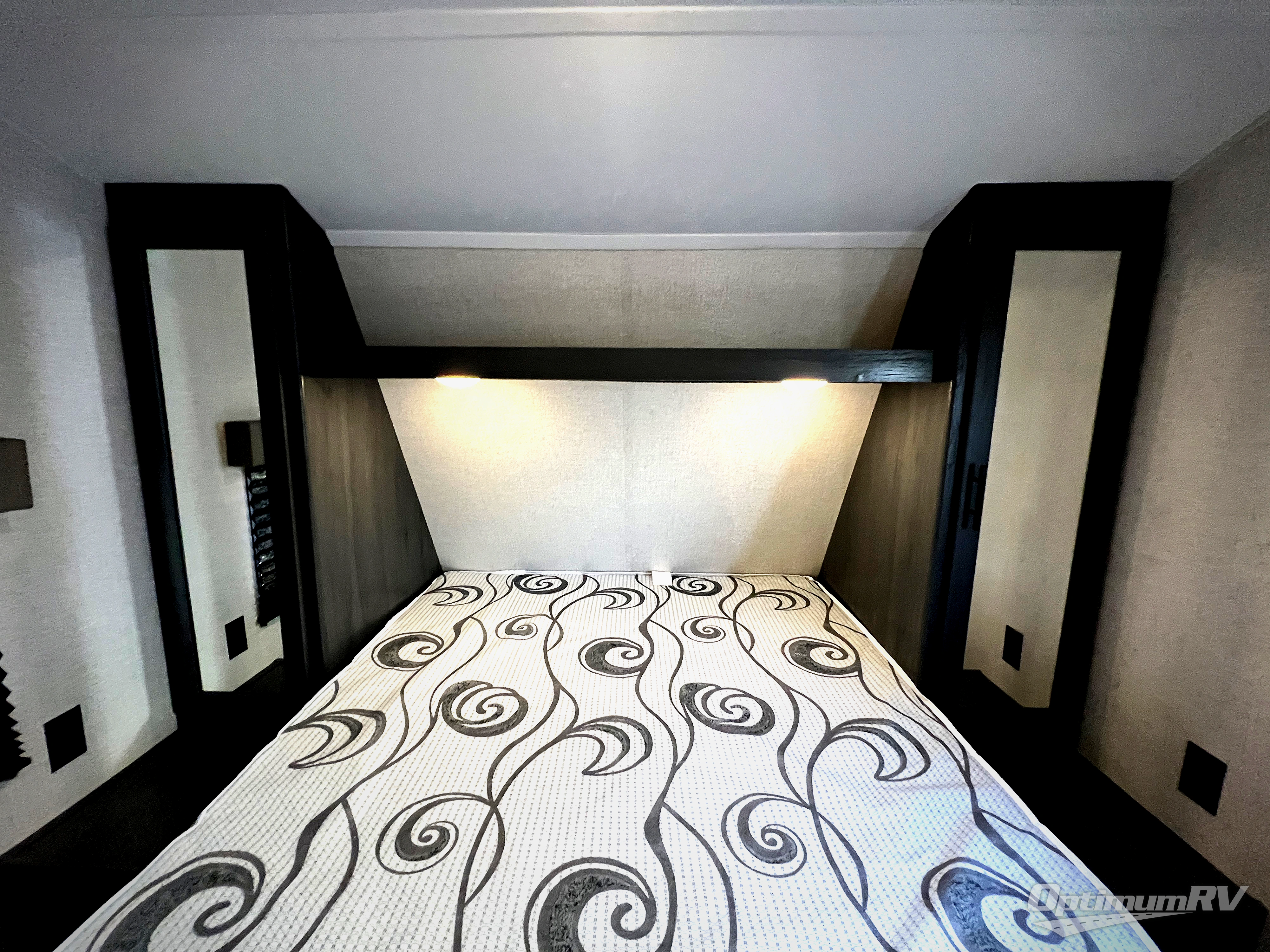 When you camp, you don't have to leave comforts of home behind when you have this travel trailer! You can sleep like a queen in the front master suite while your family and friends sleep on the U-shaped dinette and sofa, plus the double-size bunk beds next to the full bathroom. And there is plenty of bathroom space with a half bathroom included in the master suite, and a full bathroom. You'll have extra interior living space with a large slide, and this allows you to relax comfortably as you enjoy the fireplace and hinged entertainment center. There is even a pantry hidden behind the entertainment center too. Another great convenience that this trailer offers you is the set of two entry doors. One of the doors leads directly into the front bedroom which is super handy for the owners of this trailer.