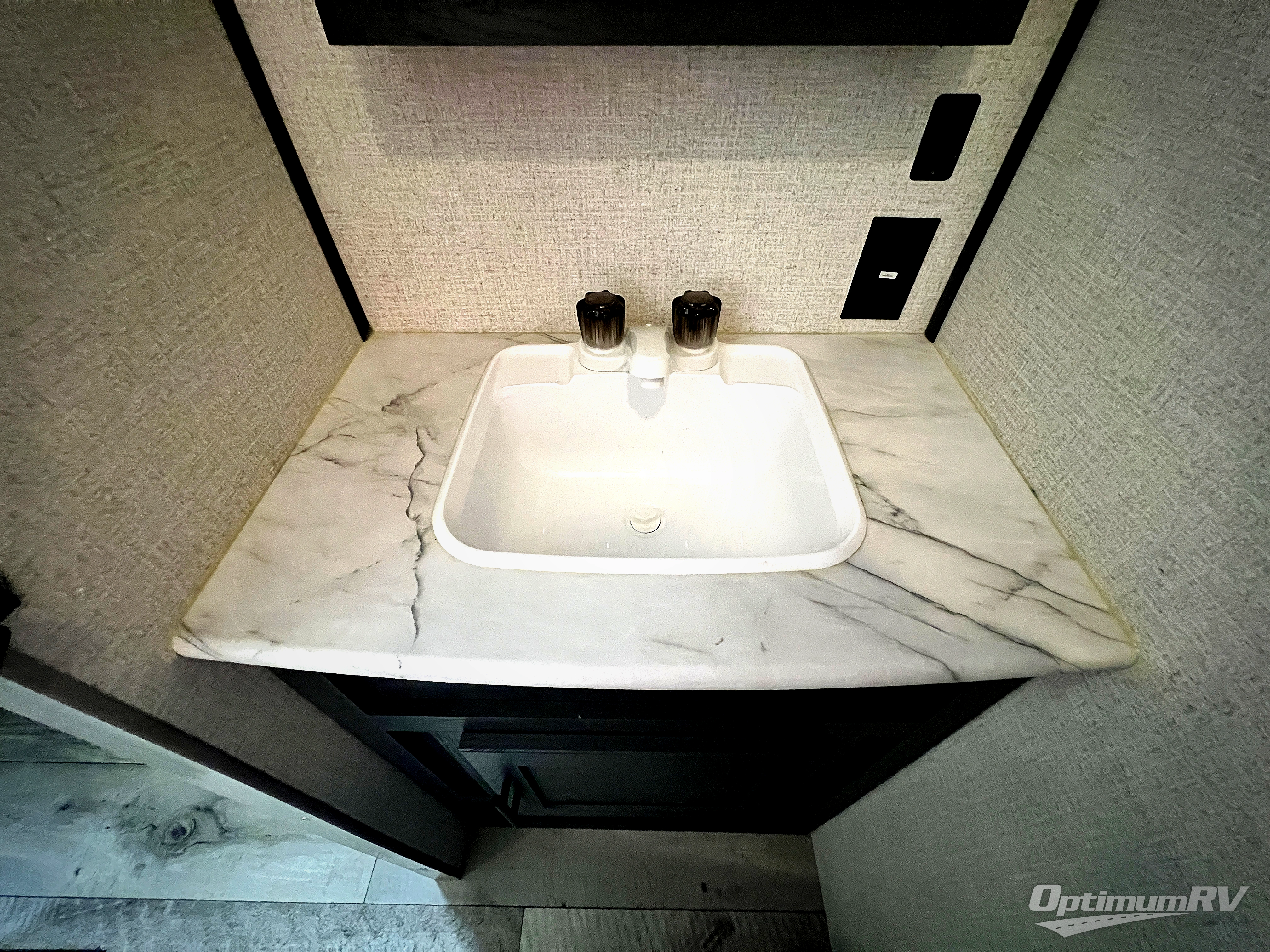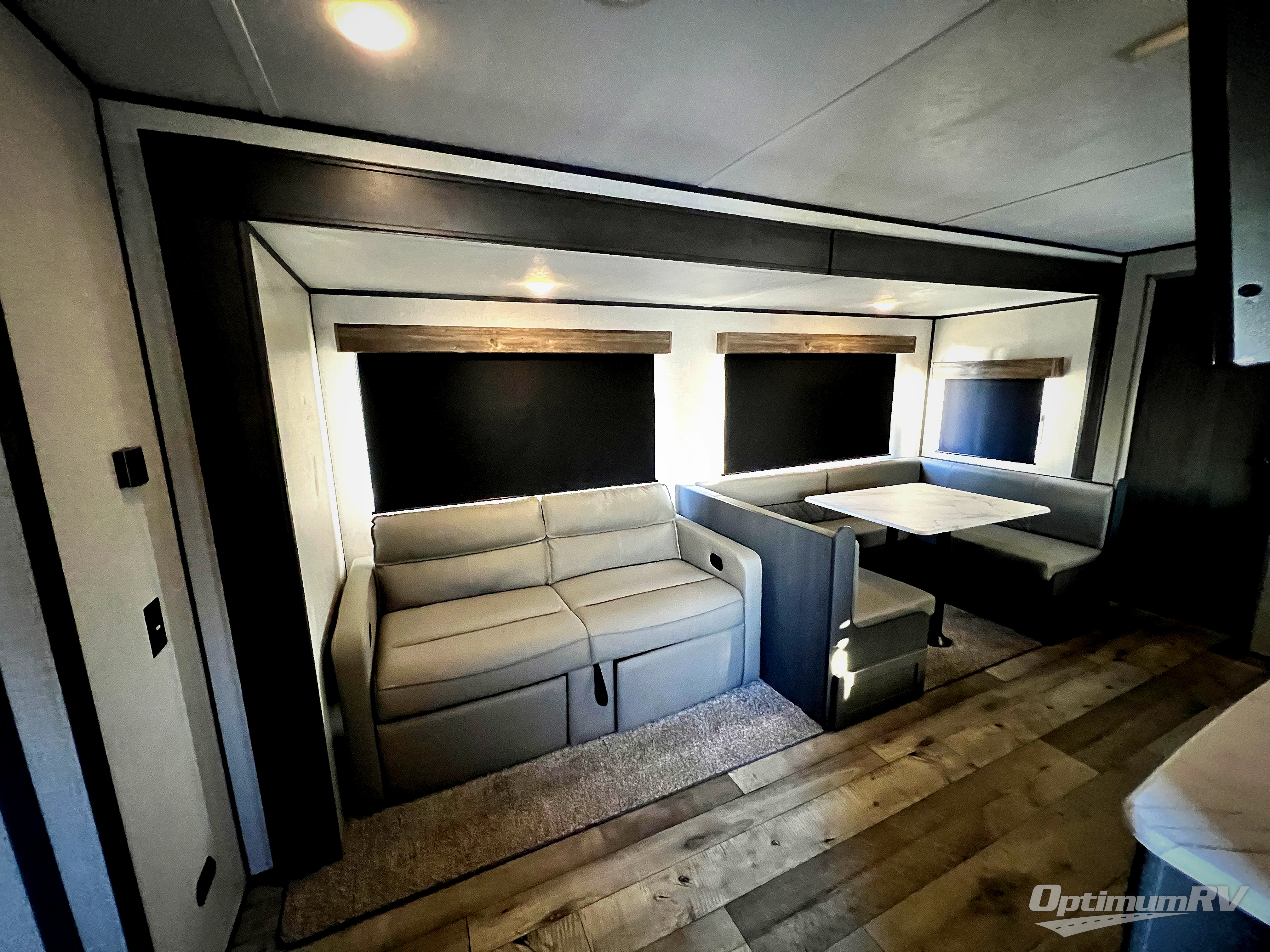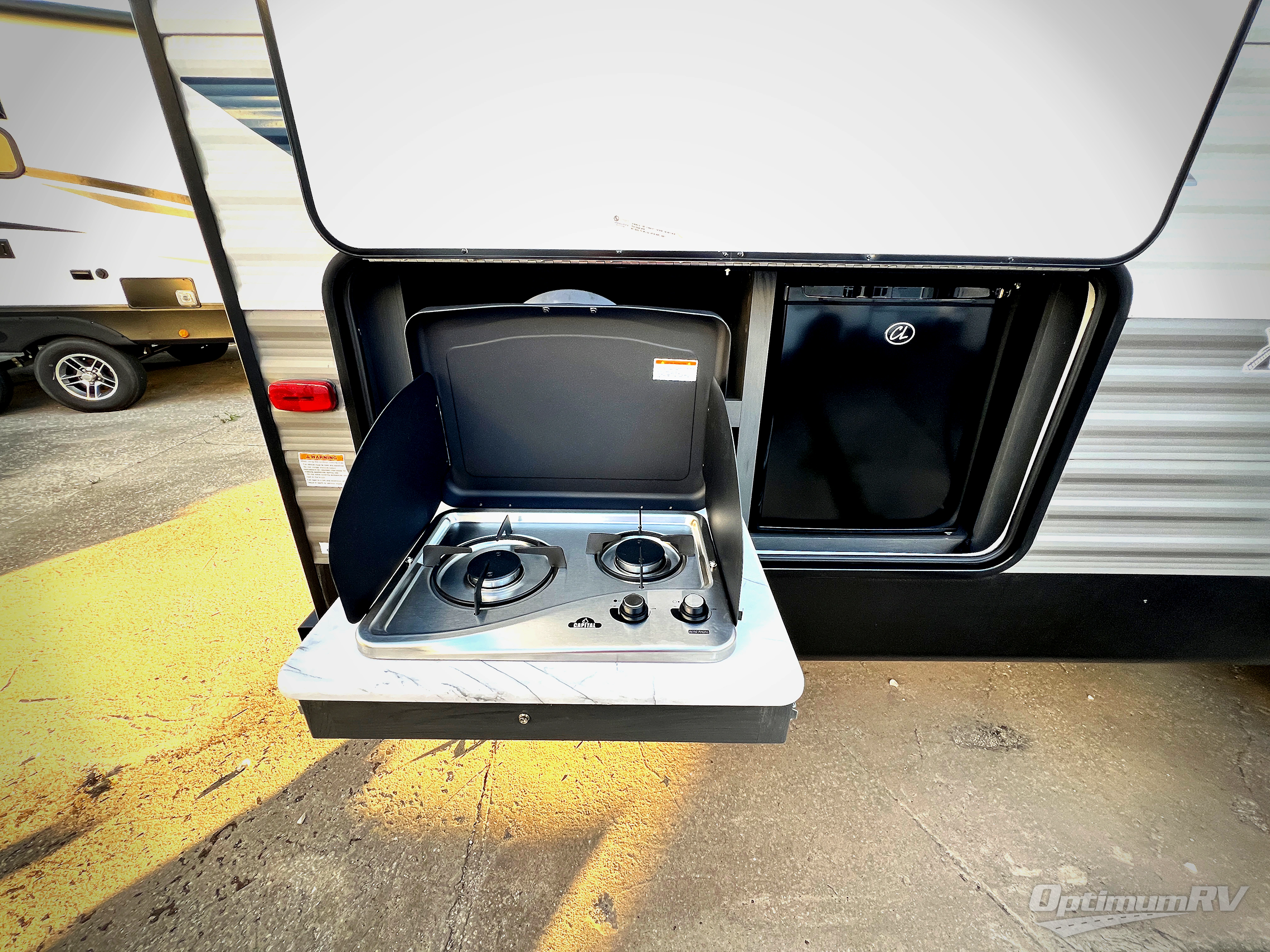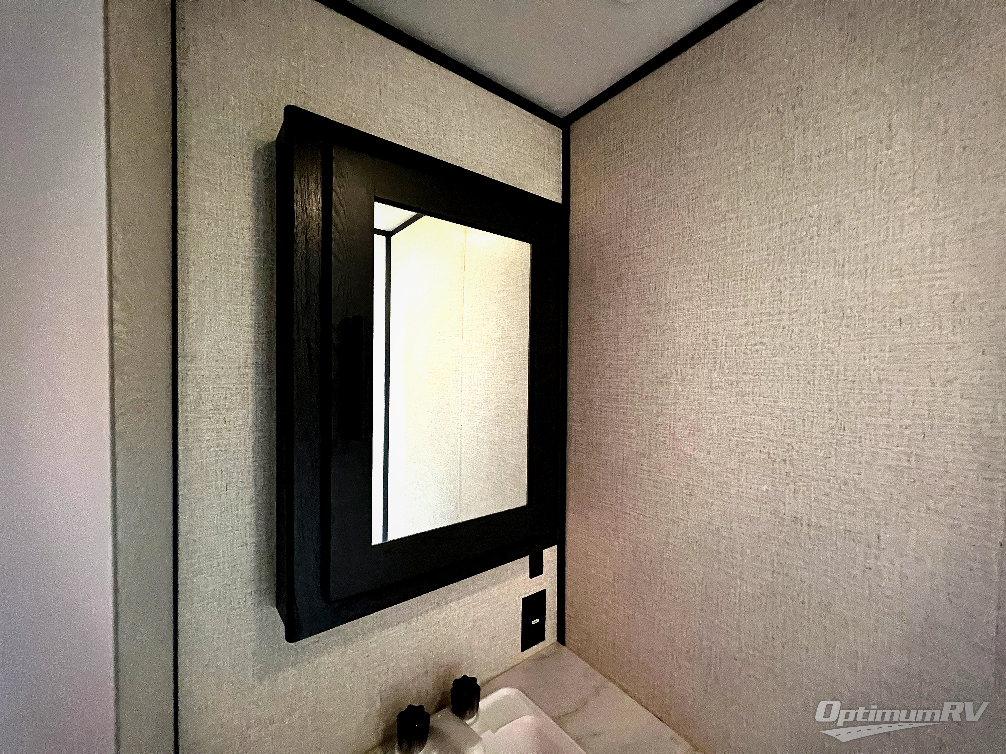 When you camp, you don't have to leave comforts of home behind when you have this travel trailer! You can sleep like a queen in the front master suite while your family and friends sleep on the U-shaped dinette and sofa, plus the double-size bunk beds next to the full bathroom. And there is plenty of bathroom space with a half bathroom included in the master suite, and a full bathroom. You'll have extra interior living space with a large slide, and this allows you to relax comfortably as you enjoy the fireplace and hinged entertainment center. There is even a pantry hidden behind the entertainment center too. Another great convenience that this trailer offers you is the set of two entry doors. One of the doors leads directly into the front bedroom which is super handy for the owners of this trailer.