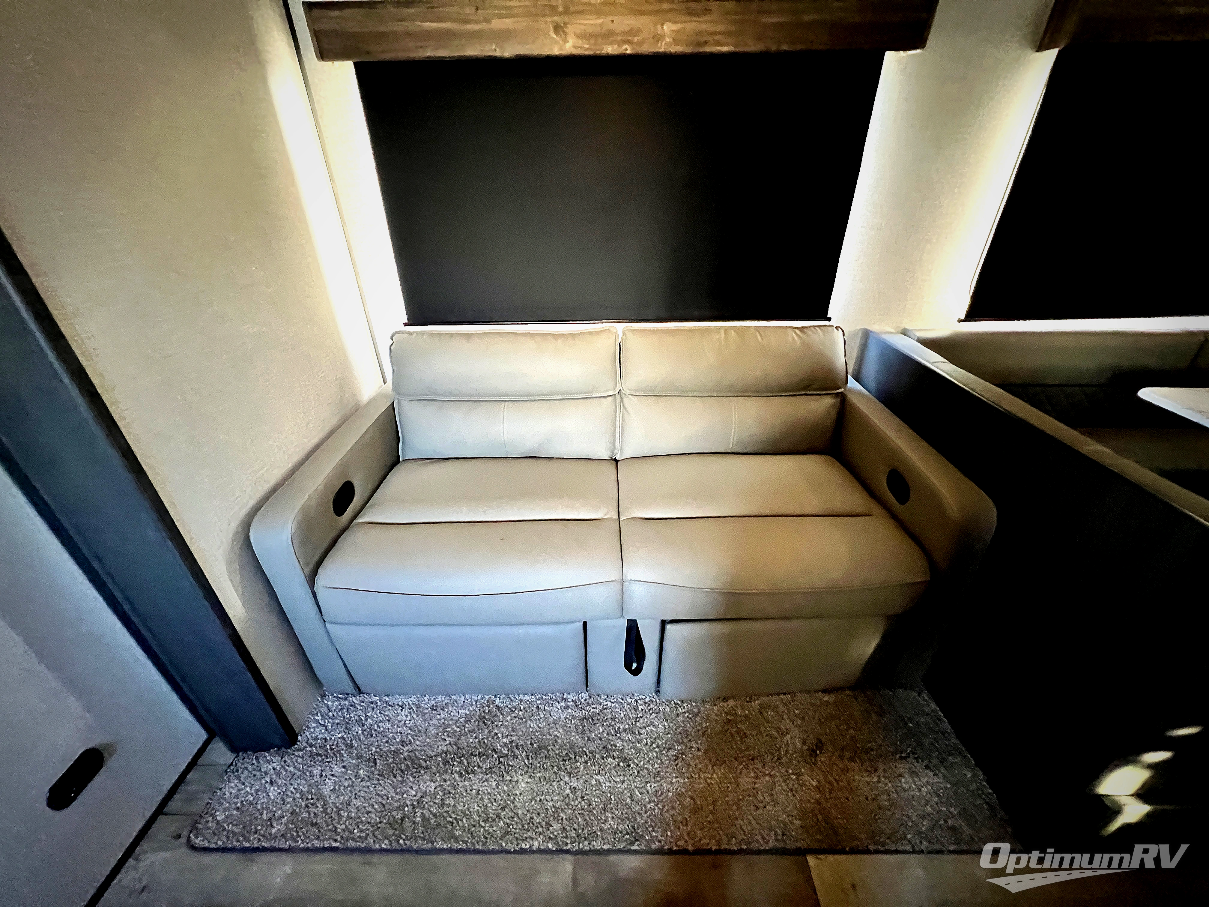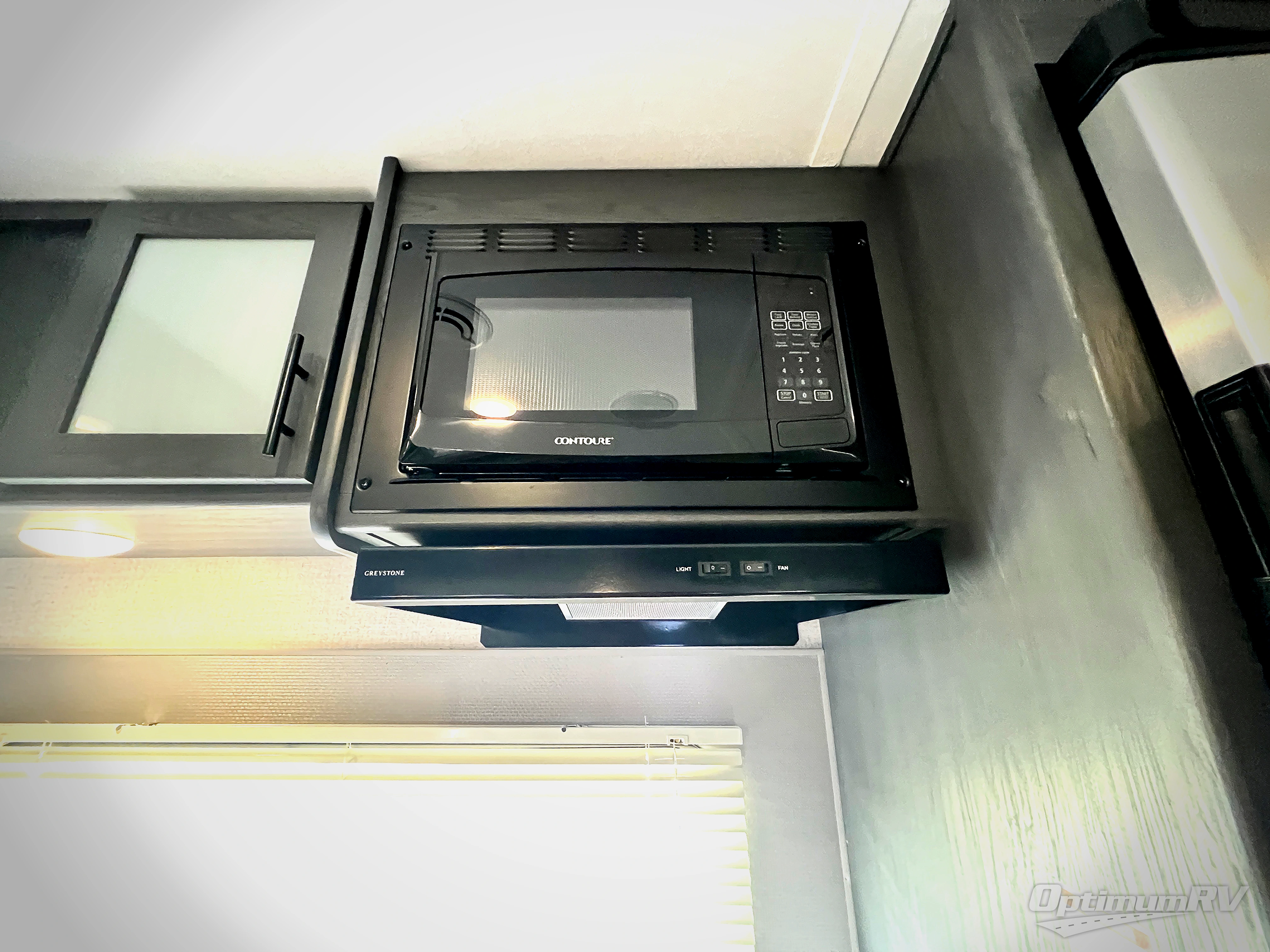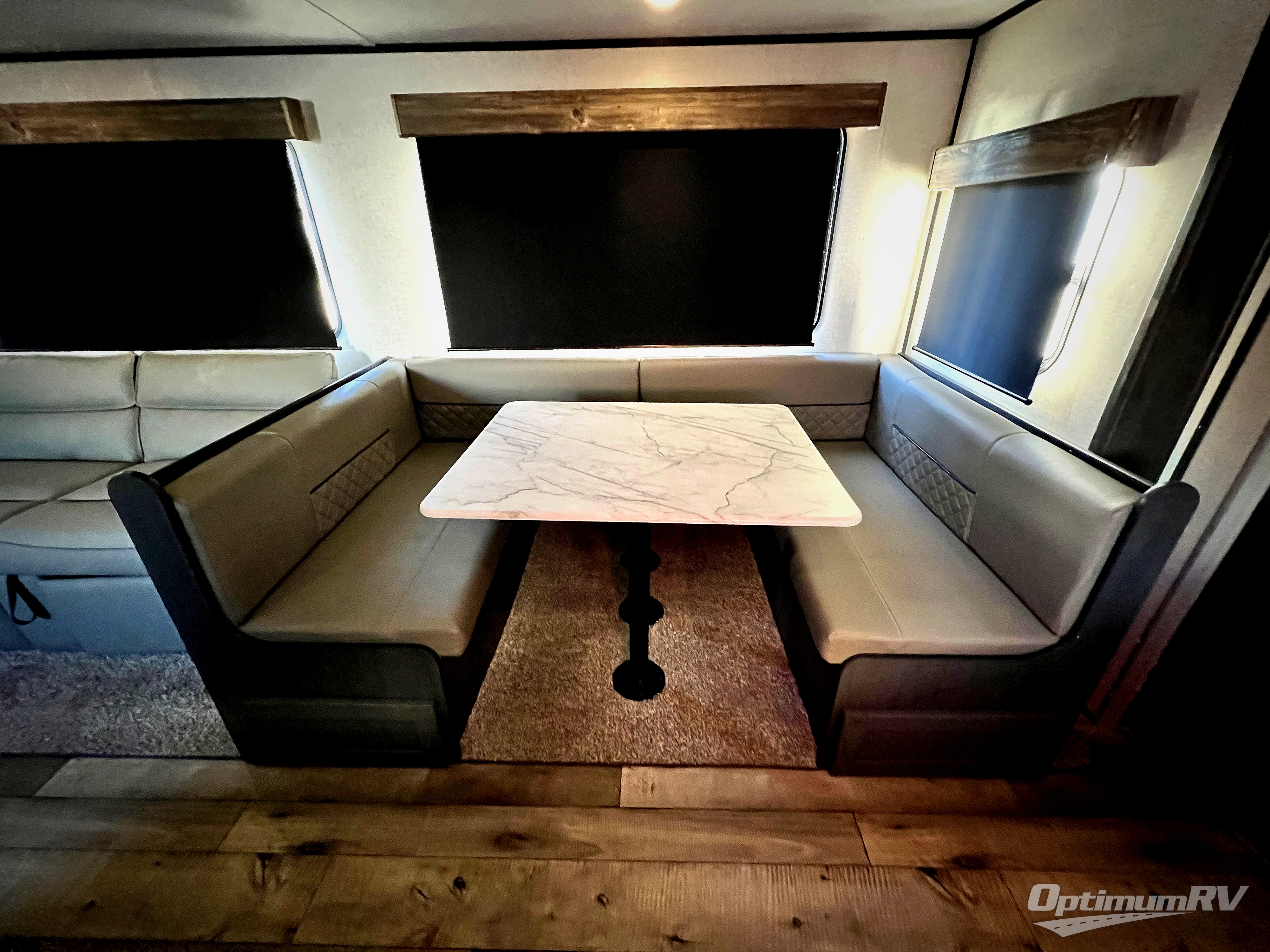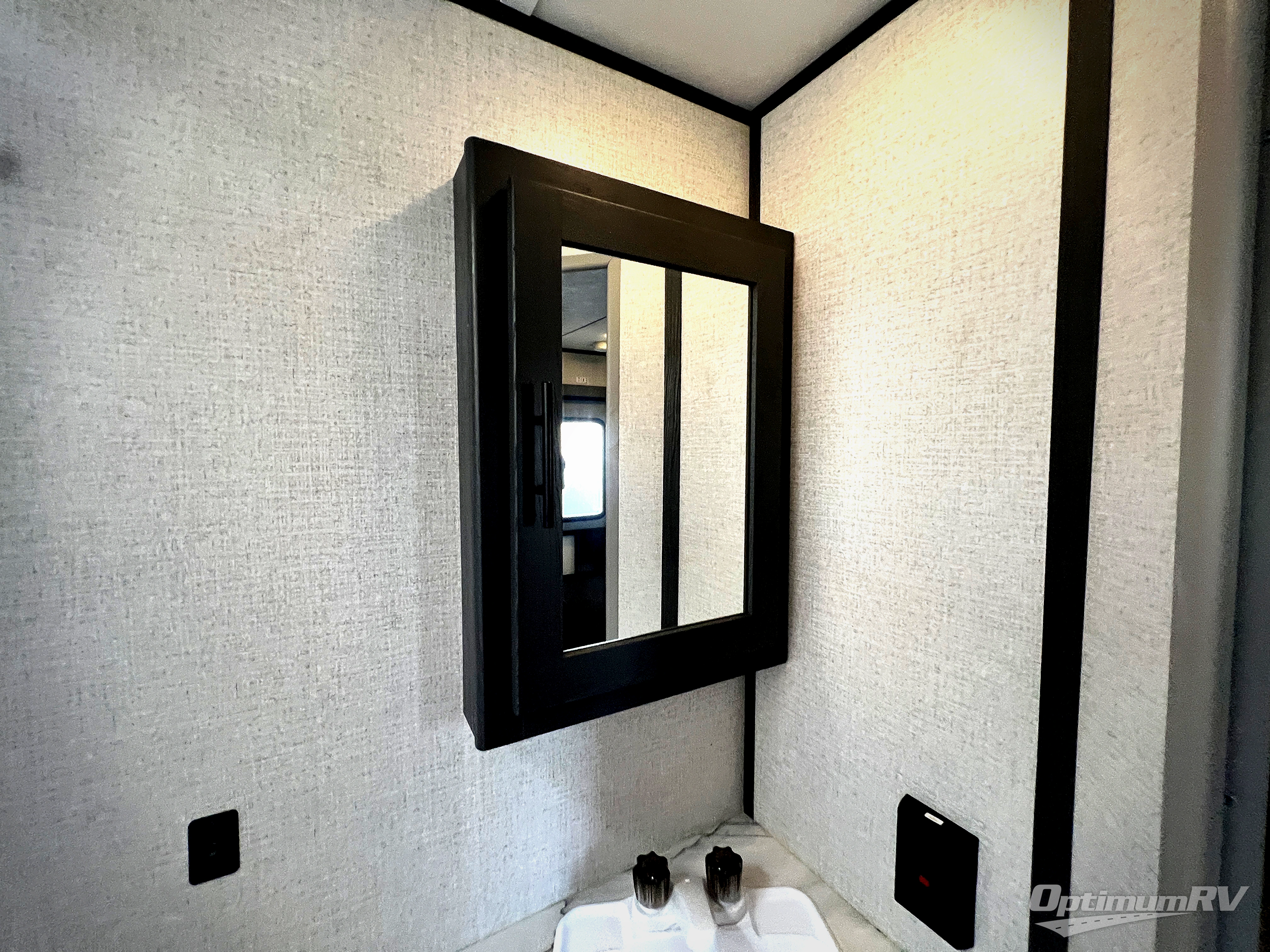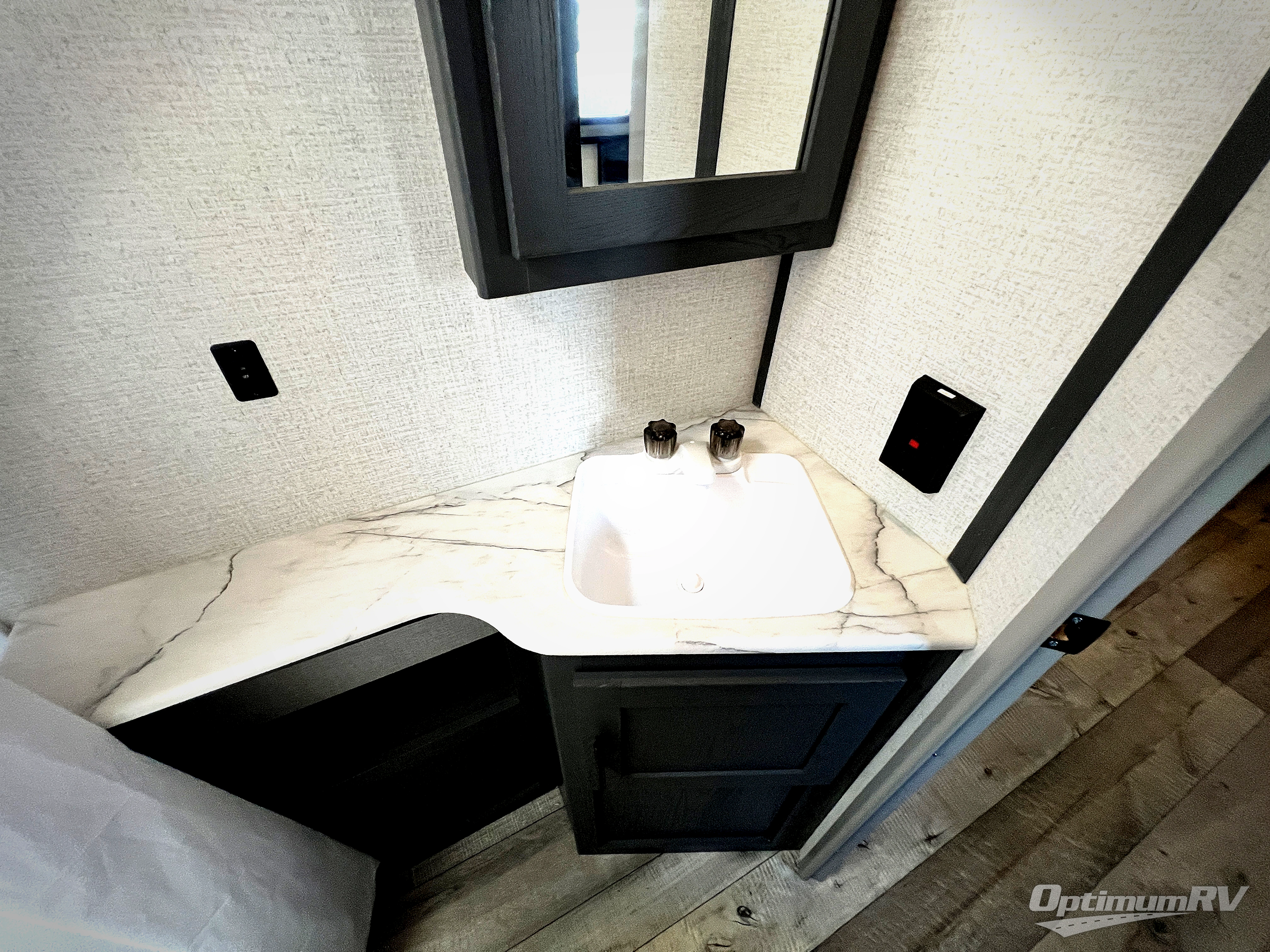 When you camp, you don't have to leave comforts of home behind when you have this travel trailer! You can sleep like a queen in the front master suite while your family and friends sleep on the U-shaped dinette and sofa, plus the double-size bunk beds next to the full bathroom. And there is plenty of bathroom space with a half bathroom included in the master suite, and a full bathroom. You'll have extra interior living space with a large slide, and this allows you to relax comfortably as you enjoy the fireplace and hinged entertainment center. There is even a pantry hidden behind the entertainment center too. Another great convenience that this trailer offers you is the set of two entry doors. One of the doors leads directly into the front bedroom which is super handy for the owners of this trailer.