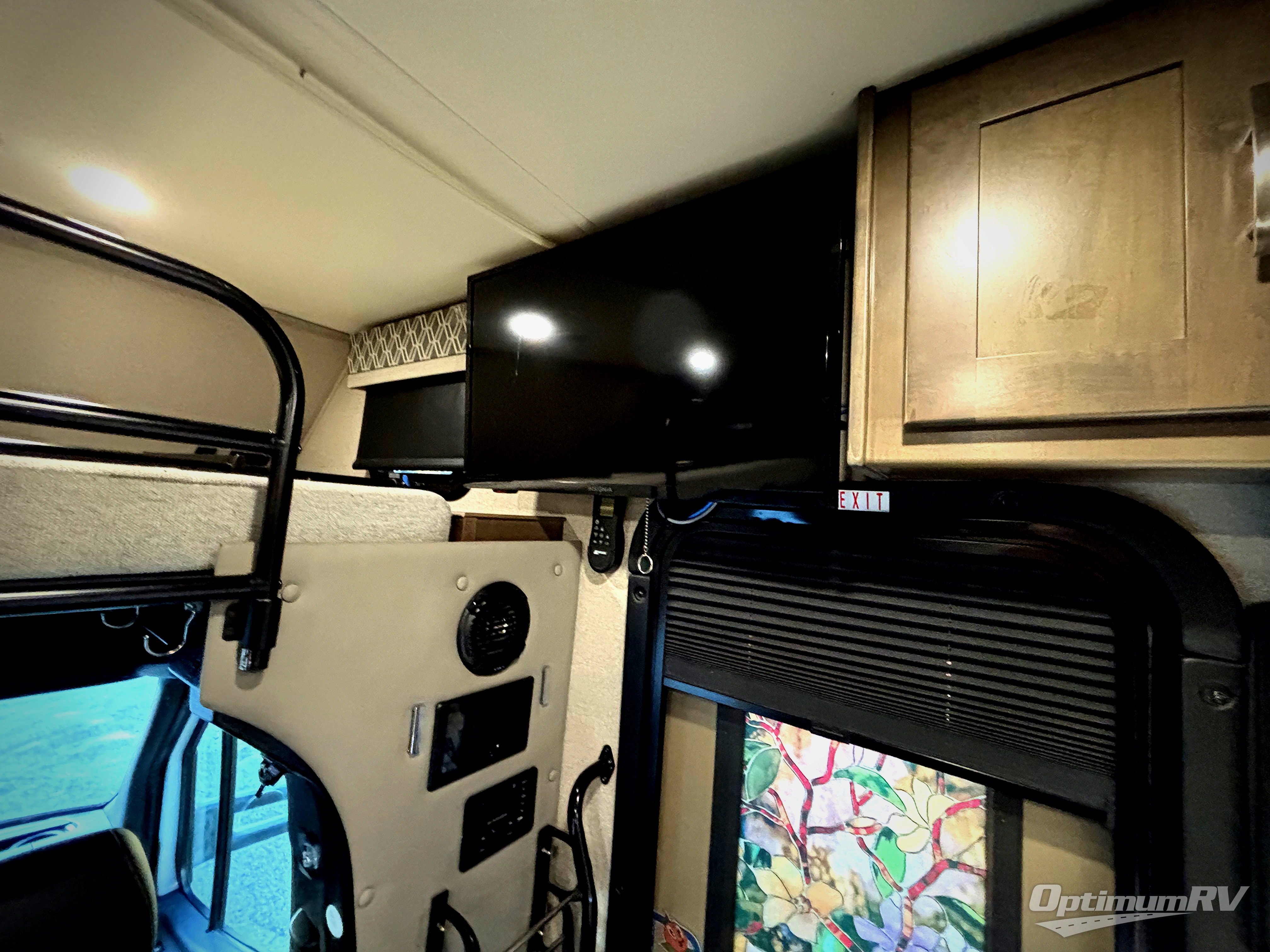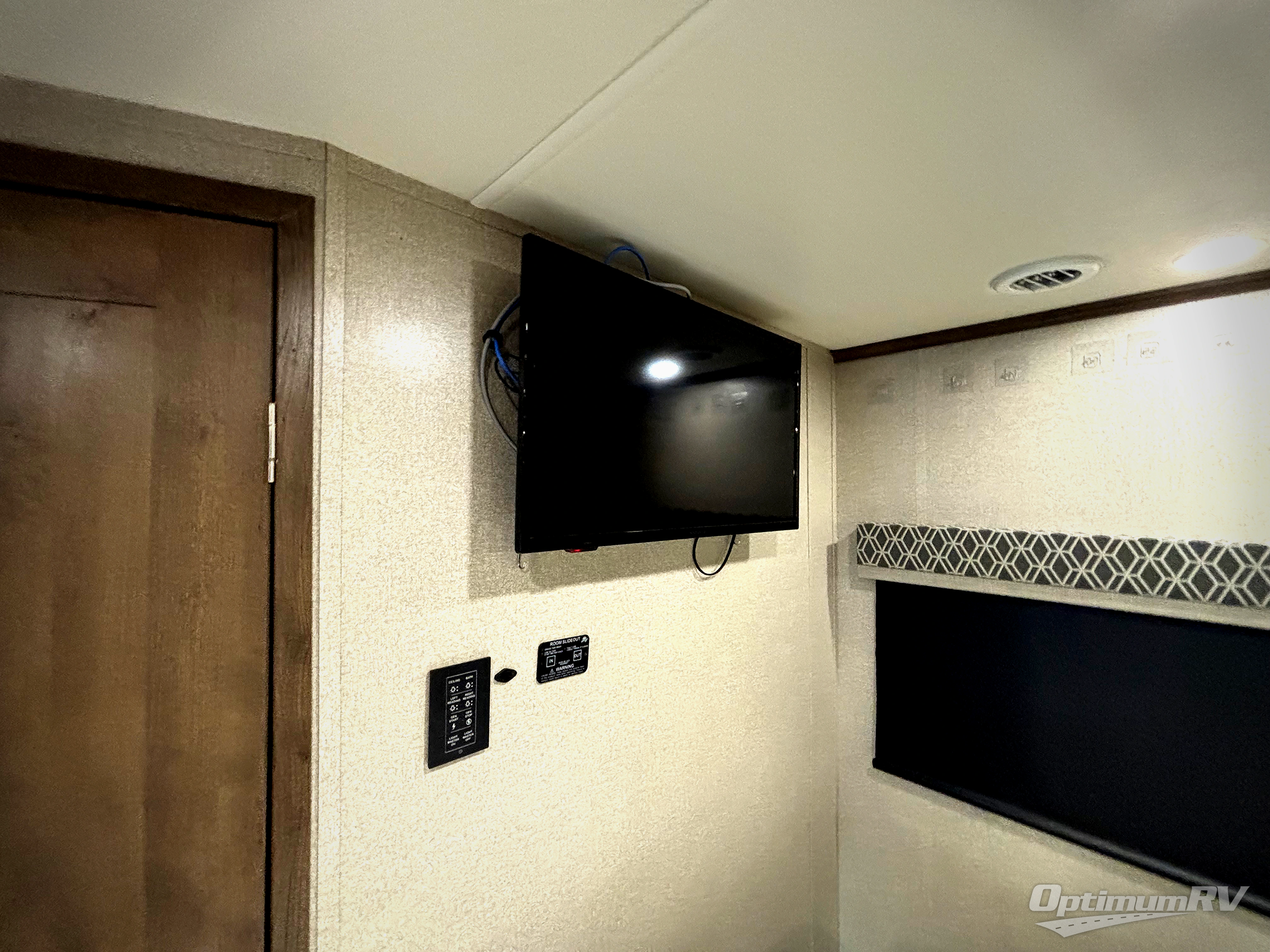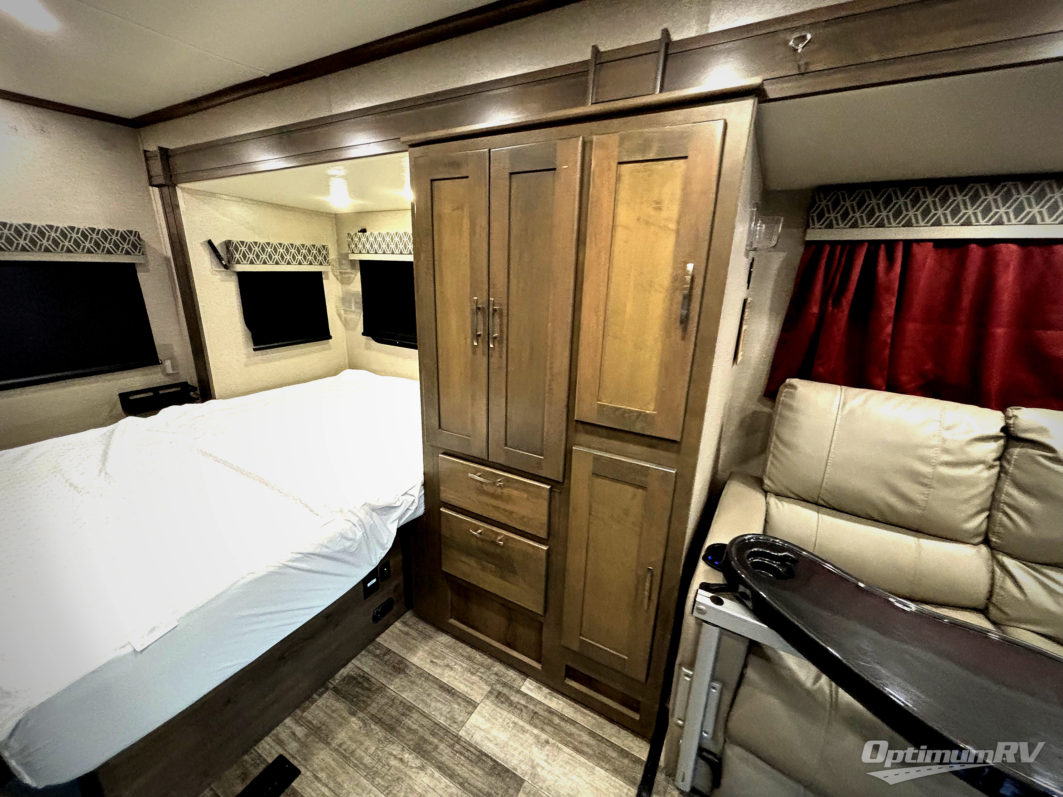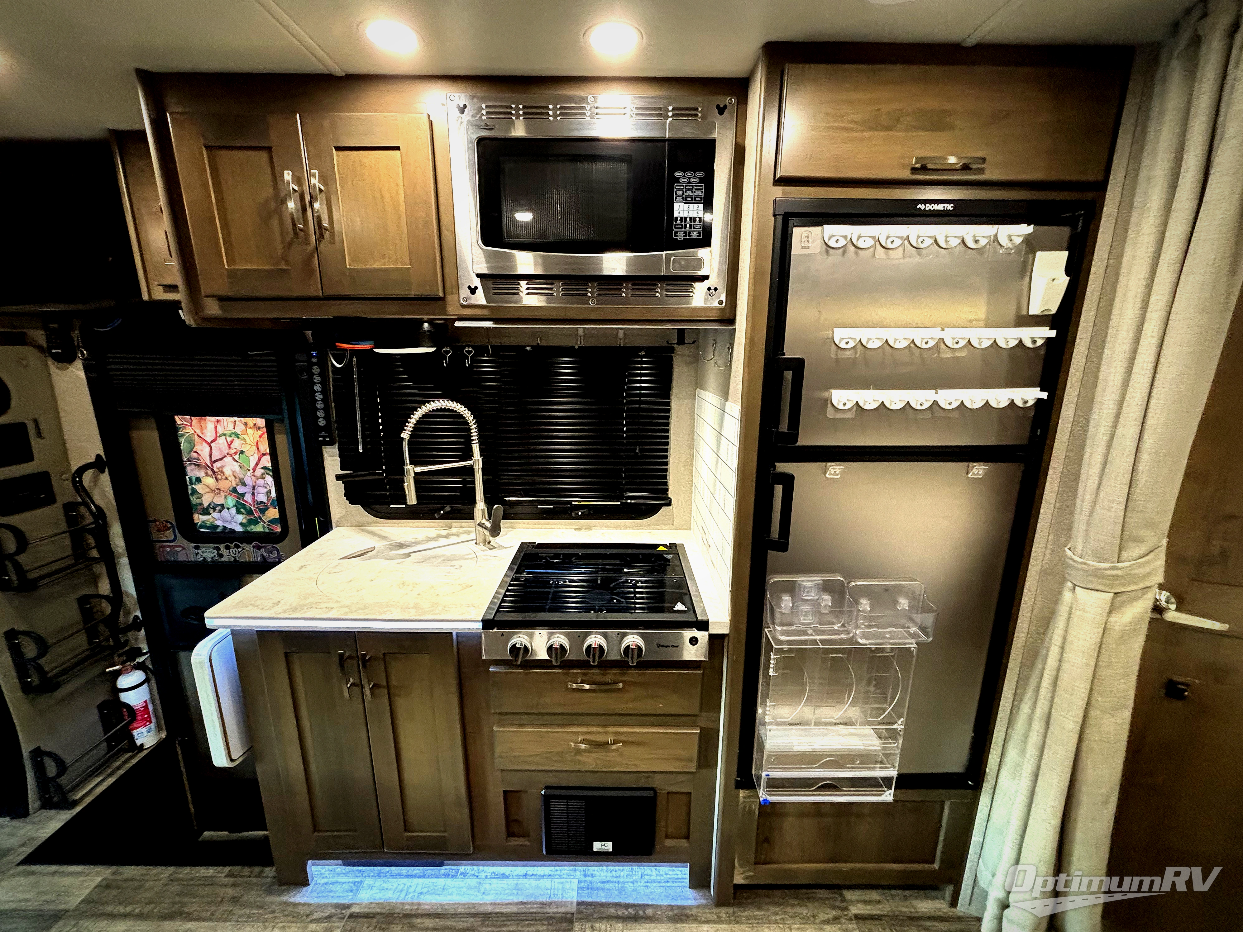 Take this motorhome on your greatest adventures yet! Start each morning feeling well rested after sleeping on the corner queen bed then head to the rear corner bathroom to freshen up in the shower with an Oxygenics body spa RV shower head and a skylight above for added headroom and natural lighting. Now that you're ready for the day, you can grab some eggs from the 6 cu. ft. double door refrigerator and fry them up on the three burner cooktop then enjoy them at the booth dinette. The kitchen also has a countertop extension for more meal prepping space and a convection microwave oven to pop a bag of popcorn before watching your favorite movies on either the living room 32" LED TV or the 32" LED smart TV across from the bed. You could even switch things up by replacing the booth dinette for either the optional tri-fold sofa with table or the optional three seat power recliner, and even add an optional cab over bunk too!
