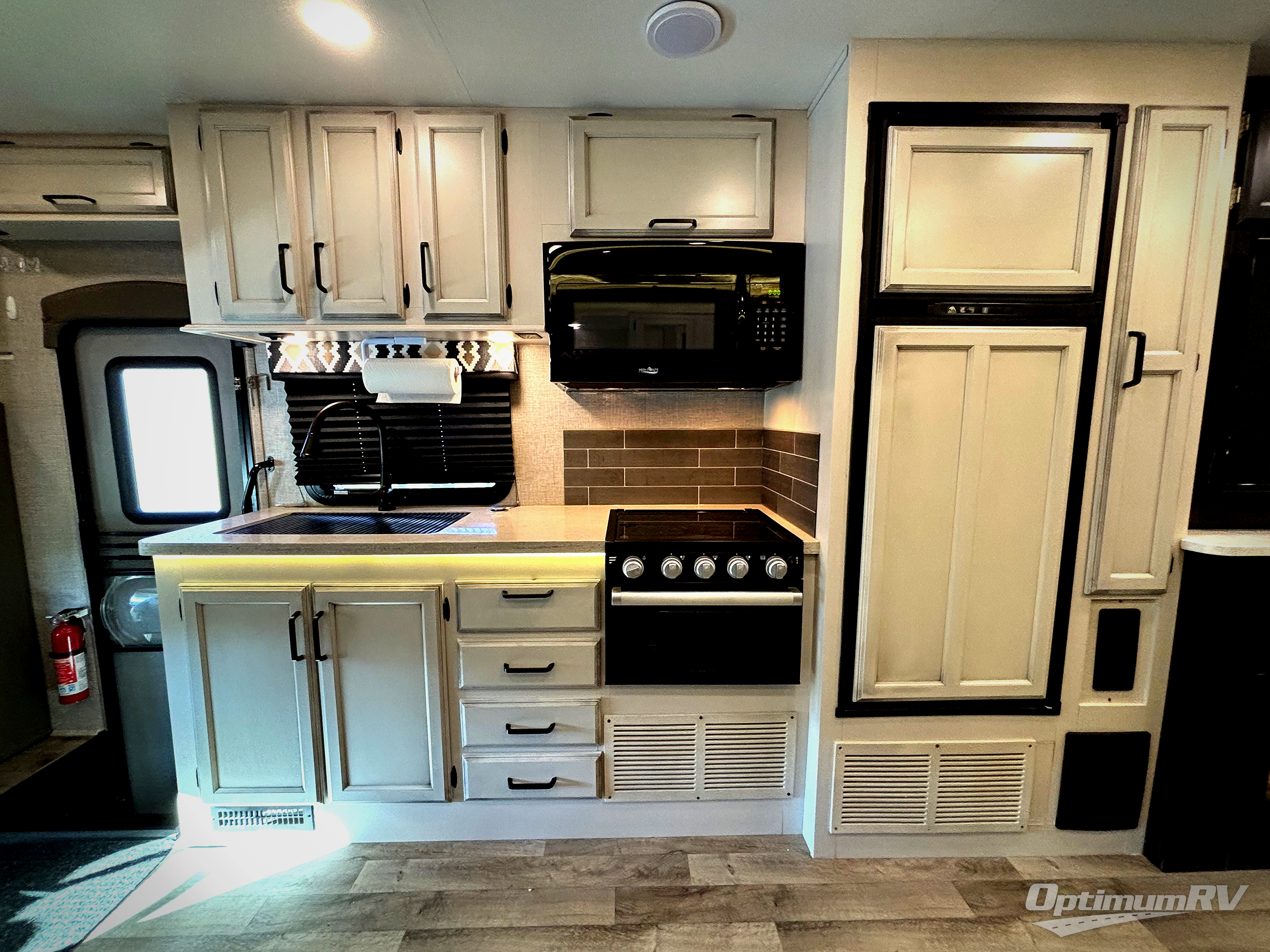With any Odyssey Class C gas motorhome by Entegra Coach, the driver will appreciate the power from the 350 HP engine, the towing capacity from the 7,500 lb. hitch, the Tire Pressure Monitoring system, the navigation from the Sony infotainment center with Apple CarPlay and Android Auto, plus the backup and side-view cameras when parking and driving down the highway. The kitchen offers full amenities including a recessed stainless steel sink with a cutting board sink cover, LED-lite pressed countertops, a decorative backsplash, and a pop-up charging station with 110 outlet and USB plugs to keep your smart phones charged. Get ready for luxury in a Class C, choose your favorite today!