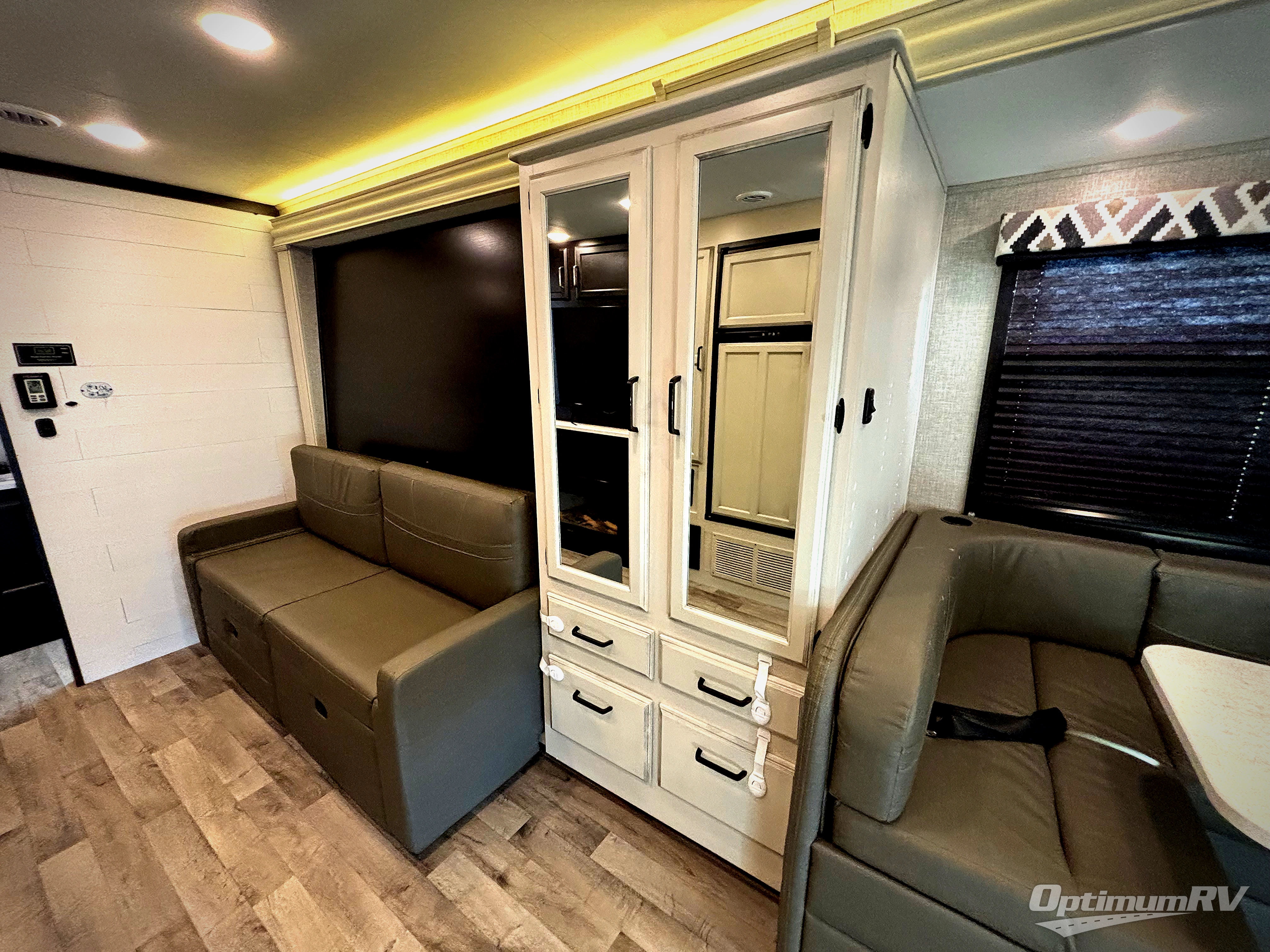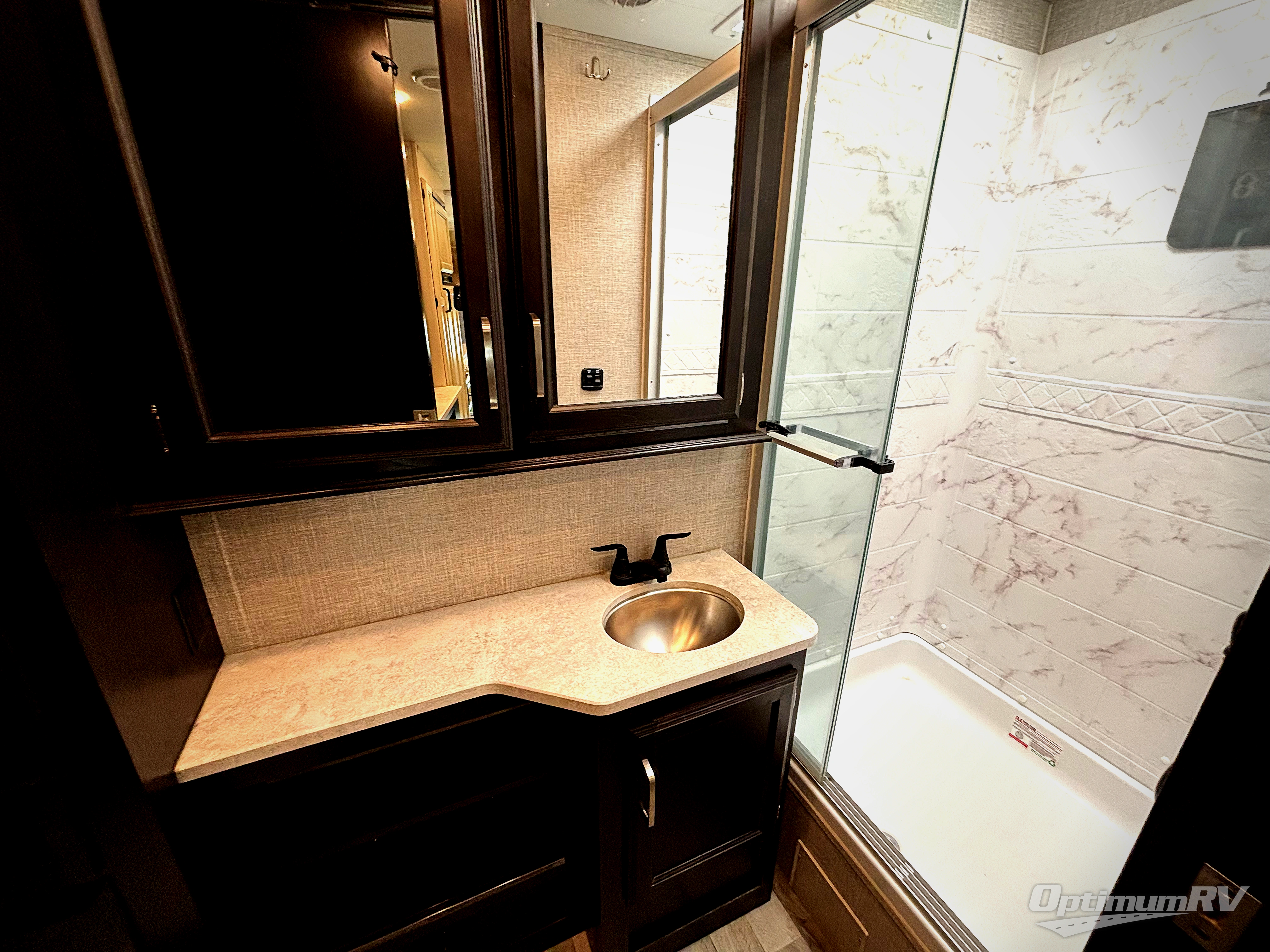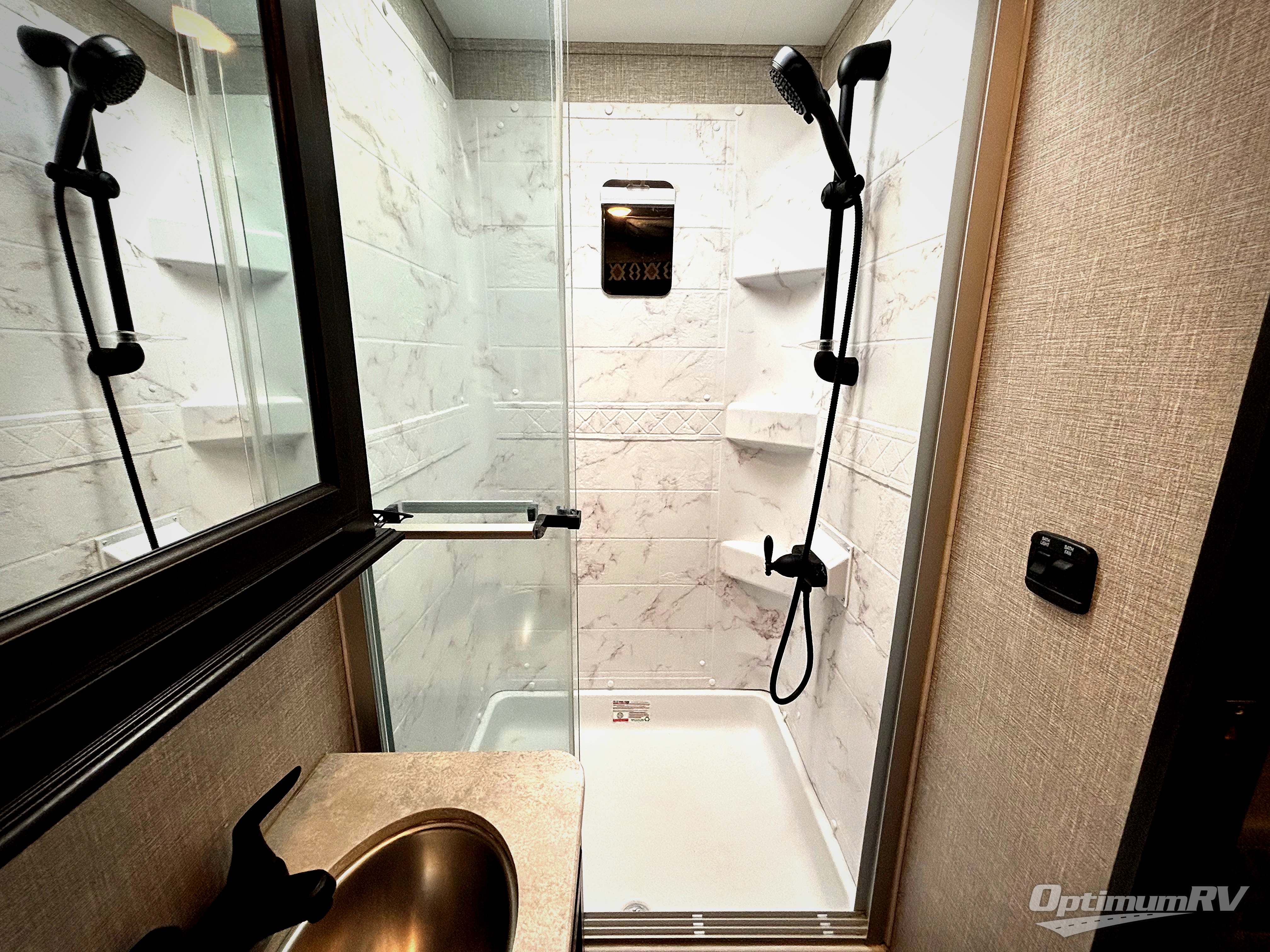 Enjoy a whole lot of comfort, fun and versatility in this coach from the queen Murphy bed and sofa combination allowing you to create a living area and a bedroom when you want, having a fireplace and an LED HD Smart Fire TV to watch inside, to the outside kitchen, exterior TV and 19' electric awning providing you an outdoor living space to enjoy nature and its beauty. The inside also provides a rear full bathroom including a space saving sliding door, linen storage, counter space for toiletries and a shower. You can dine at the U-shaped dinette or while sitting on the swivel captains chairs, and the cab-over bunk will be a perfect place for two to stay the night.
