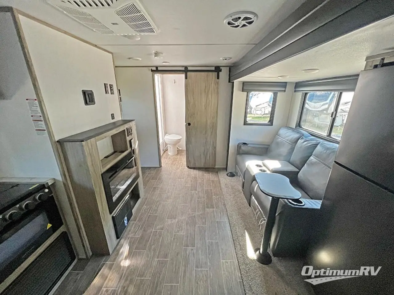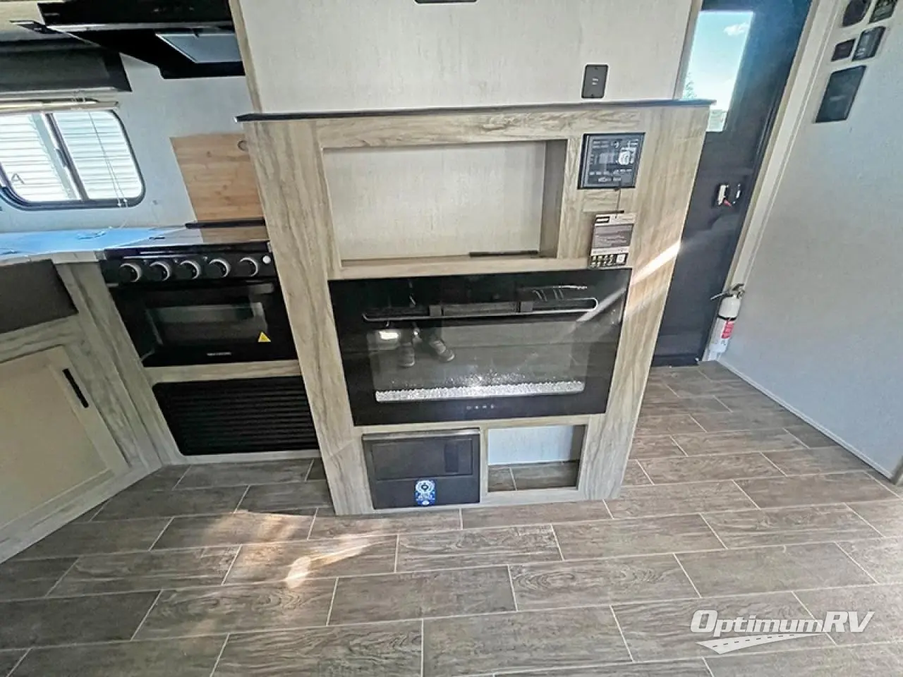 Looking for the perfect trailer for two with a spacious bathroom and bedroom? This Alpha Wolf provides a rear oversized bathroom complete with linen storage and a barn-style door that saves space and looks great. The front bedroom includes a walk-around queen bed, dual shirt closets and nightstands, a farm-style door plus windows for natural lighting and great views. The main living and kitchen area is spacious as well with a slide out that includes home theatre seating with removable dinner trays and cupholders plus heat, light and massage function, a residential refrigerator for lots of cold storage and a pantry for your snacks and such. Everyone will love the fireplace and cozy ambiance. The cook will appreciate the extra floor space provided by the slide when using all of the kitchen amenities including a farm-style sink, walk-in pantry, and butcher block style cutting board.