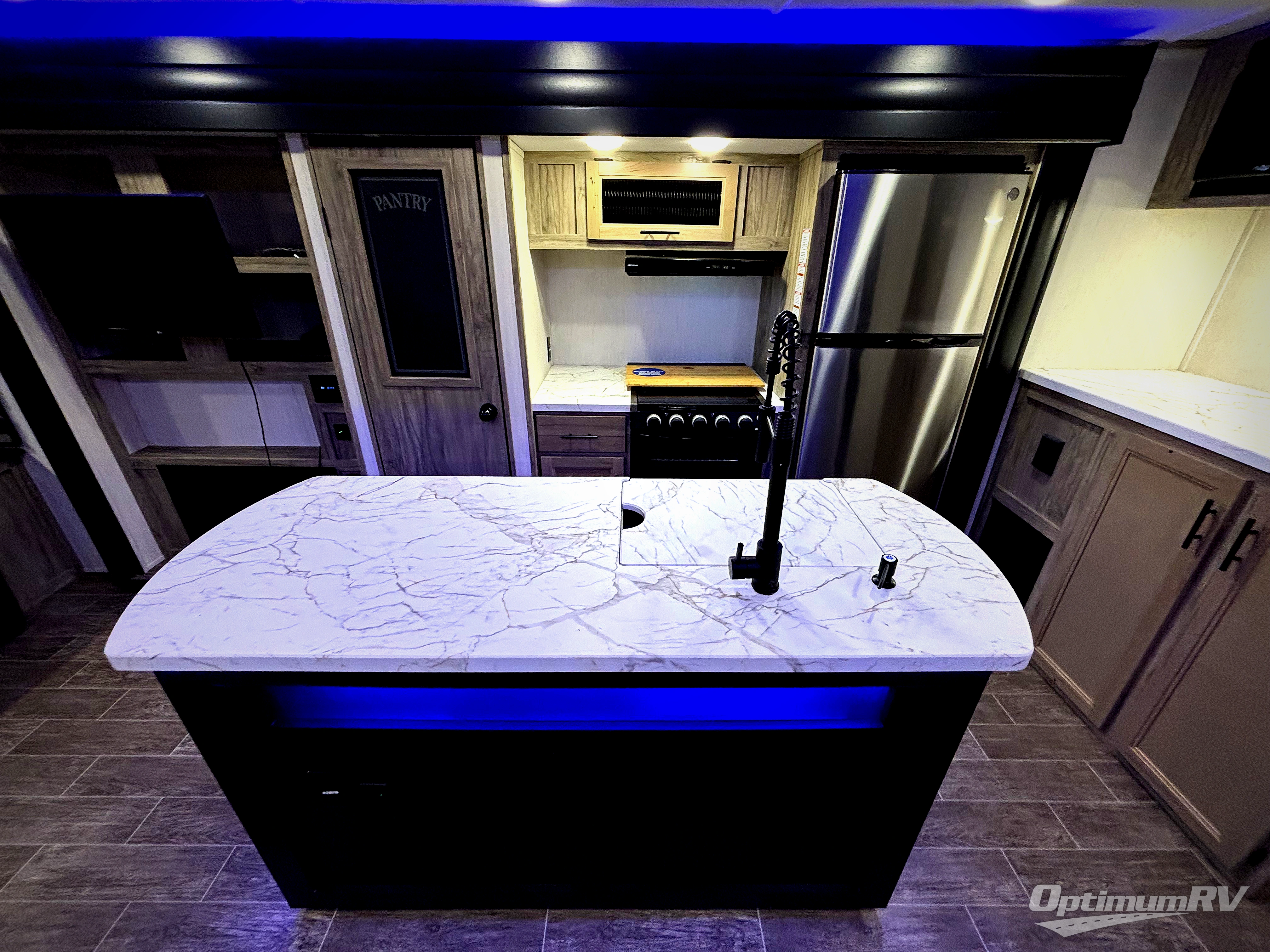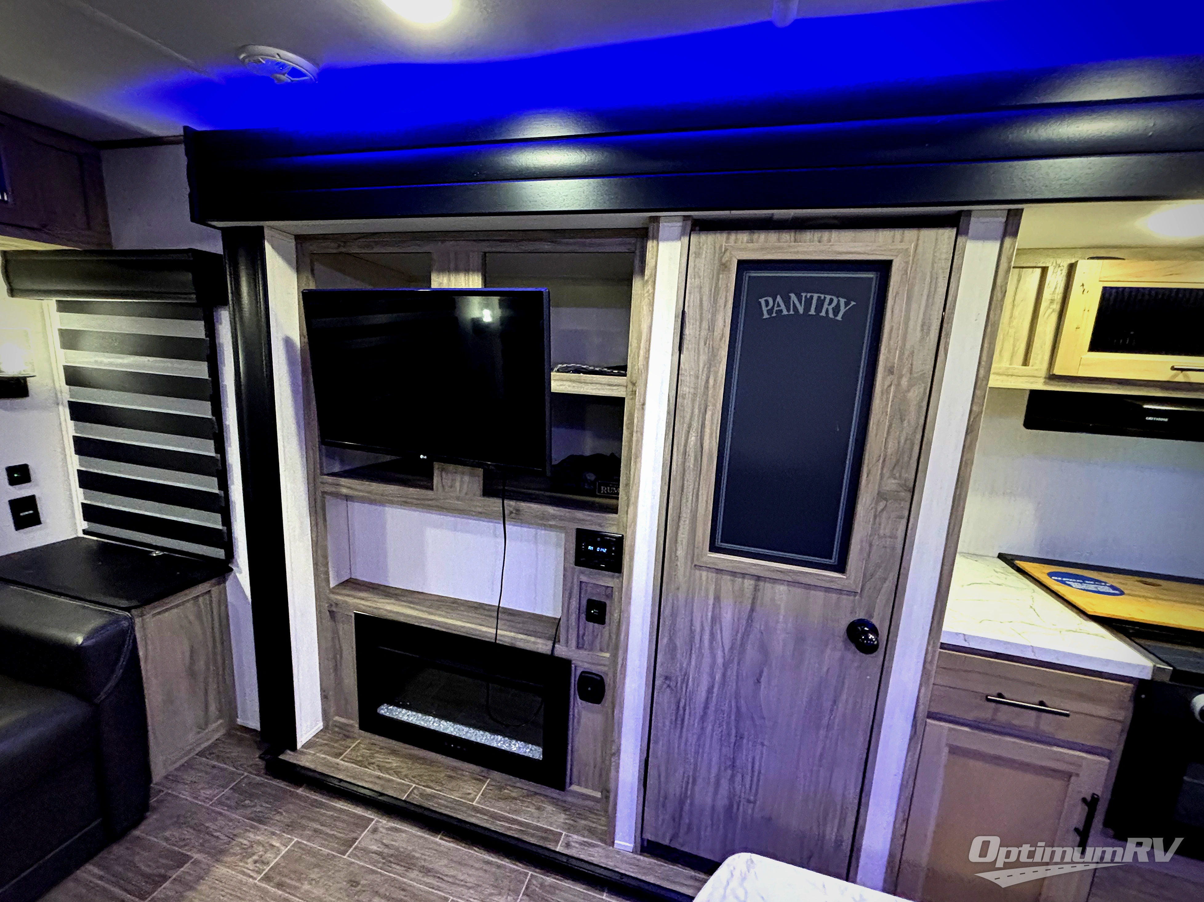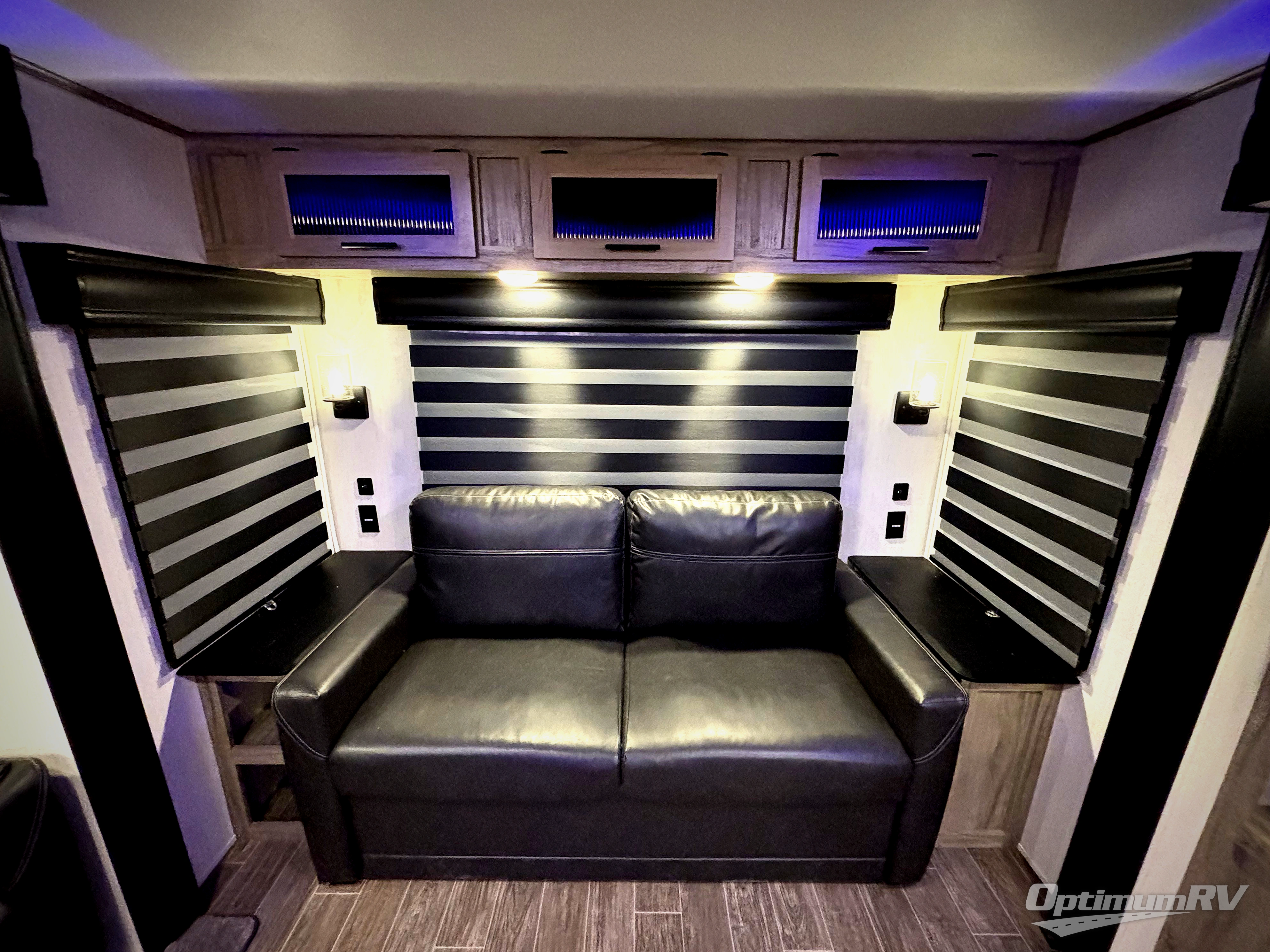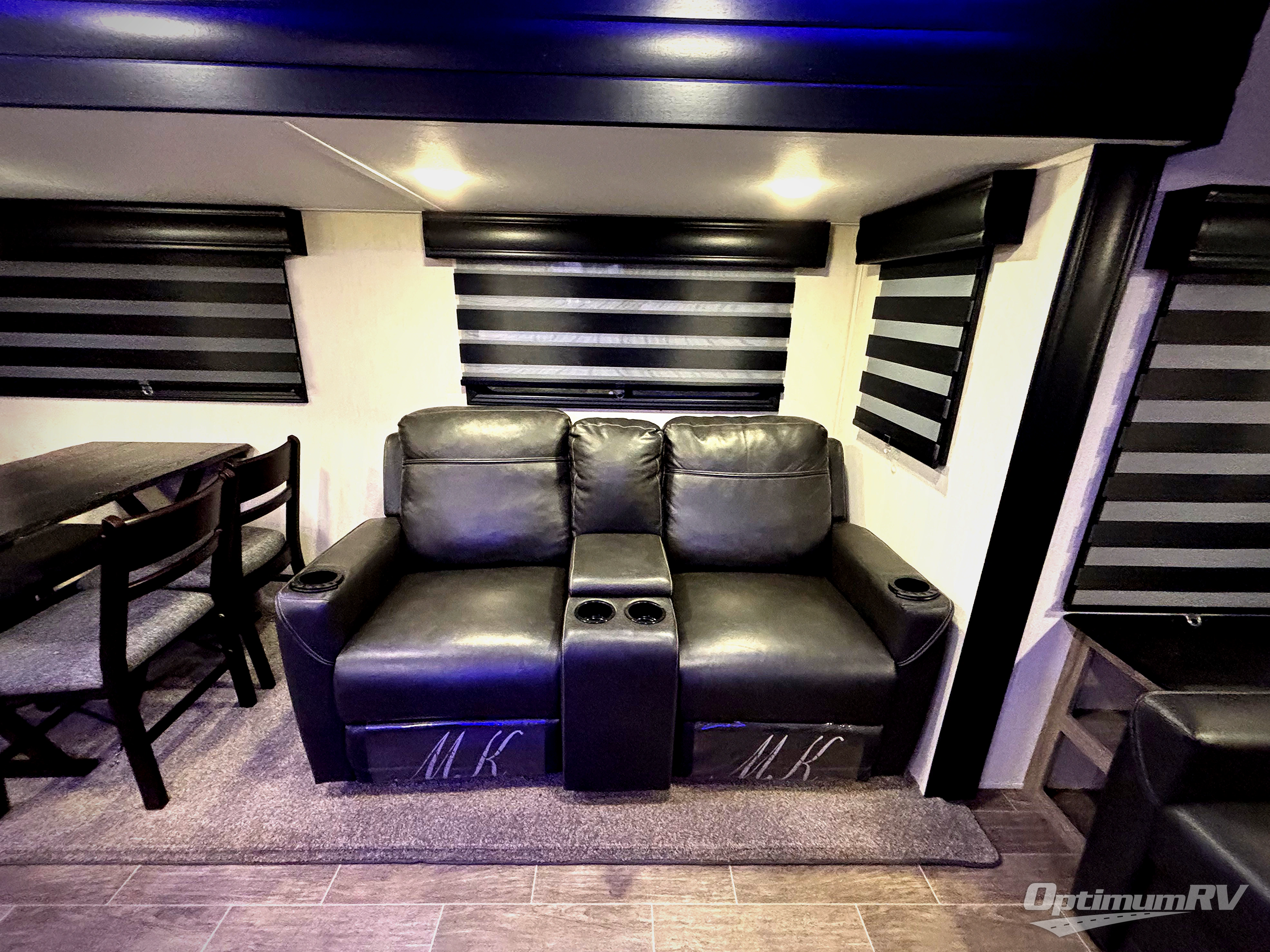 This trailer has it all for maximum comfort and convenience as well as entertainment! The rear living area includes a deluxe tri-fold hide-a-bed sofa with a panoramic rear window for great views of your campsite, and dual opposing slides widen this area so you can visit with friends while sitting on the home theatre seats with heat, light, and massage function with cupholders, and/or the free-standing table with two fixed and two folding chairs. Enjoy the fireplace on a cool night or when you want a little ambiance while seated inside. In the kitchen, the island will be handy for food prep and serving, and the unique coffee bar will be a favorite as well. Two patio awnings will provide an outdoor living area, just grab your camping chairs from the full pass-through storage. When you call it a night, fall quickly to sleep on the queen bed in the front bedroom with easy access to a dual entry bathroom which offers a radius shower with opaque glass doors.