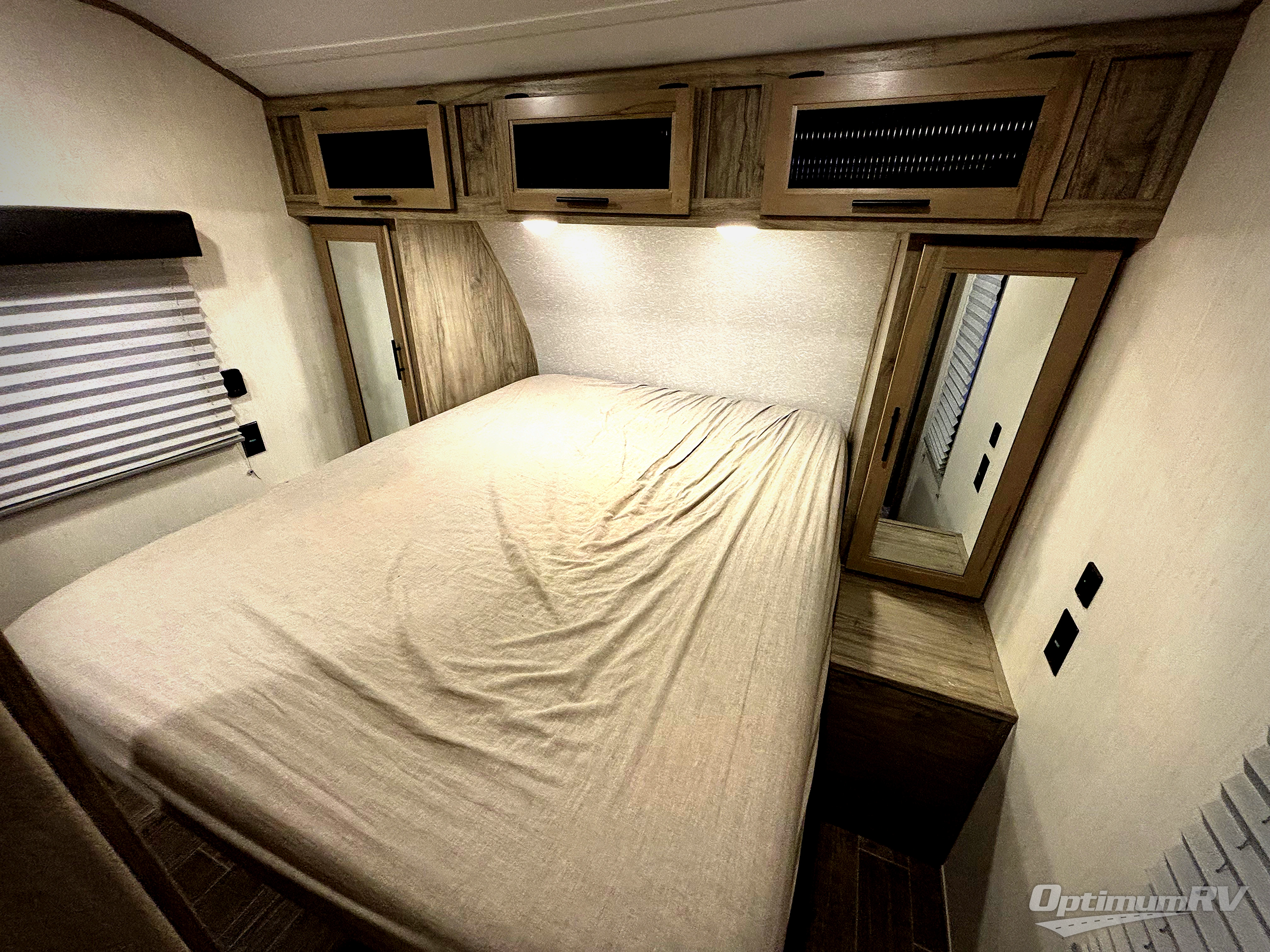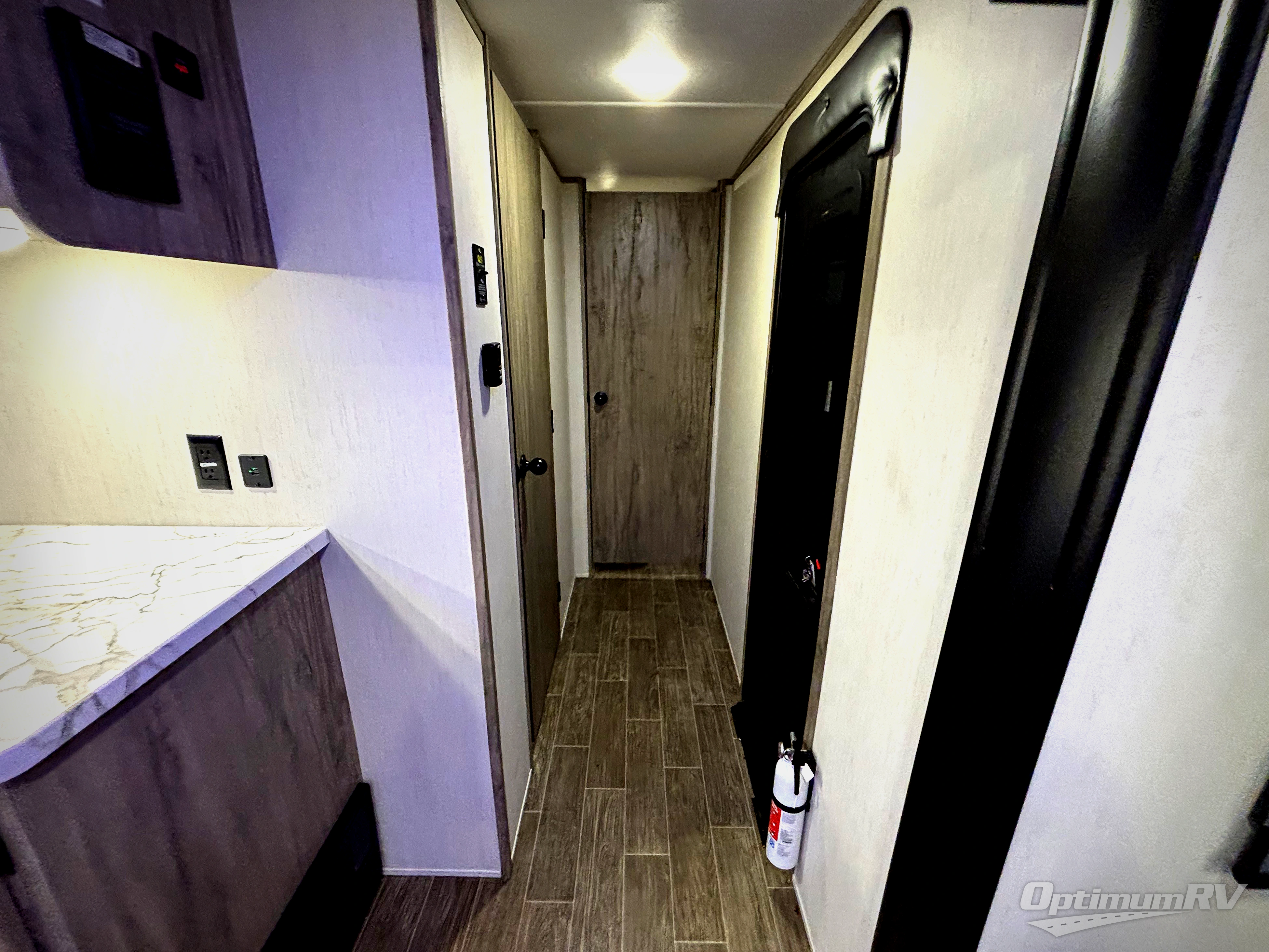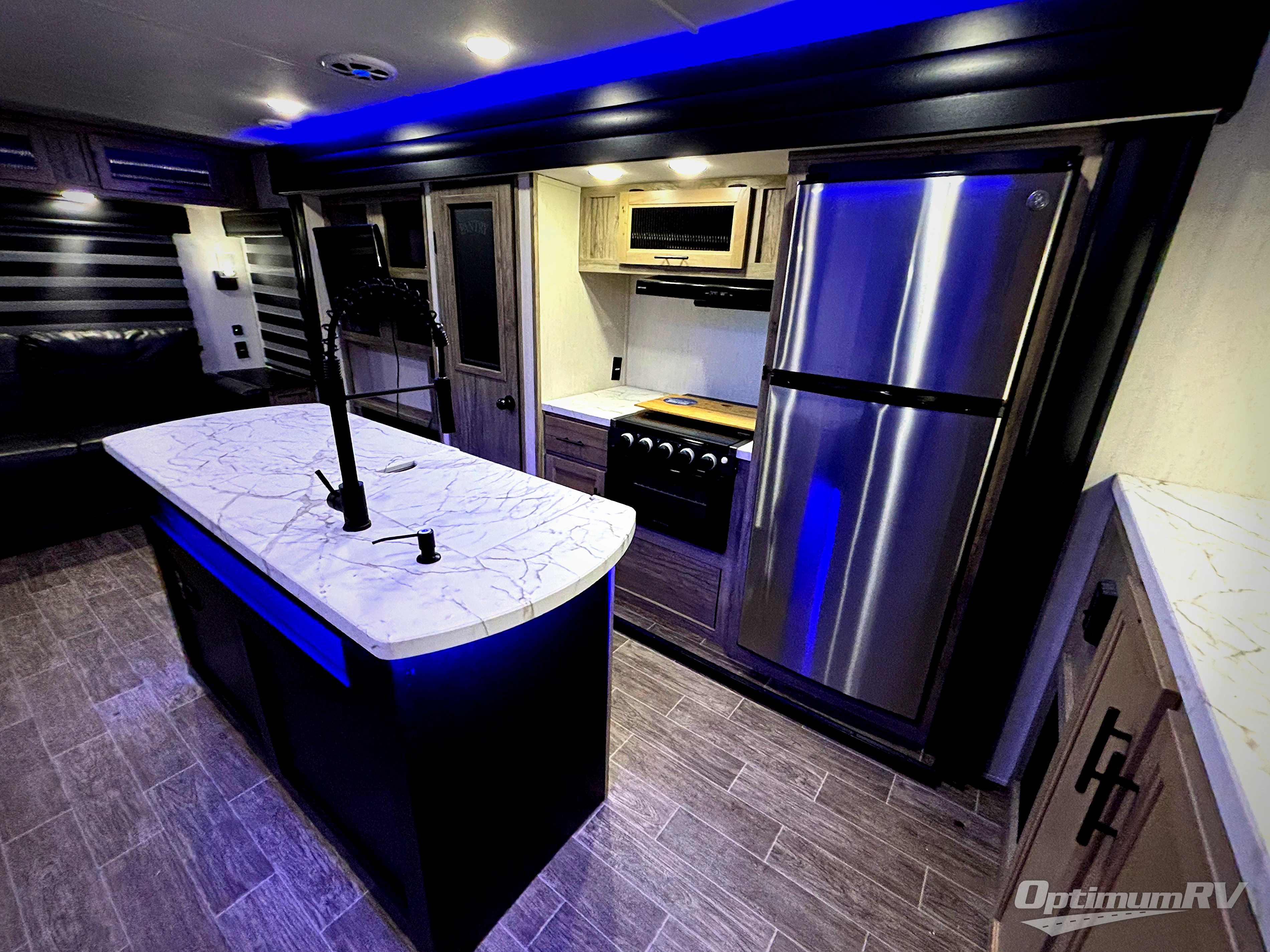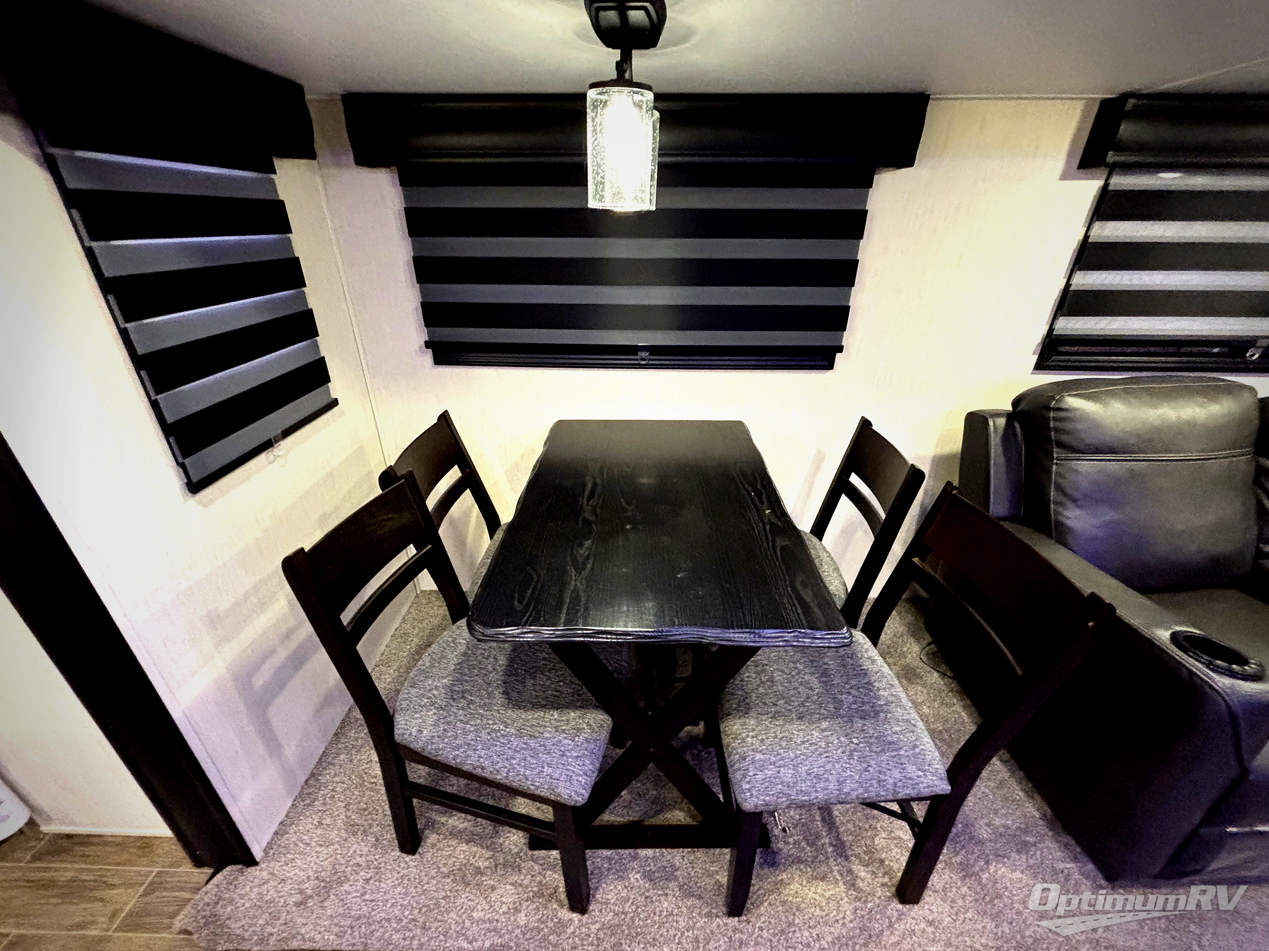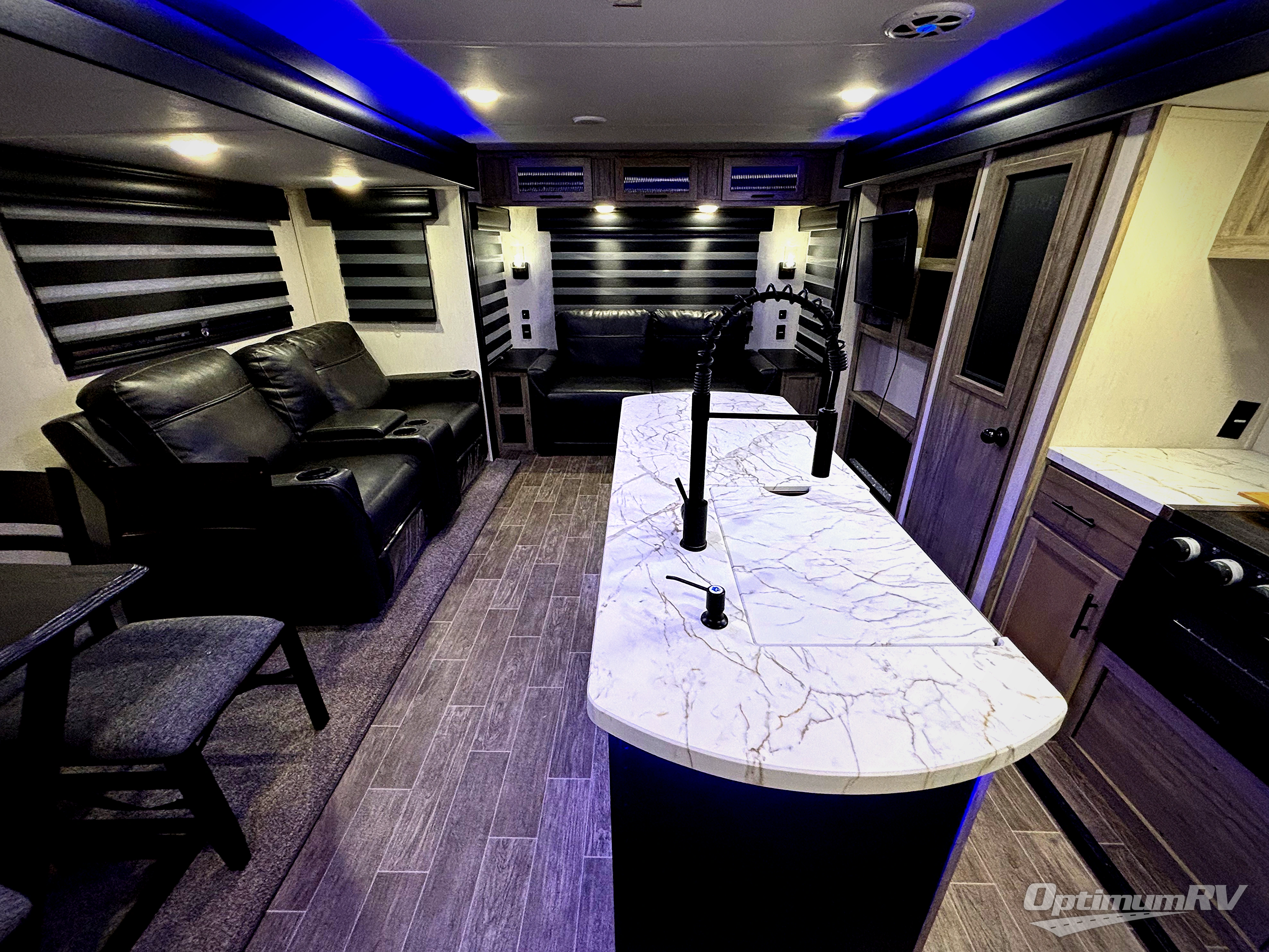 This trailer has it all for maximum comfort and convenience as well as entertainment! The rear living area includes a deluxe tri-fold hide-a-bed sofa with a panoramic rear window for great views of your campsite, and dual opposing slides widen this area so you can visit with friends while sitting on the home theatre seats with heat, light, and massage function with cupholders, and/or the free-standing table with two fixed and two folding chairs. Enjoy the fireplace on a cool night or when you want a little ambiance while seated inside. In the kitchen, the island will be handy for food prep and serving, and the unique coffee bar will be a favorite as well. Two patio awnings will provide an outdoor living area, just grab your camping chairs from the full pass-through storage. When you call it a night, fall quickly to sleep on the queen bed in the front bedroom with easy access to a dual entry bathroom which offers a radius shower with opaque glass doors.