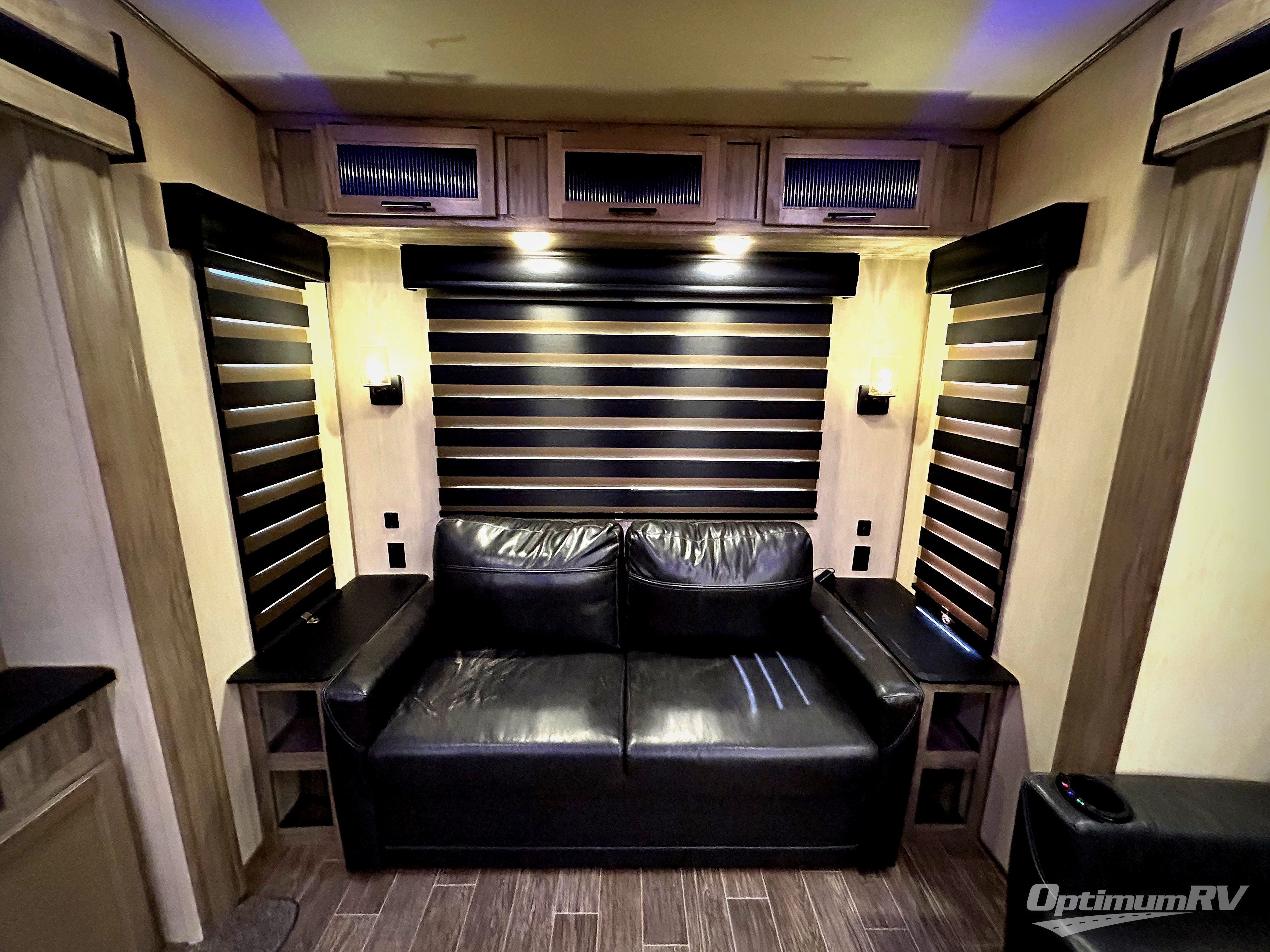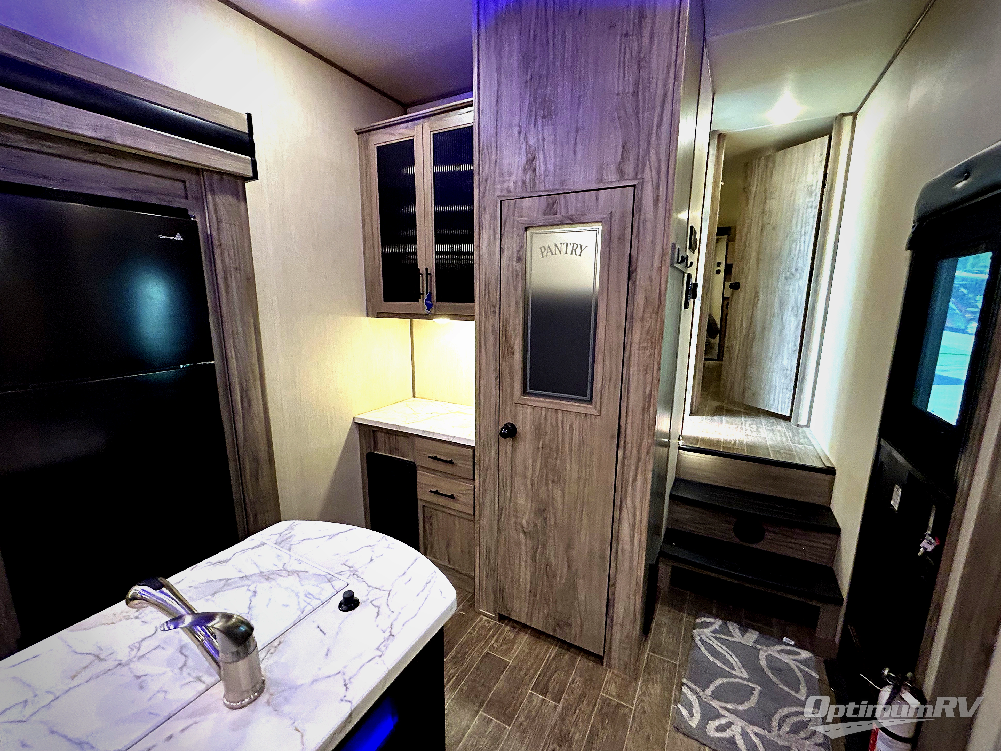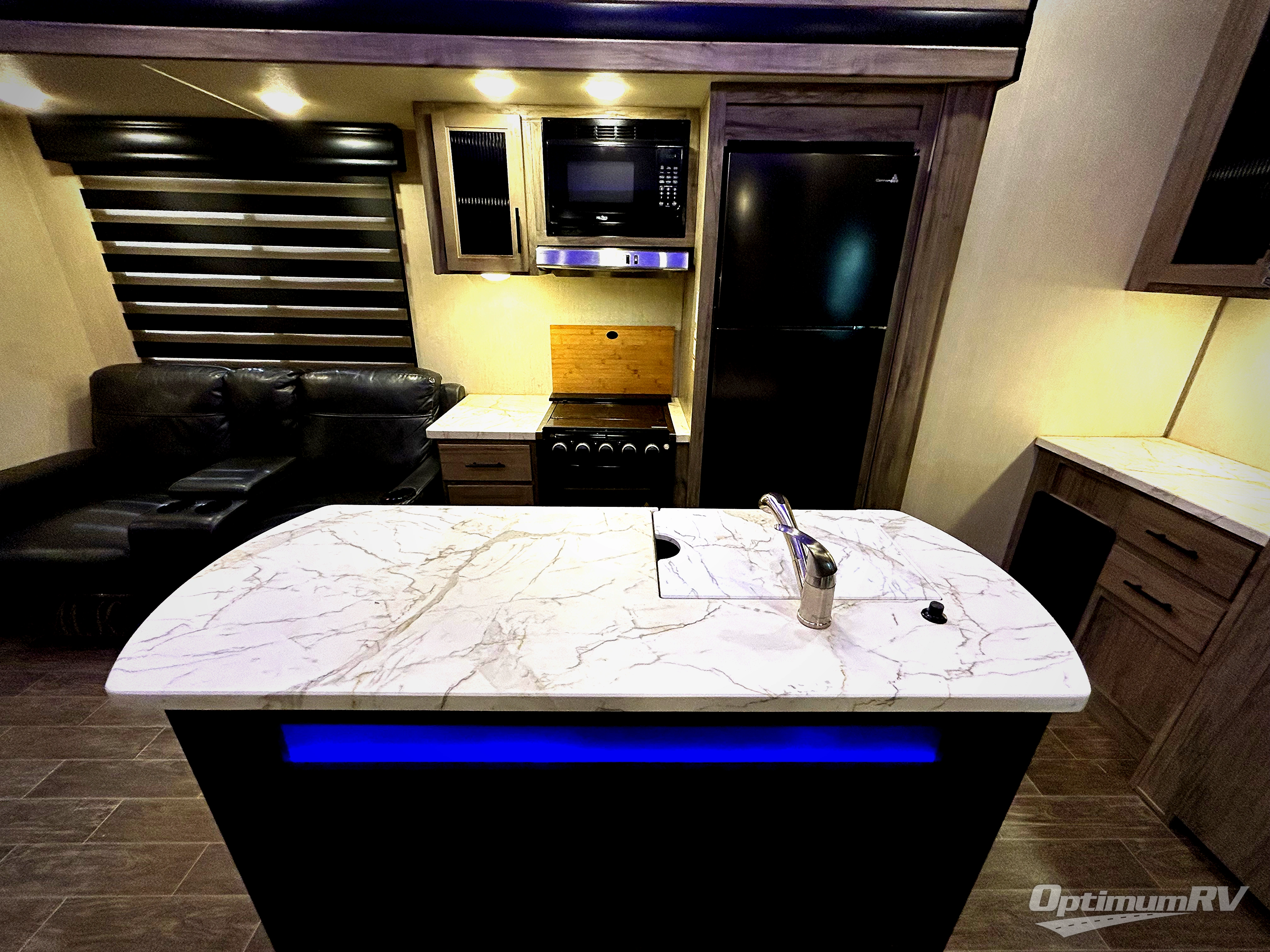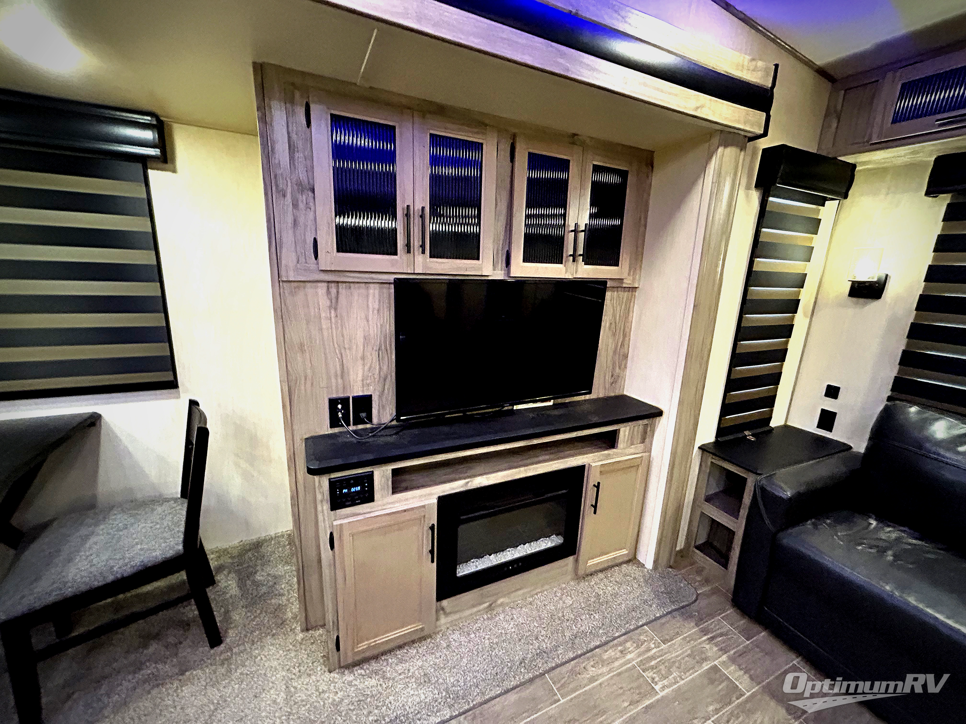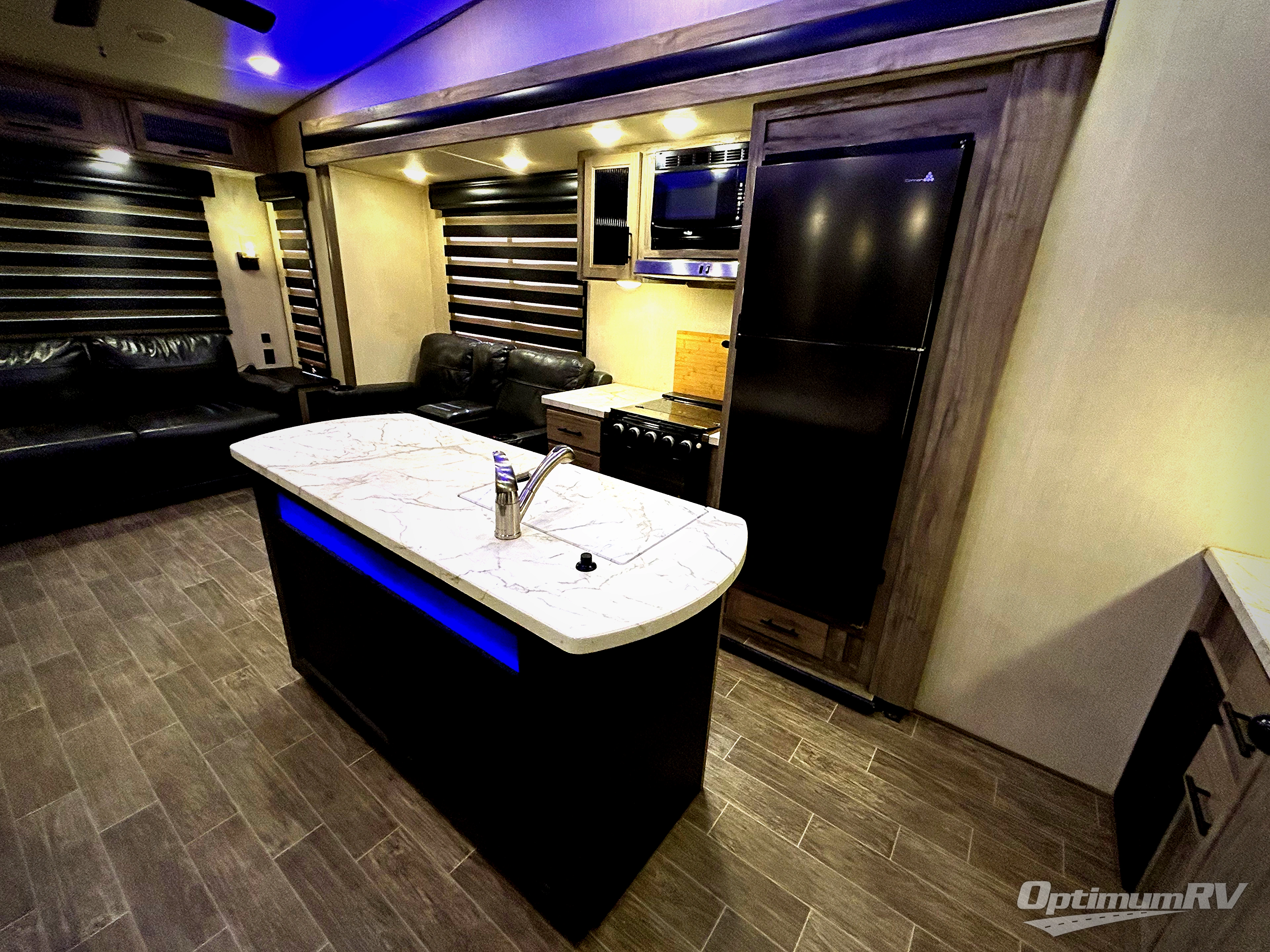 This Cherokee Arctic Wolf Suite fifth wheel is quite extraordinary and accommodating! It has a set of opposing slides in the main living area so that you can have more space to sit back on the theater seating and tri-fold sofa. You can switch on the fireplace to add some warmth to this space if it's a cool night, or if it is a hot afternoon, simply switch on the ceiling fan. The table with two fixed/two foldable chairs is going to be great for sitting down to eat a meal together, and after dinner, you can prepare coffee for everyone at the coffee bar. You'll also be able to grab dessert from the walk-in pantry to go with your coffee. The Juice Pack 50W solar panel will help your unit stay powered when you can't connect at a campsite, and the private bedroom up front is going to provide great relaxation with its king bed slide.