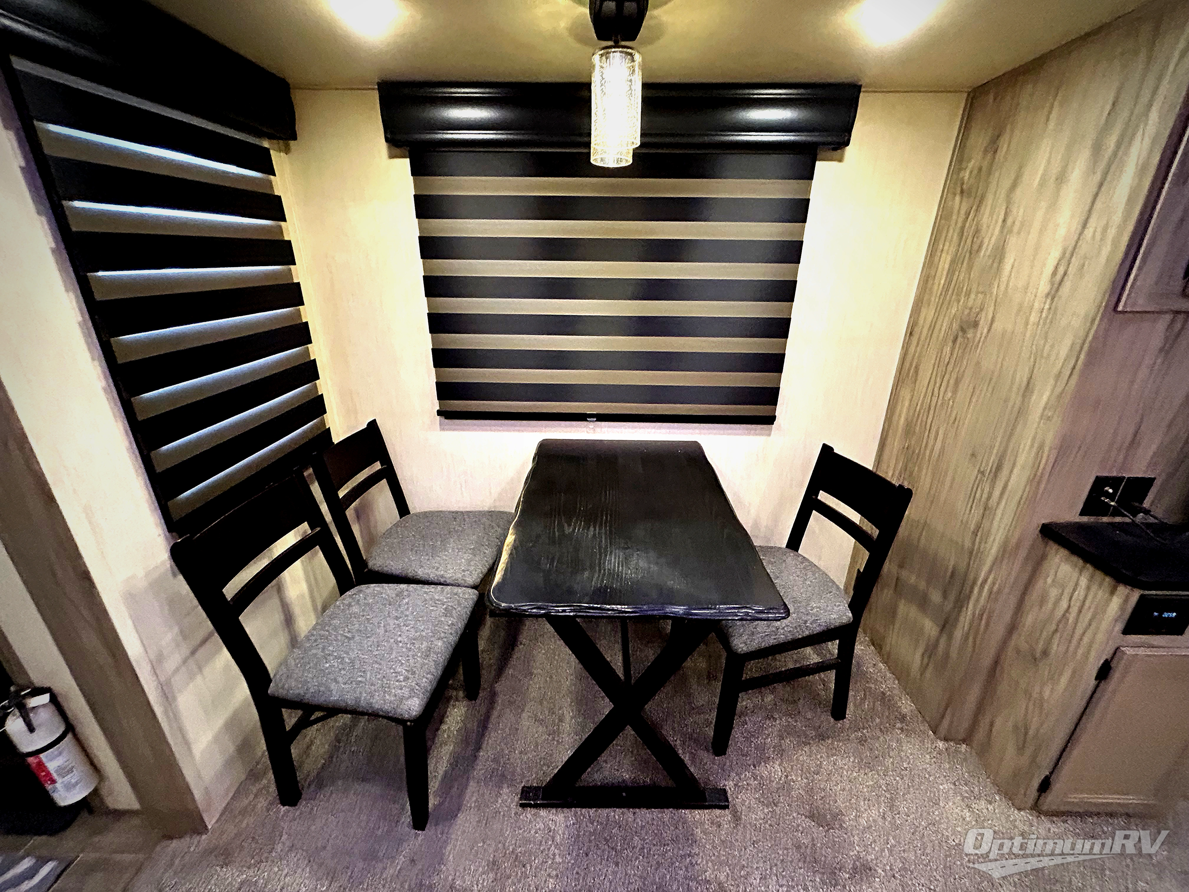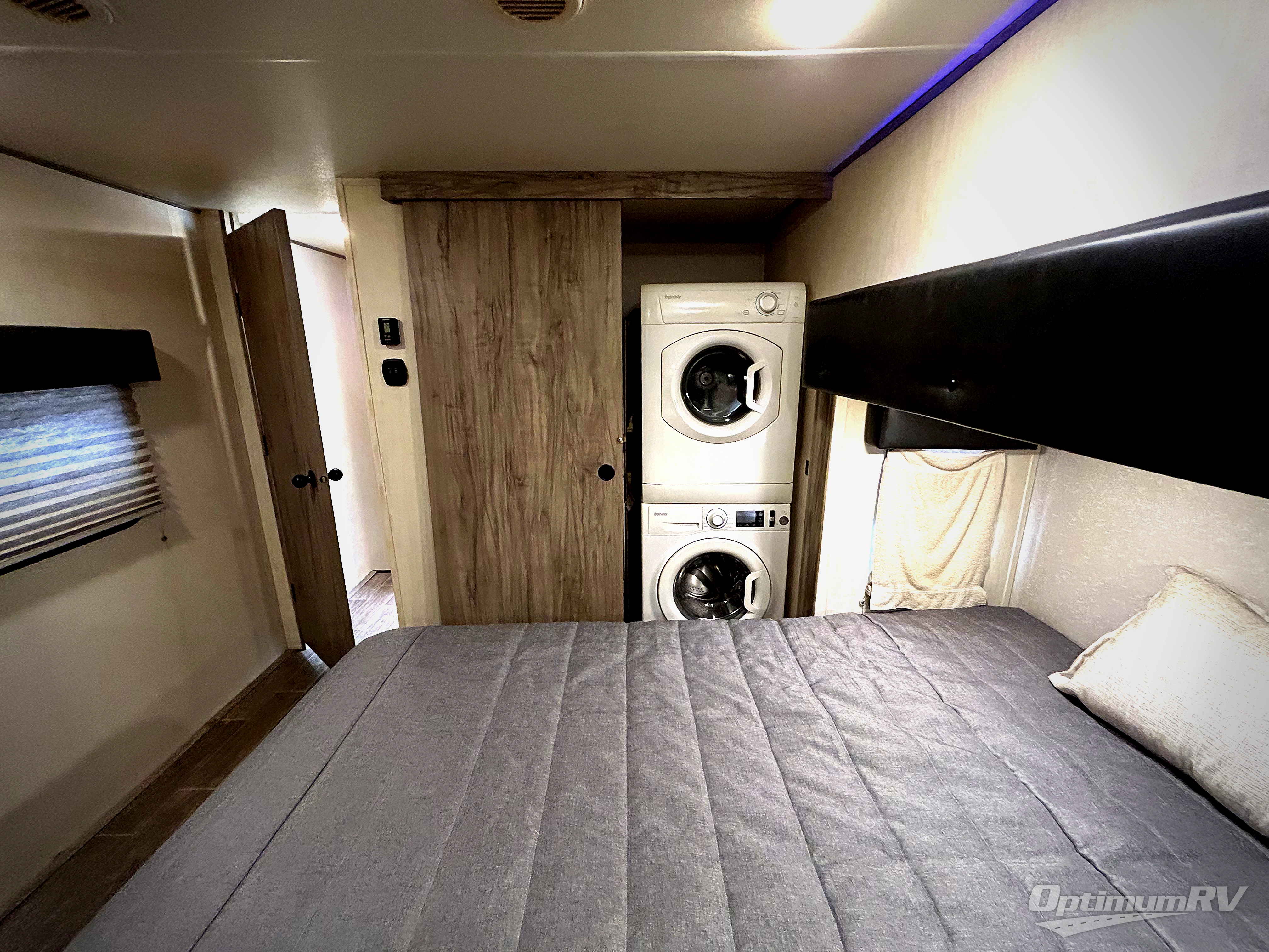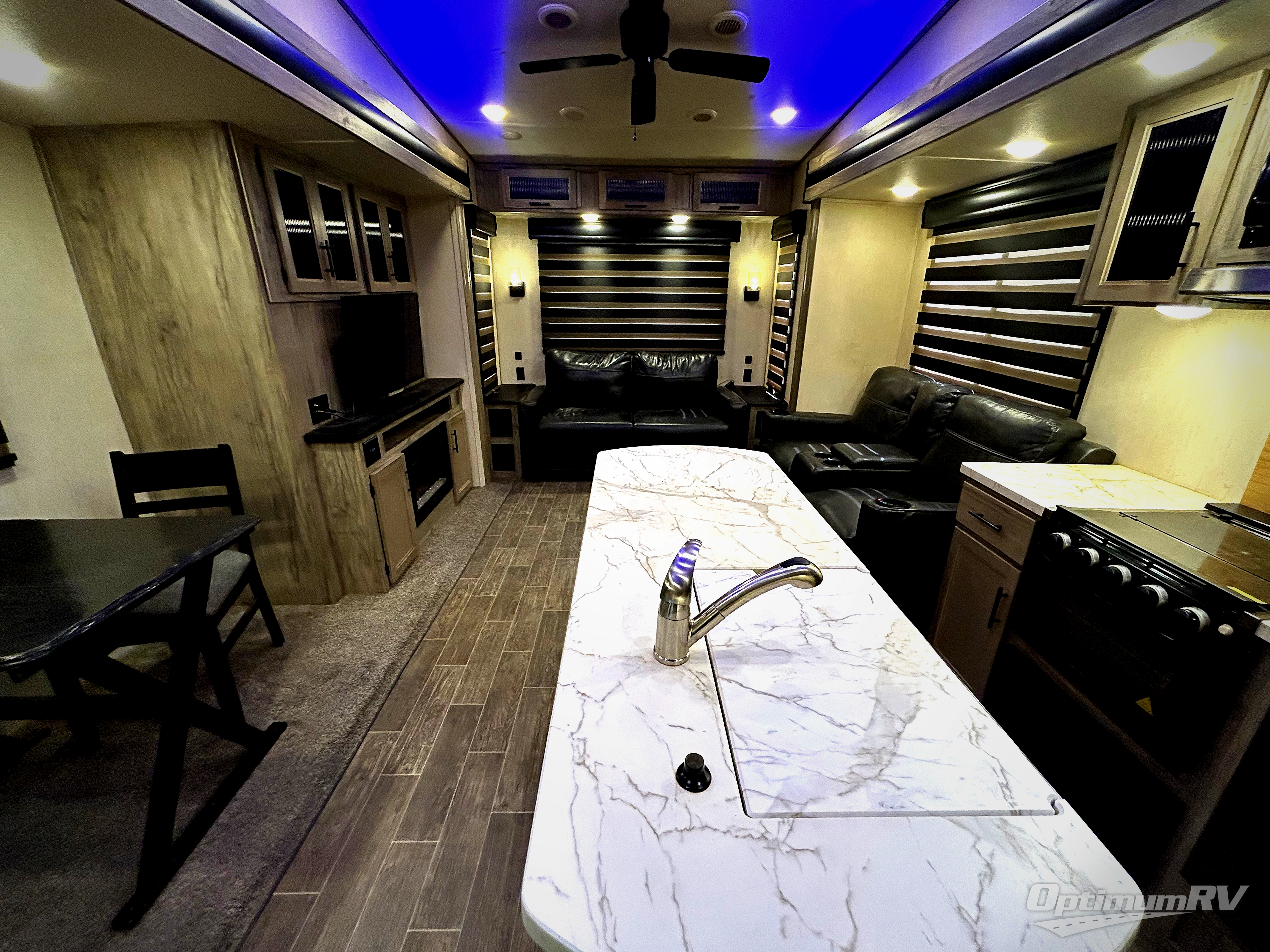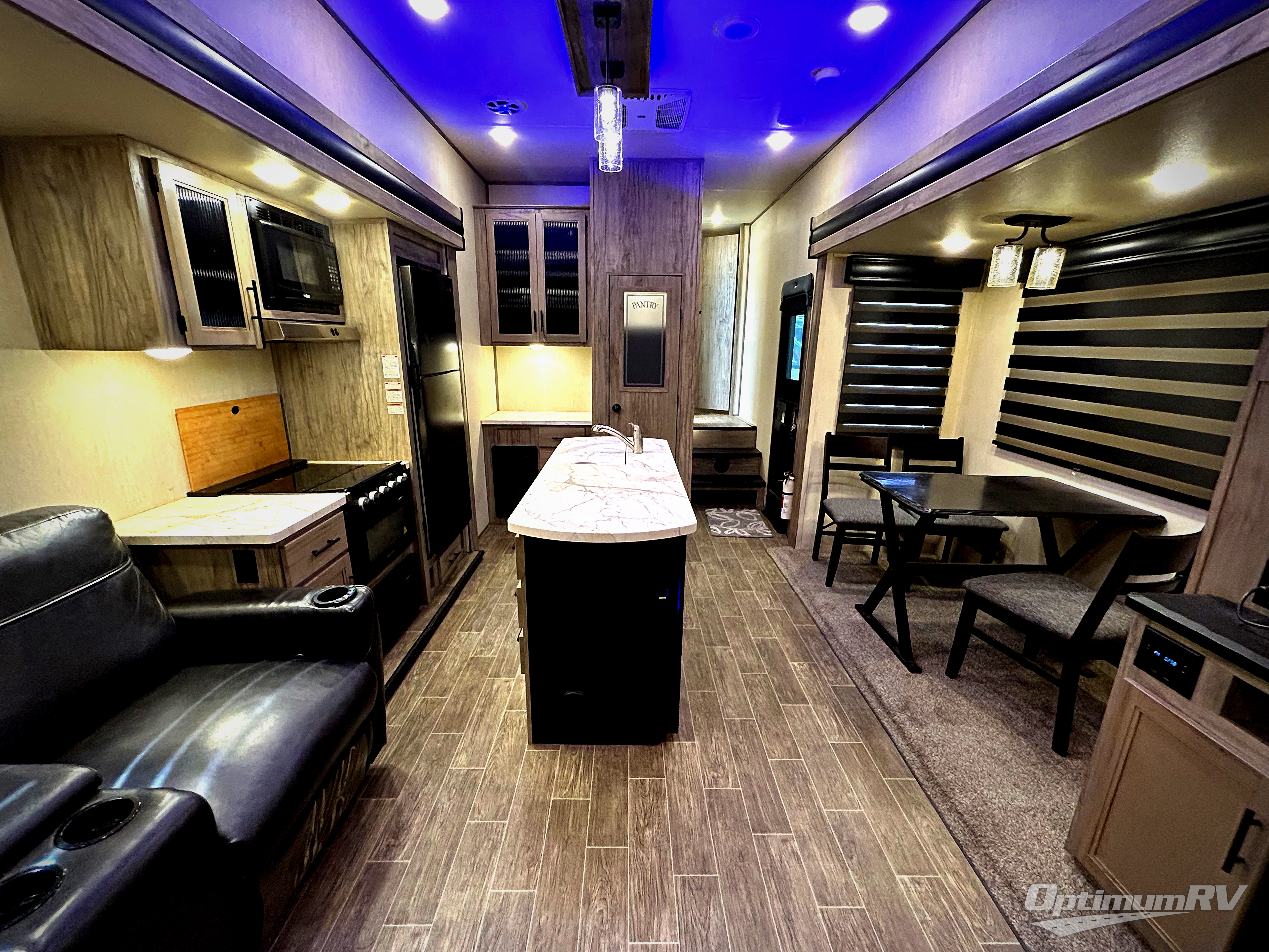This Cherokee Arctic Wolf Suite fifth wheel is quite extraordinary and accommodating! It has a set of opposing slides in the main living area so that you can have more space to sit back on the theater seating and tri-fold sofa. You can switch on the fireplace to add some warmth to this space if it's a cool night, or if it is a hot afternoon, simply switch on the ceiling fan. The table with two fixed/two foldable chairs is going to be great for sitting down to eat a meal together, and after dinner, you can prepare coffee for everyone at the coffee bar. You'll also be able to grab dessert from the walk-in pantry to go with your coffee. The Juice Pack 50W solar panel will help your unit stay powered when you can't connect at a campsite, and the private bedroom up front is going to provide great relaxation with its king bed slide.