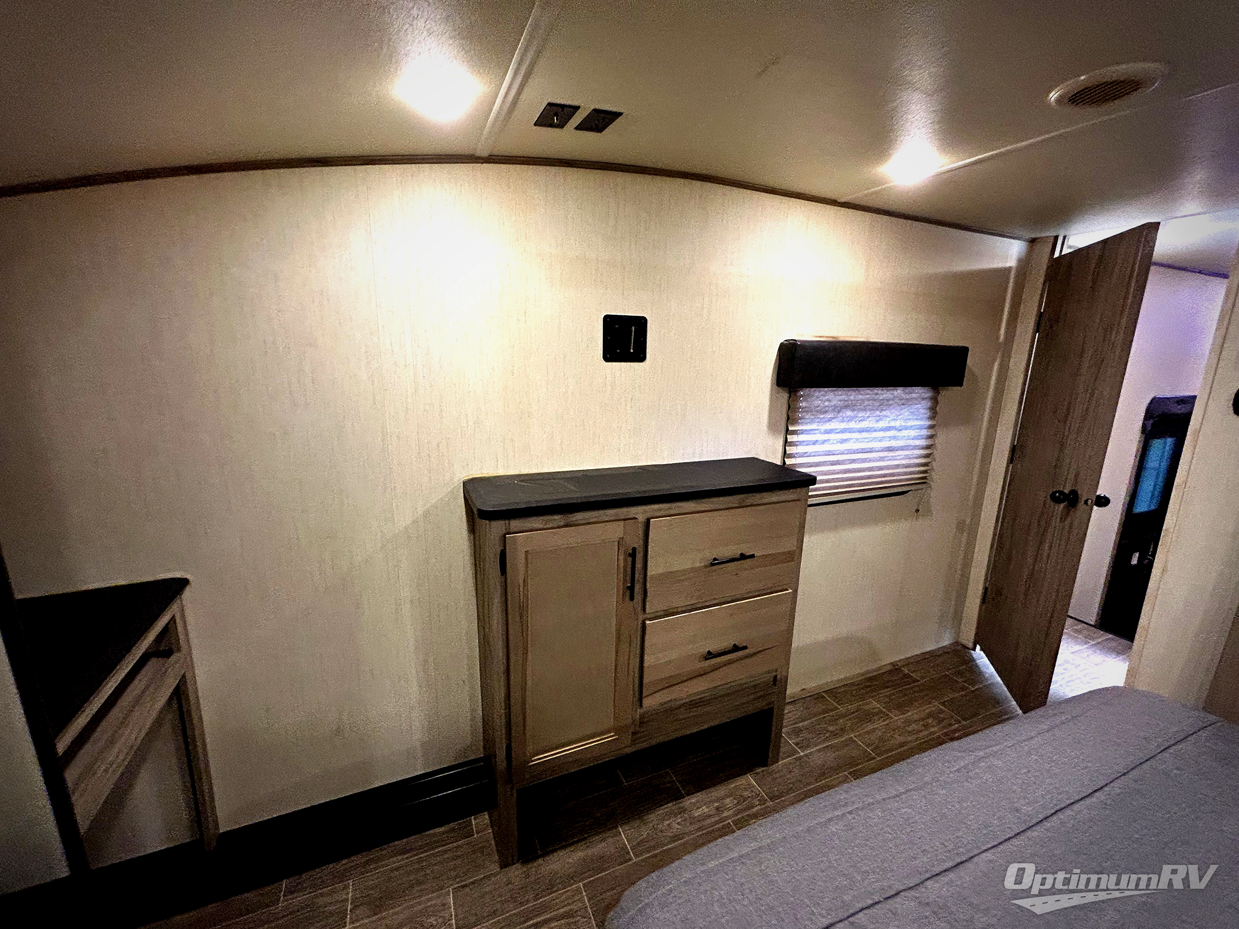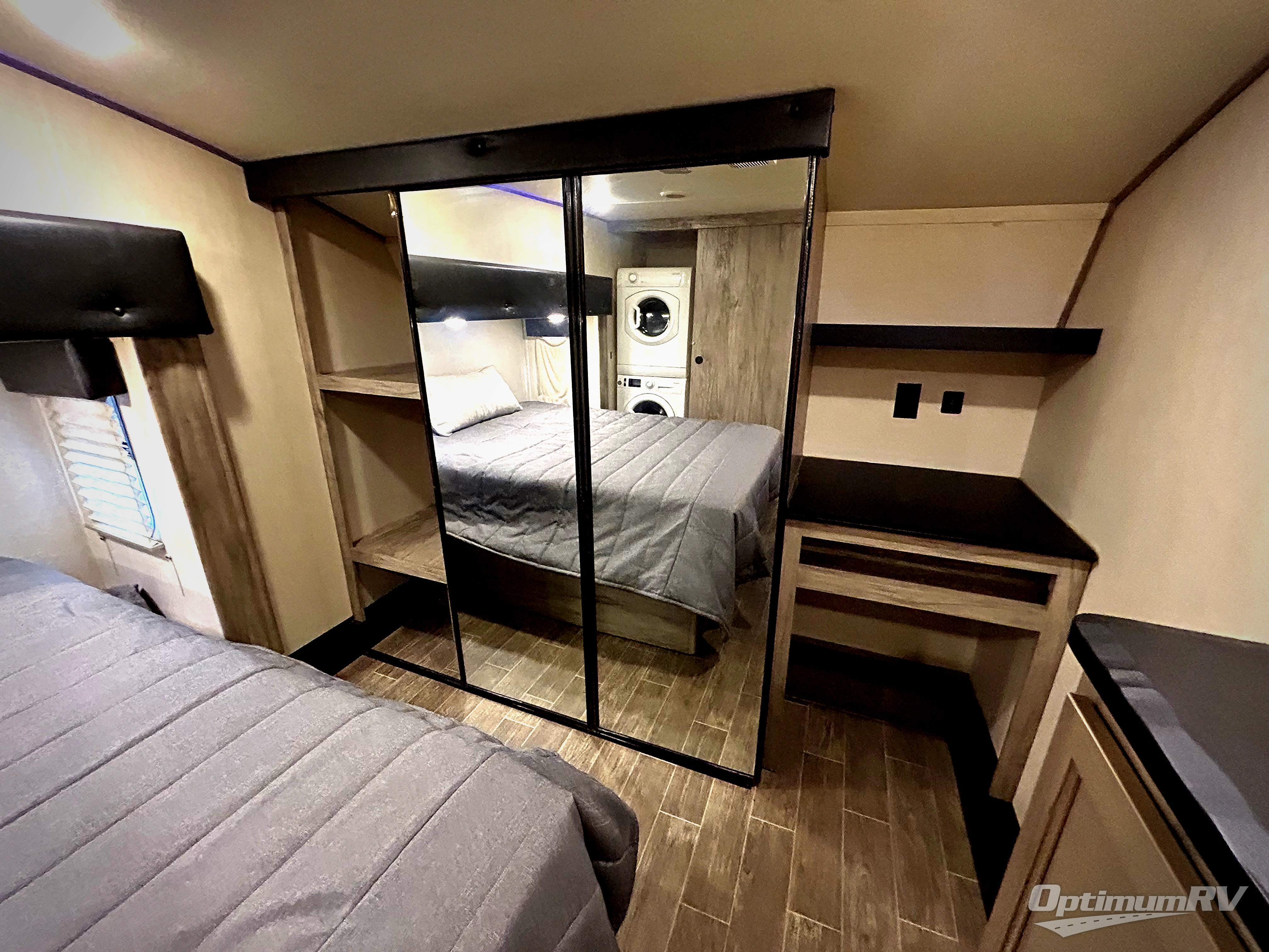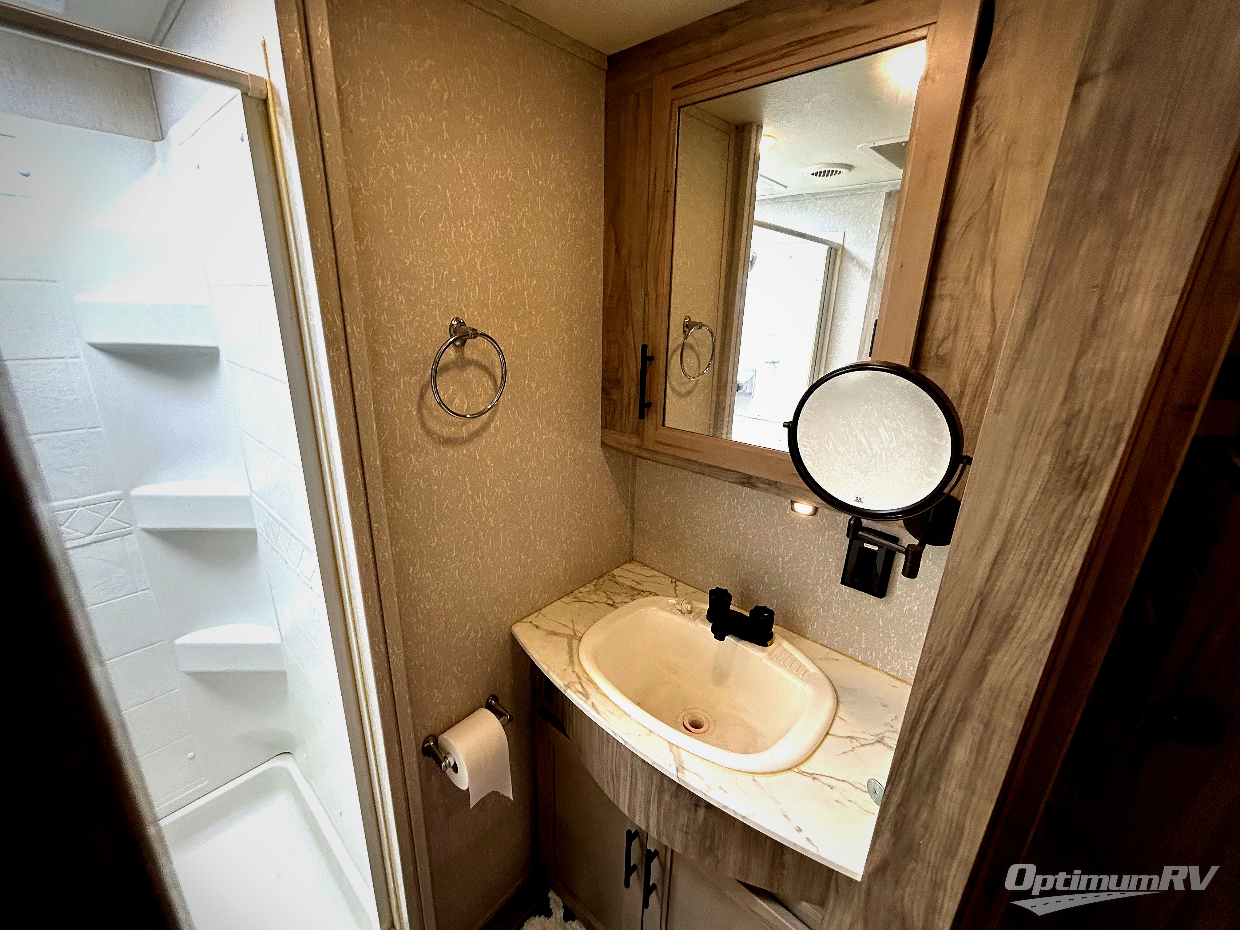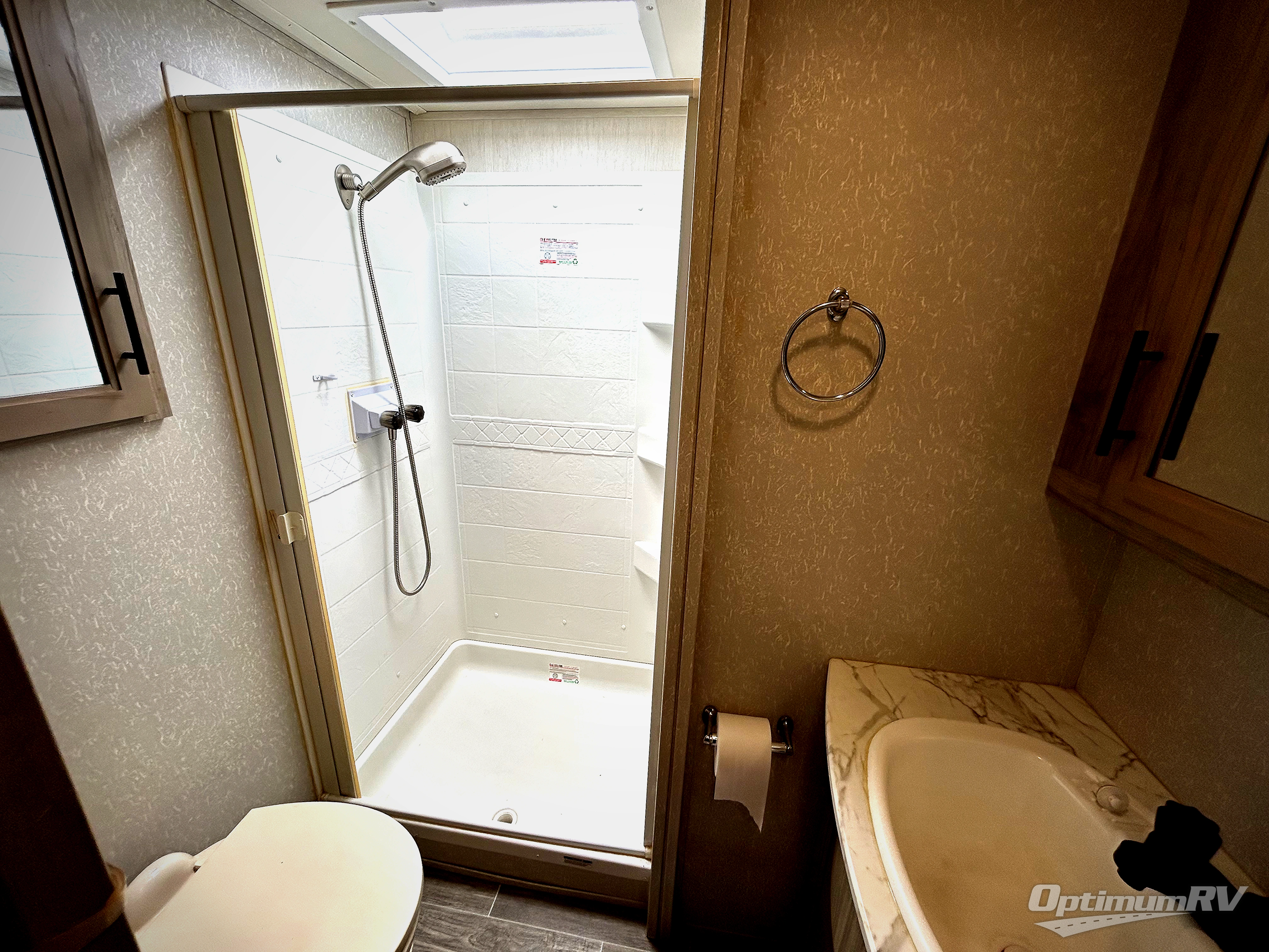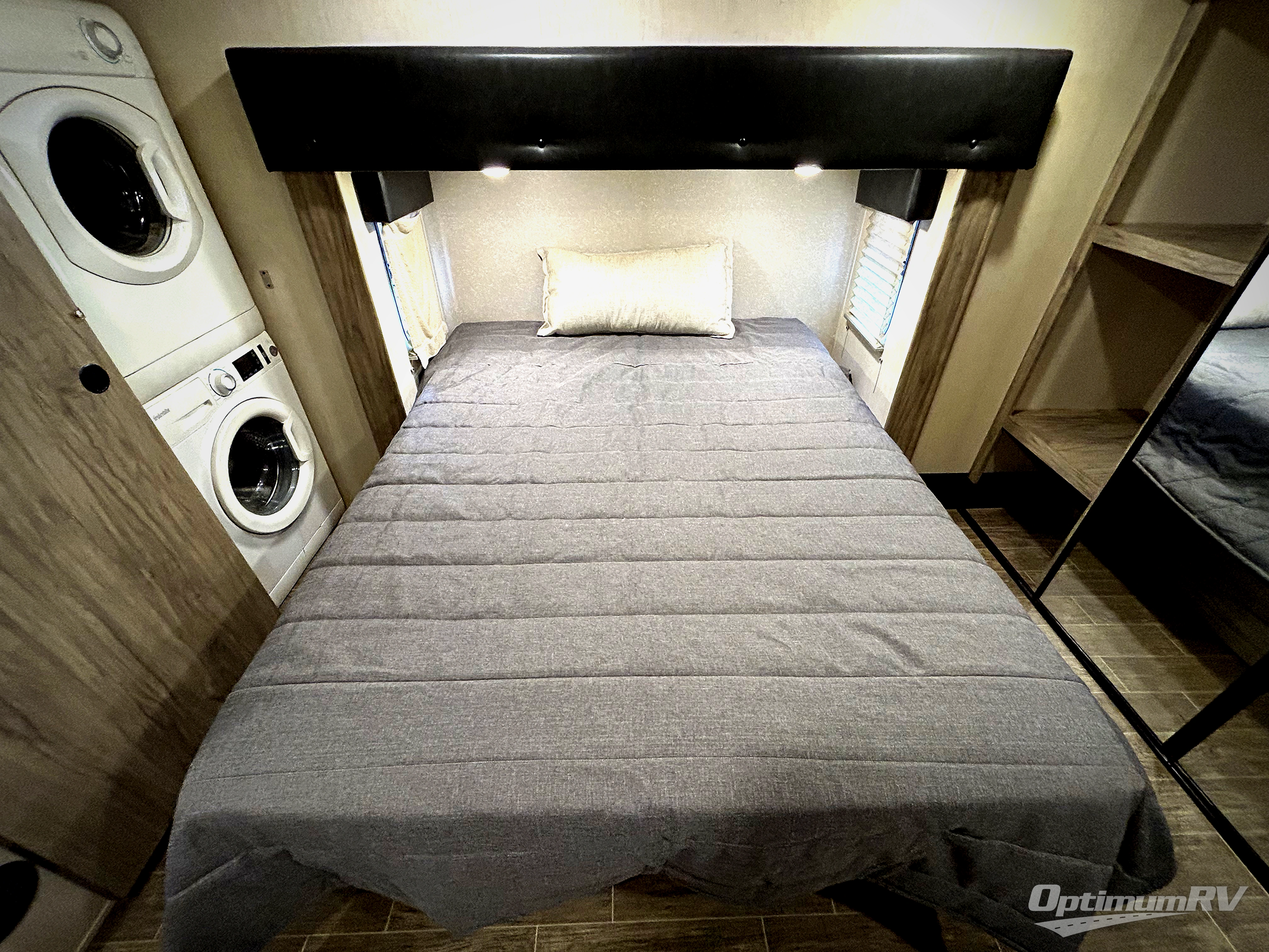 This Cherokee Arctic Wolf Suite fifth wheel is quite extraordinary and accommodating! It has a set of opposing slides in the main living area so that you can have more space to sit back on the theater seating and tri-fold sofa. You can switch on the fireplace to add some warmth to this space if it's a cool night, or if it is a hot afternoon, simply switch on the ceiling fan. The table with two fixed/two foldable chairs is going to be great for sitting down to eat a meal together, and after dinner, you can prepare coffee for everyone at the coffee bar. You'll also be able to grab dessert from the walk-in pantry to go with your coffee. The Juice Pack 50W solar panel will help your unit stay powered when you can't connect at a campsite, and the private bedroom up front is going to provide great relaxation with its king bed slide.