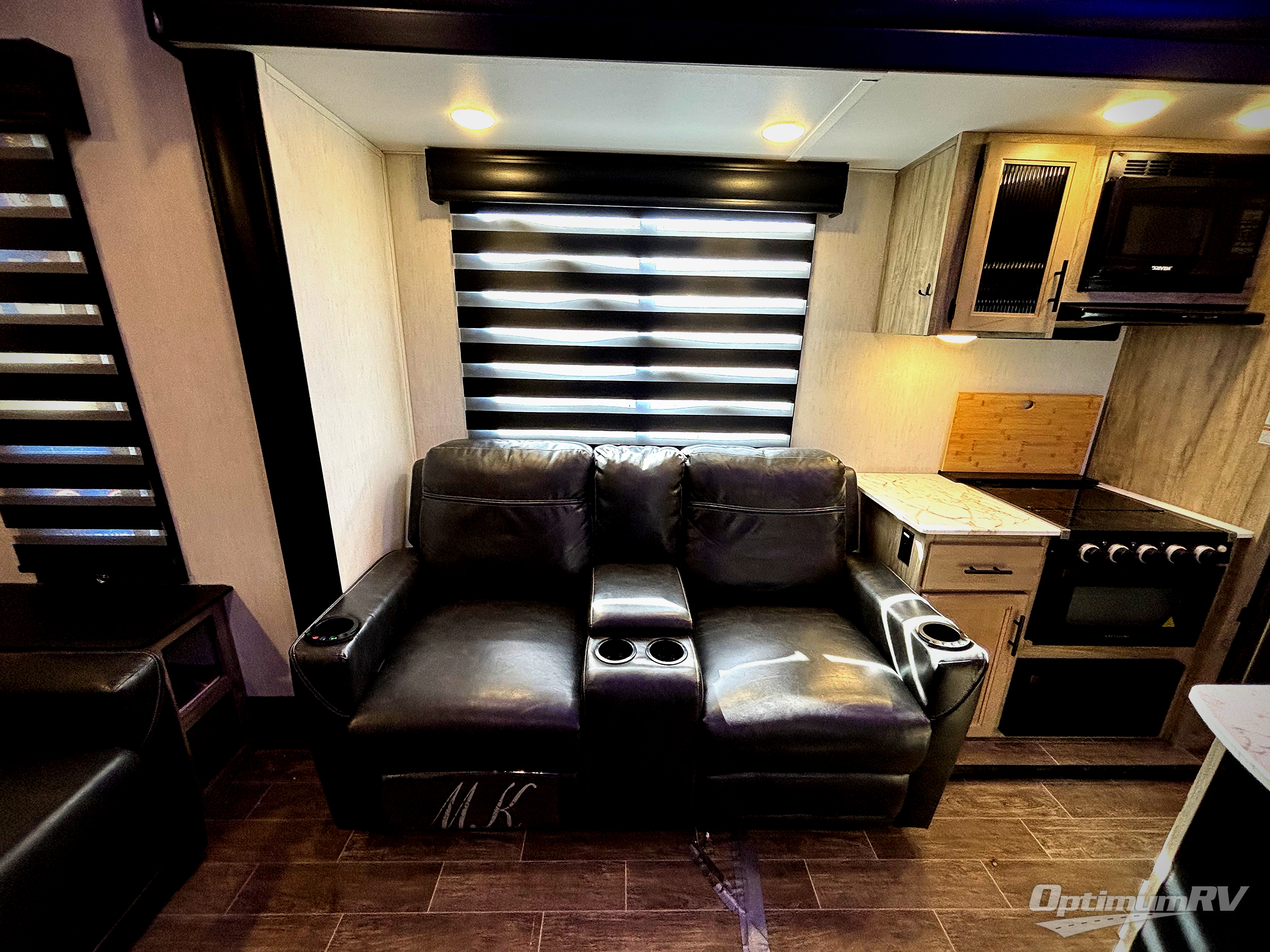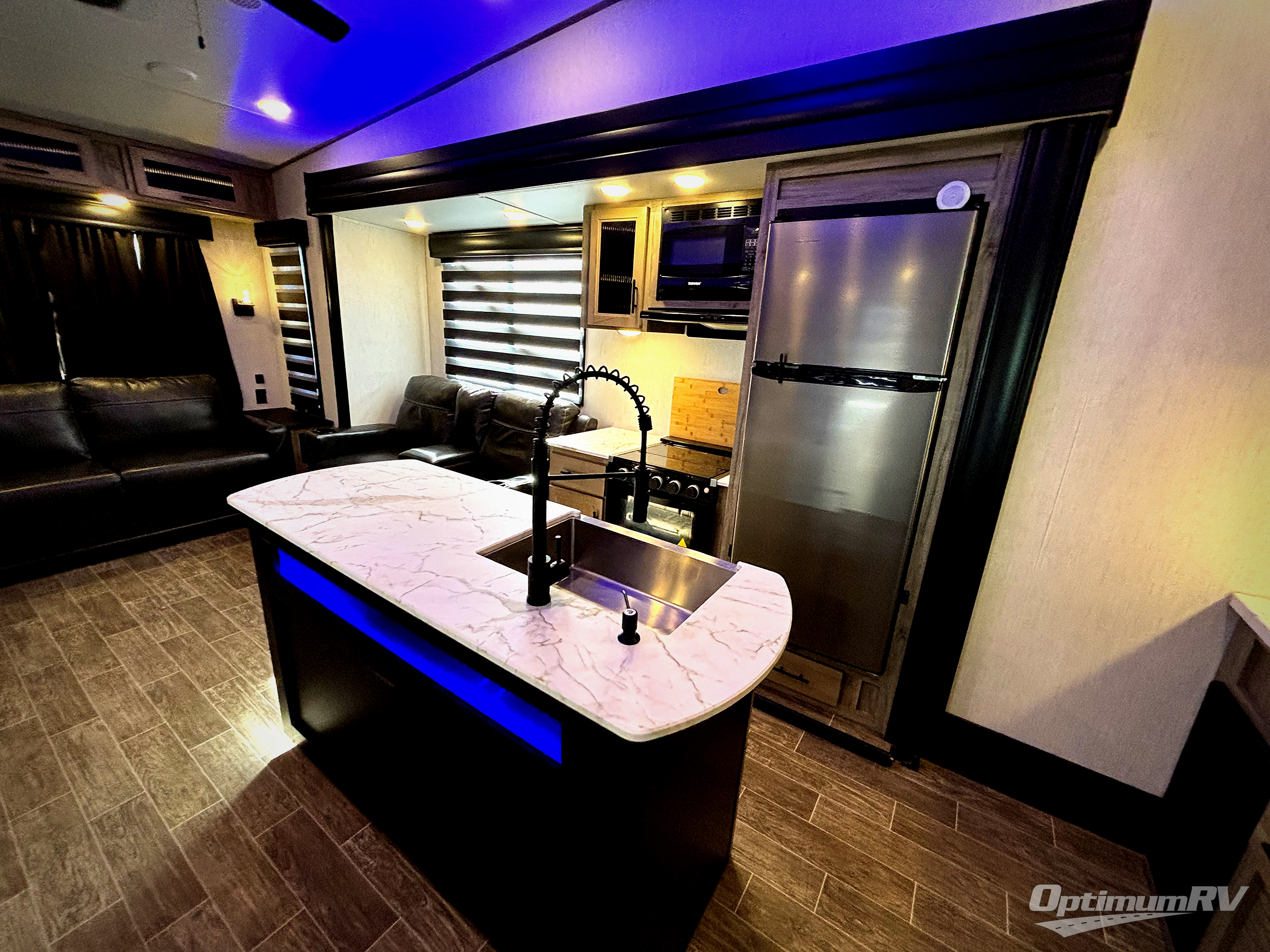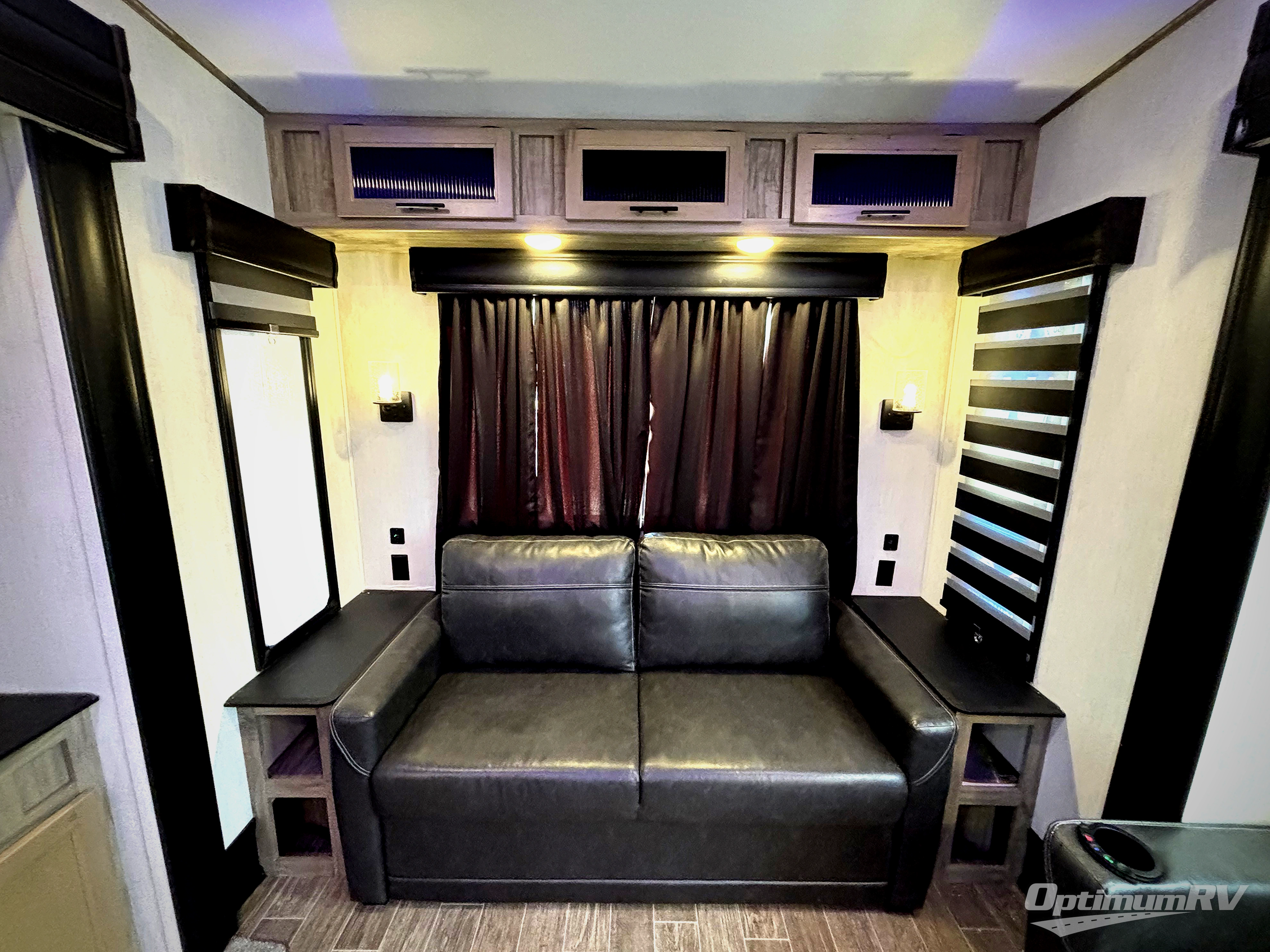 This Cherokee Arctic Wolf Suite fifth wheel is quite extraordinary and accommodating! It has a set of opposing slides in the main living area so that you can have more space to sit back on the theater seating and tri-fold sofa. You can switch on the fireplace to add some warmth to this space if it's a cool night, or if it is a hot afternoon, simply switch on the ceiling fan. The table with two fixed/two foldable chairs is going to be great for sitting down to eat a meal together, and after dinner, you can prepare coffee for everyone at the coffee bar. You'll also be able to grab dessert from the walk-in pantry to go with your coffee. The Juice Pack 50W solar panel will help your unit stay powered when you can't connect at a campsite, and the private bedroom up front is going to provide great relaxation with its king bed slide.