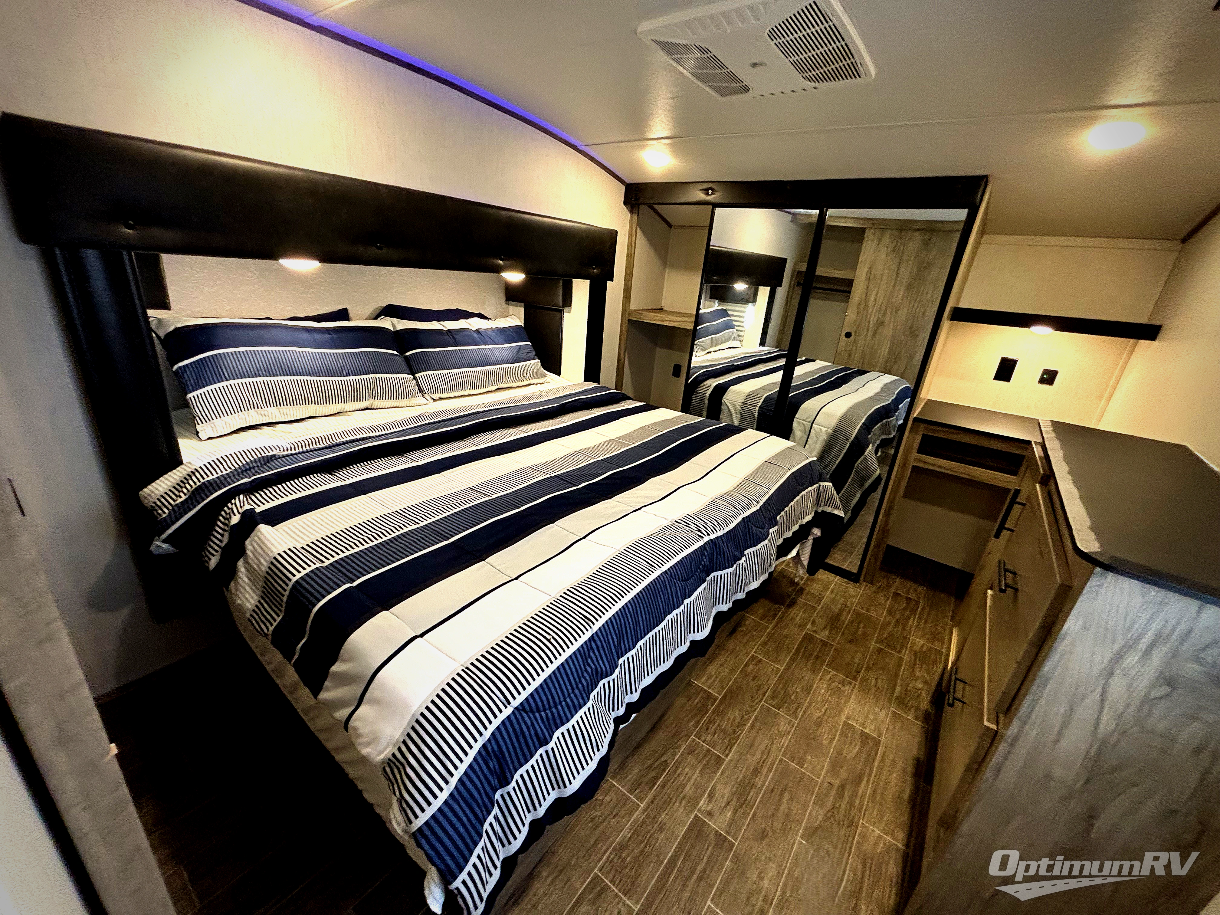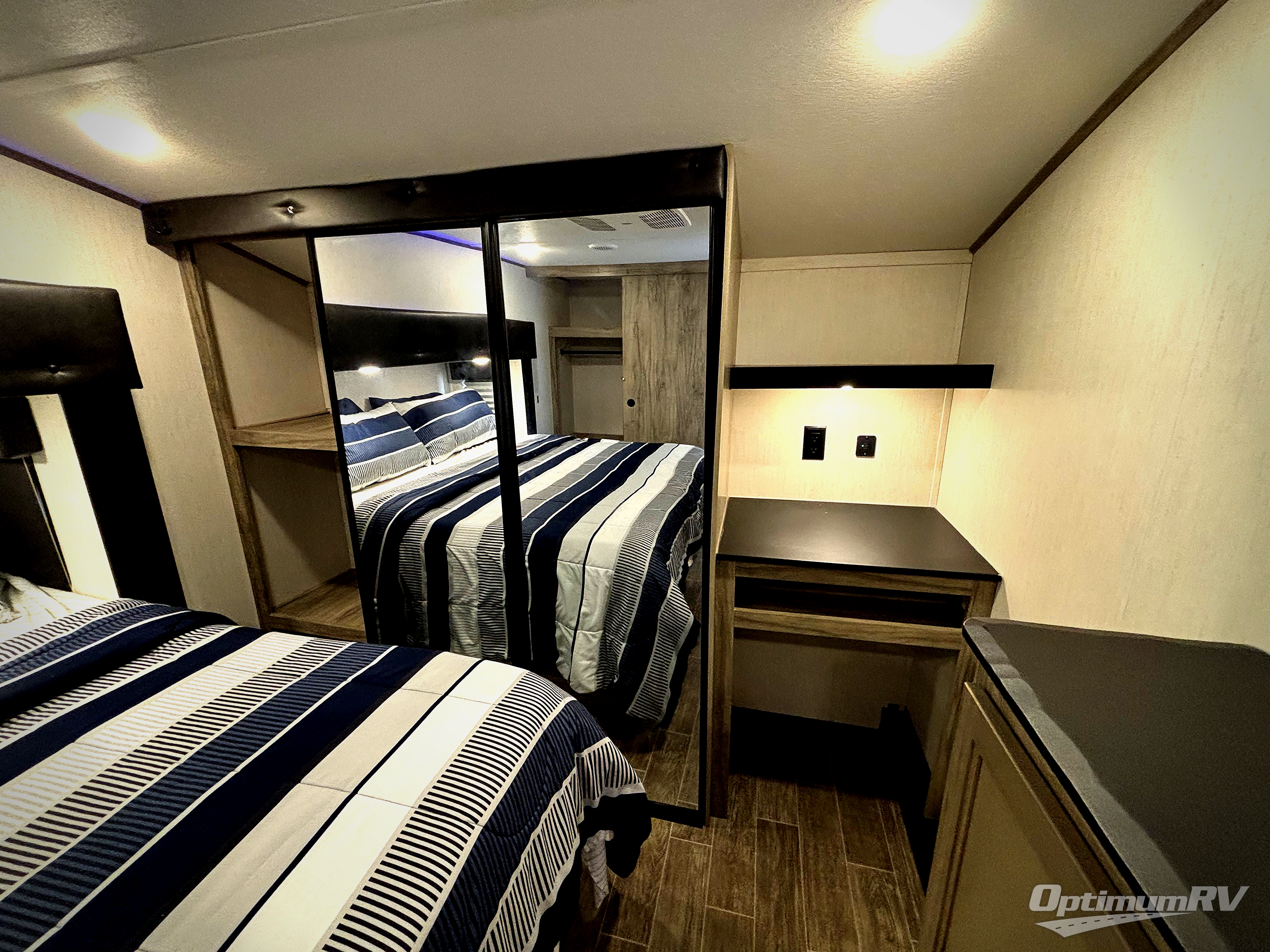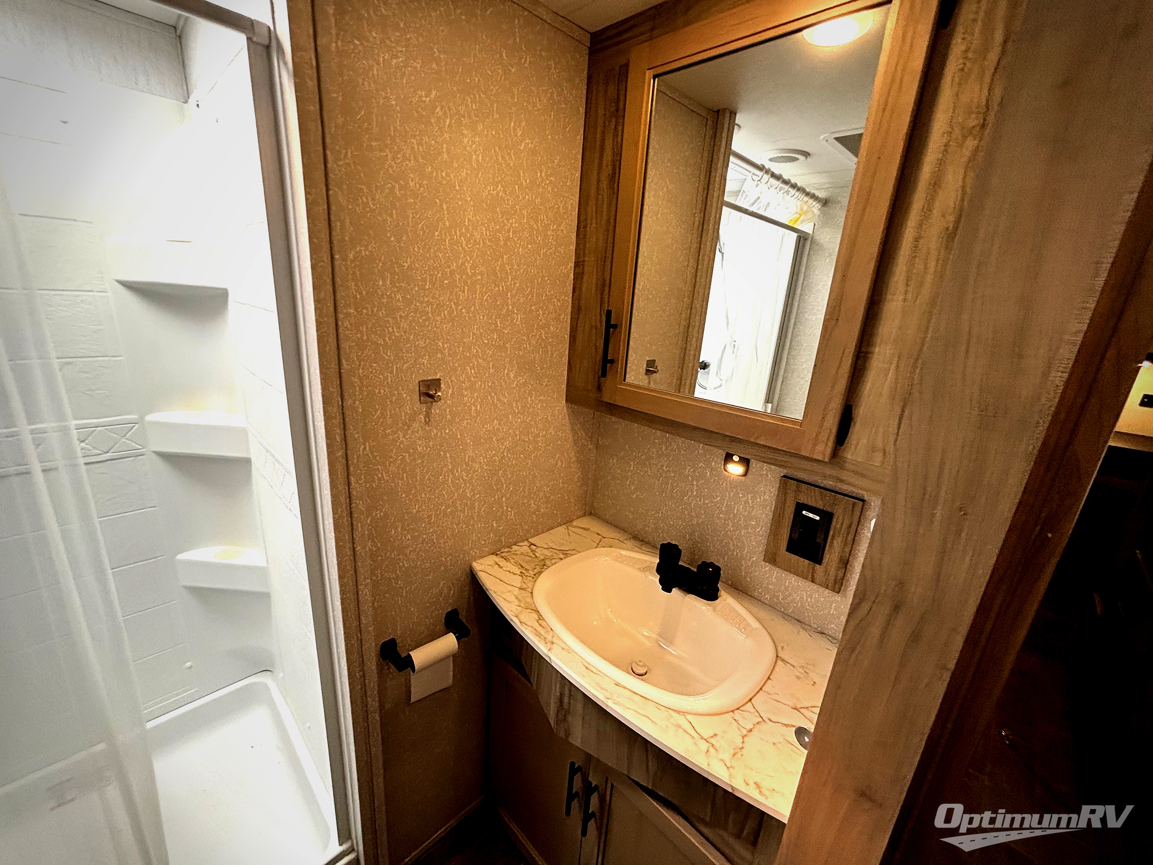 This Cherokee Arctic Wolf Suite fifth wheel is quite extraordinary and accommodating! It has a set of opposing slides in the main living area so that you can have more space to sit back on the theater seating and tri-fold sofa. You can switch on the fireplace to add some warmth to this space if it's a cool night, or if it is a hot afternoon, simply switch on the ceiling fan. The table with two fixed/two foldable chairs is going to be great for sitting down to eat a meal together, and after dinner, you can prepare coffee for everyone at the coffee bar. You'll also be able to grab dessert from the walk-in pantry to go with your coffee. The Juice Pack 50W solar panel will help your unit stay powered when you can't connect at a campsite, and the private bedroom up front is going to provide great relaxation with its king bed slide.