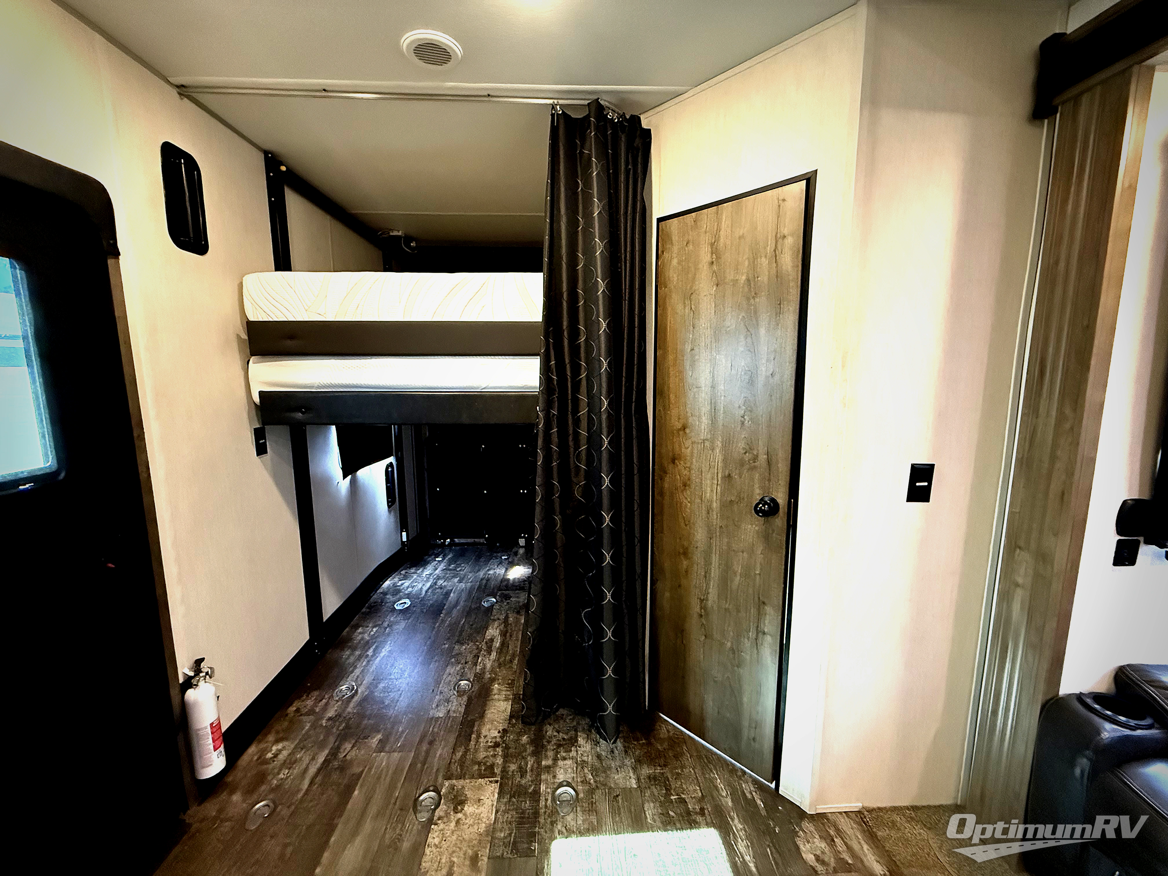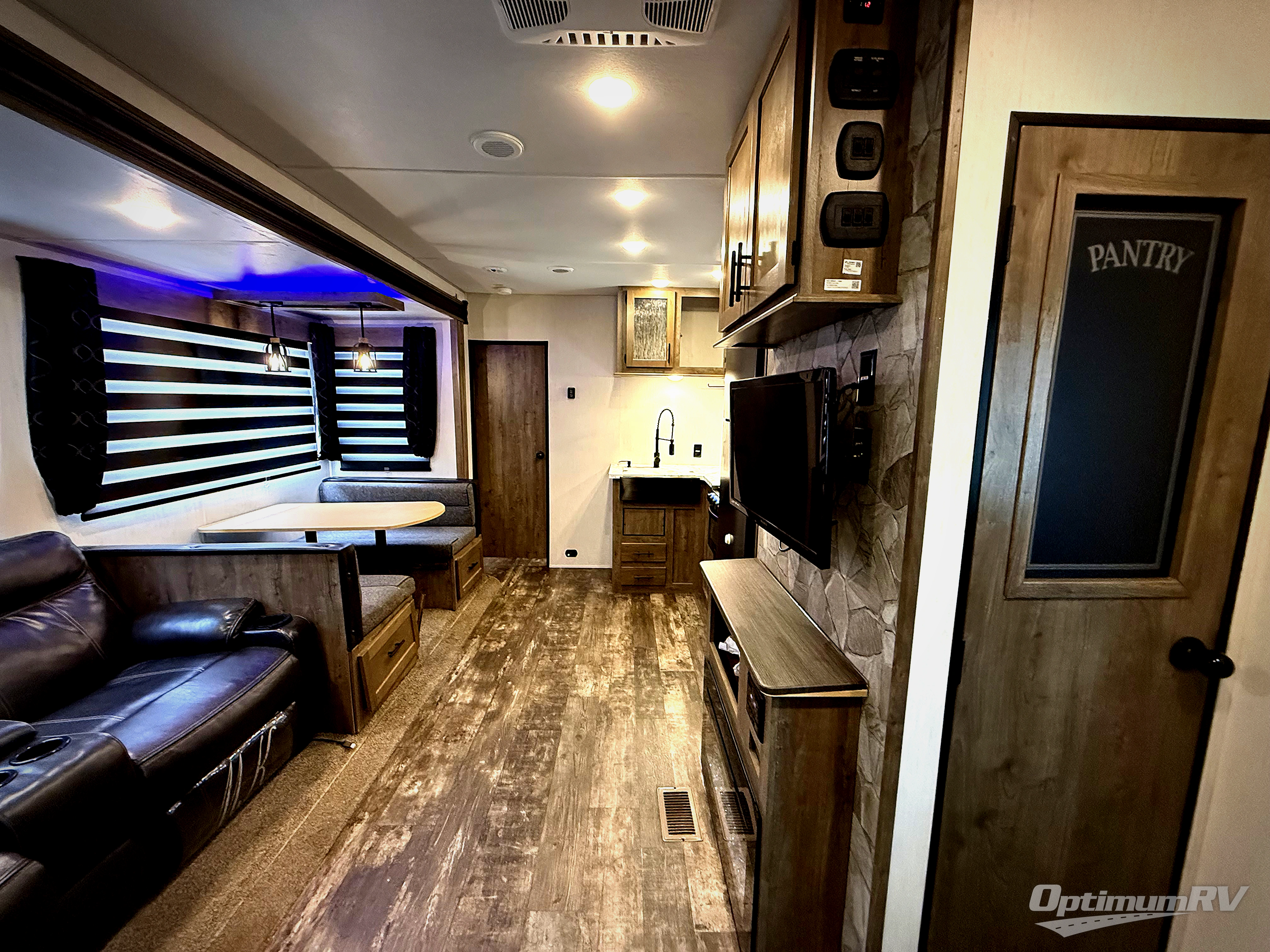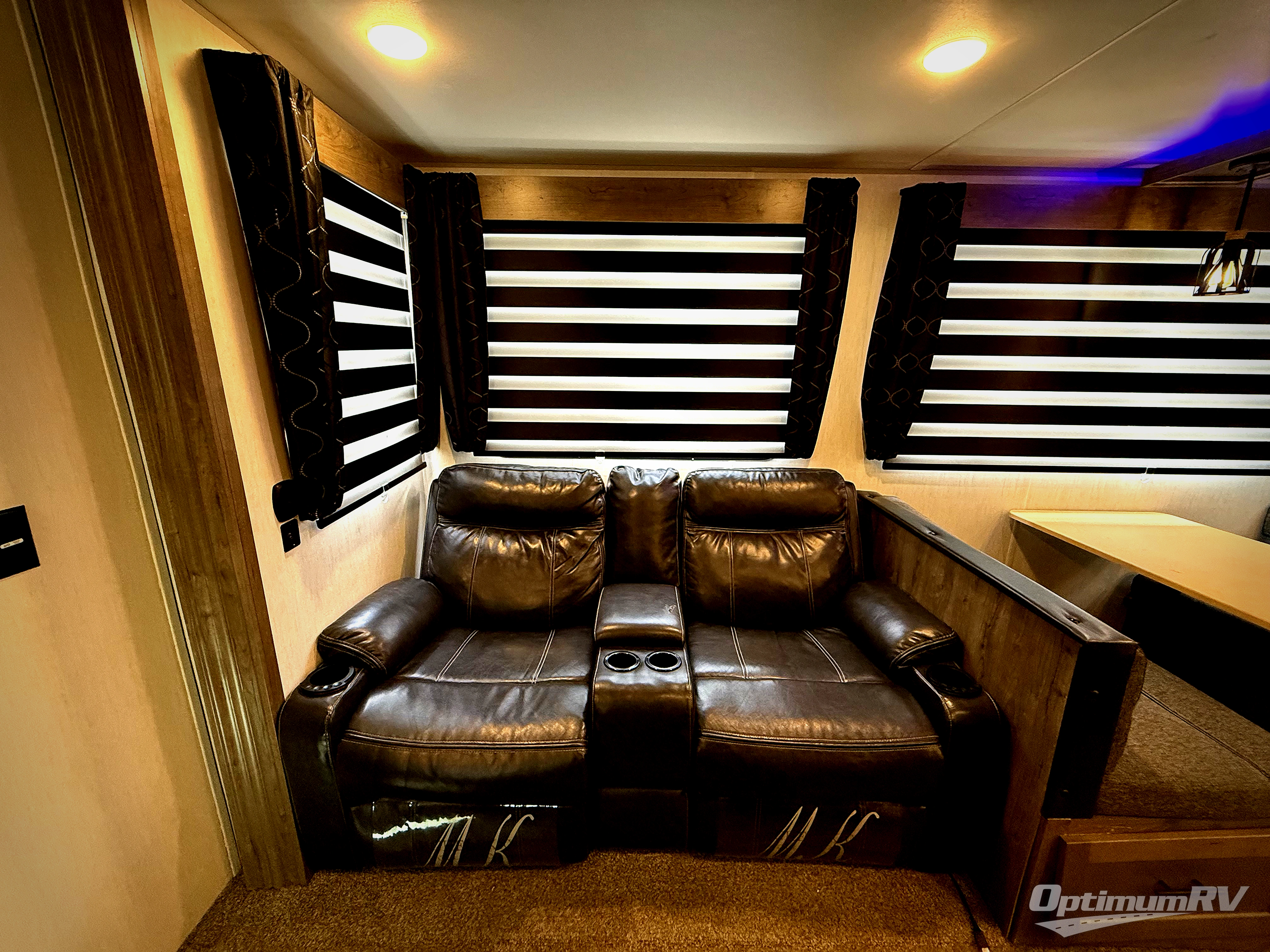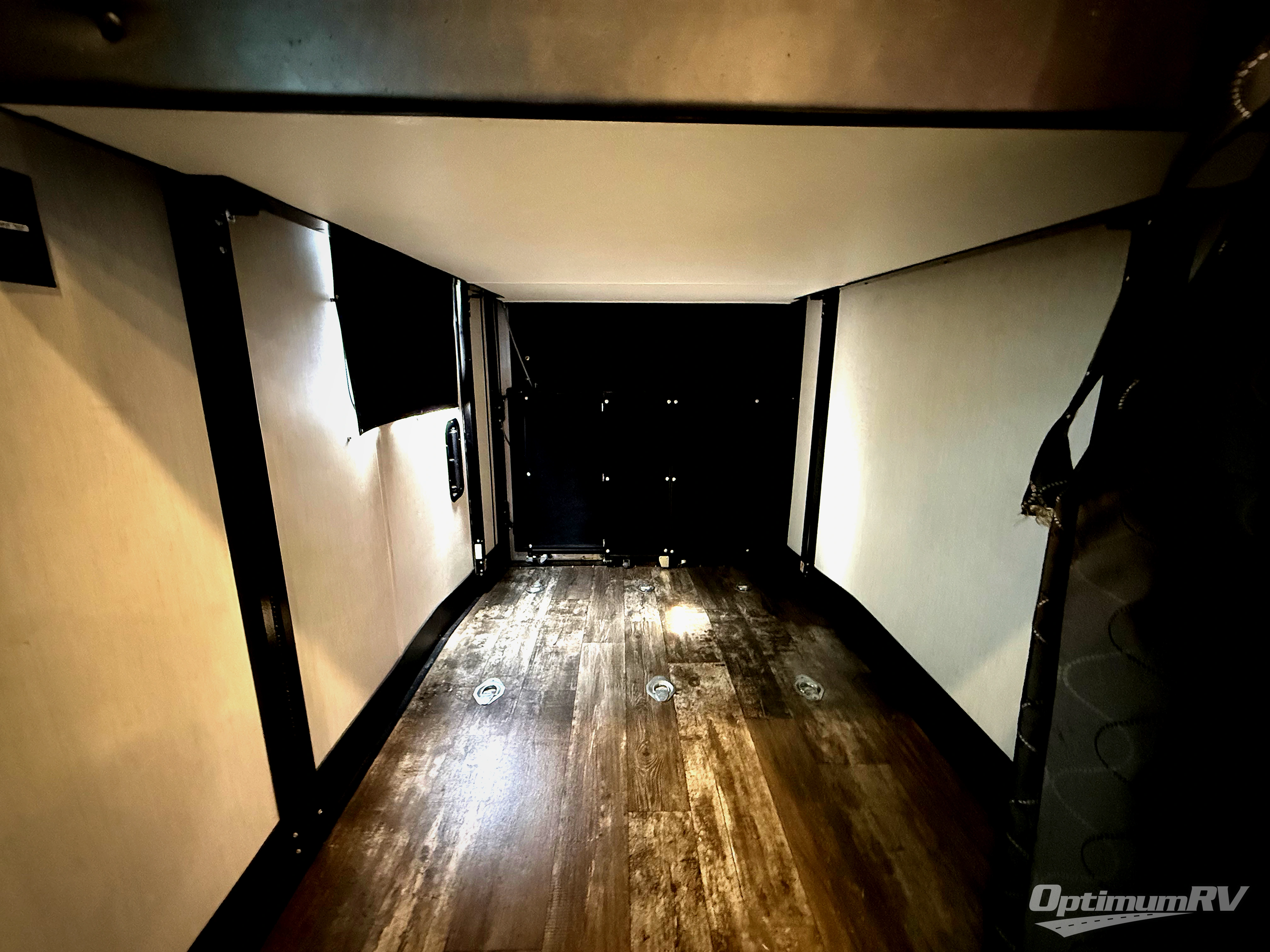 Every part of this toy hauler is maximized for utility and comfort! The Happijac bed lift system bunk beds can be set up within minutes of arriving at your destination. Behind the entertainment center with a fireplace is a large pantry for your snacks and across from it is a sofa and booth dinette slide. You can switch out the sofa for an optional theater seating if that fits your needs better. Freshen up in the rear corner bathroom then head to the front private bedroom to change your clothes that are store in the wardrobes on either side of the 67" x 74" Wolf Pack king bed. You will be the talk of the campground with the "party patio" that has outside TV hookups. Plus, there is an outside kitchen for sunrise breakfasts!