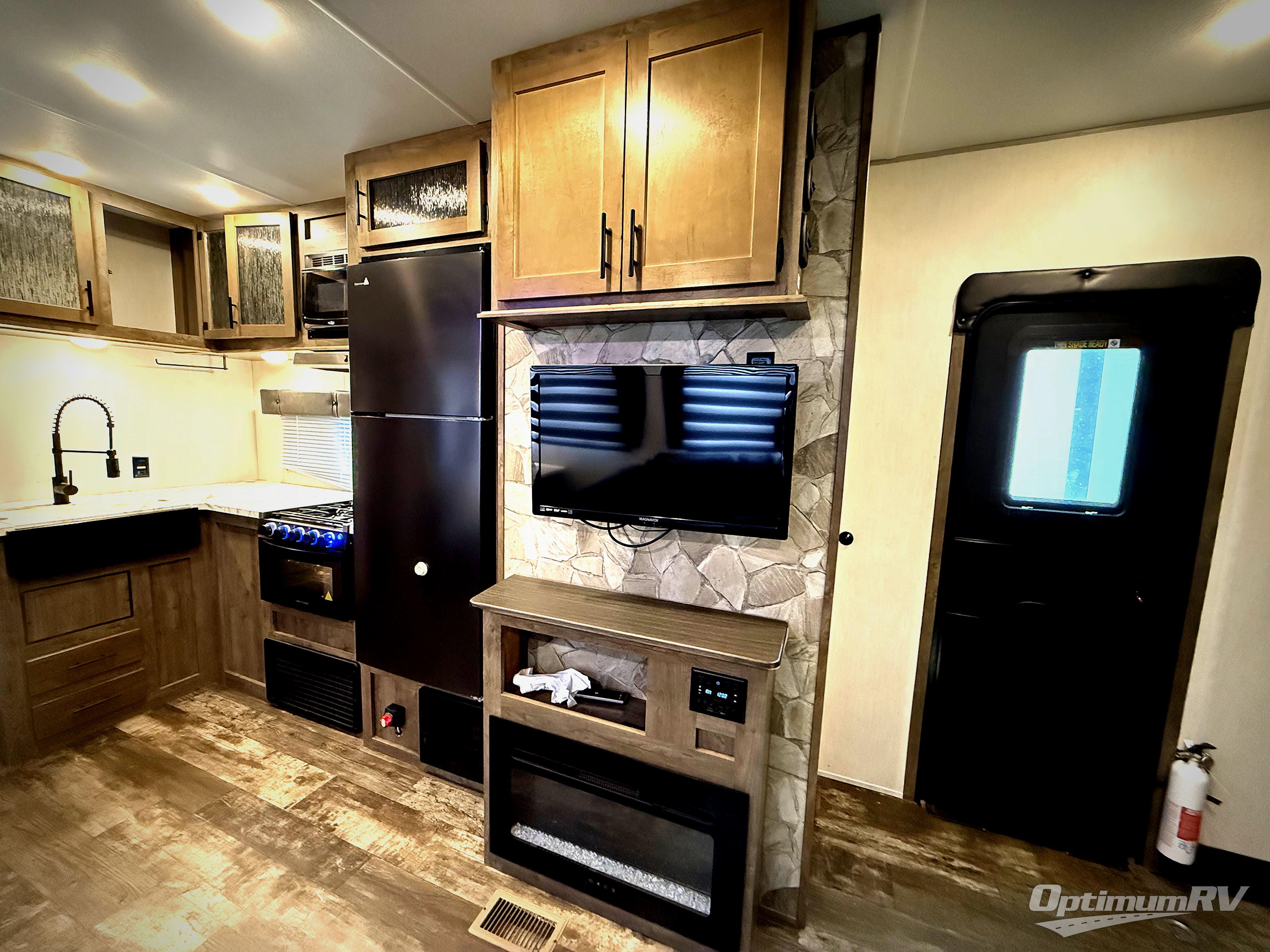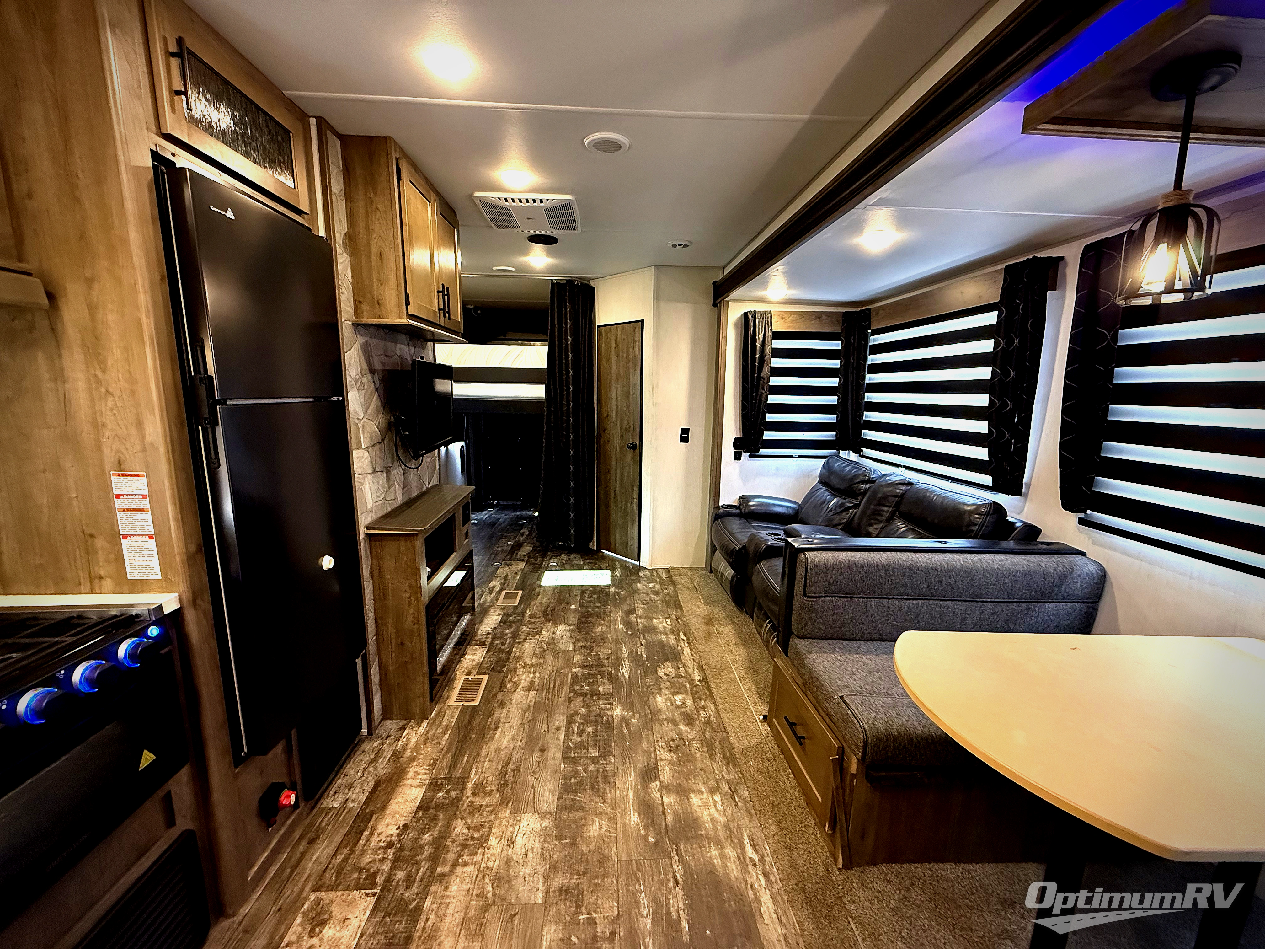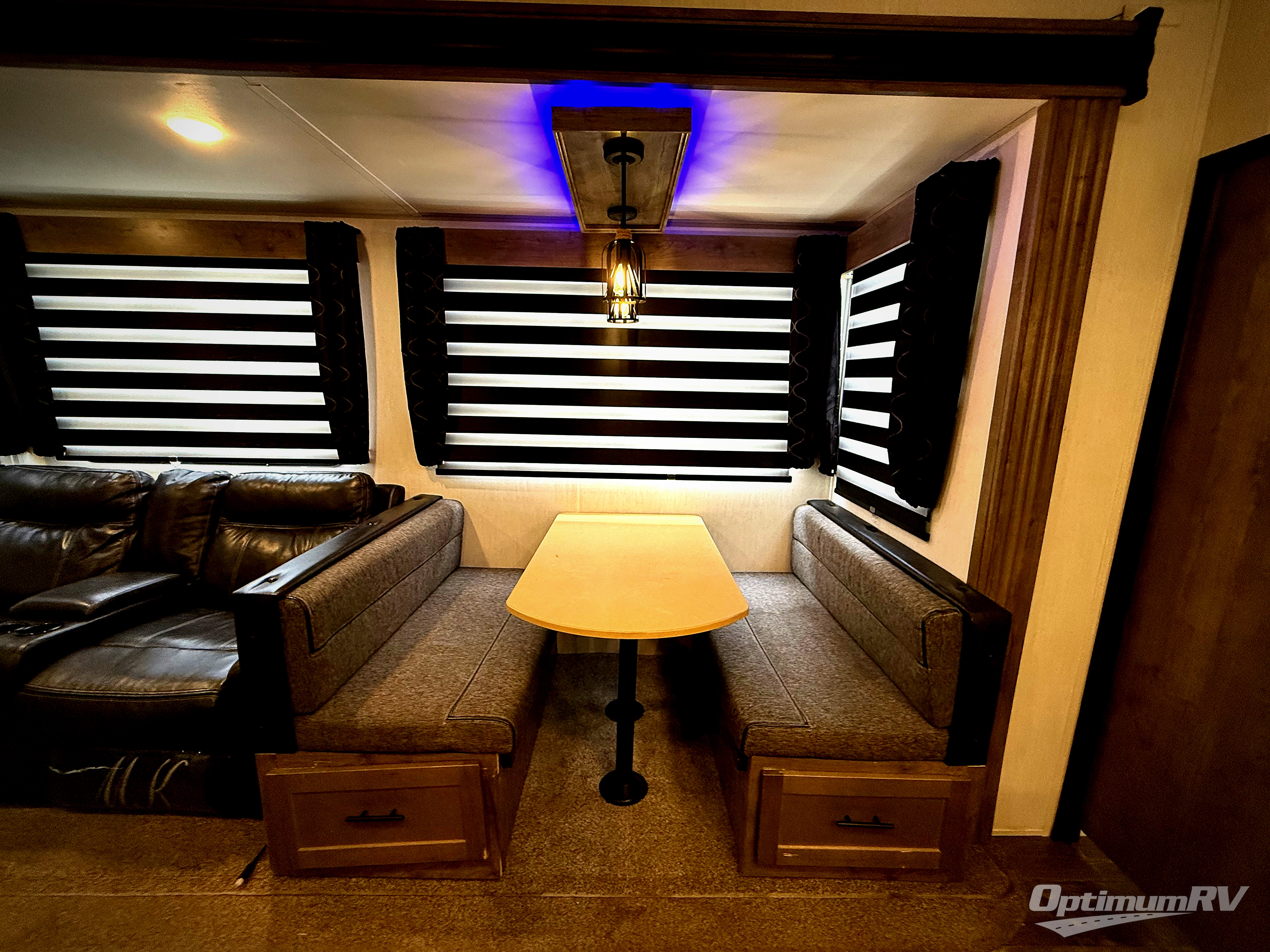 Every part of this toy hauler is maximized for utility and comfort! The Happijac bed lift system bunk beds can be set up within minutes of arriving at your destination. Behind the entertainment center with a fireplace is a large pantry for your snacks and across from it is a sofa and booth dinette slide. You can switch out the sofa for an optional theater seating if that fits your needs better. Freshen up in the rear corner bathroom then head to the front private bedroom to change your clothes that are store in the wardrobes on either side of the 67" x 74" Wolf Pack king bed. You will be the talk of the campground with the "party patio" that has outside TV hookups. Plus, there is an outside kitchen for sunrise breakfasts!