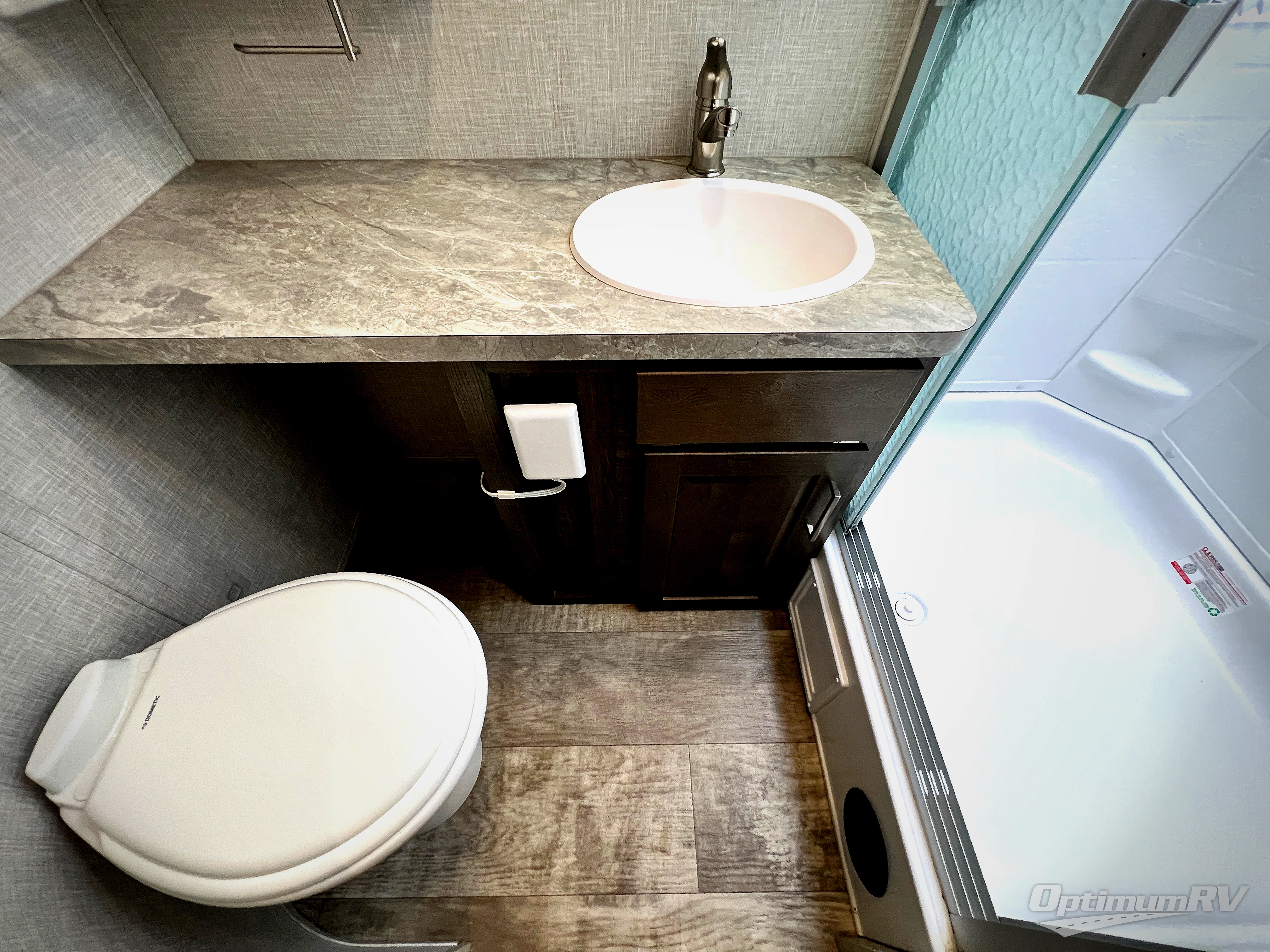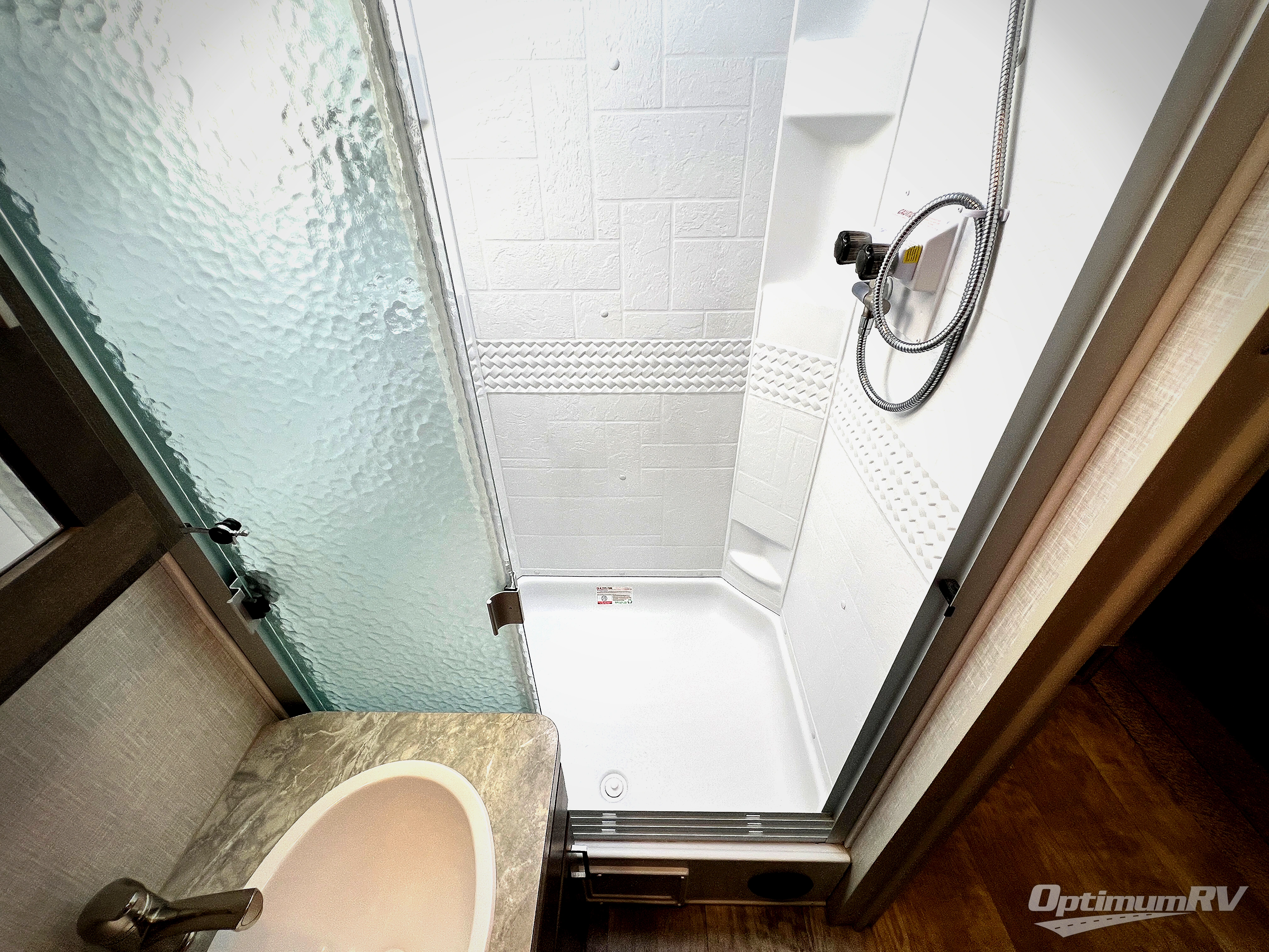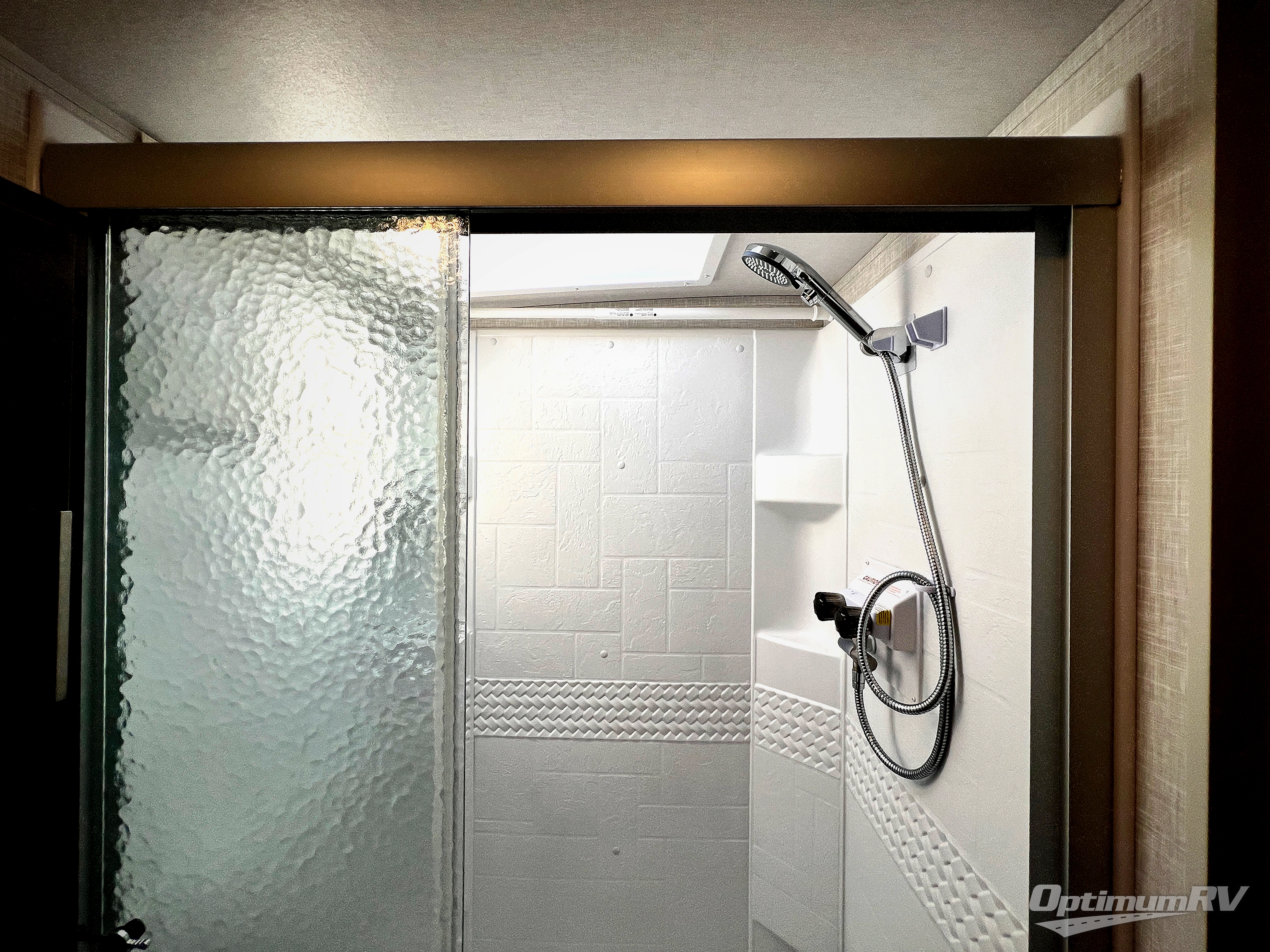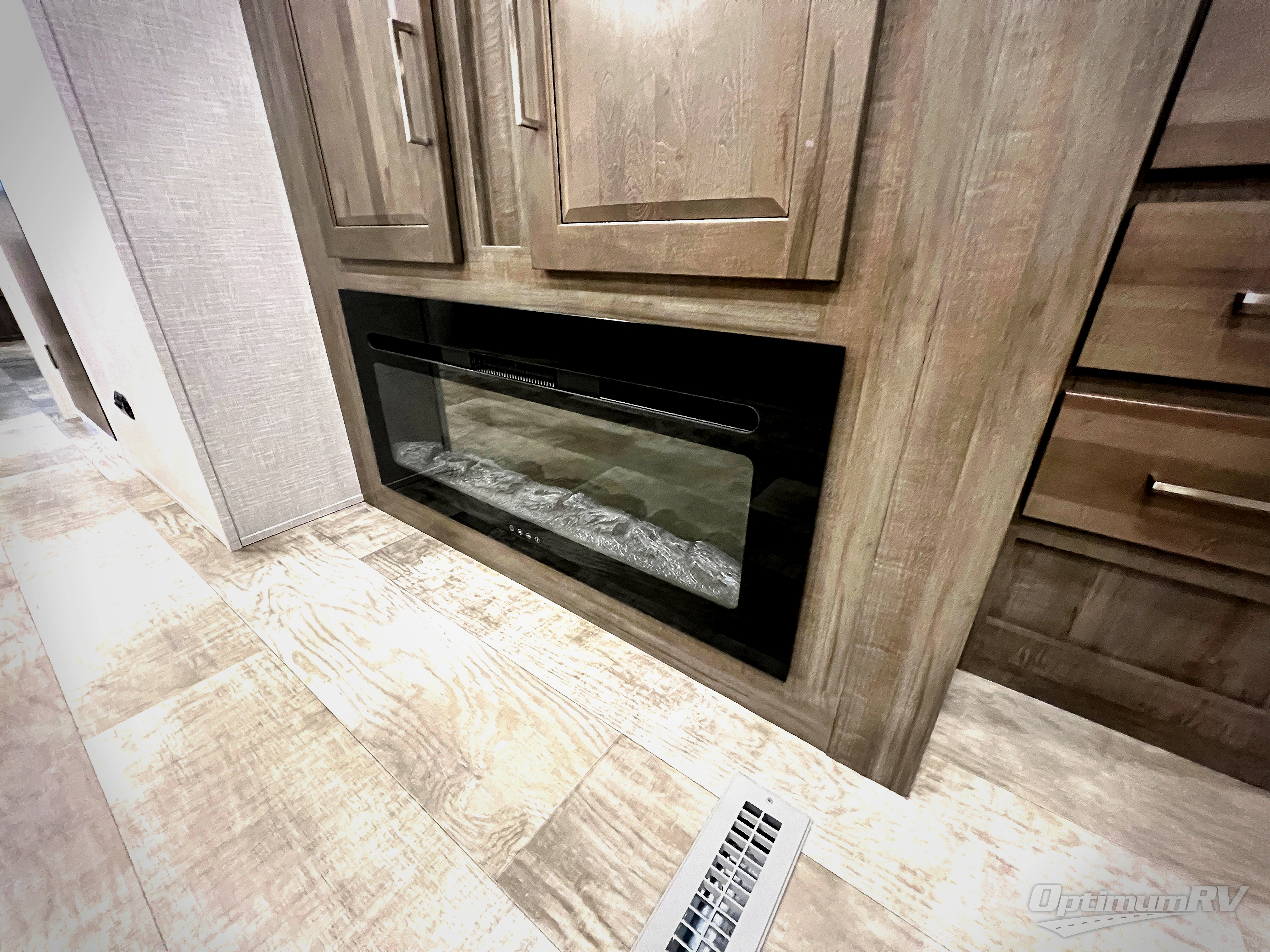 Whether you camp at state parks, National forests or on your friend's land, this trailer offers you plenty of floor space thanks to the two slide outs! As you enter the main entrance near the rear kitchen you can grab a drink from the refrigerator or a snack from the pantry and relax on the 60" theater seating or sit at the booth dinette. The LED TV offers entertainment while the fireplace will keep you cozy during the cooler months. Everyone will appreciate having a full bathroom to get cleaned up in, and the front bedroom gives you privacy and a queen bed slide, plus storage and the second exterior entry.