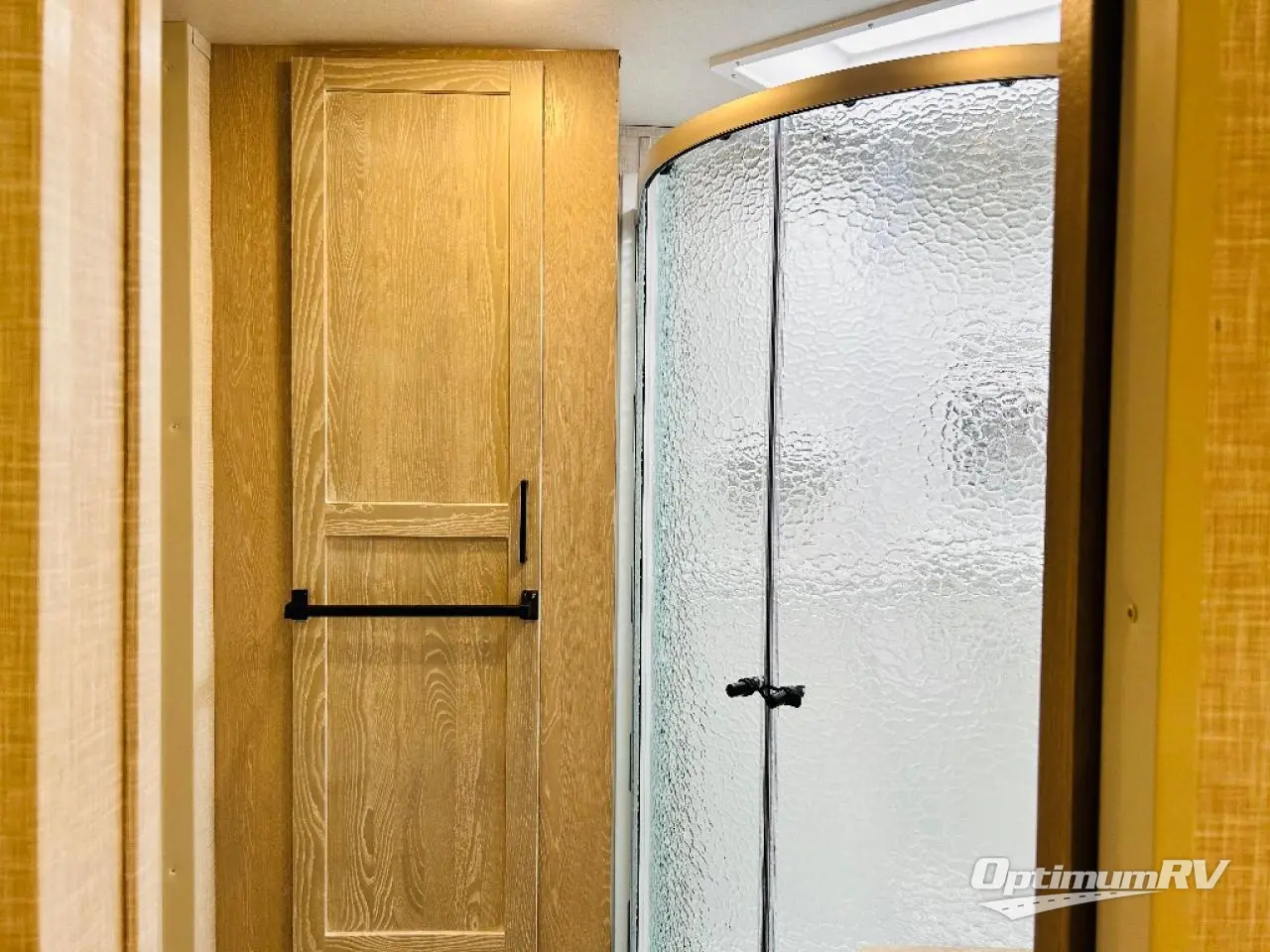 Hike the trails, fish the lake, and relax indoors after the cook whips up a meal with full amenities in the rear kitchen which also includes extra counter space that can be utilizes as a desk as well, and a center island that provides more prep and serving surface, and a place to dry the dishes. The 44" booth dinette allows you to eat your meals together and watch the LED TV with fireplace below. The theater seating is another comfortable place to relax, and the double entry bathroom is convenient especially at night. And the cook will love having an outside kitchen with a burner top and refrigerator, plus there is an outside griddle.