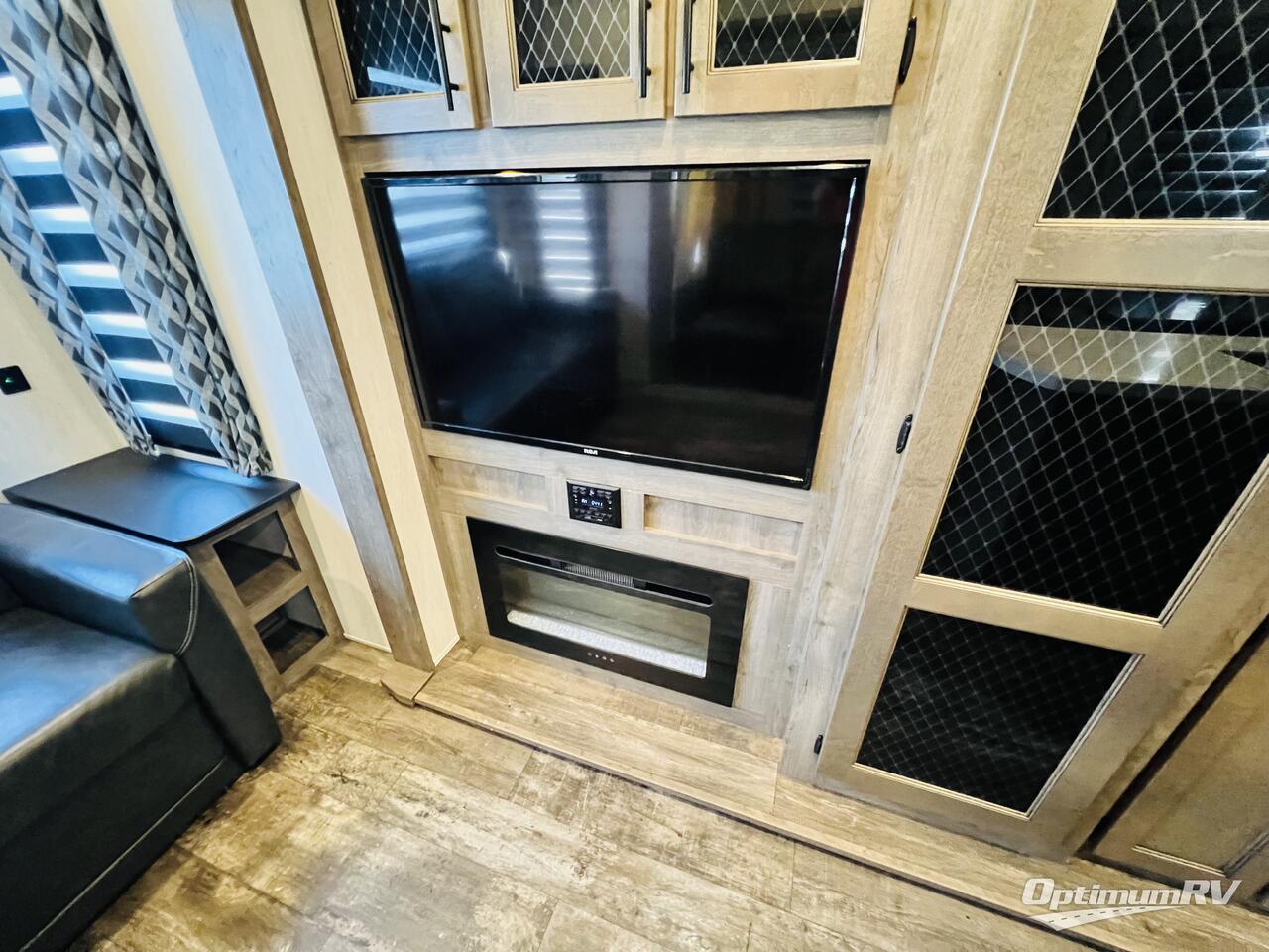 There's something for everyone in this Sabre fifth wheel! The front private bedroom includes king bed for maximum comfort and a front closet with an area prepped for the optional washer and dryer. Your guests will feel right at home in the second bedroom with a tri-fold sofa, plus a closet, dresser, and wardrobe for their clothes. There is even a loft above this room for the kids. The kitchen island not only provides extra counter and storage space, but is also makes cleaning up even easier with the farm-style sink and deluxe pull-down faucet. After you have spent a fun day in the sun, head to the rear living area and relax on either the tri-fold sofa which can be transformed into an extra sleeping space or on the theatre seating with heat and massage. As you sit back and relax, you'll find a fireplace directly across with a large residential TV above it for you to watch your favorite movie!