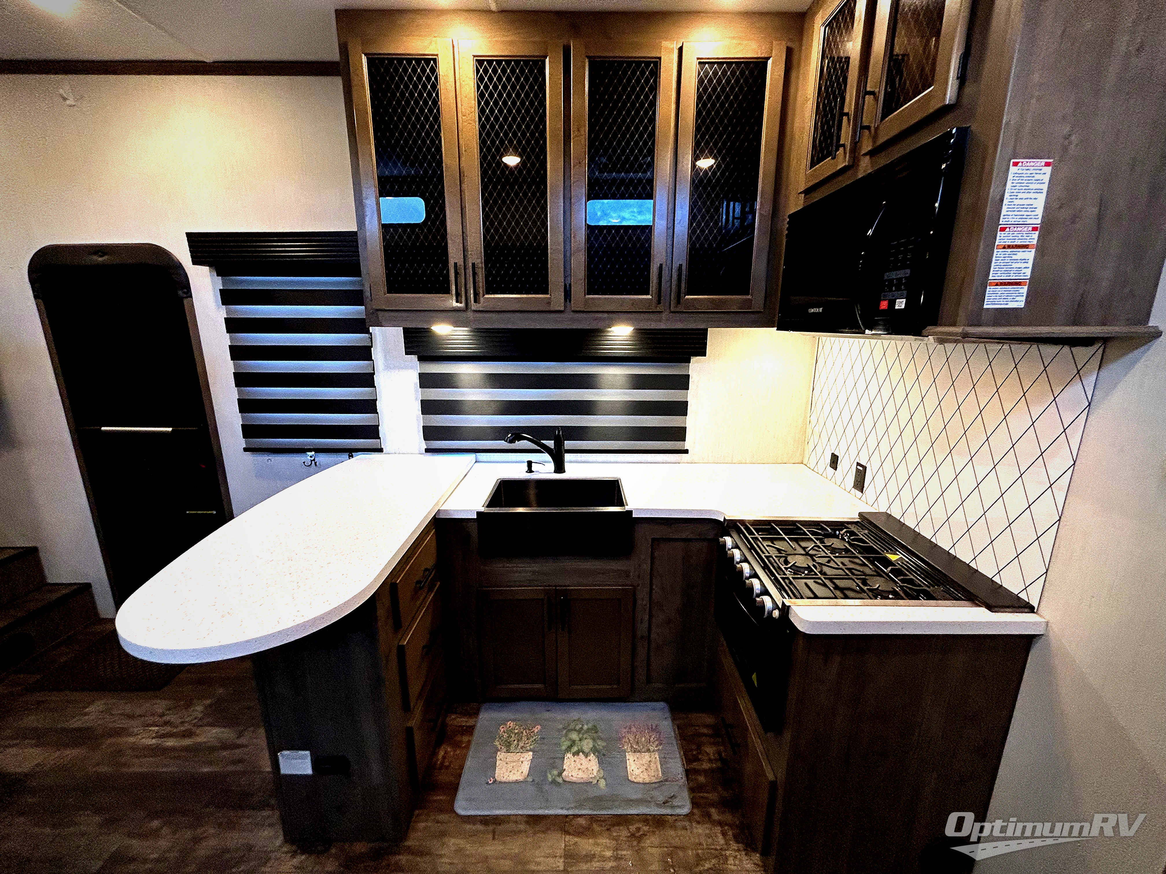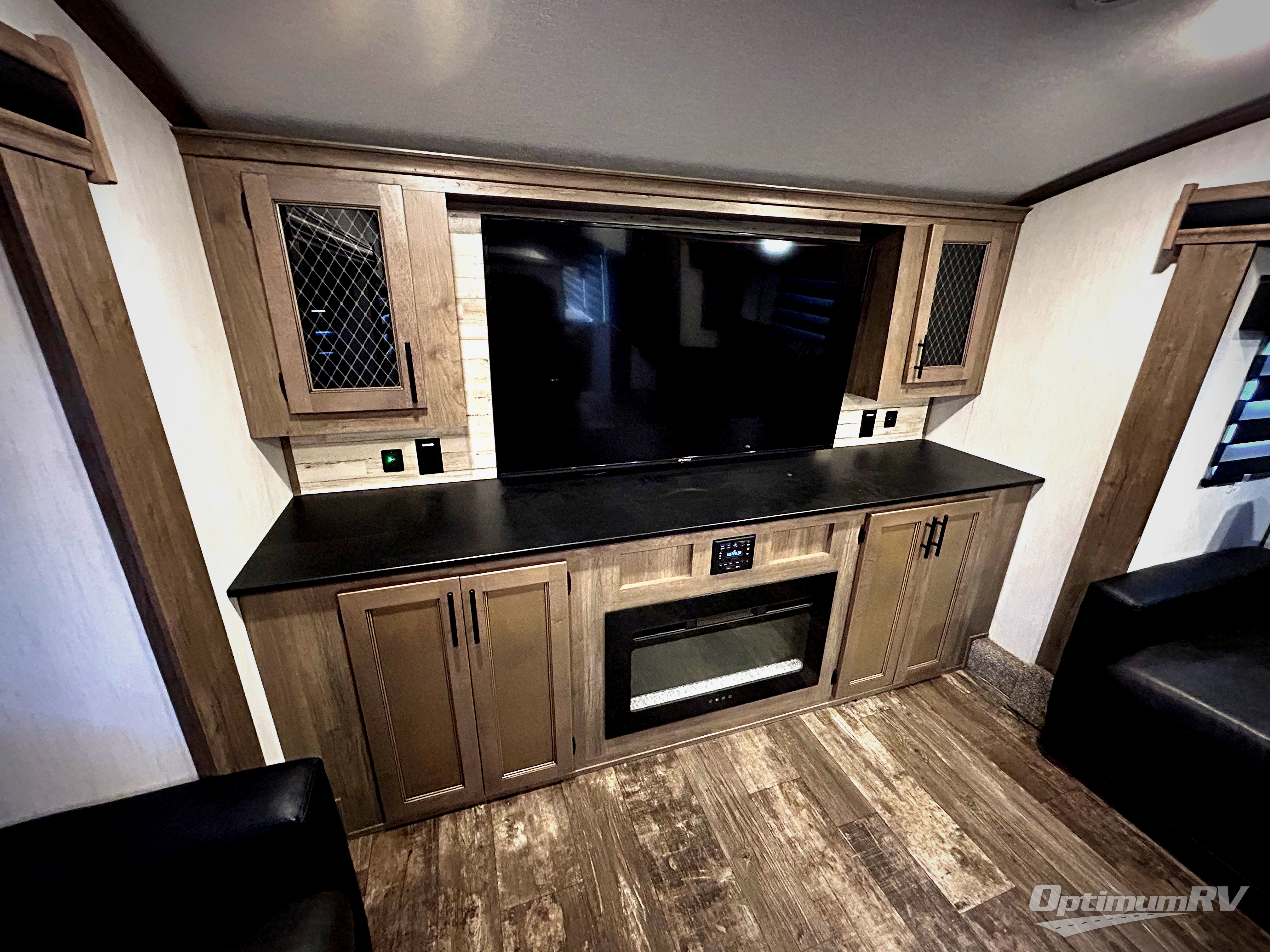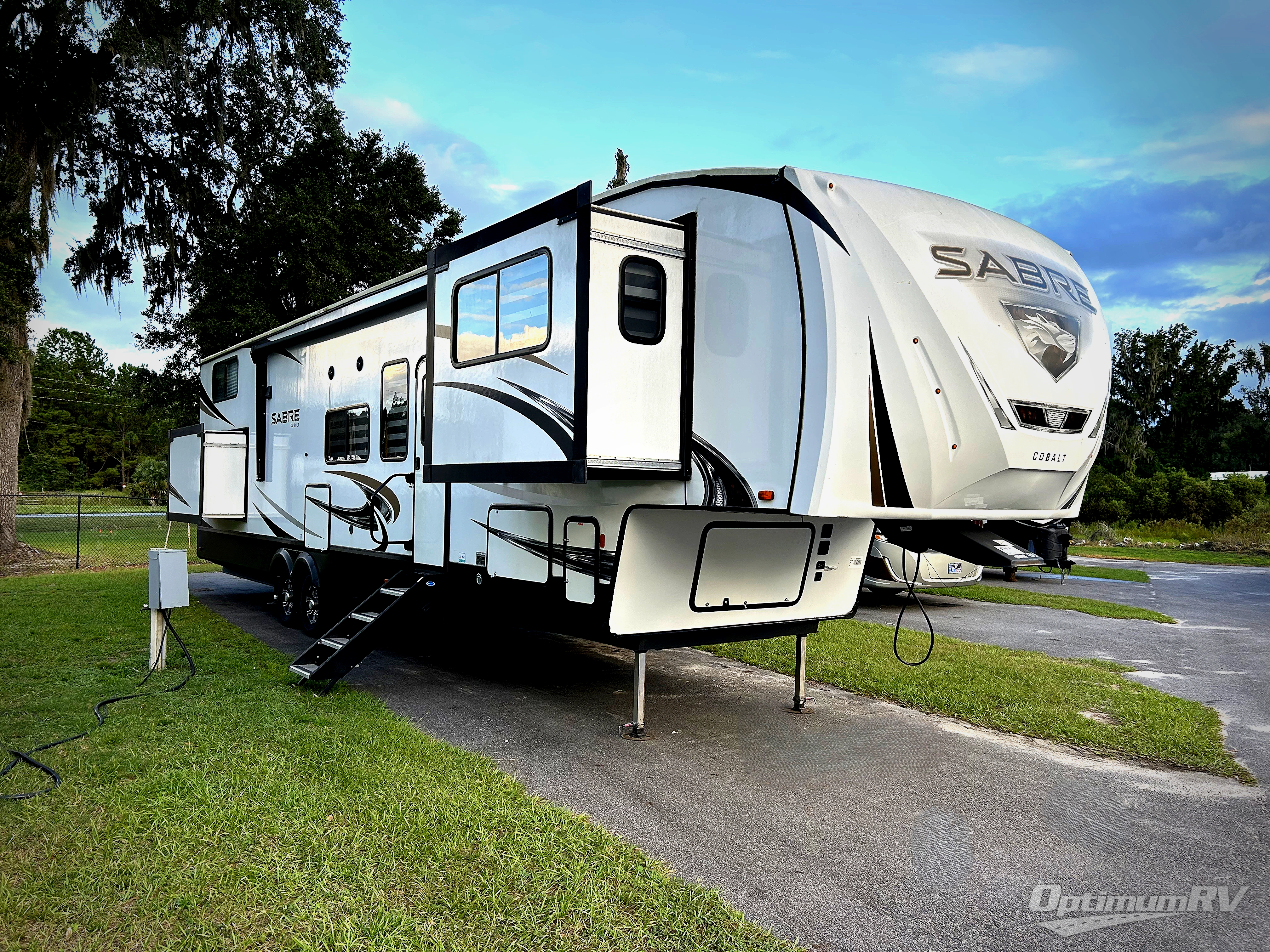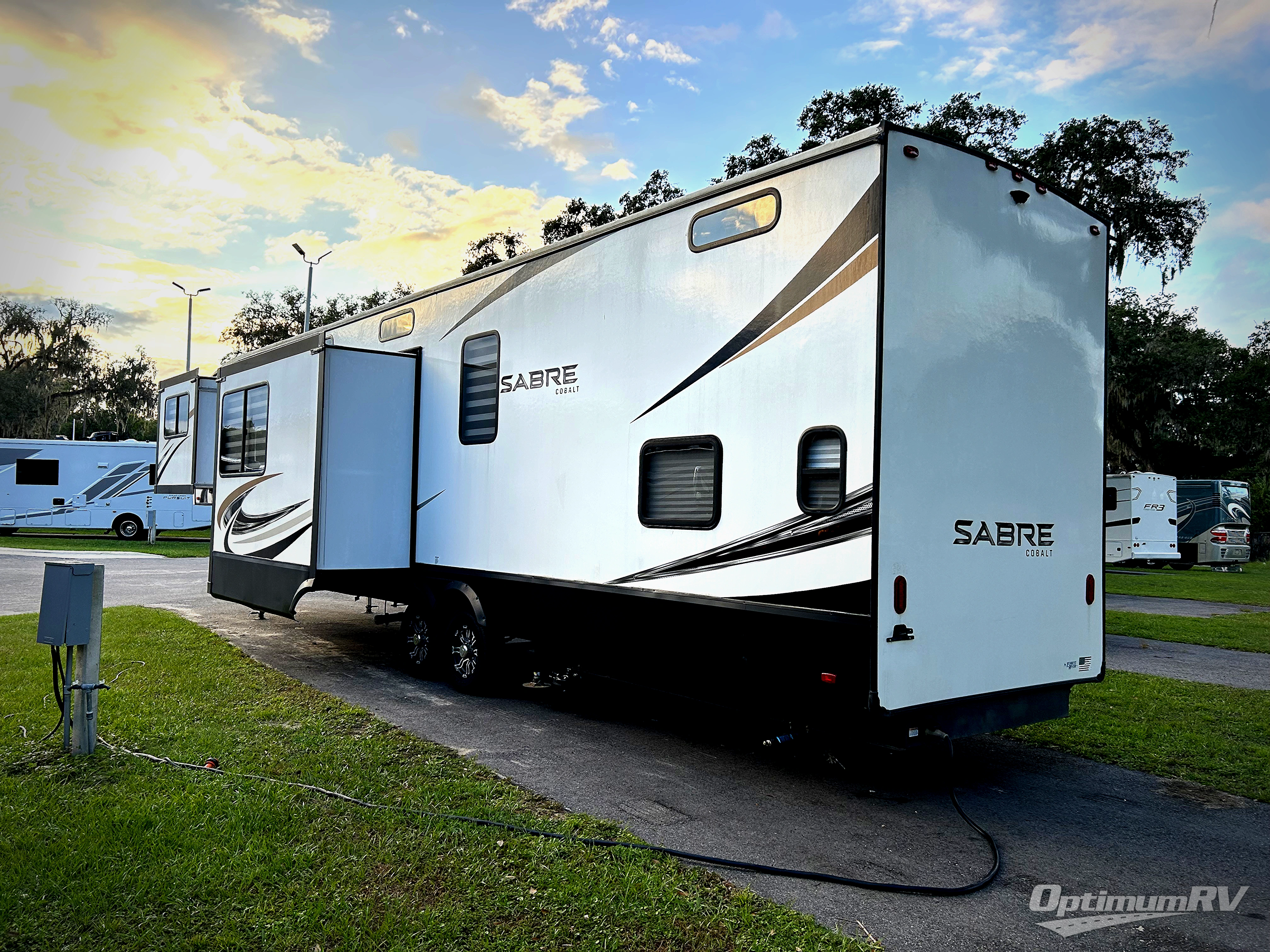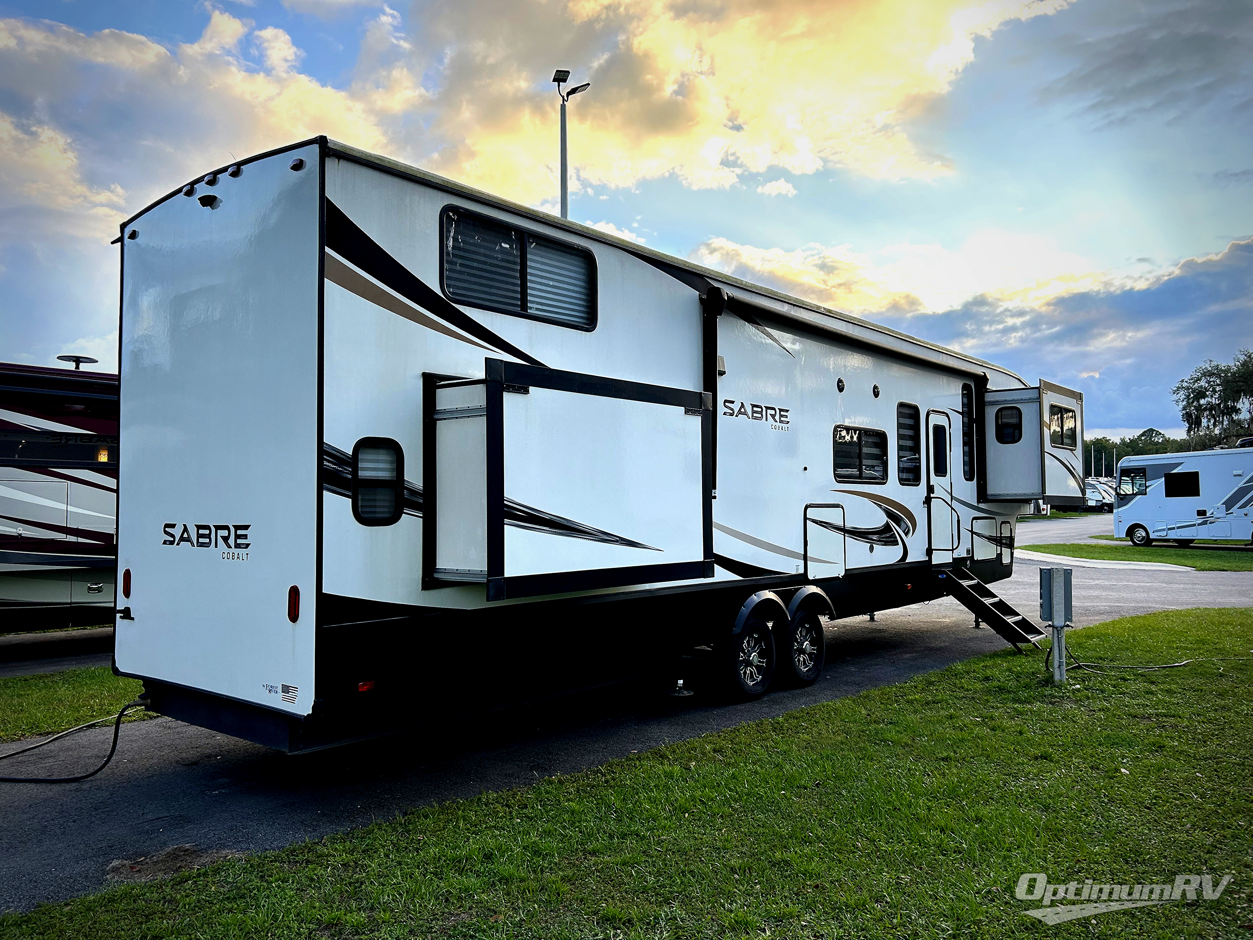 You will experience luxurious camping trips at an affordable price with any one of these Forest River Sabre fifth wheels! These models are durable and ready to travel anytime of the year thanks to features like the high-gloss gel-coat front cap with LED lighting, the PVC roof membrane, and the forced air underbelly with enclosed gate valves. The electric auto-leveling system makes setting up easy and safe, and the adjustable power awning with LED lighting will create an inviting outdoor living space. Each model includes a universal docking station which includes a black tank flush and an outside shower, and the backlit "Secure Step" landing for you to enter and exit the unit safely. Inside, you will love the design of the ambient accent lighting above the crown molding in the living area, the real wood lumbercore cabinetry, and the vintage gaslight decorative lighting!