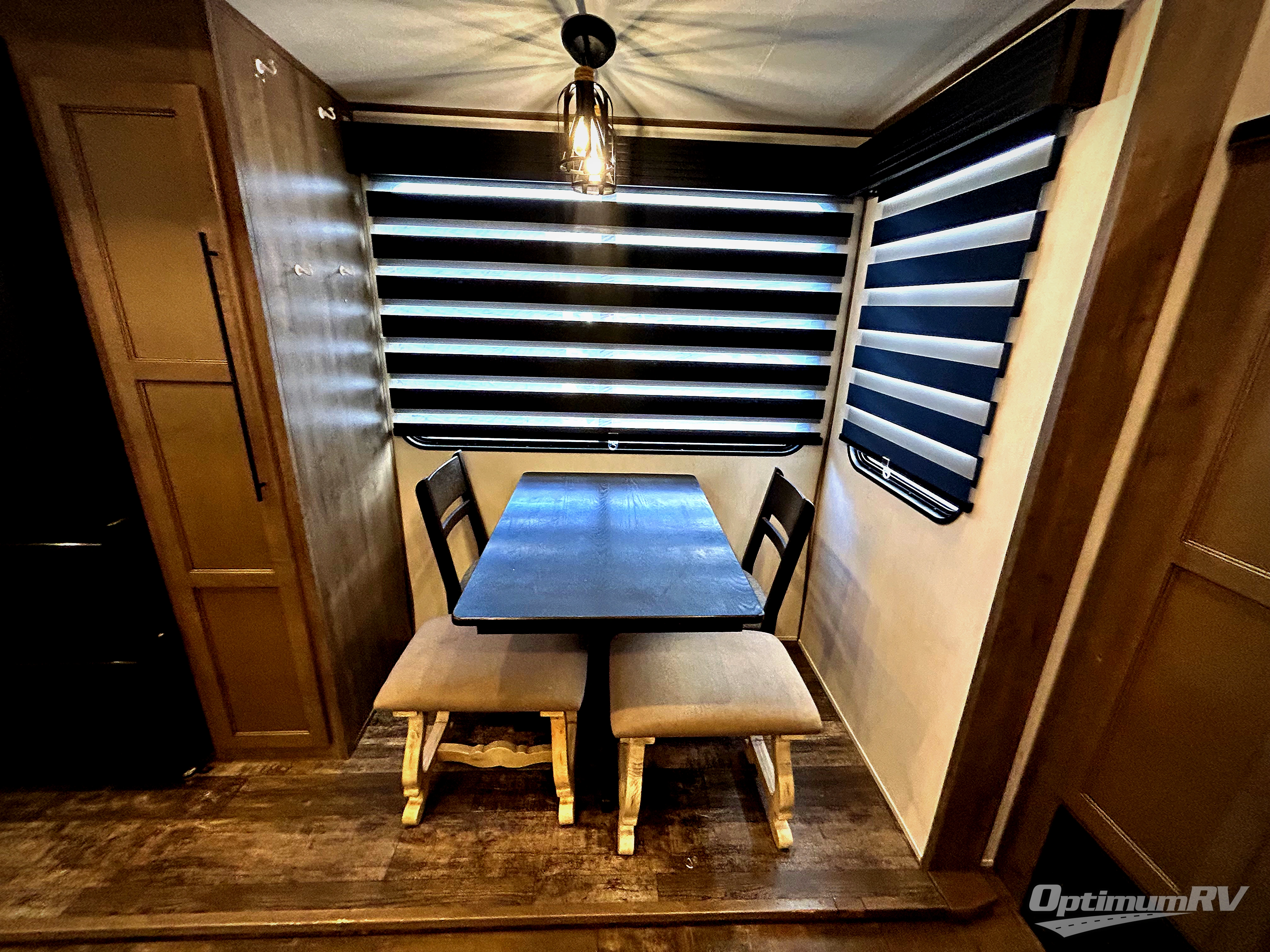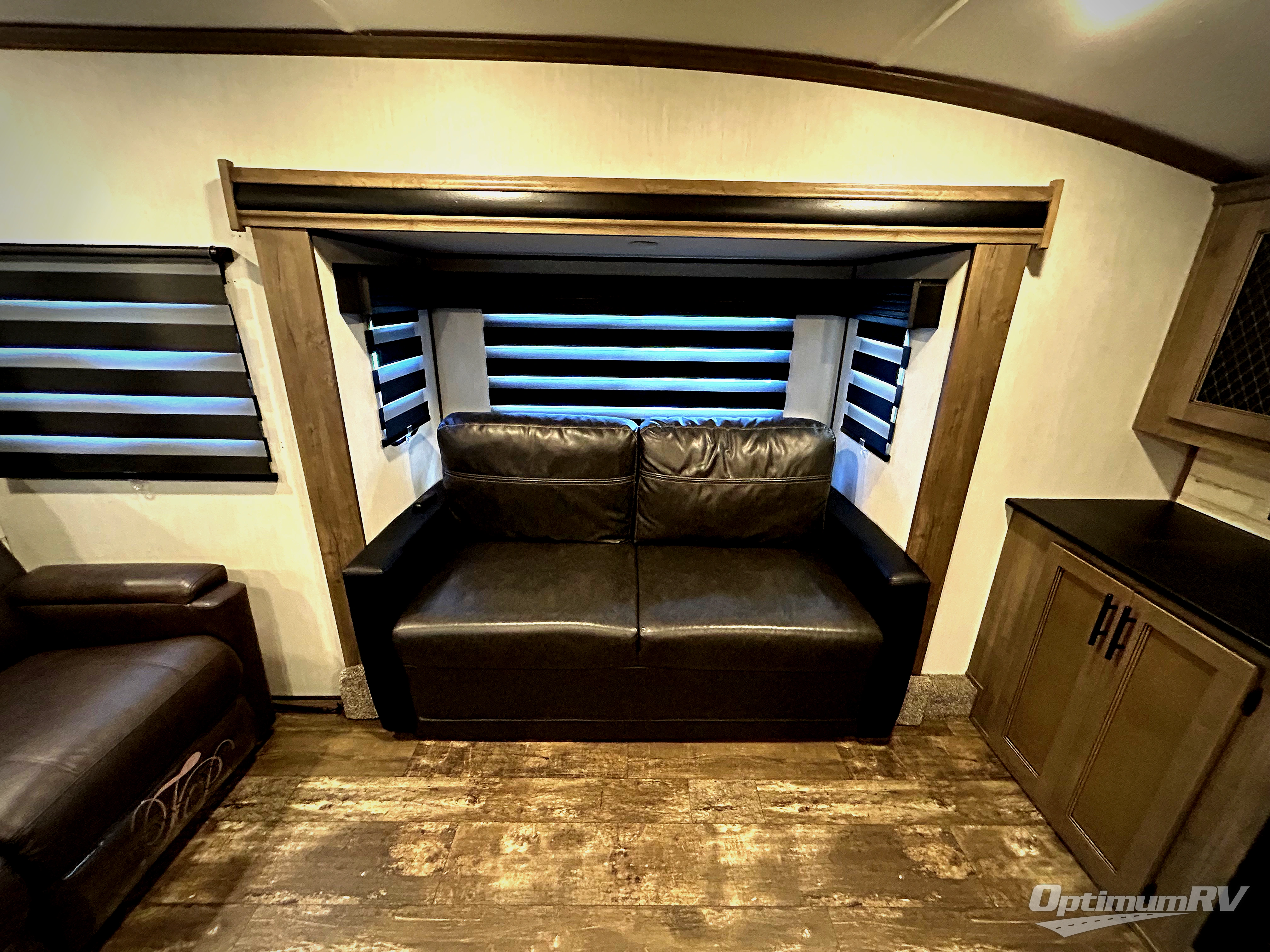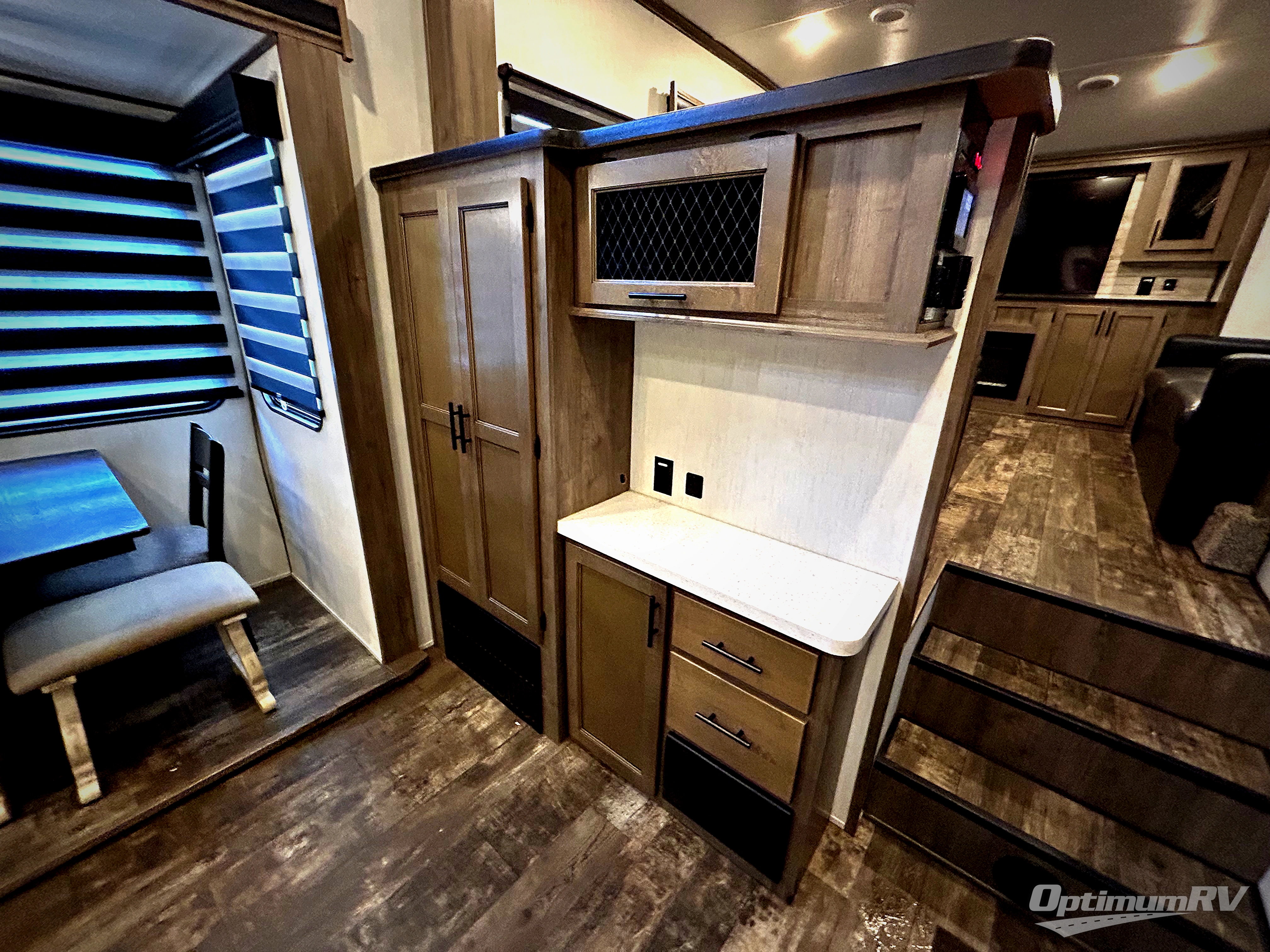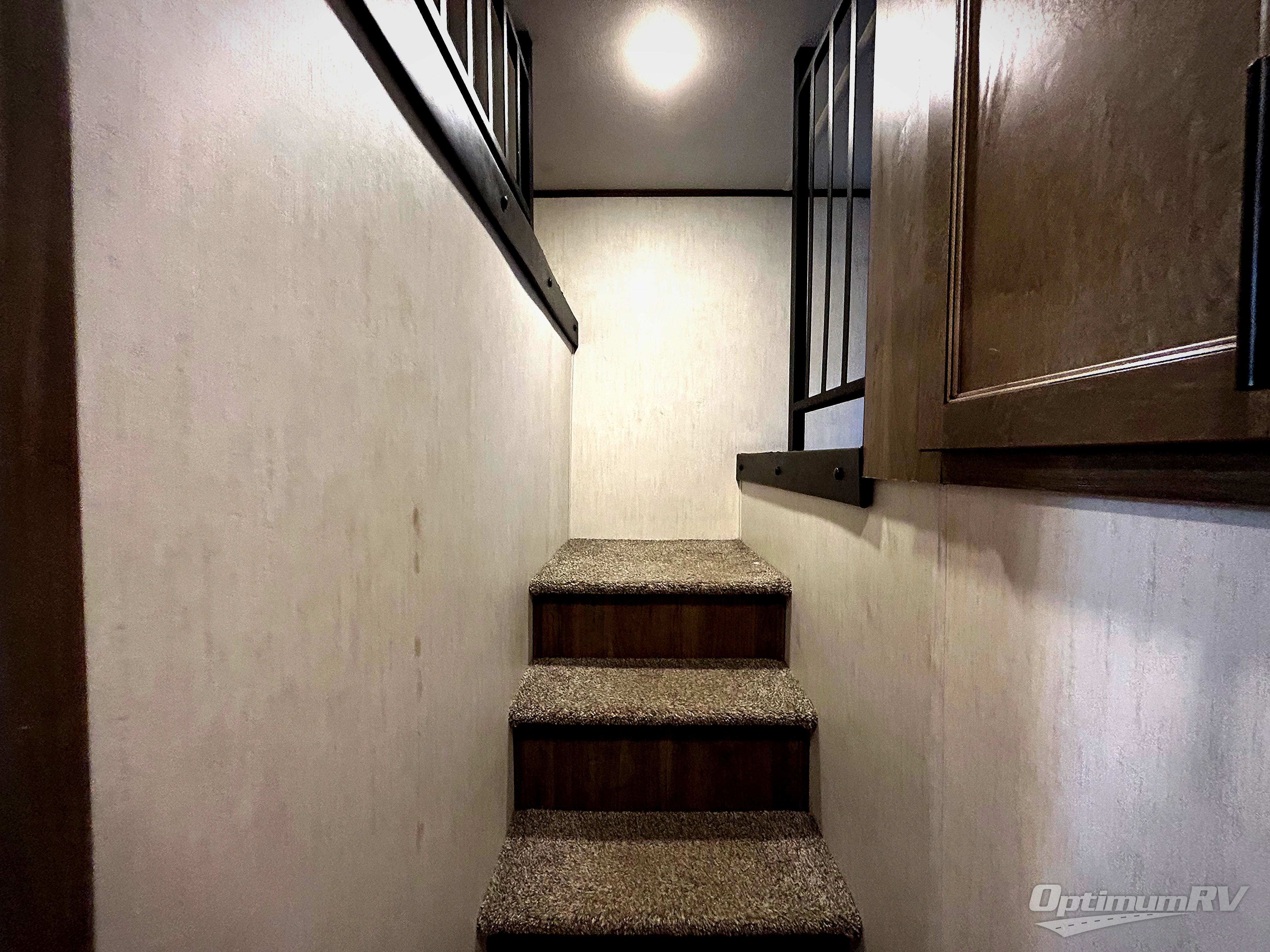 There is only one word that can describe this Sabre fifth wheel: fabulous! You will be amazed by the amount of comfortable convenience that is scattered all throughout this model for you and your family or friends. From the tri-fold sofa slides, the theater seats, the fireplace and entertainment center in the front living room to the rear bedroom with its queen bed and wardrobe slide out, you will always have a place to relax and unwind. Not only that, but there is also a large loft area up above the bedroom and bath which has sleeping space, storage, a wardrobe, and railing. The cook will enjoy the 12V refrigerator with French doors and pantry for all of your food storage needs, and the free-standing table with chairs is the perfect place to sit down and enjoy a delicious meal or play board games.