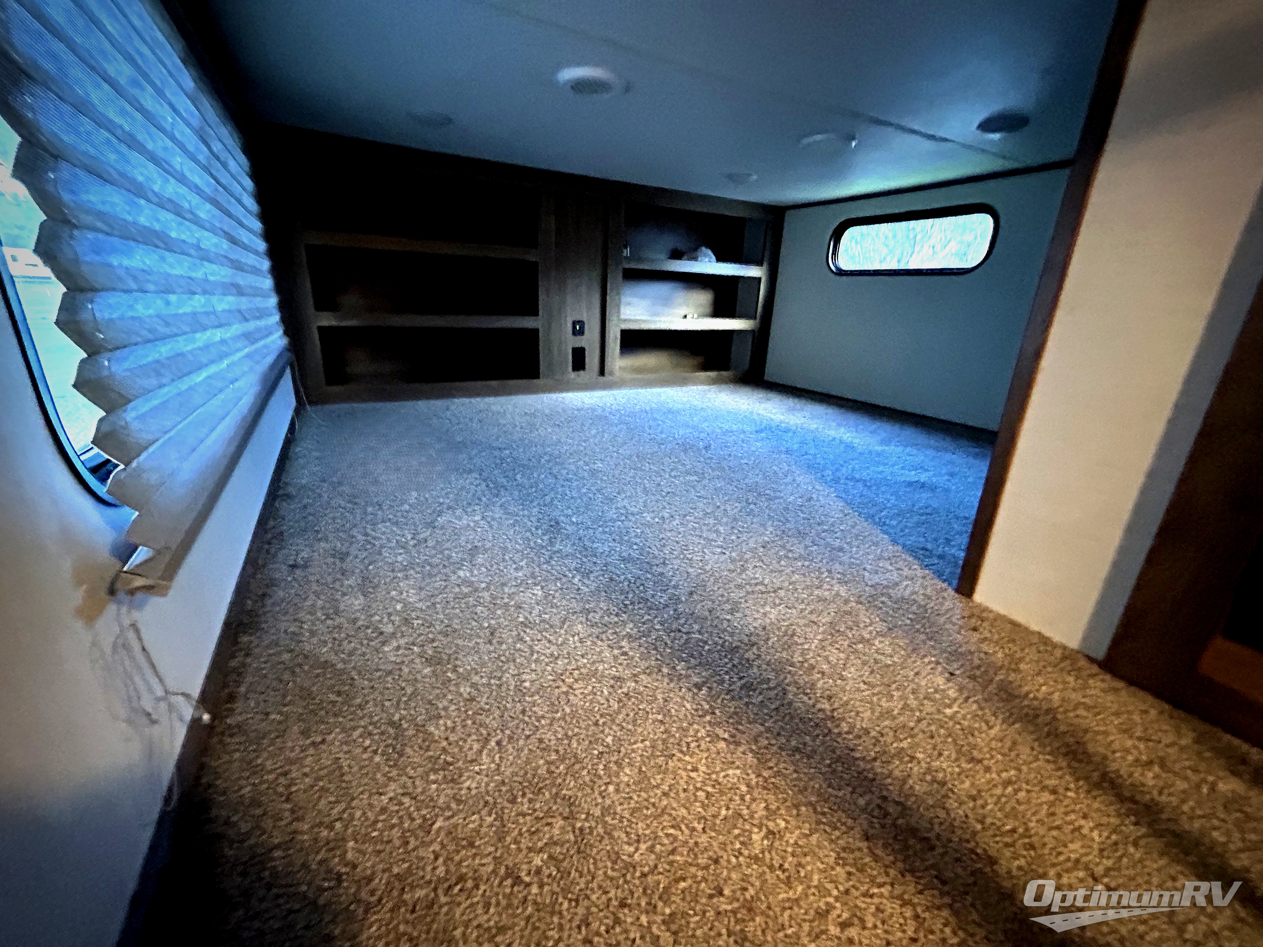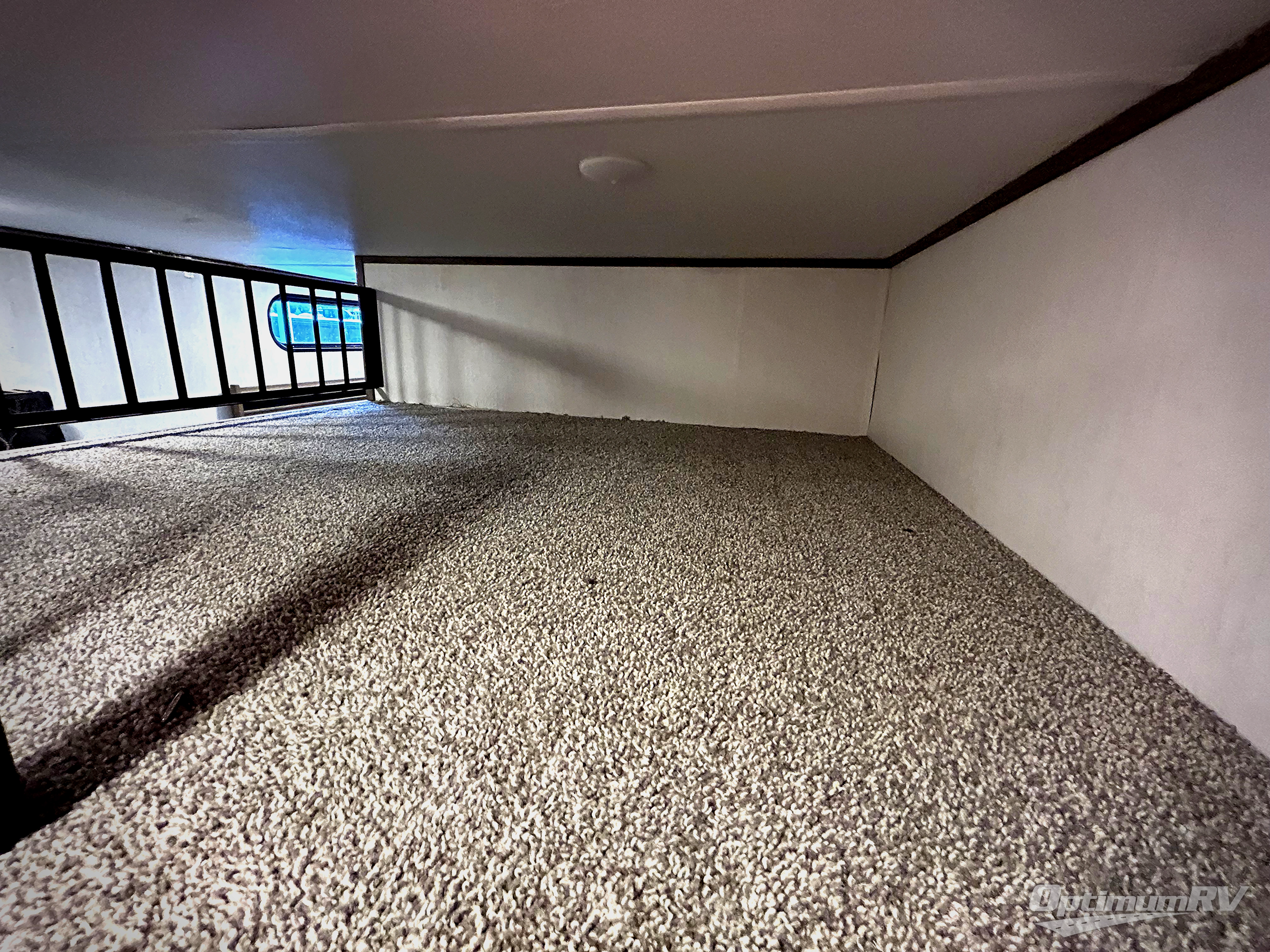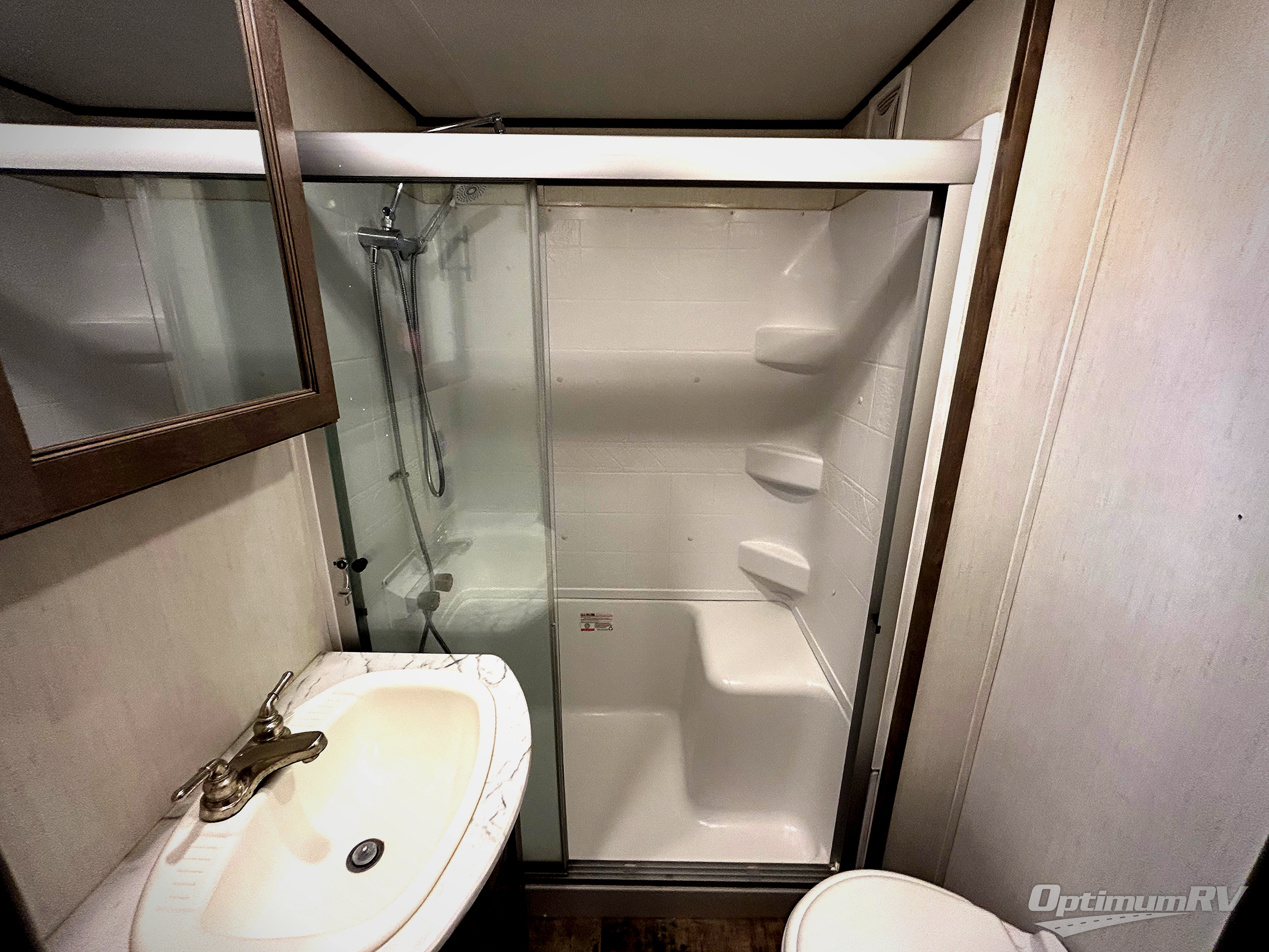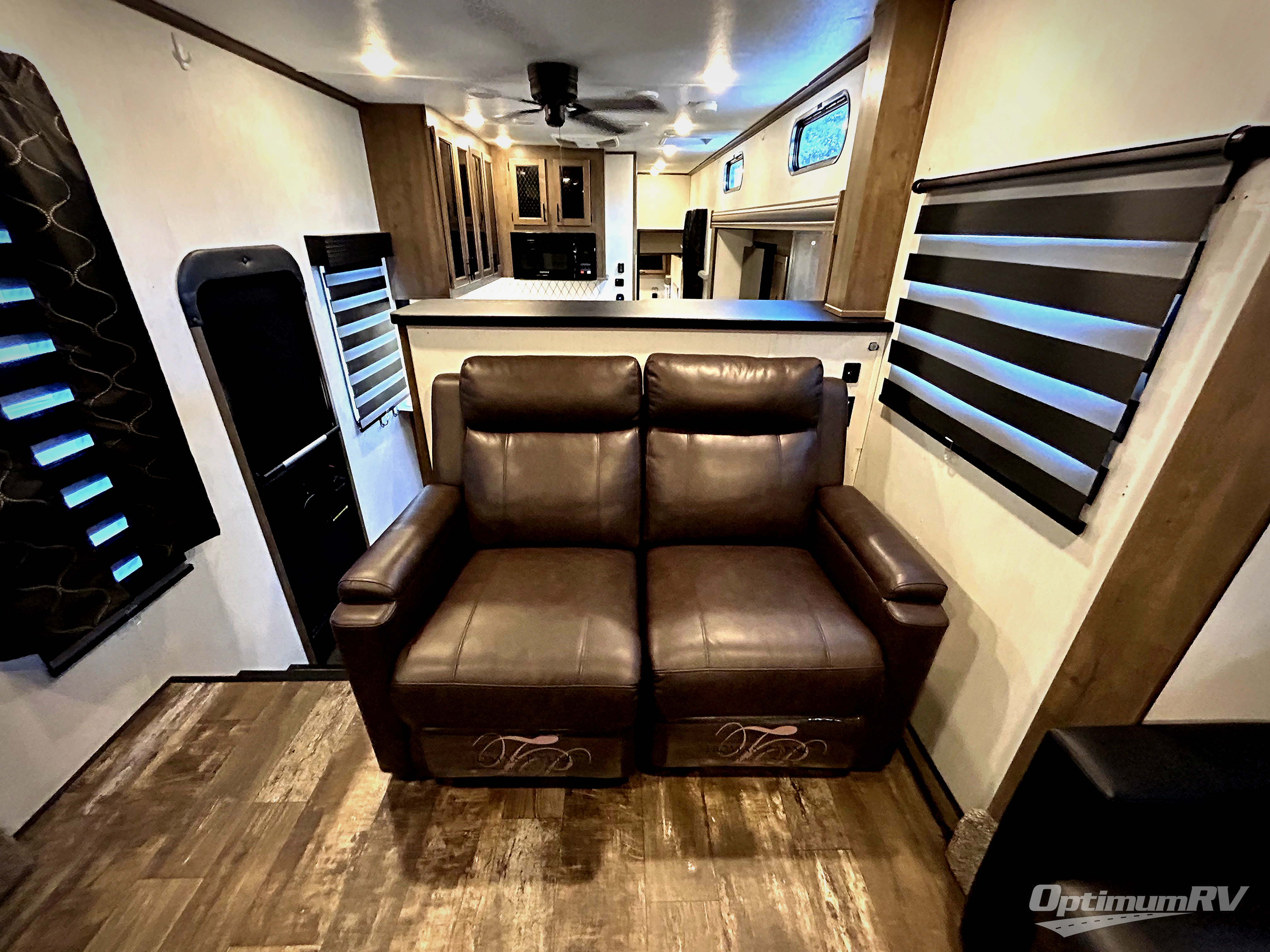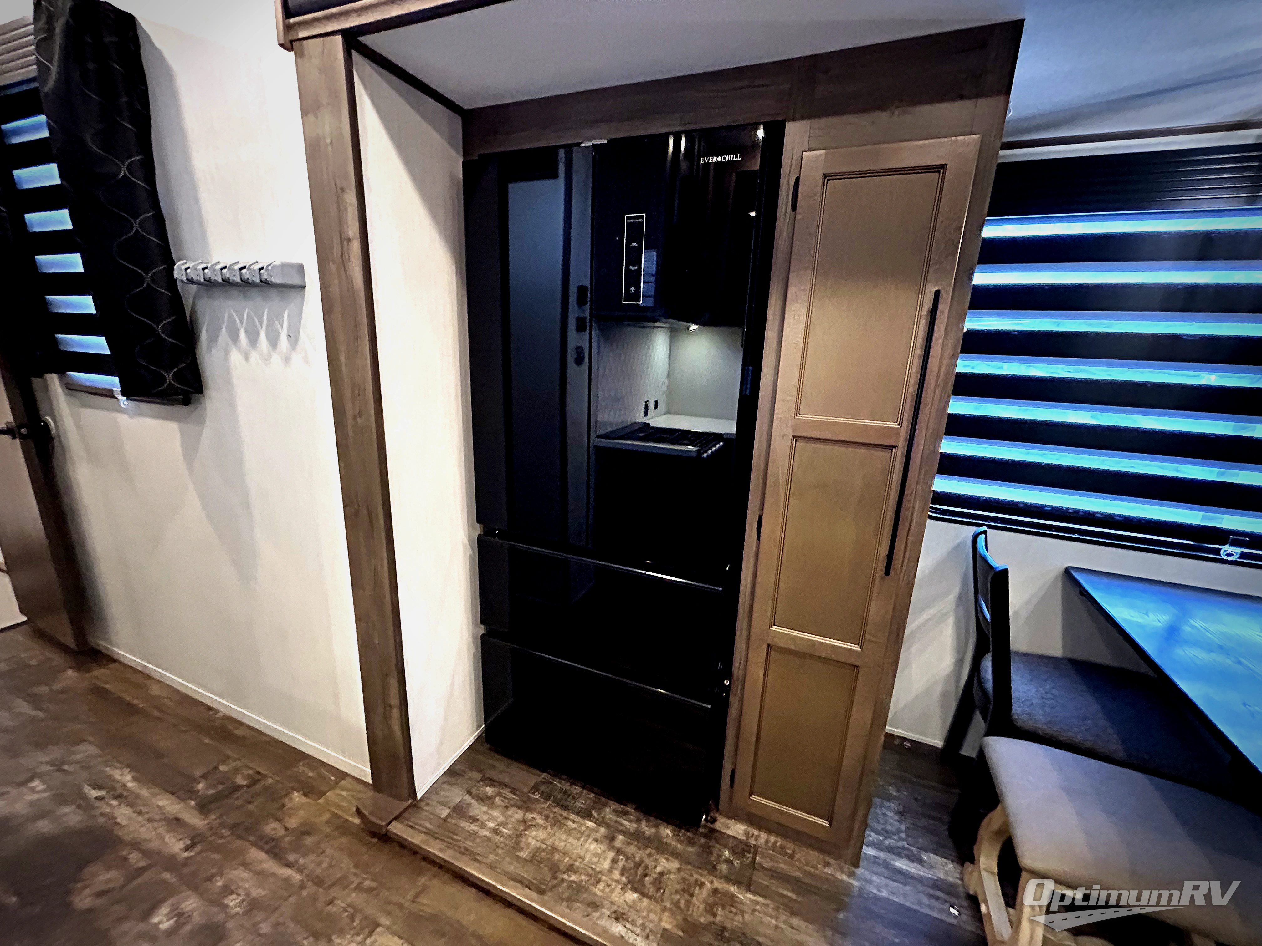 There is only one word that can describe this Sabre fifth wheel: fabulous! You will be amazed by the amount of comfortable convenience that is scattered all throughout this model for you and your family or friends. From the tri-fold sofa slides, the theater seats, the fireplace and entertainment center in the front living room to the rear bedroom with its queen bed and wardrobe slide out, you will always have a place to relax and unwind. Not only that, but there is also a large loft area up above the bedroom and bath which has sleeping space, storage, a wardrobe, and railing. The cook will enjoy the 12V refrigerator with French doors and pantry for all of your food storage needs, and the free-standing table with chairs is the perfect place to sit down and enjoy a delicious meal or play board games.