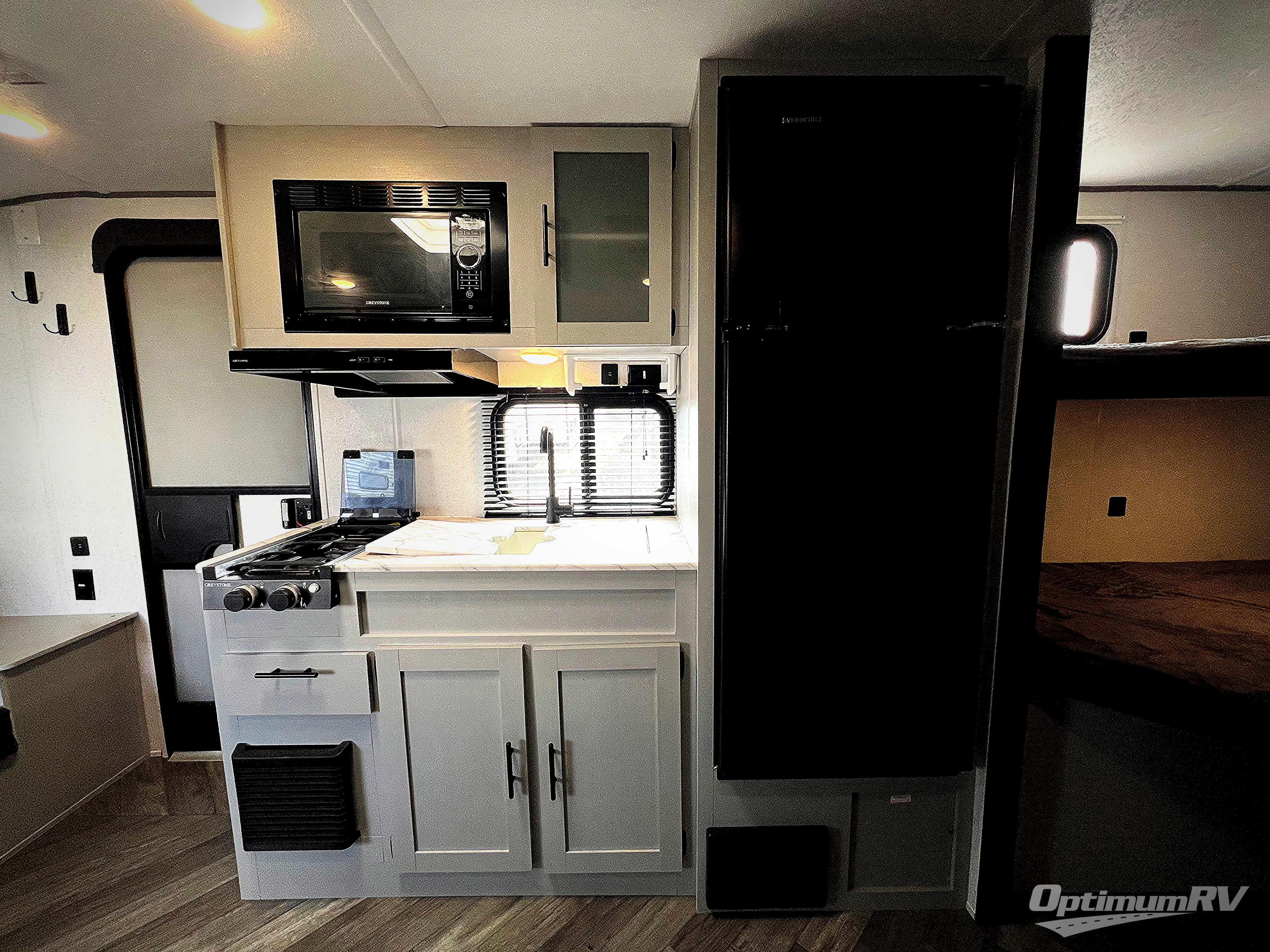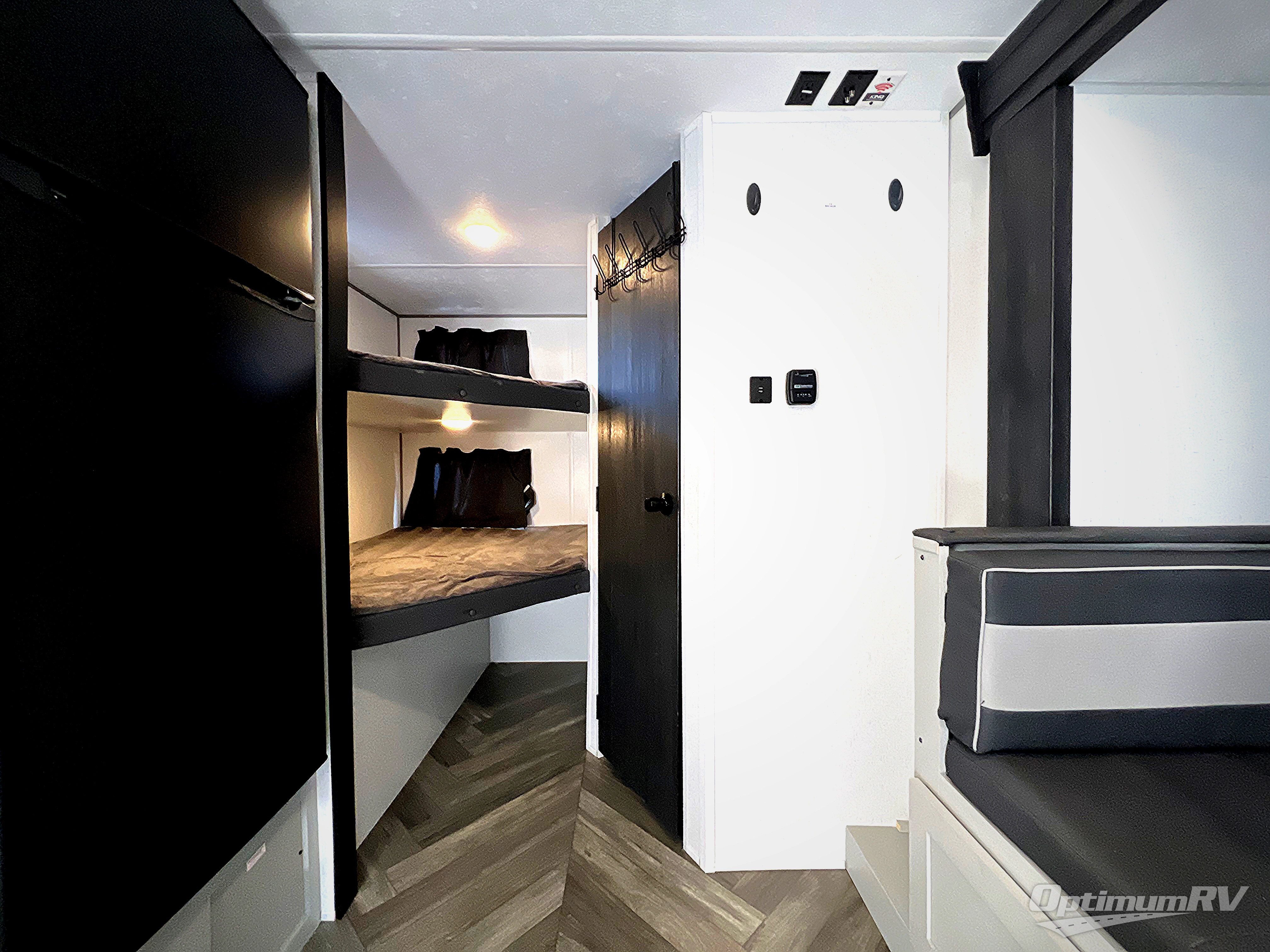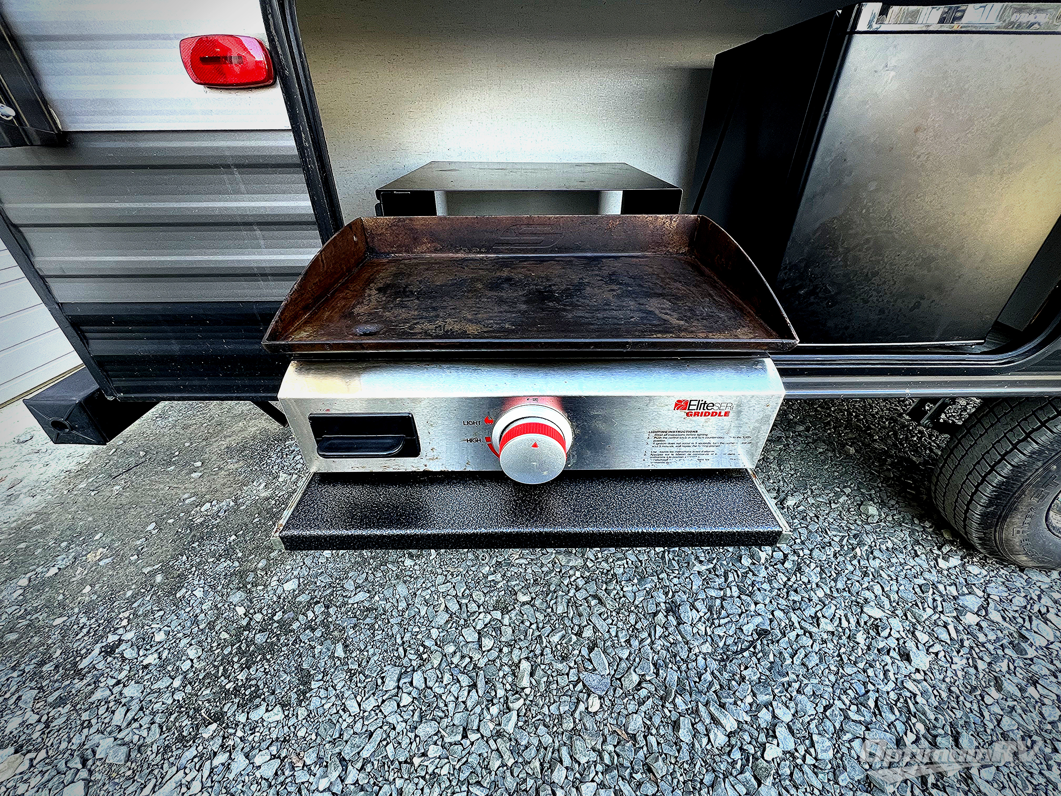 Start camping the right way in this travel trailer! It features a front Murphy bed that has a 60" x 74" queen bed to sleep on and a sofa with storage access to sit on during the day. The corner set of 48" x 72" double bunk beds come with storage to keep things out of the way and are conveniently next to the rear corner bathroom which has a 36" x 24" shower to freshen up in each morning. You can prepare your best home cooked meals indoors with the two burner cooktop or head to the outside LP griddle to fry up some burgers while breathing in some fresh air. Enjoy your meals, play card games, and even sleep at the U-shaped dinette slide. You will also appreciate the outside shower and the exterior front oversized door for storage access.