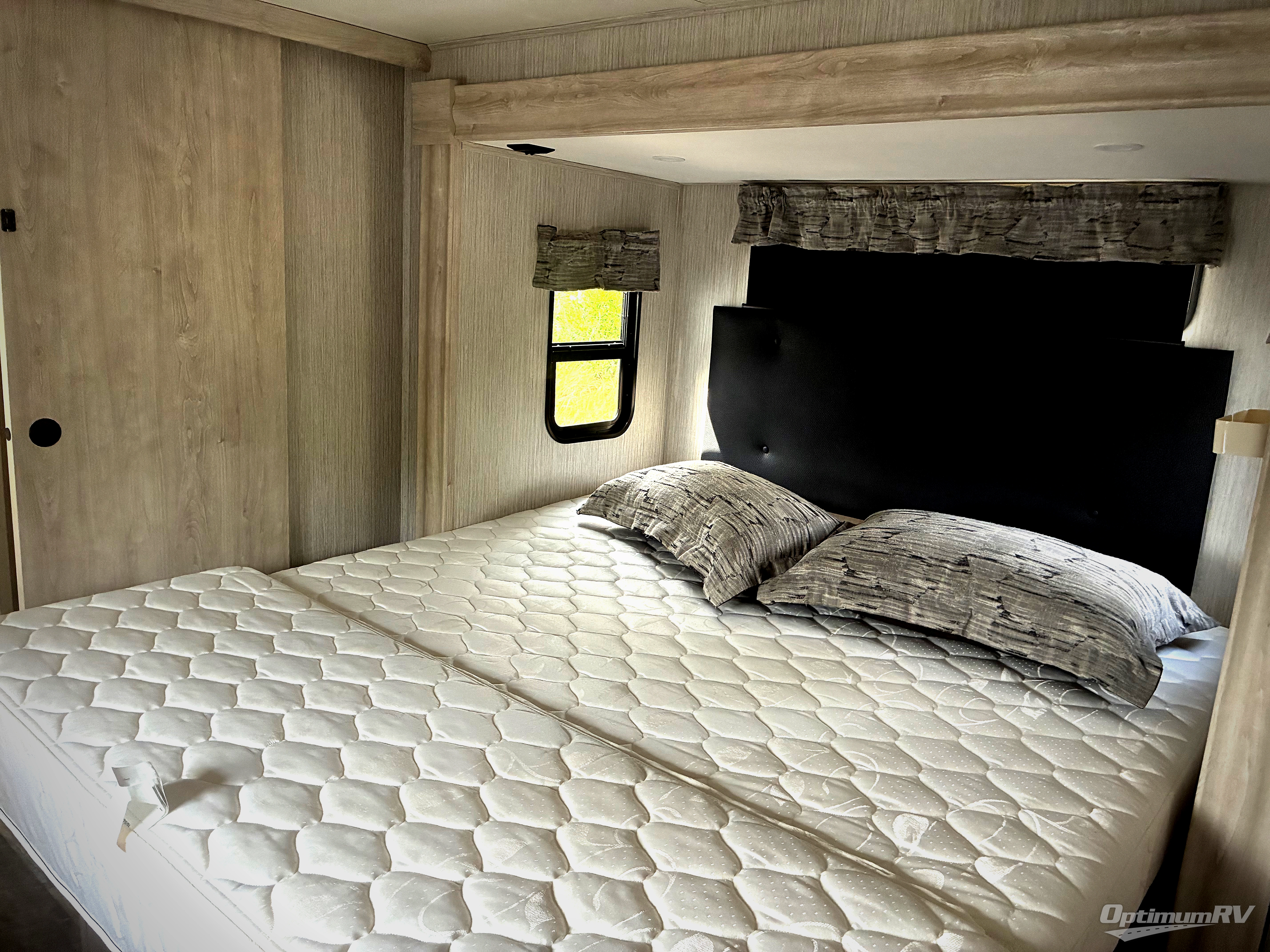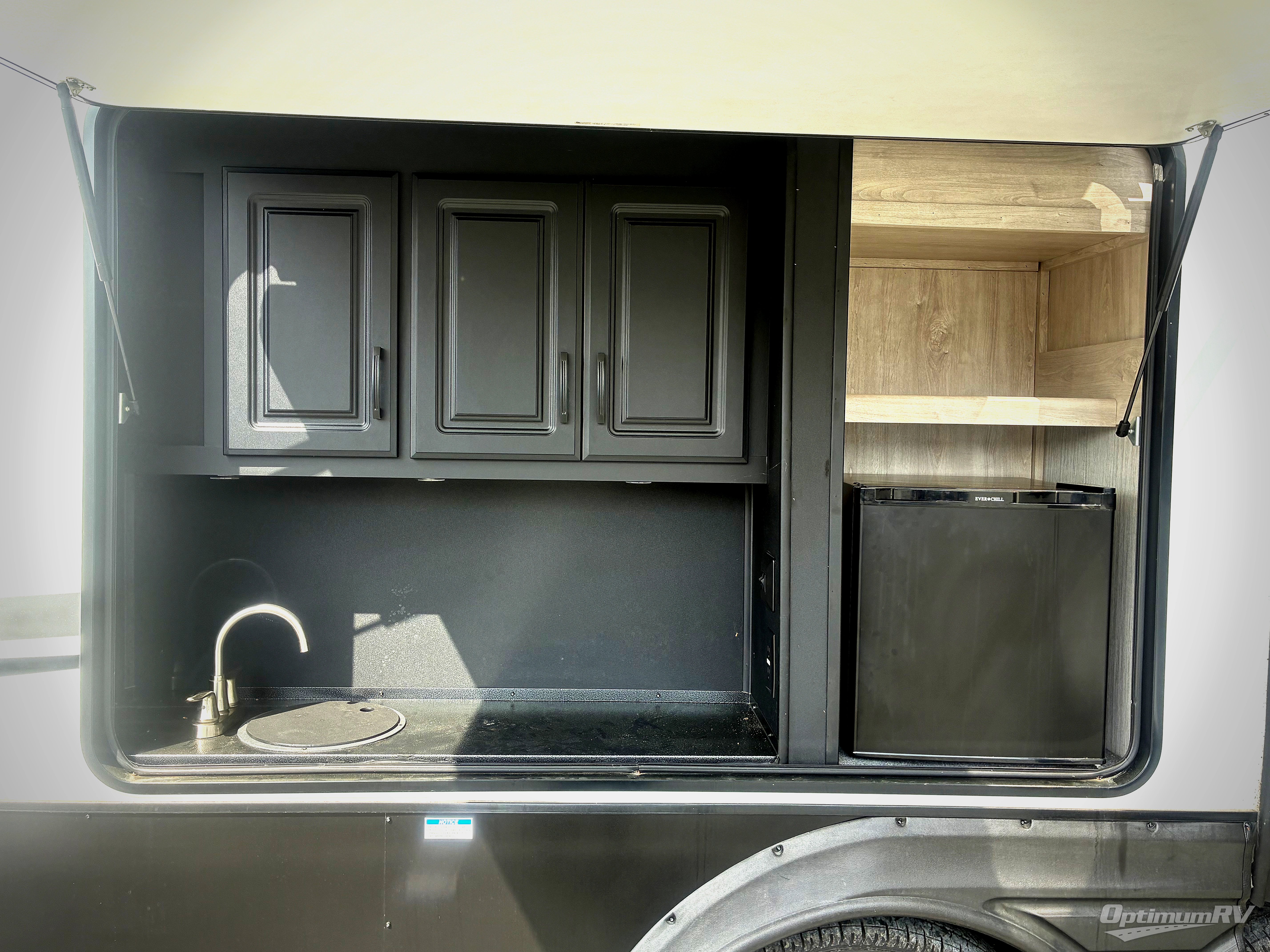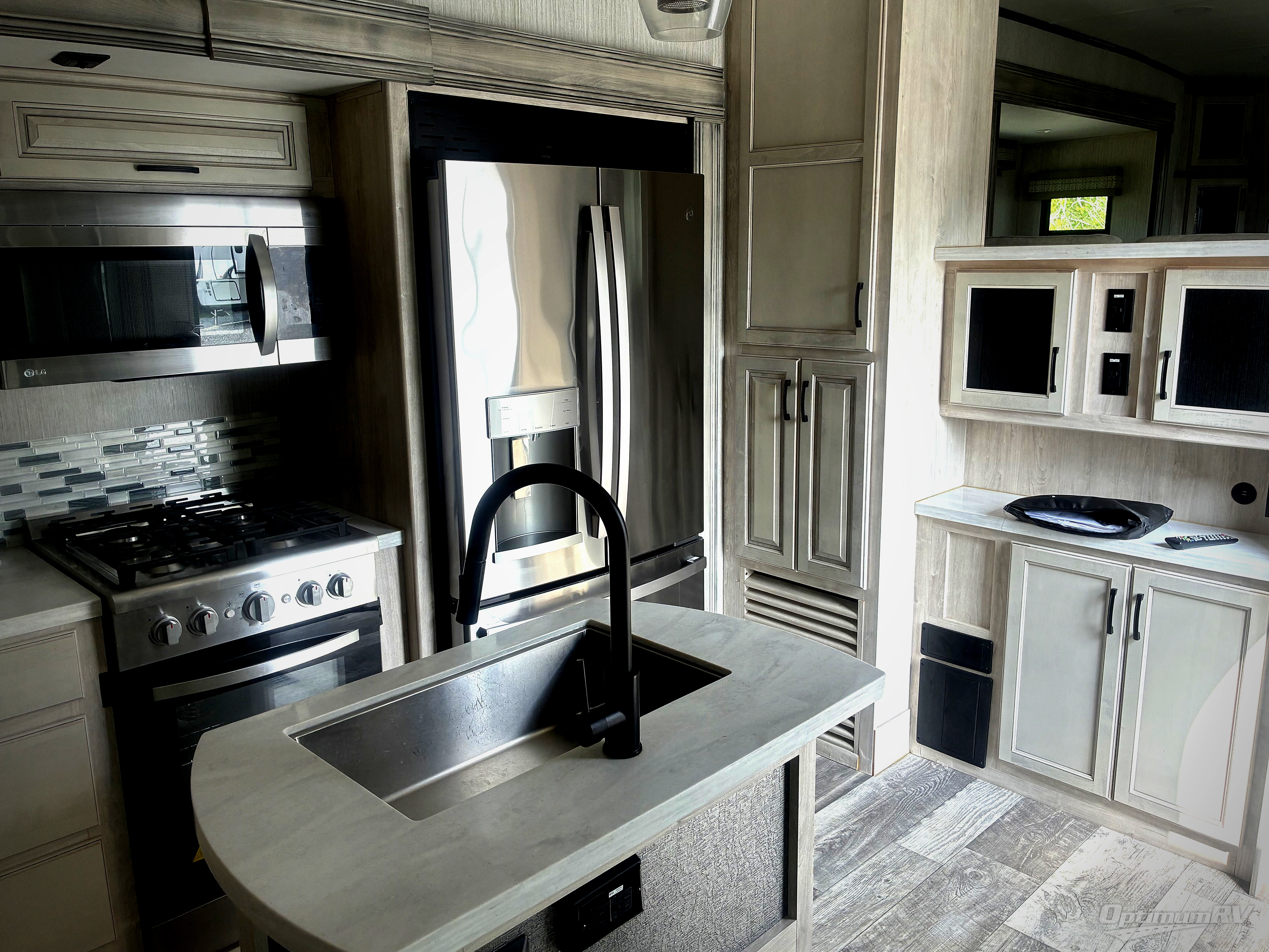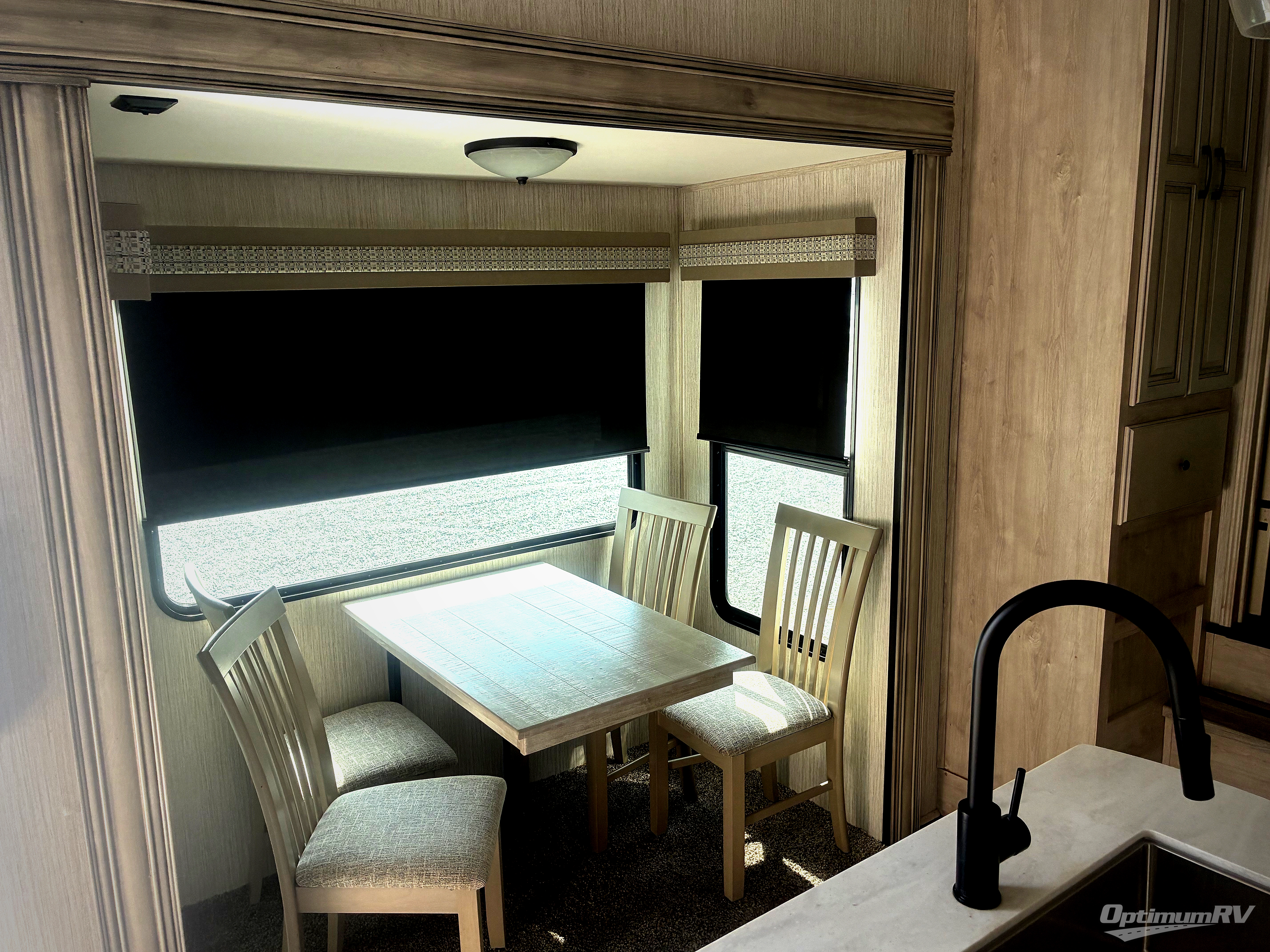 The best adventures will be had in this Sierra Luxury fifth wheel! The rear master suite is excellent because it has its own full bathroom with a dual-sink vanity, and the other half bathroom is located just off the kitchen so that everyone else can use it to freshen up. Above the kitchen is a ceiling fan which will be handy to use when you start working up a sweat while preparing dinner. The free-standing table with chairs is located here too so that you don't have to travel far to enjoy that freshly prepared meal. Head up to the front after dinner to lounge on the theater seating or one of the two tri-fold hide-a-bed sofas. You'll also be able to switch on the fireplace for a more cozy effect.