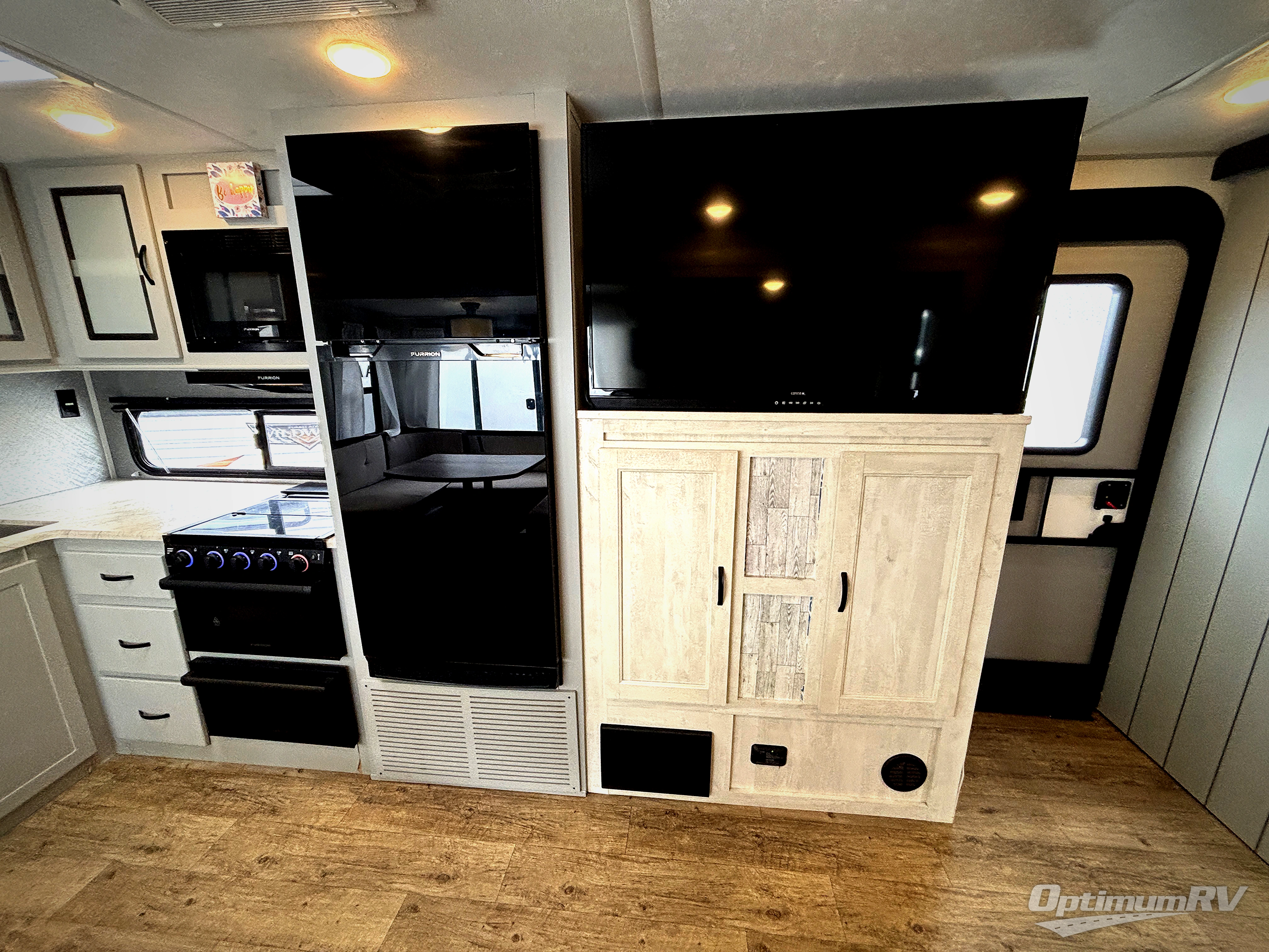 This travel trailer will feel just like home with a private bunkhouse for the kids, and a front master bedroom for mom and dad. The walk-though bath is both spacious and convenient, and the large slide out will provide enough space to let the dog nap on the floor. Play a game around the U-shaped dinette or relax on the sleeper sofa during movie night. The chef of the group can cook indoors or outdoors on the universal outside kitchen. There is even outside TV prep so you can bring your own TV to enjoy the big game outdoors!