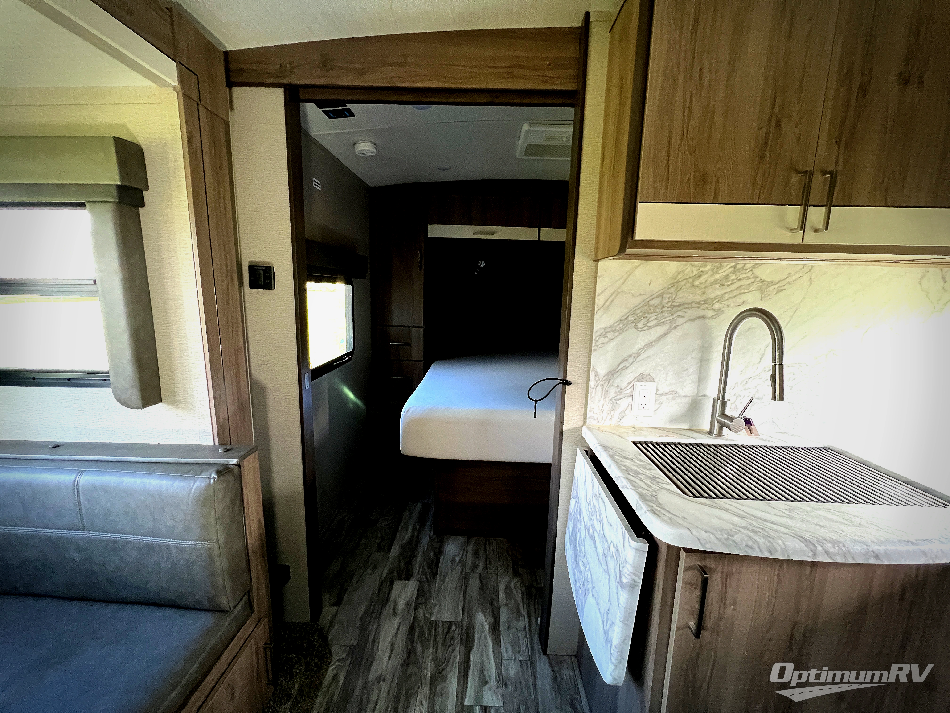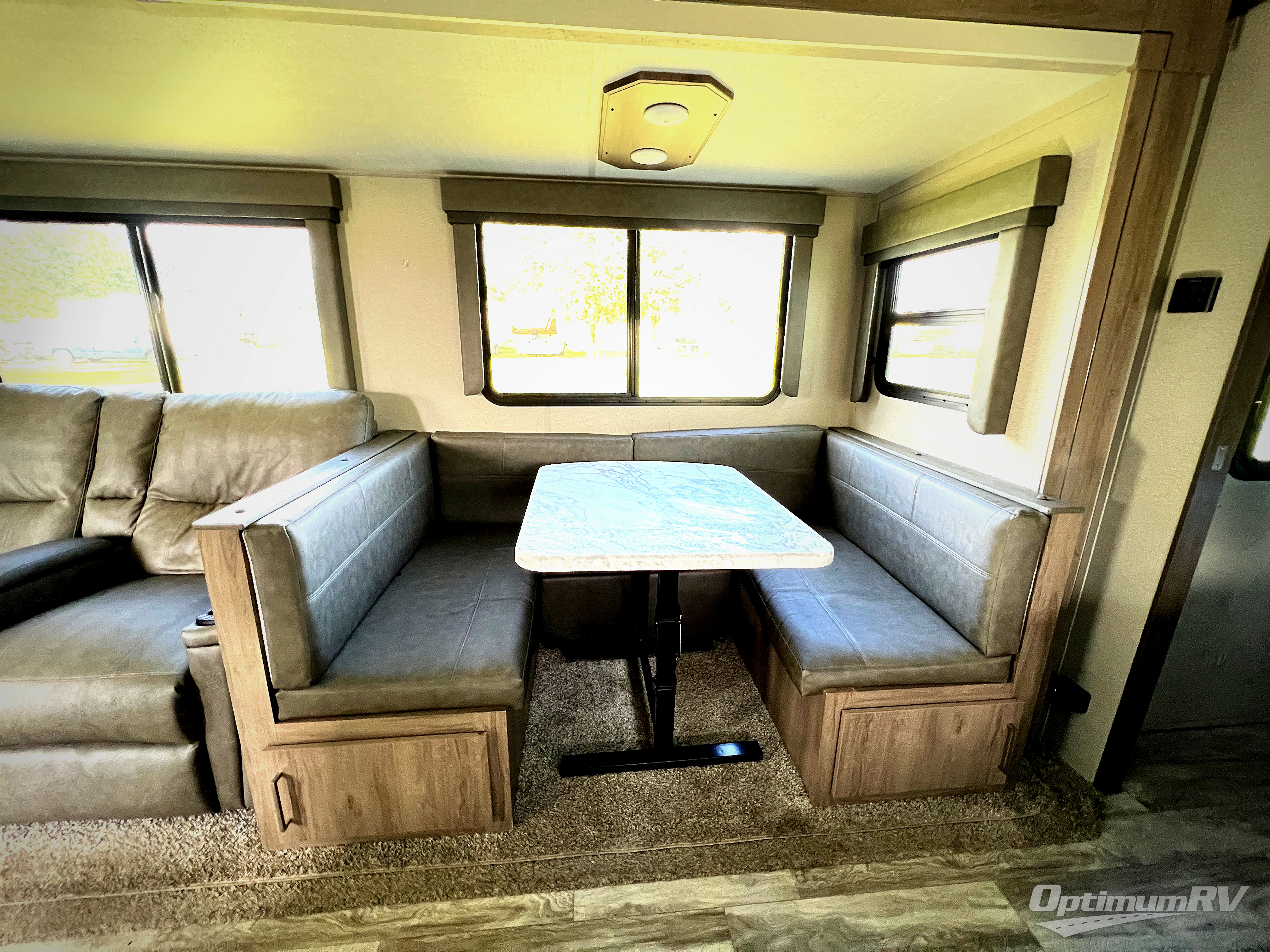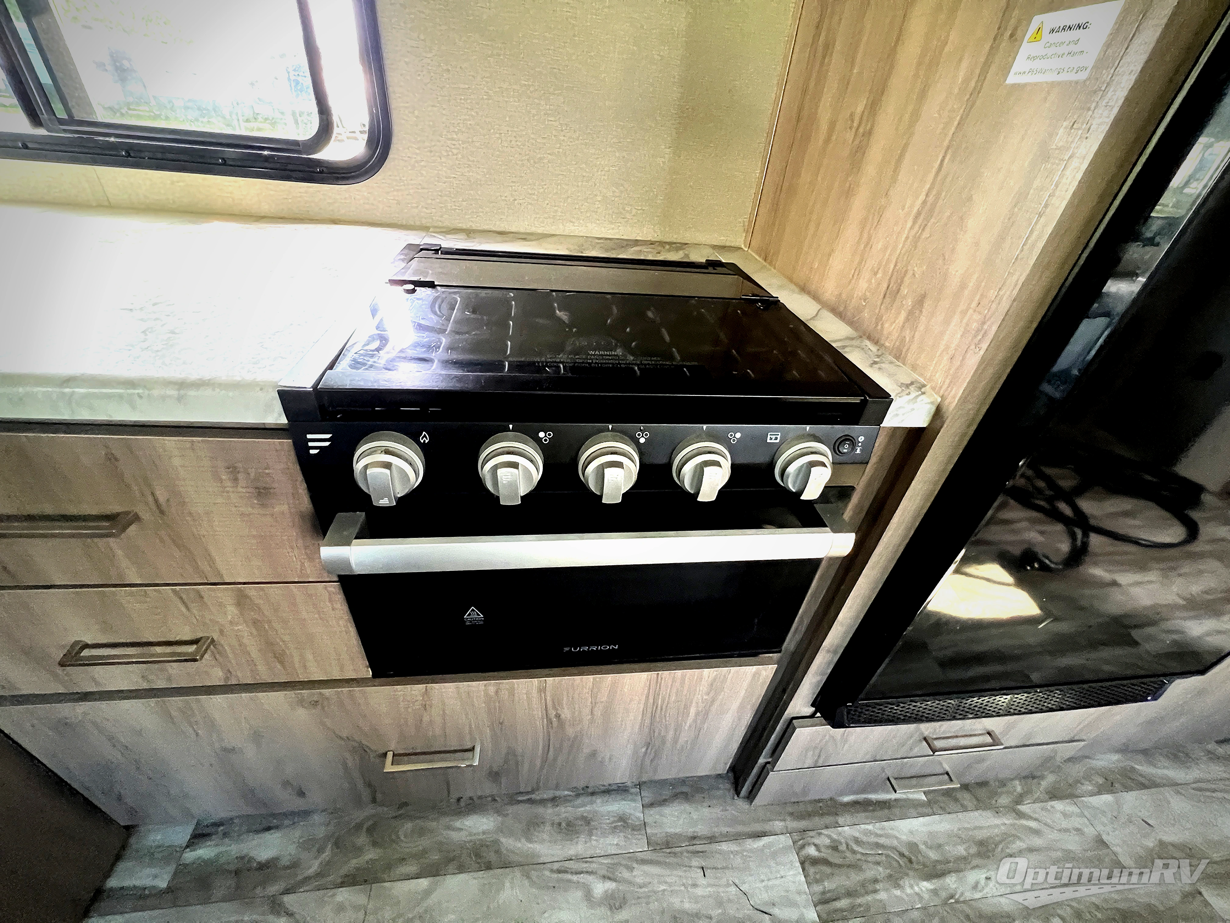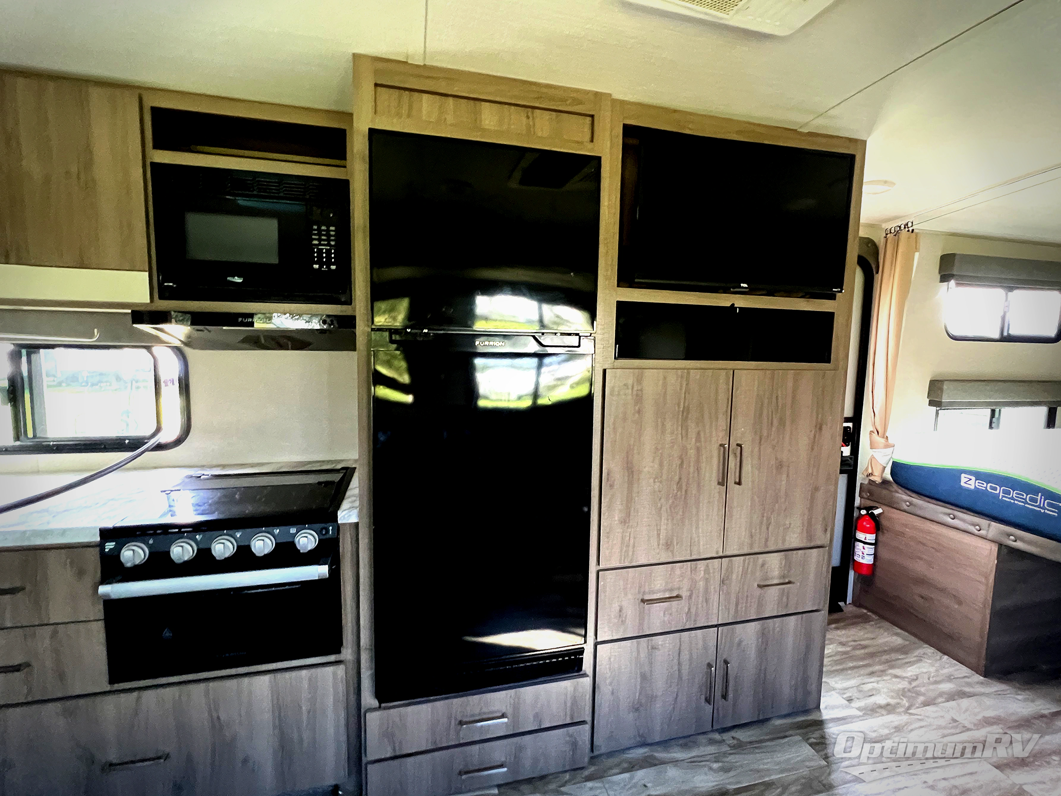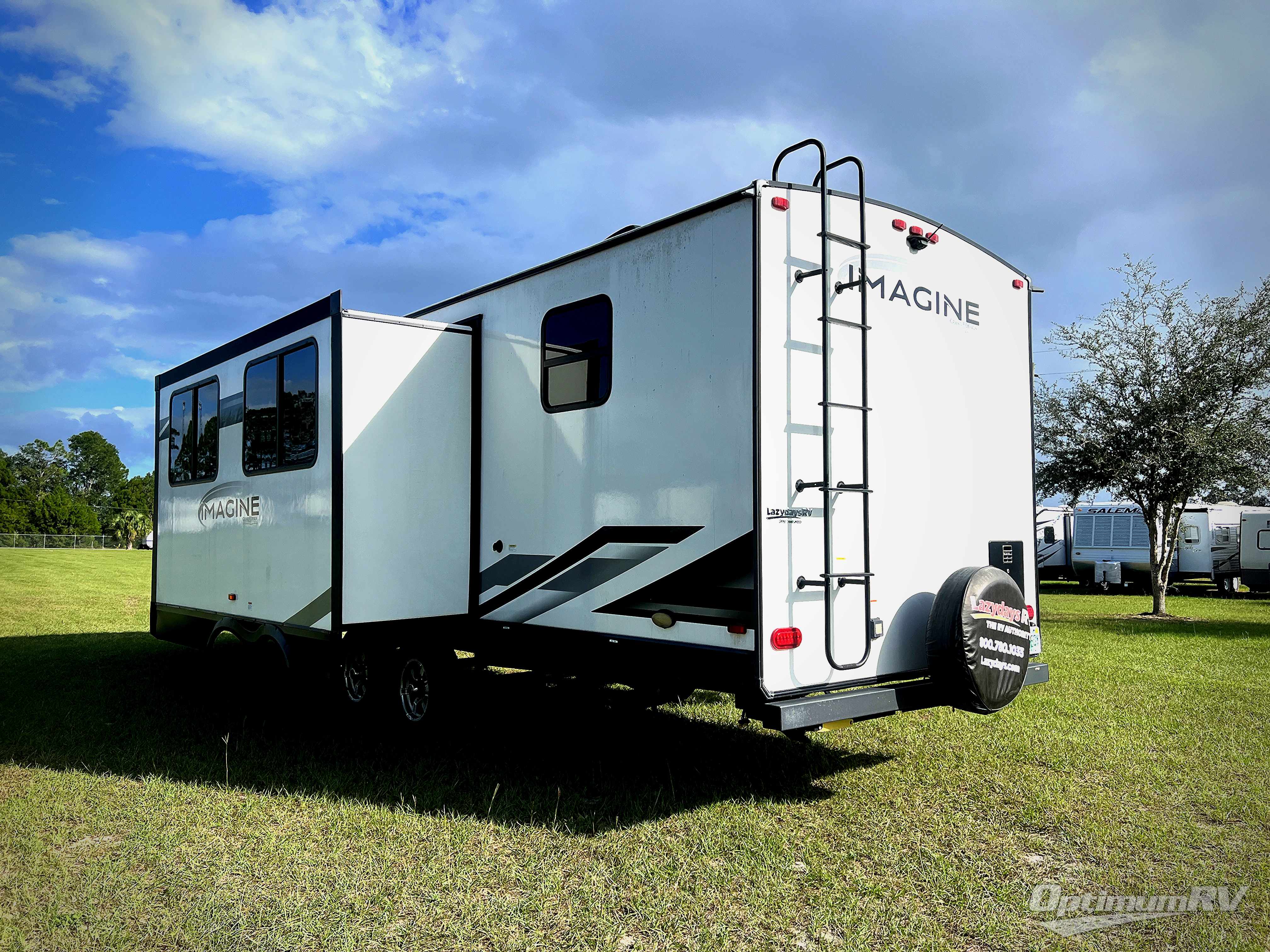 Where will you go with this Imagine travel trailer? The possibilities are endless! You can take your family on an exciting excursion because this trailer has enough sleeping space for everyone with the 60" x 80" bed in the private bedroom, the U-shaped dinette and tri-fold sofa in the main living area, and the 47" x 76" bunk beds with privacy curtains. You can come and go as you please with two entry doors, and the outdoor kitchen will be fun to use when the weather is nice. Your family's pet can eat out of the pet dish below the refrigerator, and the large slide will keep this trailer feeling spacious.