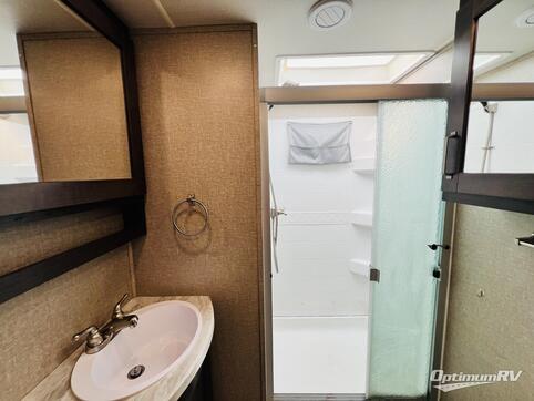 Enjoy a weekend getaway at a campground or off-grid in this fifth wheel! The front private bedroom has a queen bed for you to lay your head on at night and overhead cabinets to keep things out of the way. Inside the full bathroom there is a shower with a skylight for added natural lighting as you get ready each morning. Once you have prepared a delicious home cooked meal at the rear kitchen, head to the booth dinette for a comfortable place to enjoy it. What better way to wind down your nights than to relax on the 70" theatre seating and watch your favorite movie on the 40" LED HDTV. The theatre seats can also be switched out for an optional tri-fold seating if you would prefer that type of seating.