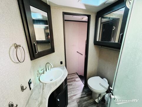 Whether you travel for pleasure or work, you will love the spacious main living and kitchen area with a rear tri-fold sofa that doubles as extra sleeping space, and the theatre seating directly across from the entertainment center with a 40" LED HDTV and a fireplace below. The kitchen island will make meal prepping and drying the dishes easier and the hutch is the perfect place to place your picture frames, nice dishes, and extra cooking items, plus the pantry is big enough to store all of your favorite snacks, dry ingredients and such. Outside you can enjoy two electric awnings that provide protection from the elements as you relax and visit with other RVers, and your camping chairs can easily be stored in the pass-through compartment. The double entry bathroom is convenient especially at night when you can slide the door to enter from the front master bedroom. You will find plenty of storage for your clothing and things, plus the bedroom slide out gives you drawers and linen storage that stretches into the full bathroom.