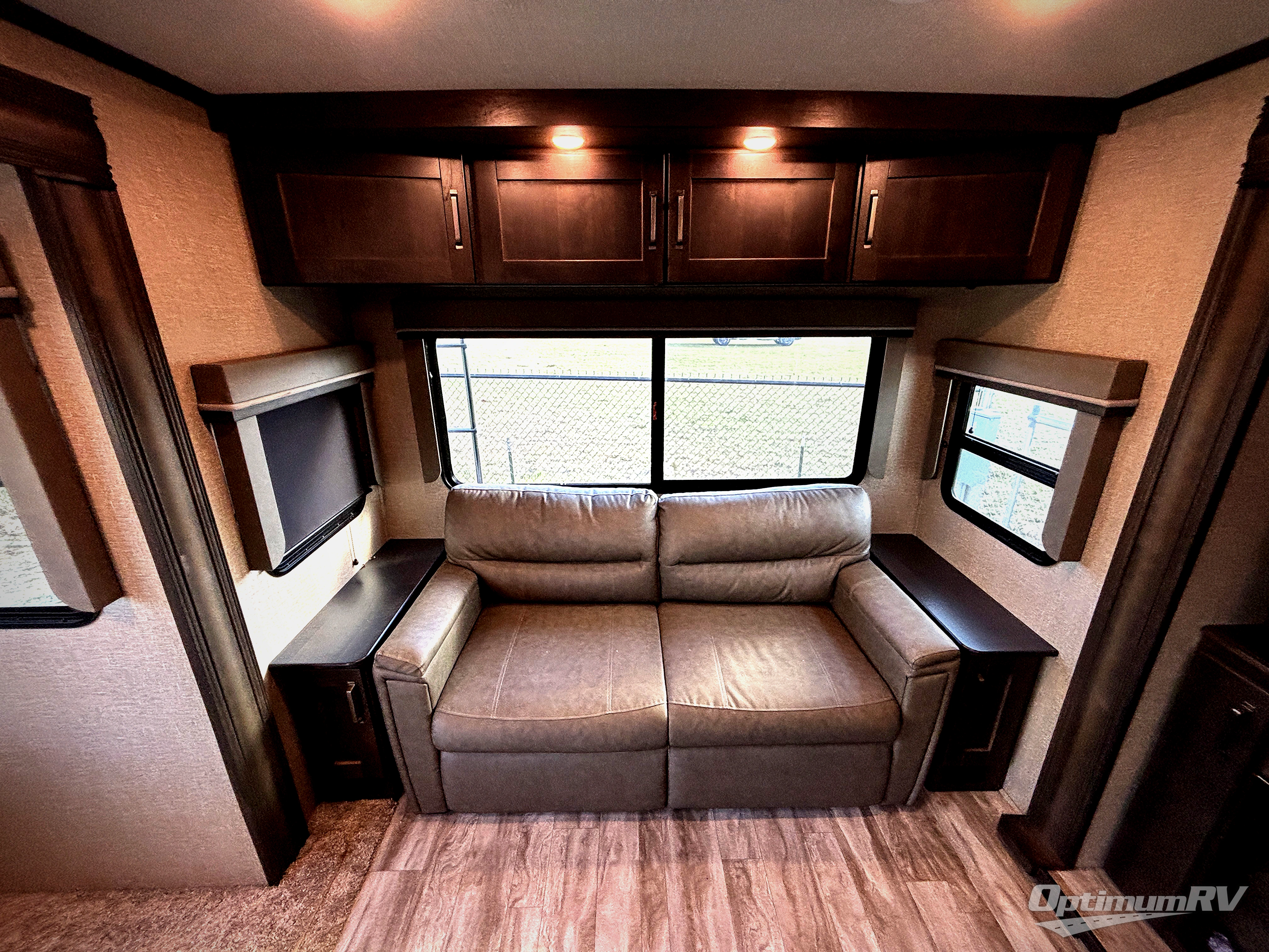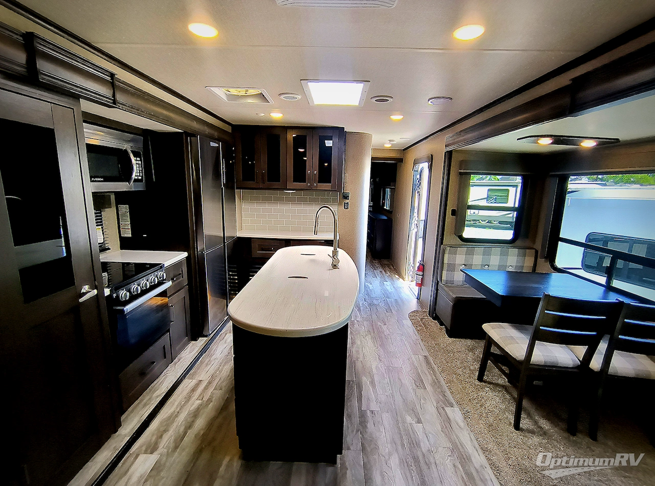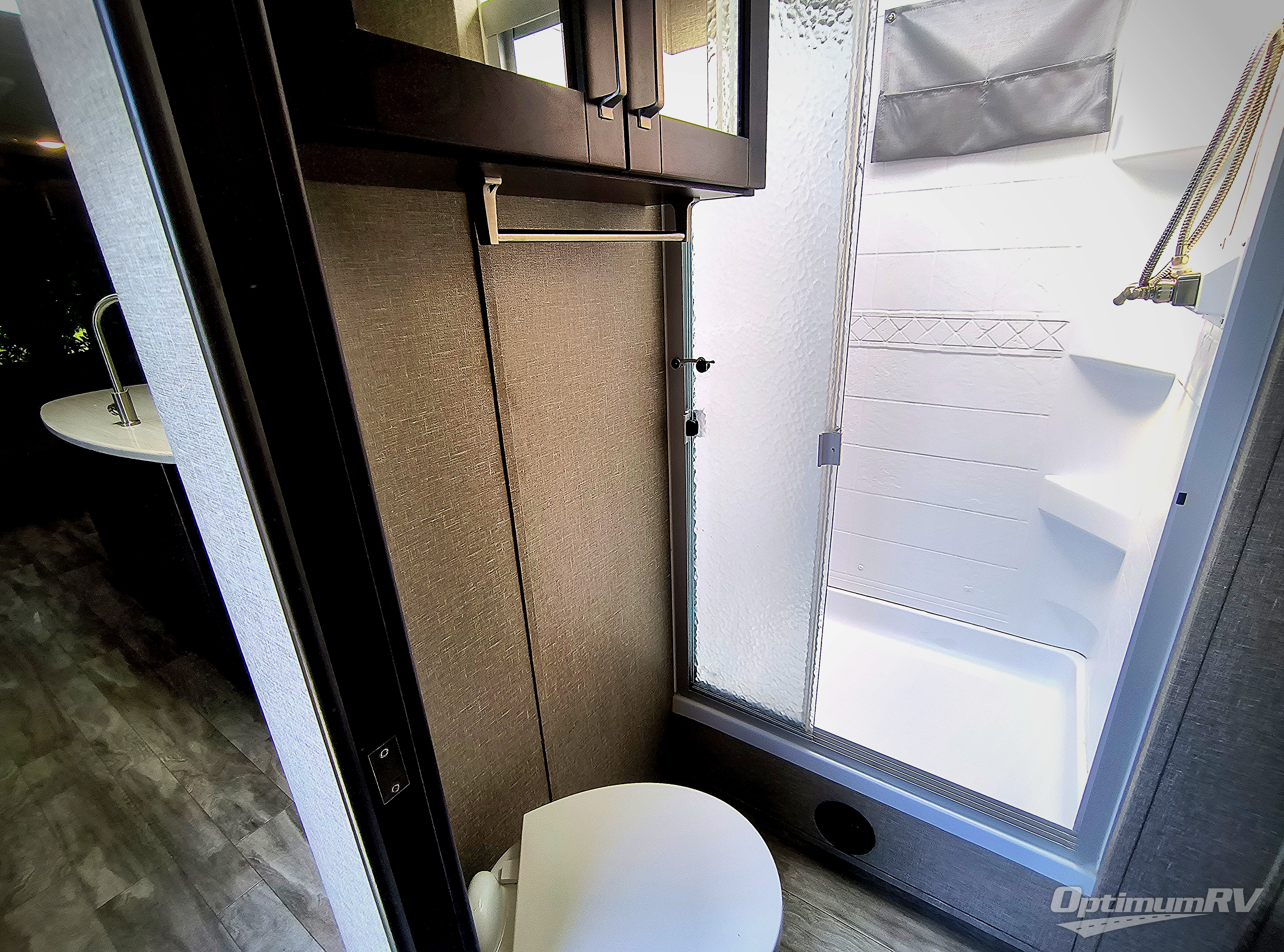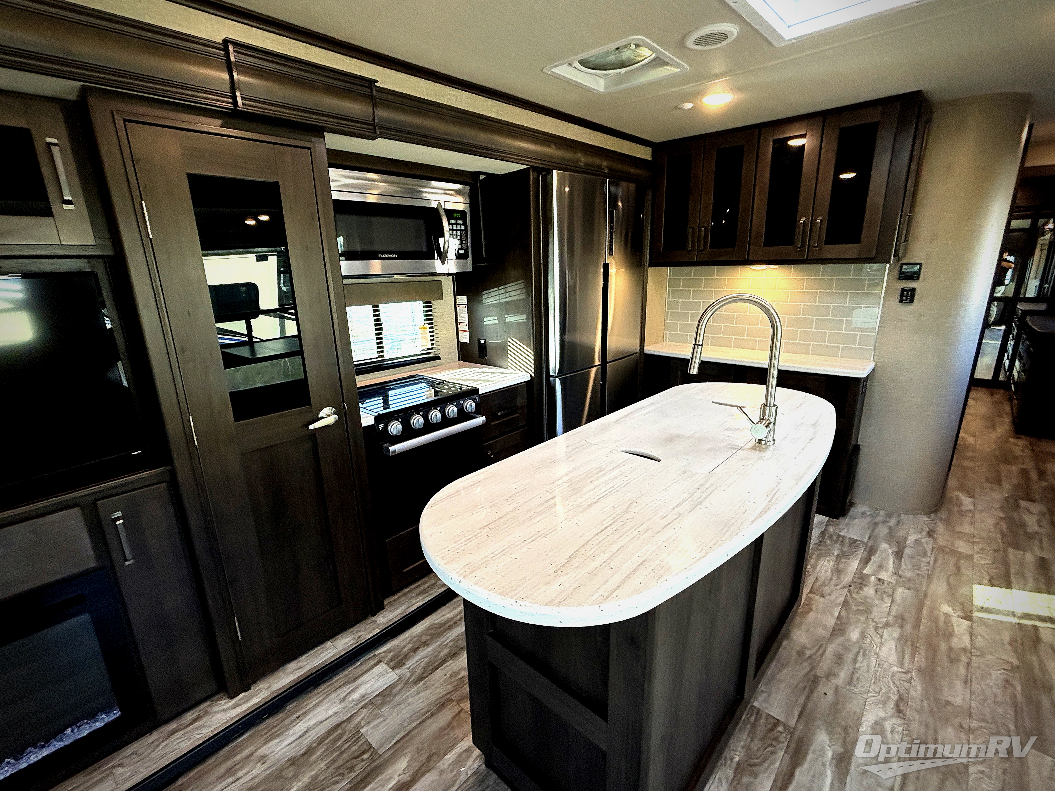 The chef of the group will love the gourmet kitchen including the 16 cu. ft. refrigerator that will hold lots of cold ingredients, beverages and leftovers, the center island when preparing and serving meals, and the hutch with overhead cabinets to display decor and store dishes and such. This area also includes two slide outs for more floor space and furniture to relax on including theatre seating with cupholders for your drinks, a booth dinette to dine at and work from or choose a free standing dinette option, and a rear tri-fold sofa that offers sleeping space for two at night. There is a 40" LED HDTV with fireplace below to enjoy while inside, plus there are two awnings outdoors to relax under. When you are ready to call it a night, get cleaned up in the full bathroom, and retire to your front bedroom with a slide out queen bed or choose a king option, a front full-wall wardrobe with washer/dryer prep, a dresser and an additional wardrobe with drawers.